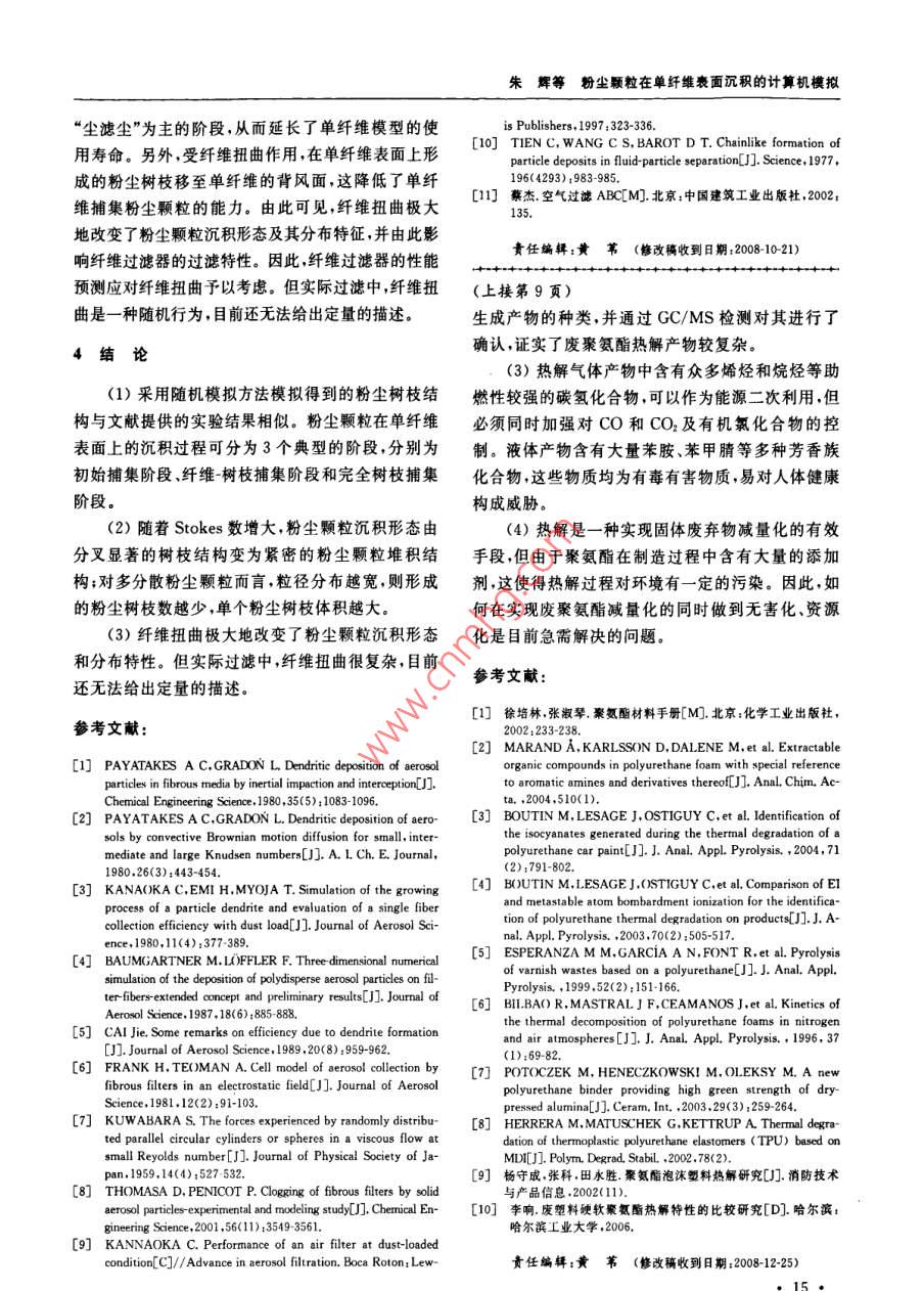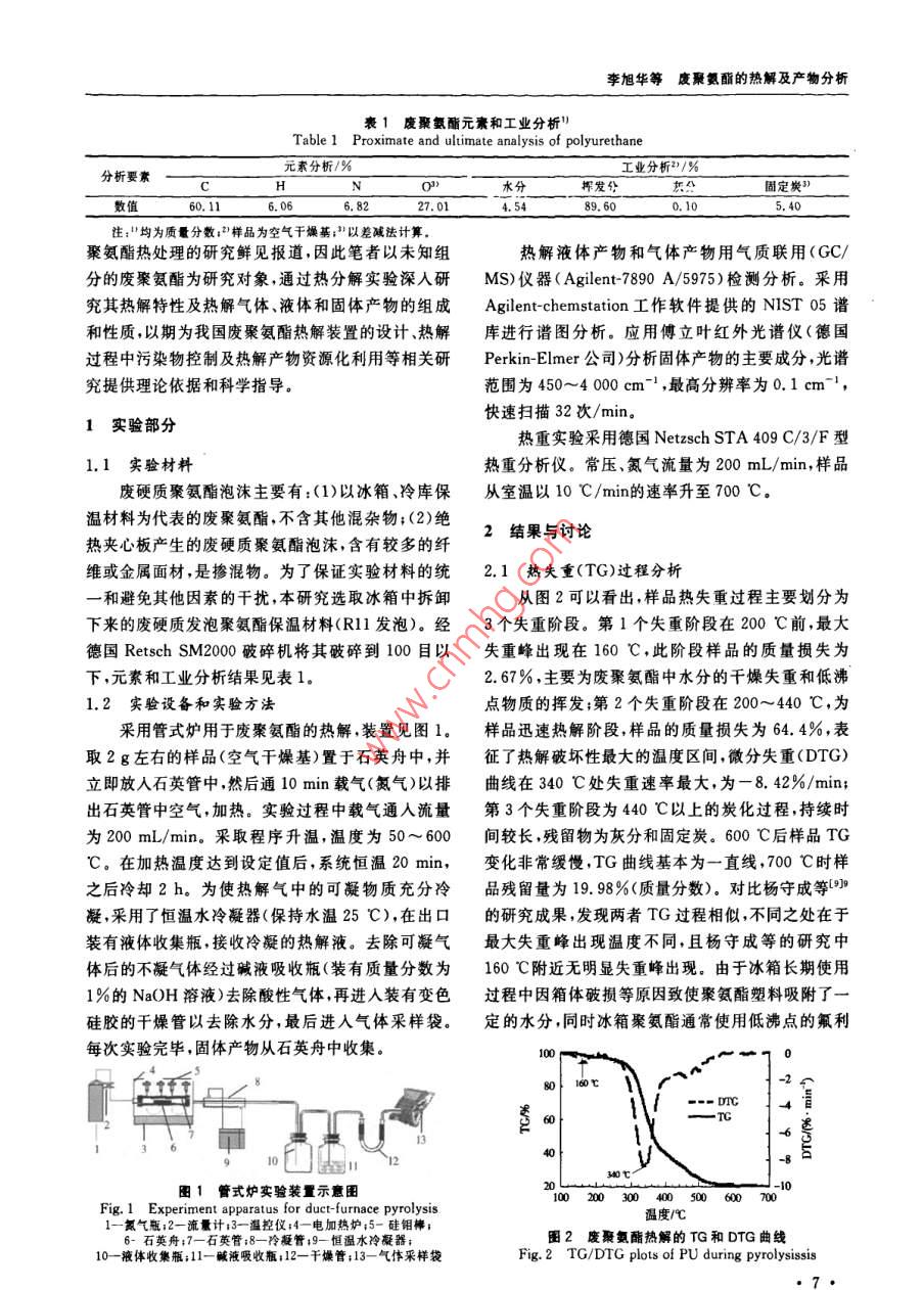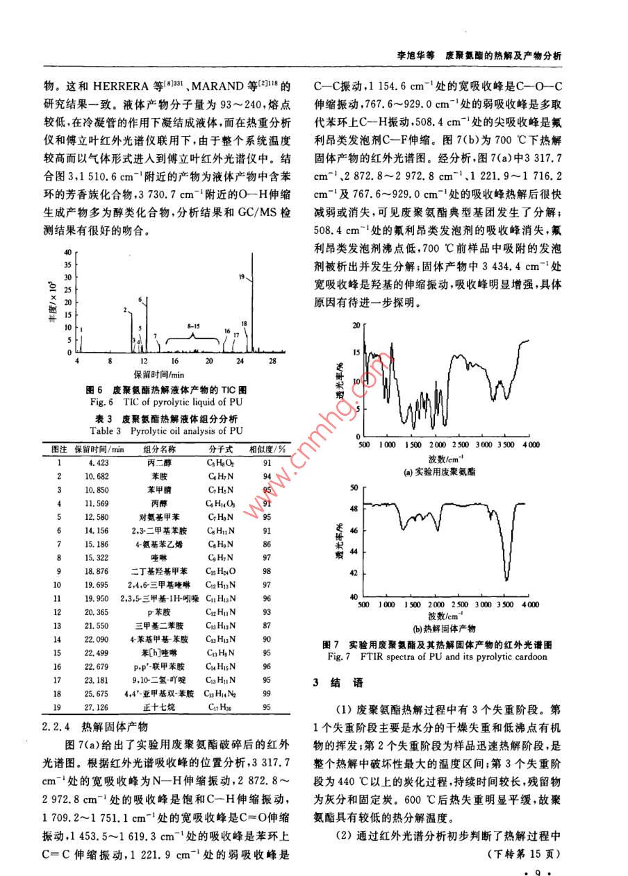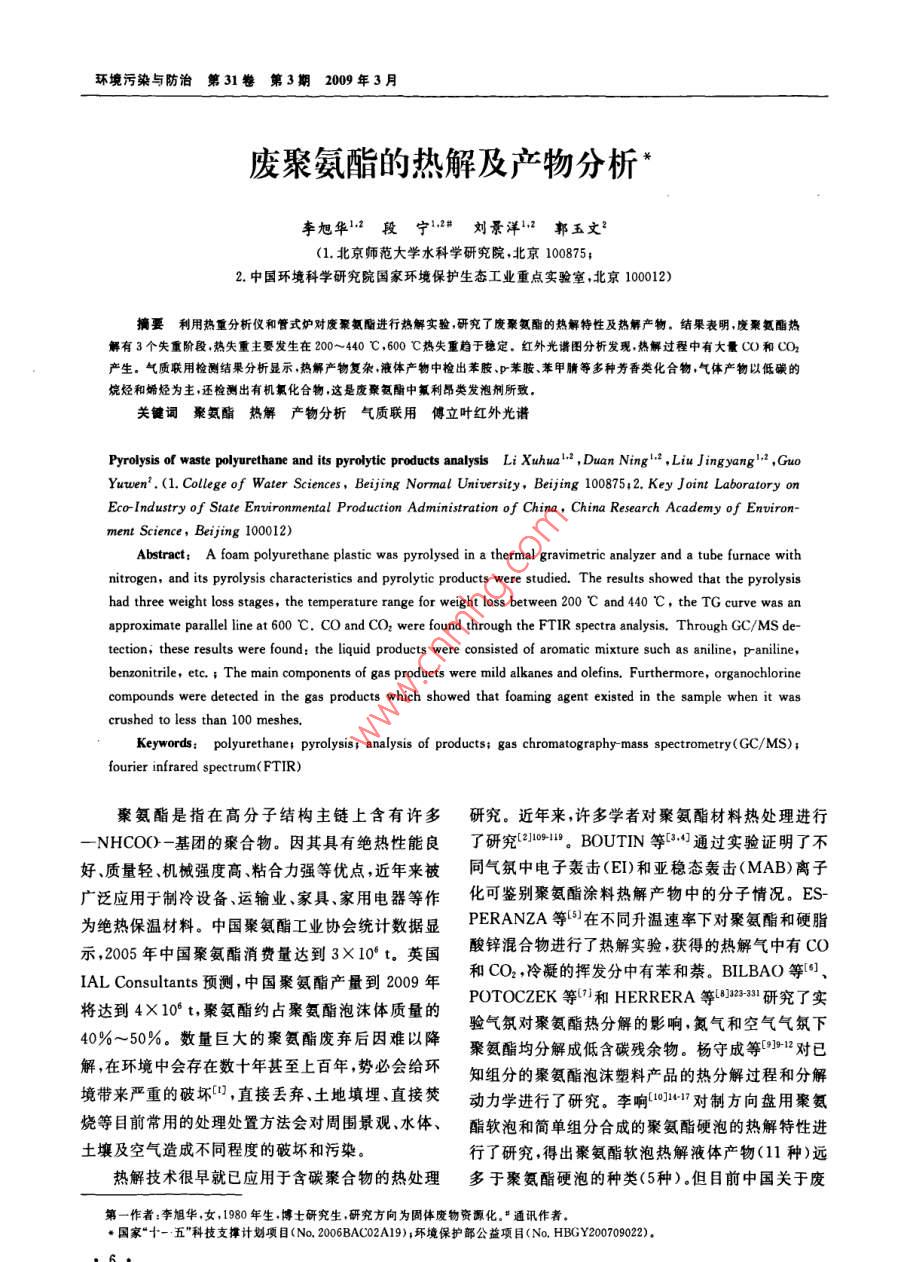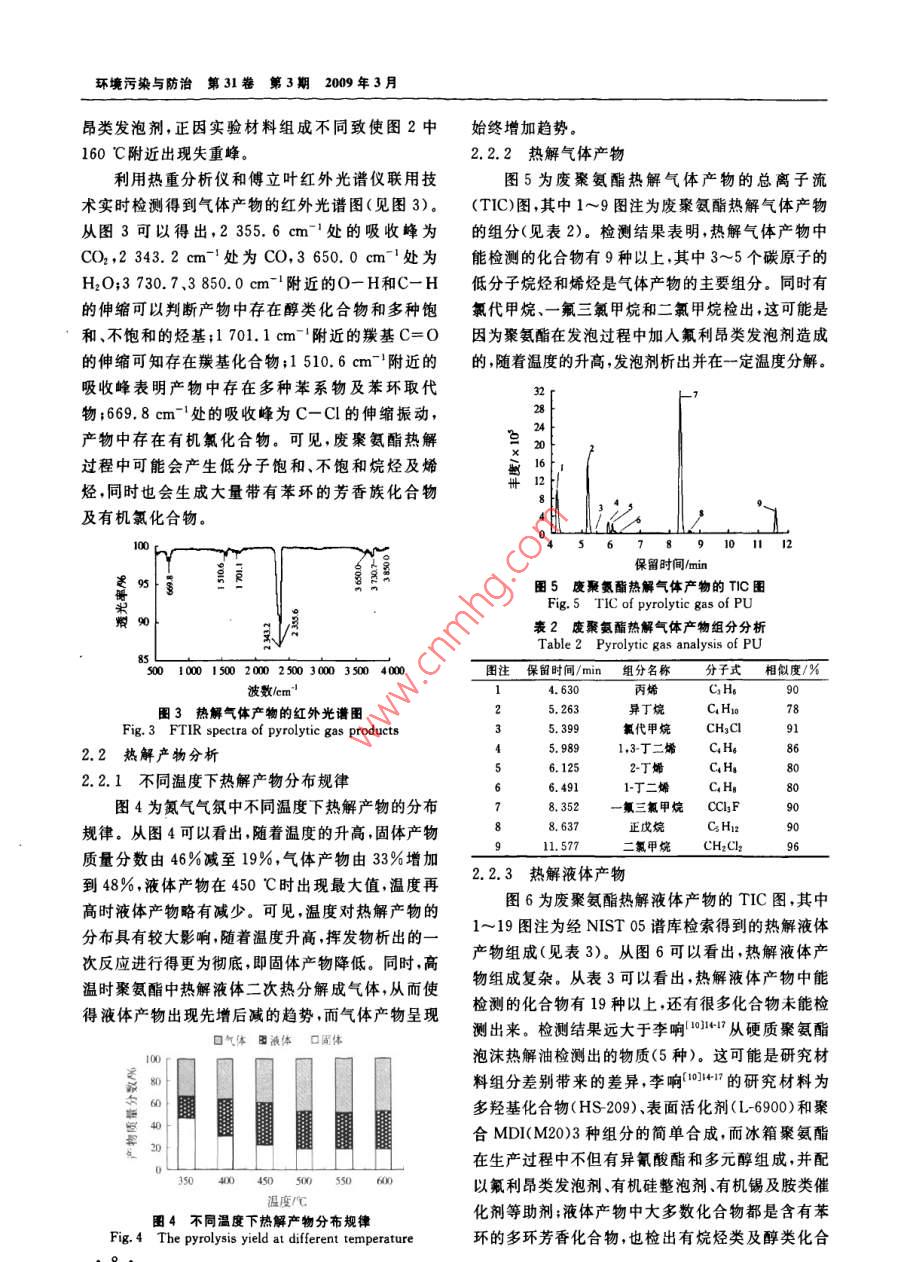環(huán)境污染與防治第31卷第3期2009年3月廢聚氨酯的熱解及產(chǎn)物分析李旭華1段寧12#劉景洋1郭玉文2(1.北京師范大學水科學研究院,北京100875;2.中國環(huán)境科學研究院國家環(huán)境保護生態(tài)工業(yè)重點實驗室,北京100012)摘要利用熱重分析儀和管式爐對廢聚氨酯進行熱解實驗,研究了廢聚氨酯的熱解特性及熱解產(chǎn)物,結(jié)果表明,廢聚氨酯熱解有3個失重階段熱失重主要發(fā)生在200~440℃,600℃熱失重趨于穩(wěn)定,紅外光譜圖分析發(fā)現(xiàn)熱解過程中有大量CO和CO2產(chǎn)生。氣質(zhì)聯(lián)用檢測結(jié)果分析顯示,熱解產(chǎn)物復(fù)雜液體產(chǎn)物中檢出苯胺、p苯胺、苯甲腈等多種芳香類化合物氣體產(chǎn)物以低碳的烷烴和烯烴為主,還檢測出有機氯化合物,這是廢聚氨酯中氟利昂類發(fā)泡劑所致關(guān)鍵詞聚氨酯熱解產(chǎn)物分析氣質(zhì)聯(lián)用傅立葉紅外光譜Pyrolysis of waste polyurethane and its pyrolytic products analysis Li Xuhua, Duan Ning., Liu Jingyang.,GuoYuwen.(1. College of Water ScBeijing Normal University, Beijing 100875:2. Key Joint Laboratory onEcoIndustry of State Environmental Production Administration of China, China Research Academy of environ-Abstract: A foam polyurethane plastic was pyrolysed in a thermal gravimetric analyzer and a tube furnace withnitrogen, and its pyrolysis characteristics and pyrolytic products were studied. The results showed that the pyrolysishad three weight loss stages, the temperature range for weight loss between 200 C and 440 C, the TG curve was anapproximate parallel line at 600 C. CO and CO, were found through the FtiR spectra analysis. Through GC/Ms de-tection, these results were found: the liquid products were consisted of aromatic mixture such as aniline, pranilinebenzonitrile, etc. i The main components of gas products were mild alkanes and olefins. Furthermore, organochlorinecompounds were detected in the gas products which showed that foaming agent existed in the sample when it wascrushed to less than 100 meshesKeywords: polyurethane: pyrolysis analysis of products; gas chromatography-mass spectrometry(GC/MS);fourier infrared spectrum(FTIR)聚氨酯是指在高分子結(jié)構(gòu)主鏈上含有許多研究。近年來,許多學者對聚氨酯材料熱處理進行NHCO(-基團的聚合物。因其具有絕熱性能良了研究(10 BOUTIN等3:4通過實驗證明了不好、質(zhì)量輕、機械強度高、粘合力強等優(yōu)點,近年來被同氣氛中電子轟擊(ED和亞穩(wěn)態(tài)轟擊(MAB)離子廣泛應(yīng)用于制冷設(shè)備、運輸業(yè)、家具、家用電器等作化可鑒別聚氨酯涂料熱解產(chǎn)物中的分子情況。ES為絕熱保溫材料。中國聚氨酯工業(yè)協(xié)會統(tǒng)計數(shù)據(jù)顯 PerANZA等在不同升溫速率下對聚氨酯和硬脂示,2005年中國聚氨酯消費量達到3×10t,英國酸鋅混合物進行了熱解實驗獲得的熱解氣中有COIAL Consultants預(yù)測,中國聚氨酯產(chǎn)量到2009年和CO2,冷凝的揮發(fā)分中有苯和萘。 BILBAO等(將達到4X10°t,聚氨酯約占聚氨酯泡沫體質(zhì)量的POTOCZEK等和 HERRERA等123研究了實驗氣氛對聚氨酯熱分解的影響,氮氣和空氣氣氛下40%~50%。數(shù)量巨大的聚氨酯廢棄后因難以降聚氨酯均分解成低含碳殘余物。楊守成等對已解在環(huán)境中會存在數(shù)十年甚至上百年勢必會給環(huán)知組分的聚氨酯泡沫塑料產(chǎn)品的熱分解過程和分解境帶來嚴重的破壞口,直接丟棄、土地填埋、直接焚動力學進行了研究。李響1H對制方向盤用聚氨燒等目前常用的處理處置方法會對周圍景觀、水體、酯軟泡和簡單組分合成的聚氨酯硬泡的熱解特性進土壤及空氣造成不同程度的破壞和污染。行了研究,得出聚氨酯軟泡熱解液體產(chǎn)物(11種)遠熱解技術(shù)很早就已應(yīng)用于含碳聚合物的熱處理多于聚氨酯硬泡的種類(5種)。但目前中國關(guān)于廢第一作者:李旭華,女,1980年生博士研究生,研究方向為固體廢物資源化?!巴ㄓ嵶髡邍摇笆?五”科技支撐計劃項目(No,2006BAC02A19);環(huán)境保護部公益項目(No.HBGY200709022),李旭華等廢聚氨酯的熱解及產(chǎn)物分析1廢聚氨酯元素和工業(yè)分析Table 1 Proximate and ultimate analysis of polyurethane元素分析/%分析要素工業(yè)分析2)/水分固定炭89.60注:均為質(zhì)囊分數(shù);2樣品為空氣干燥基;3以差減法計算。聚氨酯熱處理的研究鮮見報道,因此筆者以未知組熱解液體產(chǎn)物和氣體產(chǎn)物用氣質(zhì)聯(lián)用(GC/分的廢聚氨酯為研究對象,通過熱分解實驗深人研MS)儀器( Agilent7890A/5975)檢測分析。采用究其熱解特性及熱解氣體、液體和固體產(chǎn)物的組成 Agilent-chemstation工作軟件提供的NlST05譜和性質(zhì)以期為我國廢聚氨酯熱解裝置的設(shè)計、熱解庫進行譜圖分析。應(yīng)用傅立葉紅外光譜儀(德國過程中污染物控制及熱解產(chǎn)物資源化利用等相關(guān)研 Perkin-Elmer公司)分析固體產(chǎn)物的主要成分,光譜究提供理論依據(jù)和科學指導(dǎo)。范圍為450~4000cm-1,最高分辨率為0.1cm-1快速掃描32次/min1實驗部分熱重實驗采用德國 Netzsch sta409C/3/F型1.1實驗材料熱重分析儀。常壓、氮氣流量為200mL/min,樣品廢硬質(zhì)聚氨酯泡沫主要有:(1)以冰箱、冷庫保從室溫以10℃/min的速率升至700℃C。溫材料為代表的廢聚氨酯,不含其他混雜物;(2)絕熱夾心板產(chǎn)生的廢硬質(zhì)聚氨酯泡沫,含有較多的纖2結(jié)果與討論維或金屬面材,是摻混物。為了保證實驗材料的統(tǒng)2.1熱