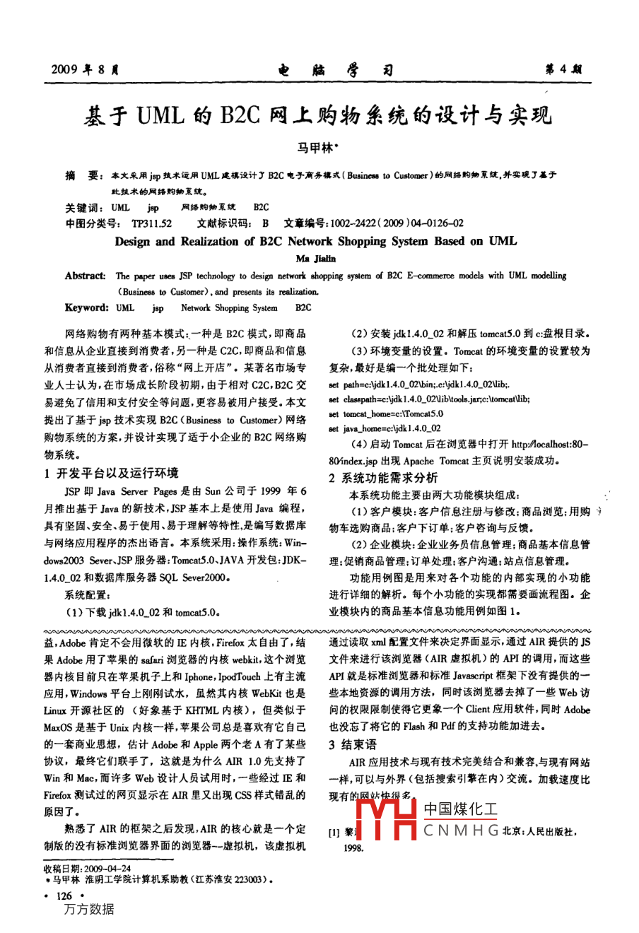 2009年8周習(xí)4AIR應(yīng)用技術(shù)龐鑫摘要:本文簡罷地槭逑了什么是AIR,AIR的憂點(diǎn),如何來構(gòu)建AR樓序問題。關(guān)鍵詞: AIR Adobe提序中圖分類號:TP39309文獻(xiàn)標(biāo)識碼:A文章編號:1002-2422(2009)04012502AIR TechnologyPang XinAbstract The paper presents such aspects as what is aIR, what is the advantages of AIR and how to build AIR process.Keyword: AIRAdobeAdobe自從收購了 Macromedia有了Fash和它的RLA運(yùn)行了,這有很多好處:解決方案之后,野心大了不少,至少是想要和Goge,微軟的(1)開發(fā)AIR應(yīng)用程序不必做額外的跨平臺(tái)工作,節(jié)竟?fàn)幹姓家幌?甚至是想集兩家之長取而代之(Wb+軟省了時(shí)間,因?yàn)榭缙脚_(tái)的工作AIR都做好了(只要其他平件=融合),所以,最近兩年不停地放出一些開源的工具和解臺(tái)能支持AIR)決方案,直到今年二月份推出了AIR10版本(2)比起Web技術(shù)及其設(shè)計(jì)模式,AIR應(yīng)用程序開發(fā)1AIR到底是什么迅速,允許將Web開發(fā)技術(shù)搬到桌面上來而不用另外去學(xué)Adobe Integrated Runtime(AIR)是一個(gè)跨操作系統(tǒng)習(xí)桌面程序開發(fā)技術(shù)或復(fù)雜的底層代碼,這比起低級語言的運(yùn)行時(shí),利用現(xiàn)有的Wb開發(fā)技術(shù)(Fash,Fex,HmML,如C和C++更容易學(xué)習(xí),且不用去處理每個(gè)操作系統(tǒng)復(fù)雜JavaScript, Ajax)來構(gòu)建富 Internet應(yīng)用程序并部署為桌面的底層Als應(yīng)用程序。(3)AIR程序都是跑在AIR這個(gè) Runtime之上的。這AR支持現(xiàn)有的Web技術(shù)如Fah,Fex,HML,Java-就好比SWF文件在 Flashplayer中運(yùn)行一樣。Script和AJAX,可以用最熟練的技術(shù)來開發(fā)最具用戶體驗(yàn)2AIR體驗(yàn)的RA程序,例如,一個(gè)AIR程序可以使用如下一種或多21AIR的組成和發(fā)布過程種組合技術(shù)構(gòu)建描述應(yīng)用的XML+一個(gè)根節(jié)點(diǎn)資源+一個(gè)打包工(1) Flasb/Flex/Action Script具。在使用 Flex Builder3建立AIR項(xiàng)目的時(shí)候,一般都(2)HTMIJavaScriptCSS/Ajax會(huì)自動(dòng)產(chǎn)生一個(gè)MXML和一個(gè)XML。用Fex編譯SWF,作(3)PDF可嵌入任何應(yīng)用程序中為這個(gè)AIR的默認(rèn)根節(jié)點(diǎn),然后通過 Flex builder3發(fā)布成作為結(jié)果,AIR應(yīng)用程序可以是:為air安裝包。(當(dāng)然這并不是唯一開發(fā)AIR的方式,Fex(1)基于 Flash或Fex:應(yīng)用程序根內(nèi)容(理解為容開發(fā)成本相對較高)只要有swf,并且把這個(gè)sw描述成為器)為Fasb/Flex(SWFAR應(yīng)用的根節(jié)點(diǎn)資源,就可以使用 Flex Builder3帶有打(2)基于Fash或Fex的HM或PDF包工具發(fā)布air安裝包了。應(yīng)用程序的根內(nèi)容為基于 FlashFlex(SWF)的HM22安裝了AIR運(yùn)行時(shí)環(huán)境(HIML,Js,Css)或AIR SDK后,試驗(yàn)了 Sample程序查看了一下官方手(1)基于HTML,應(yīng)用程序根內(nèi)容為HML,S,CSS,冊,想了一下,發(fā)現(xiàn),這不就是 Firefox之前提出過的理念(2)基于HmML的 FlashFlex或PDF,應(yīng)用程序根內(nèi)容嗎,不象 Firefox的插件,只是為WE瀏覽服務(wù), Firefox提為基于HmML的 Flash/Flex(sWF)或PDF。出過一個(gè)理念是,在瀏覽器里運(yùn)行WEB軟件一無論在線離用戶使用AIR應(yīng)用程序的方式和傳統(tǒng)桌面程序是一樣線,只不過它還是在瀏覽器里面跑,所以給人印象不是太的,當(dāng)運(yùn)行時(shí)環(huán)境安裝好后,AUR程序就可以其他桌面程序大,而AIR比較聰明,它淡化了瀏覽器的概念突出了離線樣運(yùn)行了運(yùn)行(其實(shí)就是瀏覽)跨平臺(tái)的概念,按道理,AIR應(yīng)該第因?yàn)锳R是應(yīng)用程序運(yùn)行時(shí)環(huán)境,因此很小且對用戶一個(gè)支中國煤化工因?yàn)殚_源社區(qū)在這來說不可見。運(yùn)行時(shí)環(huán)境提供了一套一致的跨操作系統(tǒng)平方面的臺(tái)和框架來開發(fā)和部署應(yīng)用程序,因此程序不必到每個(gè)平一些CNMHGIndows上開發(fā)更快1心 Gecko可以使用,臺(tái)上進(jìn)行測試,在一個(gè)平臺(tái)上開發(fā)好就可以在其他平臺(tái)上E的內(nèi)核 Trident比較被開發(fā)人員熟悉但可能出于商業(yè)利收稿日期:2009-0608龐鑫大慶師范學(xué)院計(jì)算機(jī)學(xué)院學(xué)生(黑龍江,大慶163712)·1252009年8A電腦骨第4期基于UML的B2C網(wǎng)上購物糸統(tǒng)的設(shè)計(jì)與實(shí)現(xiàn)馬甲林摘要:本文乘用j筑術(shù)廂UML處檁設(shè)計(jì)了B2C電子商務(wù)藕式( Businesg to Customer)的絡(luò)購帥系并實(shí)現(xiàn)了基于此術(shù)的網(wǎng)絡(luò)購物琛魷關(guān)鍵詞:UMLj網(wǎng)絡(luò)胸夏中圖分類號:TP3115文獻(xiàn)標(biāo)識碼:B文章編號:100-2422(2009)040126Design and Realization of B2C Network Shopping System Based on UMLAbstract: The paper uses JSP technology to design network shopping system of B2C E-commerce models with UML modelli(Business to Customer), and presents its realiaKeyword: UML jsp Network Shopping System B2C網(wǎng)絡(luò)購物有兩種基本模式:一種是B2C模式,即商品(2)安裝jk140_02和解壓 tomcat50到c:盤根目錄。和信息從企業(yè)直接到消費(fèi)者,另一種是C2C,即商品和信息(3)環(huán)境變量的設(shè)置。 Tomcat的環(huán)境變量的設(shè)置較為從消費(fèi)者直接到消費(fèi)者,俗稱“網(wǎng)上開店”。某著名市場專復(fù)雜,最好是編一個(gè)批處理如下業(yè)人士認(rèn)為,在市場成長階段初期,由于相對CC,B2C交 set path:= c:jokI4.00bin; c:jdk40_02lib;易避免了