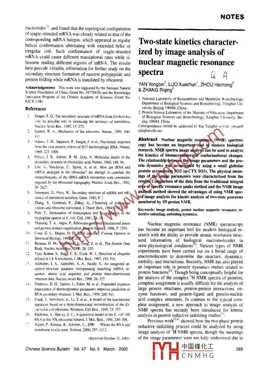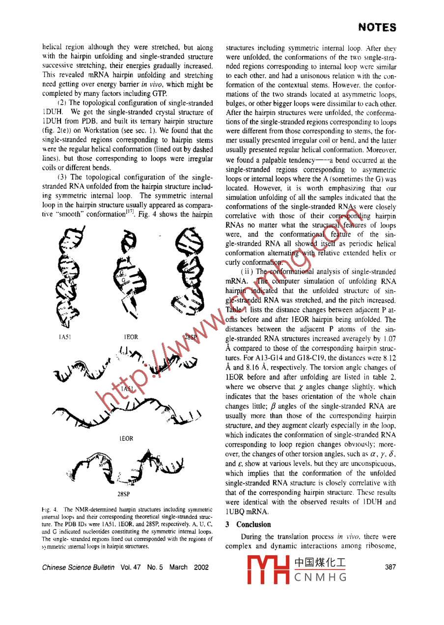 NOTESThe topological configurationgle-stranded mRNA on earth? Are such contormatonalfeatures correlalive with protein structures or not?and conformational analysisThrough study and analysis of he thcoretical model ofmRNA and through simulation unfolding of experimentalof mRNA in translationRNA hairpin structures. we found thal the conformation ofsingle-stranded mRNA was closely correlarive with that ofLIU Shuqun' & LIU Ciquan'QAits corresponding hairpin structure. which implied that1.Kunming Intitne of Zoology. Chinesc Academy of Sciences. Kun-conformation of single-stranded mRNA had 'memory' tn 65077 Chingthat of mRNA hairpin structure. These results wouldC. Moderm Biological Cenler. Yunnan University, Kunming 60091,provid valuable information for further study ing the rela-Correspondence should be addressed to L.iu Ciquan (e mail: brg@tionship between mRNA structure and (ruanslational rate aswell as nascent polypepide structurc.public .km.yn.cn)Abstract The theoretical model construction of mRNA1 Materials and methodshairpin structure and single-straoded structure as well as theRNA includes messenger RNA, transfer RNA. andsimulation studies on RNA structure determined by theribosomal RNA. Experimental and theoretical methodsX-ray erystal diftraction and nuclear magnetic resonanceprovid researchers with abundant RNA structural informa-rerealed that in translation, after mRNA being unfolded intoion. It is worth pointing out that stems and loops are thesingle-stranded structure, its topological configuration wascommon structural characteristics of all RNAs'". Stack-closely correlative with the origioal bairpin structure. Thconformational features of single-stranded mRNA appeareding and base pairing drive a single-stranded RNA mole-as helical regions alternating with curly regions to differentcule to fold the chain on itself into complex hairpin struc-extents. which might exert the infuence on the foldiag oftures including helical regions (sterms) linked by the non-oasceot polypeptide by various regulating effects includinghelical regions. The non-helical regions are composed ofdifferent translational rates.hairpin loops. internal loops. bulges. multiple junctions,Keswords: hairpin struchure of mRNA, topological confguration ofand single-stranded chain. No complete mRNA strutturehas been determined until now, but we can get hairpin orsingle-stranded mRNA.single- stranded structures of other RNAs. And these struc-All the RNA molecules in vivo have their own struc-tures possess the same features as those of mRNAtures. The structures of tRNA and rRNA can cary outstructures, so our structural analysis of RNA prest'ntsimporant biological functions; but for mRNA. the rela-universal sense.( i) Sample Collection. IUBQ (PDB:"i ID) wastionship between structure and function is more compli-cated" because its functions are implemented by a com-the strnucture of ubiquitin refined at 1.8 A resolution“. Itsplex and dynamic translation machine一-ribosomel-l. Incoding sequence (mRNA). obtained from ISSDI . wasranslaion, the interactions among ribosome, tRNA. andused for constructing mRNA structures and simulatingmRNA are dynamic and harmonious, and the biosynthesishairpin structure unfolding into single-stranded structure.Using the advanced search engine SearchFicld ofof nascent peptide depends on the recognition and combi-PDB, we got 74 experimental structures of RNAs 1hatnaion of the anticodons on tRNAs to codons on MRNA toPDB could collect up to 31 December 2000. Among them.a certain extent. so the mRNA on nibosome must be in athere were 68 hairpin structures determined by the X-raysingle-stranded state's. Namely. the termary structurer olcrystal diffraction or nuclear magnetic resonance (NMR)mRNA fomned by loop and stem regions has to be un-and 6 single-stranded structures determined by the X-rayfolded, and its hairpin structures unfasten continuouslycrystal dillraction. These structures were used for simu-Into 5'→3' single-stranded chain, which is convenientlating RNA hairpin unfolding and analying conforna-for tRNAs 10 proofread the decoding region of mRNAI5I.tional features of single-stranded RNA.Furthermnore, the decoding region conformation of sin(ii) Simulation method. Firstly. the mRNA sec-gle-stranded mRNA can be subtly adjusted to pair with theondary structures of IUBQ und thesc 74 samples wereanticodons of A- and P-site tRNAs. Relevant researchespredicted by RNAsructure 3.5. Comparing the pre-have revealed that the structure of mRNA is related to thedicted structures with experinental structures. we foundtranslation initiation efficiencyh', the movement rate of that the theoretical structures were consistent with ex-rbosome along mRNA", and the termination of transla-perimental structures in base pairing. and the acuracytion" . Moreover. different translation rates of ribosomerate of base pairing in predicted structures was 100% ifon he different regions of single sranded mRNA can the RNA sequence length was less than 100 nucleotiles.dfferentially code protein secondary structural types'.Secondly. he termary structures o[ RNAs werc buit on theHowever. what are the conformational features of sin-basis of their secondary structure. and then the haipin384Chine中國煤化工。March 2002MYHCNMHGNOTESstructures were unfolded into single-siranded RNAs. Anear RNA structure that comprised the random nucleotidemRNA temnary structure was a complex hairpin assembledsequence, and added a K cation onto each phosphoricby its structural element- -simple hairpin- rand the essen-acidgroup to keep the whole systcm as elctroneutrality.tial structural characteristic of the simple hairpin was stemThe initial positions of K* were located on the planeand loop. So we sclected randomly the fourth hairpin onformed by the O-P-O atoms of phosphoric acid group.the mRNA secondary structure of IUBQ, which waswith equal distances l0 the lwo oxygen atoms. Then thecomposed of 24 nucleotides, with I0 base pairs located a