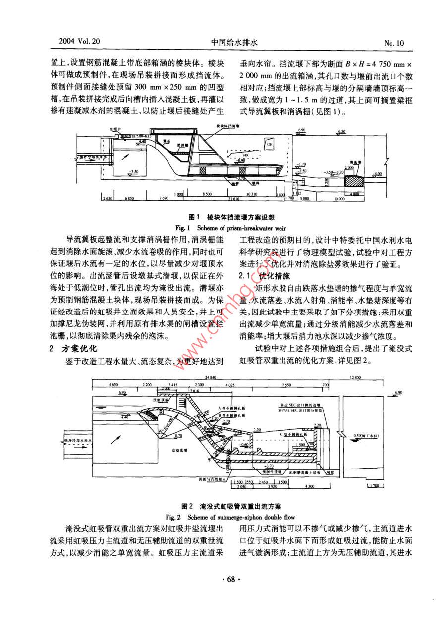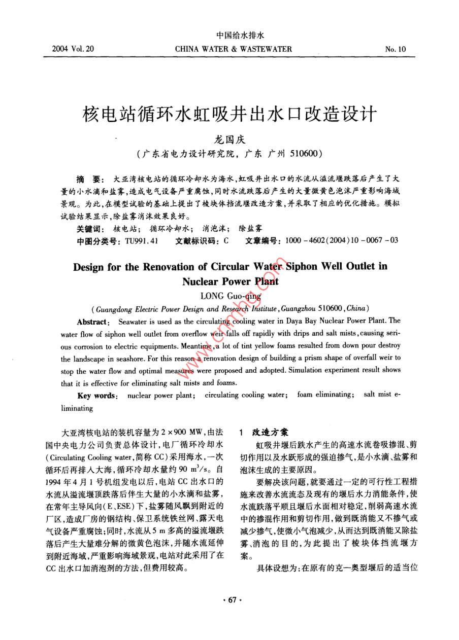 中國(guó)給水排水2004Vol.20CHINA WATER WASTEWATERNo.10核電站循環(huán)水虹吸井出水口改造設(shè)計(jì)龍國(guó)慶廣東省電力設(shè)計(jì)研究院,廣東廣州510600)摘要:大亞灣核電站的循環(huán)冷卻水為海水,虹吸井出水口的水流從溢流堰跌落后產(chǎn)生了大量的小水滴和鹽霧,造成電氣設(shè)備嚴(yán)重腐蝕,同時(shí)水流跌落后產(chǎn)生的大量微黃色泡沫嚴(yán)重影響海域景觀。為此,在模型試驗(yàn)的基礎(chǔ)上提出了棱塊體擋流堰改造方案,并采取了相應(yīng)的優(yōu)化措施。模擬試驗(yàn)結(jié)果顯示,除鹽霧消沫效果良好。關(guān)鍵詞:核電站;循環(huán)冷卻水;消泡沫;除鹽霧中圖分類號(hào):TU99141文獻(xiàn)標(biāo)識(shí)碼:C文章編號(hào):1000-4602(2004)10-0067-03Design for the Renovation of Circular Water Siphon Well Outlet inNuclear power plantLONG Guo-qingGuangdong Electric Power Design and Research Institute, Guangzhou 510600, China)Abstract: Seawater is used as the circulating cooling water in Daya Bay Nuclear Power Plant.Thewater flow of siphon well outlet from overlow weir falls off rapidly with drips and salt mists, causing seri-ous corrosion to electric equipments. Meantime, a lot of tint yellow foams resulted from down pour destroythe landscape in seashore. For this reason a renovation design of building a prism shape of overfall weir tostop the water flow and optimal measures were proposed and adopted. Simulation experiment result showsthat it is effective for eliminating salt mists and foams.Key words: nuclear powCIrcng coonfoam eliminating大亞灣核電站的裝機(jī)容量為2×900MW,由法1改造方案國(guó)中央電力公司負(fù)責(zé)總體設(shè)計(jì),電廠循環(huán)冷卻水虹吸井堰后跌水產(chǎn)生的高速水流卷吸摻混、剪( Circulating Cooling water,簡(jiǎn)稱CC)采用海水,一次切作用以及水躍形成的強(qiáng)迫摻氣,是小水滴鹽霧和循環(huán)后再排入大海,循環(huán)冷卻水量約90m3/s。自泡沫生成的主要原因。1994年4月1號(hào)機(jī)組發(fā)電以后,電站CC出水口的要解決該問(wèn)題,就要通過(guò)一定的可行性工程措水流從溢流堰頂?shù)浜蟀樯罅康男∷魏望}霧,施來(lái)改善水流流態(tài)及現(xiàn)有的堰后水力消能條件,使在常年主導(dǎo)風(fēng)向(E、ESE)下,鹽霧隨風(fēng)飄到附近的水流跌落平順且堰后水面相對(duì)穩(wěn)定,削弱高速水流廠區(qū),造成廠房的鋼結(jié)構(gòu)、保衛(wèi)系統(tǒng)鐵絲網(wǎng)露天電中的摻混作用和剪切作用,做到既消能又不摻氣或氣設(shè)備嚴(yán)重腐蝕;同時(shí),水流從5m多高的溢流堰跌減少摻氣,使微小氣泡減少,從而達(dá)到既消能又除鹽落后產(chǎn)生大量難分解的微黃色泡沫,并隨水流延伸霧、消泡的目的,為此提出了棱塊體擋流堰方到附近海域,嚴(yán)重影響海域景觀,電站對(duì)此采用了在案。CC出水口加消泡劑的方法,但費(fèi)用較高。具體設(shè)想為:在原有的克一奧型堰后的適當(dāng)位672004Vol.20中國(guó)給水排水No.10置上,設(shè)置鋼筋混凝土帶底部箱涵的棱塊體。棱塊垂向水簾。擋流堰下部為斷面B×H=4750mmx體可做成預(yù)制件,在現(xiàn)場(chǎng)吊裝拼接而形成擋流體。2000m的出流箱涵其孔口數(shù)與堰前出流口個(gè)數(shù)預(yù)制件側(cè)面接縫處預(yù)留300mmx250mm的凹型相對(duì)應(yīng);擋流堰上部標(biāo)高與堰的分隔墻墻頂標(biāo)髙一槽,在吊裝拼接完成后向槽內(nèi)插入混凝土板,再灌以致,做成寬為1-1.5m的過(guò)道,其上面可擱置梁框摻有速凝減水劑的混凝土,以防止堰后接縫處產(chǎn)生式導(dǎo)流翼板和消渦柵(見(jiàn)圖1)。s,:∞Jnis圖1棱塊體擋流堰方案設(shè)想Fig. 1 Scheme of prism-breakwater weir導(dǎo)流翼板起整流和支撐消渦柵作用,消渦柵能工程改造的預(yù)期目的,設(shè)計(jì)中特委托中國(guó)水利水電起到消除水面旋滾減少水流卷吸的作用,同時(shí)也可科學(xué)研究院進(jìn)行了物理模型試驗(yàn),試驗(yàn)中對(duì)工程方保證堰后水流有一定的水位,以盡量減少對(duì)堰頂水案進(jìn)行了優(yōu)化并對(duì)消泡除鹽霧效果進(jìn)行了驗(yàn)證。位的影響。出流涵管后設(shè)墩基式潛堰,以保證在外2.1優(yōu)化措施海處于低潮位時(shí),管孔出流均為淹沒(méi)出流。潛堰亦矩形水股自由跌落水墊塘的摻氣程度與單寬流為預(yù)制鋼筋混凝土塊體,現(xiàn)場(chǎng)吊裝拼接而成。為保量水流落差、水流入射角、消能率、水墊塘深度等有證經(jīng)改造后的虹吸井立面效果和人員安全,井上可關(guān),因此試驗(yàn)中主要采取了如下分項(xiàng)措施:采用雙重加撐尼龍偽裝網(wǎng),并利用原有排水渠的閘槽設(shè)置攔出流減少單寬流量;通過(guò)分級(jí)消能減少水流落差和泡柵,以徹底清除渠內(nèi)殘余的泡沫。消能率;增大堰后消力池水深以減少摻氣濃度。2方案優(yōu)化試驗(yàn)中對(duì)上述各項(xiàng)措施組合后,提出了淹沒(méi)式鑒于改造工程水量大、流態(tài)復(fù)雜,為更好地達(dá)到虹吸管雙重出流的優(yōu)化方案,詳見(jiàn)圖2。A型不銹倒孔板比分積不孔板環(huán)冷水來(lái)DENBRRLERU I圖2淹沒(méi)式虹吸管雙重出流方案Fig. 2 Scheme of submerge-siphon double flo淹沒(méi)式虹吸管雙重出流方案對(duì)虹吸井溢流堰出用壓力式消能可以不摻氣或減少摻氣,主流道進(jìn)水采用虹吸壓力主流道和無(wú)壓輔助流道的雙重泄流口位于虹吸井水面下而形成虹吸過