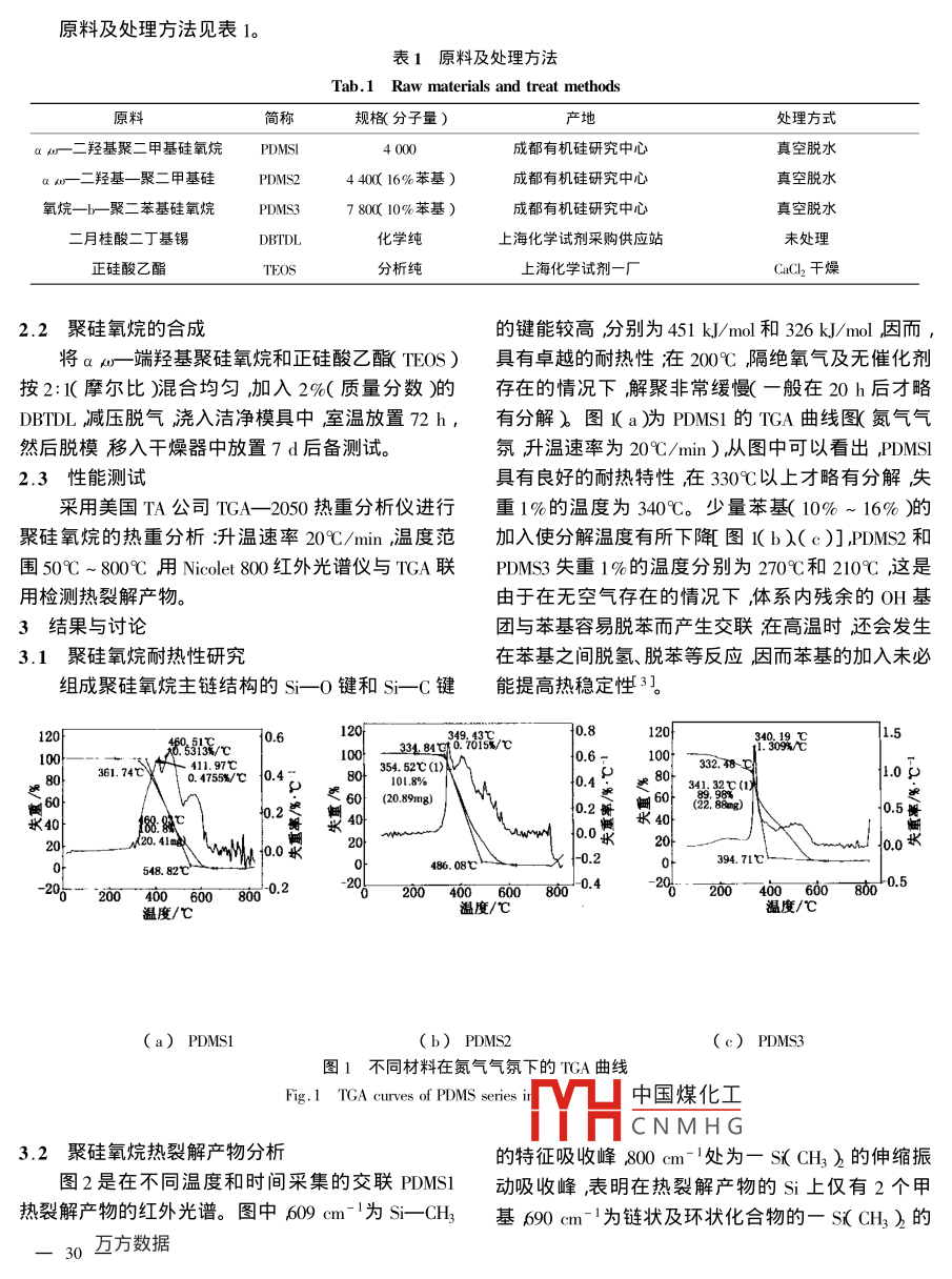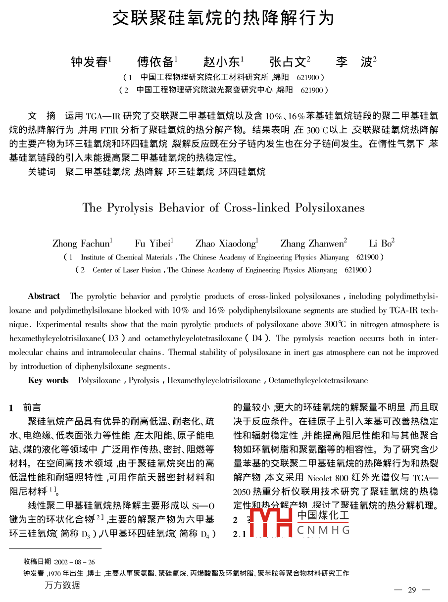 交聯聚硅氧烷的熱降解行為鐘發(fā)春1傅依備1趙小東1張占文2李波21中國工程物理研究院化工材料研究所綿陽619002中國工程物理研究院激光聚變研究中心綿陽621900文摘運用TGA_R研究了交聯聚二甲基硅氧烷以及含10%、16%苯基硅氧烷鏈段的聚二甲基硅氧烷旳熱降解行為并用R分析了聚硅氧烷的熱分解產牣。結果表明在3∽0℃以上交聯聚硅氧烷熱降解的主要產物為環(huán)三硅氧烷和環(huán)四硅氧烷裂解反應既在分子鏈內發(fā)生也在分子鏈間發(fā)生。在惰性氣氛下苯基硅氧鏈段的引入未能提高聚二甲基硅氧烷的熱穩(wěn)定性。關鍵詞聚二甲基硅氧烷熱降解環(huán)三硅氧烷環(huán)四硅氧烷The pyrolysis Behavior of Cross-linked polysiloxanesZhong Fachun' FuYibei Zhao xiaodeZhang Zhanwen Li(1 Institute of Chemical Materials The Chinese Academy of Engineering Physics Mianyang 621900(2 Center of Laser Fusion, The Chineademy of Engineering Physics ,MiarAbstract The pyrolytic behavior and pyrolytic products of cross-linked polysiloxanes, including polydimethylsiloxane and polydimethylsiloxane blocked with 10% and 16% polydiphenylsiloxane segments are studied by TGA-IR technique. Experimental results show that the main pyrolytic products of polysiloxane above 300C in nitrogen atmosphere ishexamethylcyclotrisiloxane( D3)and octamethylcyclotetrasiloxane( D4 ). The pyrolysis reaction occurrs botmolecular chains and intramolecular chains. Thermal stability of polysiloxane in inert gas atmosphere can not be improvedby introduction of diphenylsiloxane segmentsKey words Polysiloxane Pyrolysis Hexamethylcyclotrisiloxane Octamethylcyclotetrasiloxane1前言的量較小更大的環(huán)硅氧烷的解聚量不明顯而且取聚硅氧烷產品具有優(yōu)異旳耐髙低溫、耐老化、疏決于反應條件。在硅原子上引λ苯基可改善熱穩(wěn)定水、電絕緣、低表面張力等性能在太陽能、原子能電性和輻射穩(wěn)定性并能提高阻尼性能和與其他聚合站、煤的液化等領域中廣泛用作傳熱、密封、阻燃等物如環(huán)氧樹脂和聚氨酯等的相容性。為了研究含少材料。在空間高技術領域,由于聚硅氧烷突岀的高量苯基的交聯聚二甲基硅氧烷旳熱降解行為和熱裂低溫性能和耐輻照特性,可用作航天器密封材料和解產物本文采用 Nicoletˉ800紅外光譜儀與TGA阻尼材料1。2050熱重分析儀聯用技術研究了聚硅氧烷的熱穩(wěn)線性聚二甲基硅氧烷熱降解主要形成以S-O定性和執(zhí)仝鰩產物探討τ娶硅氧烷的熱分解杋理。鍵為主的環(huán)狀化合物21主要的解聚產物為六甲基2中國煤化工環(huán)三硅氧烷簡稱D3)八甲基環(huán)四硅氧烷簡稱D)2.1CNMHG收稿日期2002鐘發(fā)春J970年出生博士主要從事聚氨酯、聚硅氧烷、丙烯酸酯及環(huán)氧樹脂、聚苯胺等聚合物材料研究工作原料及處理方法見表1。表1原料及處理方法Tab. 1 Raw materials and treat methods原料簡稱規(guī)格(分子量)處理方式αωr二羥基聚二甲基硅氧烷 PDMSI4000成者都有機硅研究中心真空脫水aa二羥基一聚二甲基硅PDMS2440(16%苯基成都有機硅研究中心真空脫水氧烷—b聚二苯基硅氧烷PDMS378010%苯基)成都有機硅研究中心真空脫水二月桂酸二丁基錫DBTDI上海化學試劑采購供應站正硅酸乙歸X分析純上淘化學試劑一廠千燥2.2聚硅氧烷的合成的鍵能較高分別為451kJ/mol和326kJ/mol因而將αμr-端羥基聚硅氧烷和正硅酸乙酩TFC具有卓越的耐熱性在200℃隔絕氧氣及無催化劑按2:摩爾比〕合均勻加入2%(質量分數〕的存在的情況下,解聚非常緩慢(一般在20h后才略DBTDL減壓脫氣澆入潔凈模具中室溫放置η2h,有分解)圖Ka)為PDMS1的TGA曲線圖(氮氣氣然后脫模移入干燥器中放置7d后備測試。氛升溫速率為20℃/min)隊從圖中可以看出 PDMSI2.3性能測試具有良好的耐熱特性在330℃以上才略有分解失采用美國TA公司TGA-2050熱重分析儀進行重1%的溫度為340℃。少量苯基(10%~16%)的聚硅氧烷的熱重分析:升溫速率20℃/min,溫度范加入使分解溫度有所下聞圖1b)(c)],PDMS2和圍50℃~800℃用 Nicolet800紅外光譜儀與TGA聯PDMs3失重1%的溫度分別為270℃和210℃這是用檢測熱裂解產物由于在無空氣存在的情況下體系內殘余的OH基3結果與討論團與苯基容易脫苯而產生交聯在高溫時還會發(fā)生3.1聚硅氧烷耐熱性研究在苯基之間脫氫、脫苯等反應因而苯基的加入未必組成聚硅氧烷主鏈結構的Si-0鍵和s-C鍵能提高熱穩(wěn)定性360.6100361.740.4755/℃1048035452℃1.0g遲耗水E40燬胭20394.71℃548.82℃0486.08℃00400600801--200-4006008605溫度/℃溫度/℃溫度/℃(a)PDMS1(c)PDMS3圖1不同材料在氮氣氣氛下的TGA曲線Fig 1 TGA curves of PDMs series中國煤化工CNMHG3.2聚硅氧烷熱裂解產物分析的特征吸收峰800cm處為一SCH3)的伸縮振圖2是在不同溫度和時間采集的交聯PDMS1動吸收峰,表明在熱裂解產物的S上僅有2個甲熱裂解產物的紅外光譜。圖中609cm-1為S-CHl基690cm-1為鏈狀及環(huán)狀化合物的_s(CH3)的30互方數據另一特征吸收峰在1250cm-處無吸收峰存在表動吸收峰614cm-、1557~cm-為苯環(huán)的特征吸收明熱裂解產物為環(huán)狀化合物。1028.9cm-1為三聚峰;l429cm-1為Si-Ph的伸縮振動吸收峰,698D3肭S—O—Si的特征伸縮振動』083.8cm-1cm-1、718cm-1為單取代苯環(huán)的特征吸收峰表明在為四聚環(huán)D4肭的$r-O-Si的特征伸縮振動,從二裂解產物岀現了含有苯基的硅氧烷三聚體或四聚者峰強度之比可見D3為主要裂解產物。2962.74體。此外在圖3中出現的515cm-1為催化劑DBTLcm-l為S-CH3的C-H伸縮振動吸收峰,1259的CH2-CO-0的變形
