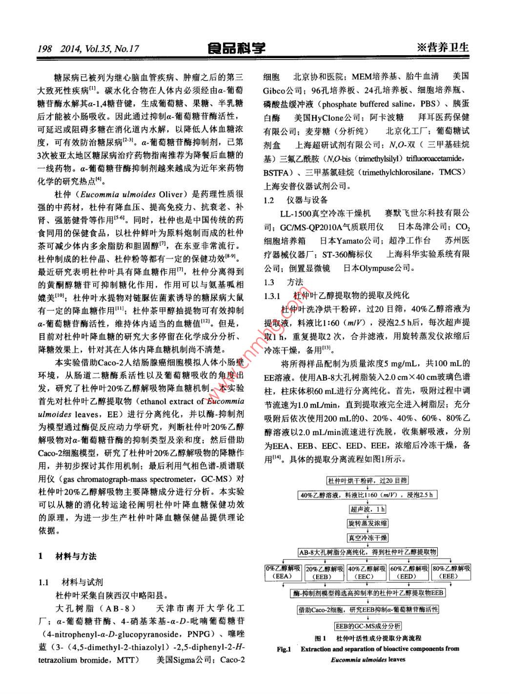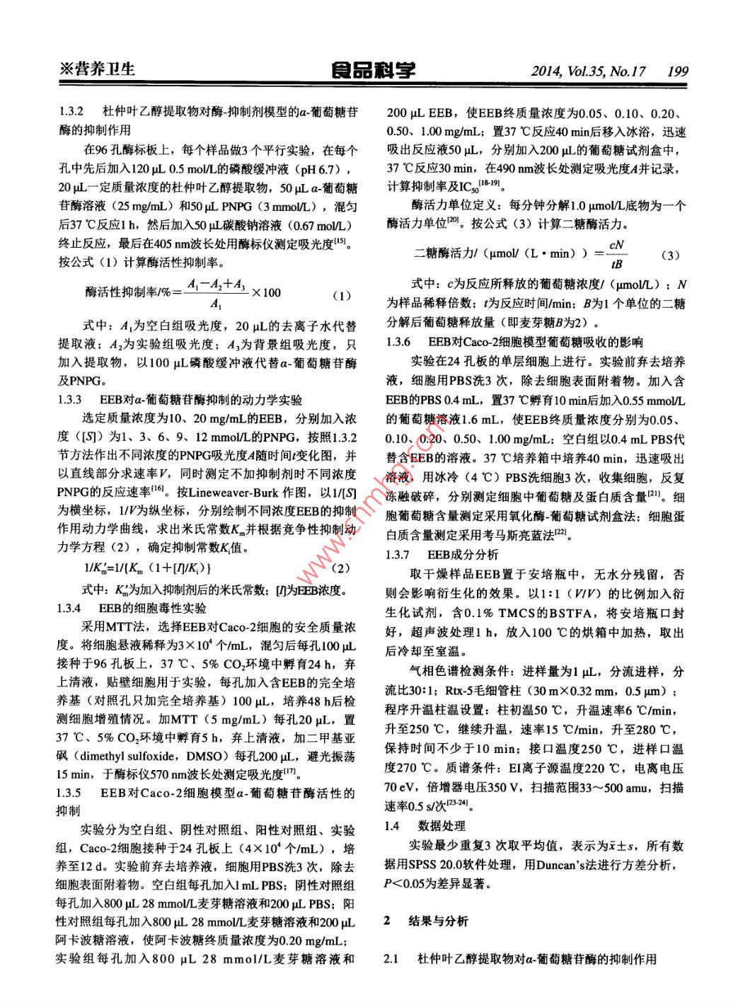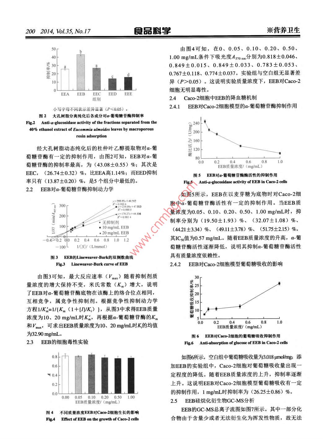 ※營(yíng)養(yǎng)衛(wèi)生品科獸2014V.35,No.17197杜仲葉乙醇提取物的降糖作用機(jī)理張紅霞,楊丹丹,王鳳,李伊嬌,范俊峰(北京林業(yè)大學(xué)生物科學(xué)與技術(shù)學(xué)院,北京100083)摘要:為了闡明杜仲葉的降血糖功效及其機(jī)制,采用酶抑制劑模型,篩選高抑制率的杜仲葉乙醇提取物并判斷其對(duì)α-葡萄糖苷酶的抑制類型;借助caco-2人結(jié)腸腺癌細(xì)胞模型,研究杜仲葉20%乙醇解吸物對(duì)α-葡萄糖苷酶活性及葡萄糖轉(zhuǎn)運(yùn)蛋白的影響;氣相色譜質(zhì)譜聯(lián)用分析杜仲葉20%乙醇解吸物主要成分。杜仲葉20%乙醇解吸物可競(jìng)爭(zhēng)性地抑制a葡萄糖苷酶,其抑制常數(shù)K值為3290mg/mL。它對(duì)Caco-2細(xì)胞中的a-葡萄糖苷酶有較強(qiáng)抑制作用,其ICs為0.57mg/mL,且對(duì)Cac-2細(xì)胞攝取葡萄糖也有一定抑制作用,1mg/m時(shí)抑制率可達(dá)2625%。氣相色譜質(zhì)譜分析表明杜仲葉20%乙醇解吸物主要有DL異檸檬酸內(nèi)酯、百里酚、兒茶素、2,6-二羥基苯甲酸和3,4-羥基苯丙烯酸等。這些結(jié)果表明,杜仲葉乙醇提取物可以通過抑制a-葡萄糖苷酶活性,降低葡萄糖吸收來實(shí)現(xiàn)降血糖的效果。關(guān)鍵詞:杜仲葉;Caco-2細(xì)胞;α-葡萄糖苷酶;降血糖;葡萄糖轉(zhuǎn)運(yùn):兒茶素Ethanol Extract of Eucommia ulmoides Leaves Inhibits Alpha-Glucosidase in Caco-2 CellsZHANG Hong-xia, YANG Dan-dan, WANG Feng, LI Yi-jiao, FAN Jun-fengCollege of Biological Sciences and Technology, Beijing Forestry University, Beijing 100083, China)Abstract: The inhibitory effects of 40% ethanol extract of Eucommia ulmoides leaves on alpha-glucosidase and glucosetransport were investigated in Caco-2 cells in vitro to elucidate the anti-hyperglycemic mechanism of Eucommia ulmoideleaves. The alpha-glucosidase inhibitors in the ethanol extract were also identified by GC-MS analysis. The kinetic studyshowed that the 20% ethanol elution fraction(EEB)from macroporous resin AB-8 of the ethanol extract of Eucommiaulmoides leaves could competitively inhibit alpha-glucosidase with a K, value of 32.90 mg/mL, indicating that alphaglucosidase has a strong affinity with the extract. Meanwhile, the inhibition was found to be reinforced as the concentrationof EEB increased. For investigation of the inhibitory effect of EEB in Caco-2 cells, cytotoxicity assays were firstly conductedby using different concentrations of EEB (0.05, 0.10, 0.20, 0.50 and 1.00 mg/mL)to determine the safety level at which cellgrowth and viability could not be affected. All tested concentrations of EEB had no effect on the growth or viability of Caco-2cells. Subsequently, EEB at various concentration exhibited effective suppression on alpha-glucosidase by using maltose(28 mmol/L) as the substrate in Caco-2 cells in a concentration-dependent manner with an ICs of 0.57 mg/mL. FurthermoreEEB could also attenuate glucose transport in Caco-2 cells, which could be decreased to 26. 25% by EEB(1 mg/mL).Theseresults indicate that EEB exerts strong anti-hyperglycemic effect by suppressing disaccharidase and glucose transportorsGC-MS analysis was conducted to elucidate the composition of the ethanol extract of Eucommia ulmoides leaves. It wasfound that acids, monosaccharides, polyphenols, esters, amino acids were the main components of EEB. Further analysis byGC-MS revealed that the ethanol extract was rich in DL-isocitric acid lactone, thymol, catechin, 2, 6-dihydroxybenzoic acidand 3, 4-dihydroxy cinnamic acid. These compounds may play important roles in the hypoglycemic effect of the extract.Thepresent study suggests Eucommia ulmoides leaves are a medicinal food material for preventing and treating diabetes,andcould be further developed into healthful productsKey words: Eucommia ulmoides leaves; Caco-2 cells; a-glucosidase; hypoglycemic; glucose transport; catechin中圖分類號(hào):TS2521文獻(xiàn)標(biāo)志碼:A文章編號(hào):1002-6630(2014)17-019707doi:10.7506spkx1002-6630201417038收稿日期:2013-11-03基金項(xiàng)目:國(guó)家自然科學(xué)基金面上項(xiàng)目(J103516)作者簡(jiǎn)介:張紅霞(1988-),女,碩士研究生,研究方向?yàn)楣δ苄允称?。E-mail:Luludeert305@sina.cn*通信作者:范俊峰(1970—),男,副教授,博士,研究方向?yàn)橹苍葱远嚯暮忘S酮的抗血栓、抗糖尿病功能。1982014,.35,No.17自品科字※營(yíng)養(yǎng)衛(wèi)生糖尿病已被列為繼心腦血管疾病、胂瘤之后的第三細(xì)胞北京協(xié)和醫(yī)院;MEM培養(yǎng)基、胎牛血清美國(guó)大致死性疾病凹。碳水化合物在人體內(nèi)必須經(jīng)由α-葡萄 Gibco公司;96孔培養(yǎng)板、24孔培養(yǎng)板、細(xì)胞培養(yǎng)瓶、糖苷酶水解其α-1,4糖苷鍵,生成葡萄糖、果糖、半乳糖磷酸鹽緩沖液( phosphate buffered saline,PBS)、胰蛋后才能被小腸吸收。因此通過抑制a葡萄糖苷酶活性,白酶美國(guó) Hy Clone公司;阿卡波糖拜耳醫(yī)藥保健可延遲或阻礙多糖在消化道內(nèi)水解,以降低人體血糖濃有限公司;麥芽糖(分析純)北京化工廠:葡萄糖試度,可有效防治糖尿病。a-葡萄糖苷酶抑制劑,已第劑盒上海超研試劑有限公司:N,O-雙(三甲基硅烷3次被亞太地區(qū)糖尿病治療藥物指南推薦為降餐后血糖的基)三氟乙酰胺(MObs( (trimethylsi) trifluoroacetamide,線藥物。a-葡萄糖苷酶抑制劑越來越成為近年來藥物 BSTFA)、三甲基氯硅烷( trimethylchlorosilane,TMcs)化學(xué)的研究熱點(diǎn)。上海安普儀器試劑公司。杜仲( Eucommia uLmoides oliver)是藥理性質(zhì)很強(qiáng)的中藥材,杜仲有降血壓、提高免疫力、抗衰老、補(bǔ)12儀器與設(shè)備腎、強(qiáng)筋健骨等作用6。同時(shí),杜仲也是