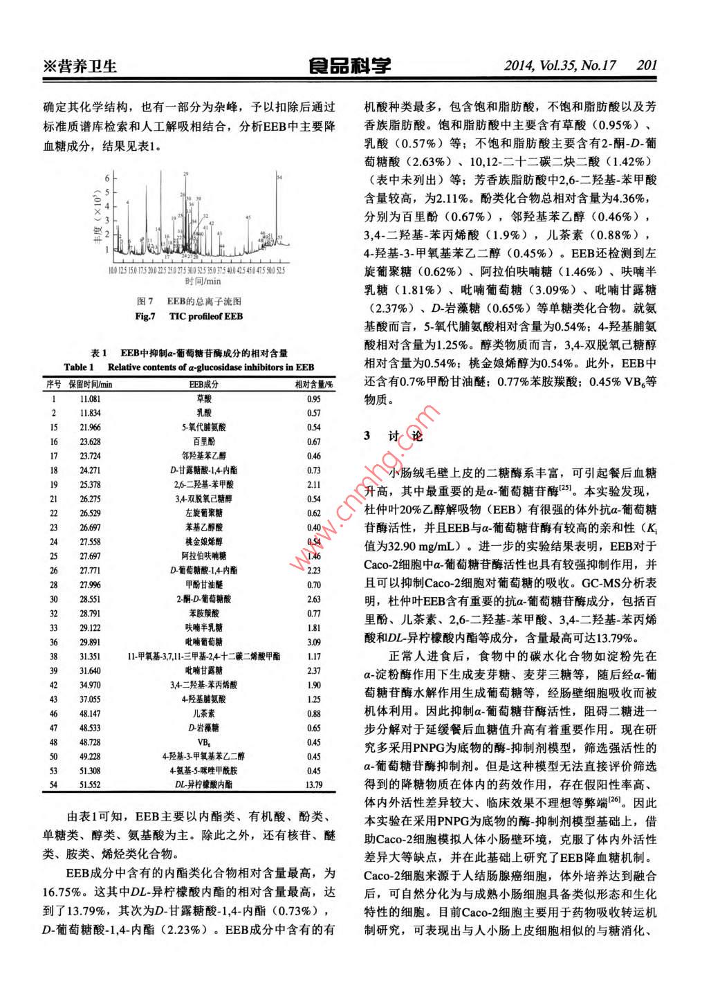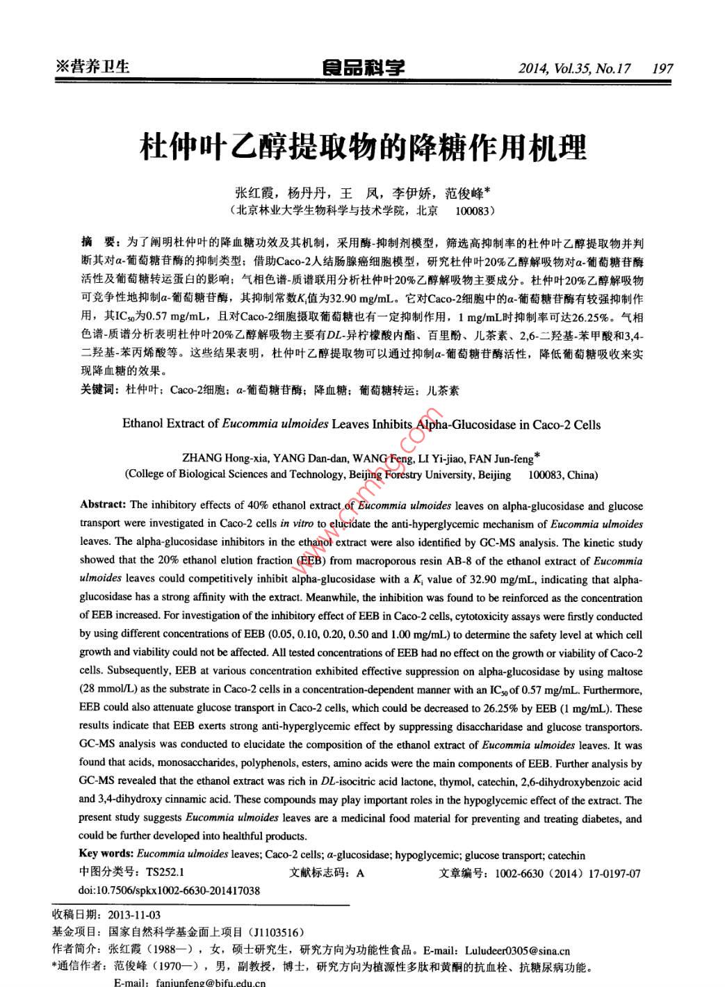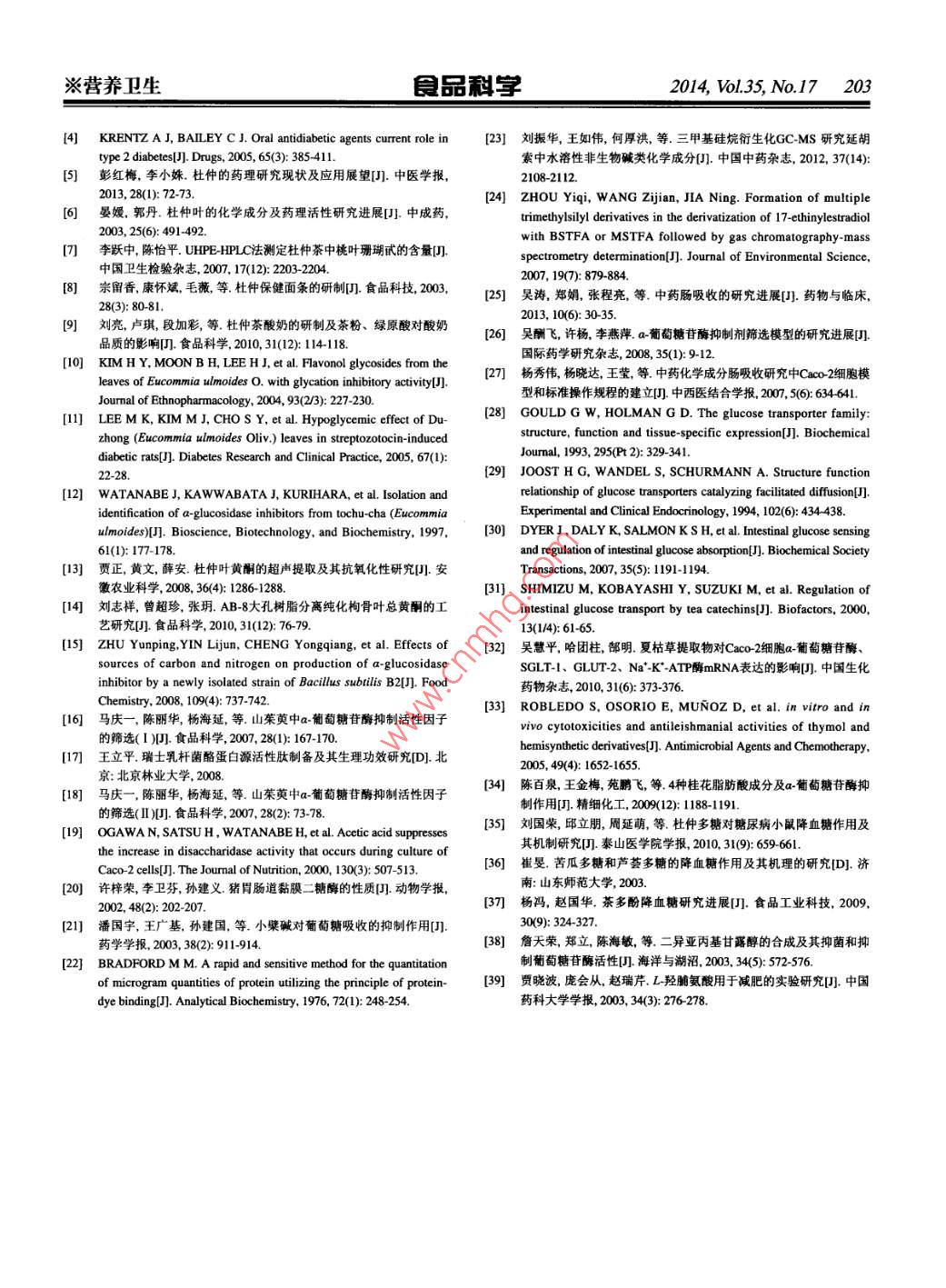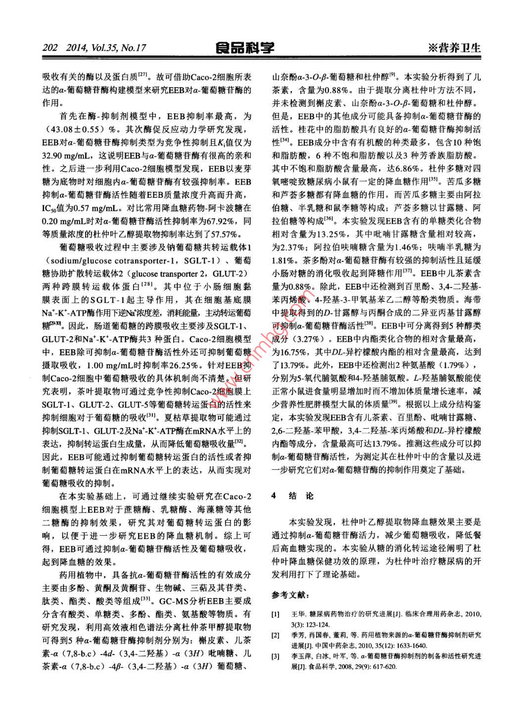 ※營(yíng)養(yǎng)衛(wèi)生品科獸2014V.35,No.17197杜仲葉乙醇提取物的降糖作用機(jī)理張紅霞,楊丹丹,王鳳,李伊嬌,范俊峰(北京林業(yè)大學(xué)生物科學(xué)與技術(shù)學(xué)院,北京100083)摘要:為了闡明杜仲葉的降血糖功效及其機(jī)制,采用酶抑制劑模型,篩選高抑制率的杜仲葉乙醇提取物并判斷其對(duì)α-葡萄糖苷酶的抑制類型;借助caco-2人結(jié)腸腺癌細(xì)胞模型,研究杜仲葉20%乙醇解吸物對(duì)α-葡萄糖苷酶活性及葡萄糖轉(zhuǎn)運(yùn)蛋白的影響;氣相色譜質(zhì)譜聯(lián)用分析杜仲葉20%乙醇解吸物主要成分。杜仲葉20%乙醇解吸物可競(jìng)爭(zhēng)性地抑制a葡萄糖苷酶,其抑制常數(shù)K值為3290mg/mL。它對(duì)Caco-2細(xì)胞中的a-葡萄糖苷酶有較強(qiáng)抑制作用,其ICs為0.57mg/mL,且對(duì)Cac-2細(xì)胞攝取葡萄糖也有一定抑制作用,1mg/m時(shí)抑制率可達(dá)2625%。氣相色譜質(zhì)譜分析表明杜仲葉20%乙醇解吸物主要有DL異檸檬酸內(nèi)酯、百里酚、兒茶素、2,6-二羥基苯甲酸和3,4-羥基苯丙烯酸等。這些結(jié)果表明,杜仲葉乙醇提取物可以通過抑制a-葡萄糖苷酶活性,降低葡萄糖吸收來實(shí)現(xiàn)降血糖的效果。關(guān)鍵詞:杜仲葉;Caco-2細(xì)胞;α-葡萄糖苷酶;降血糖;葡萄糖轉(zhuǎn)運(yùn):兒茶素Ethanol Extract of Eucommia ulmoides Leaves Inhibits Alpha-Glucosidase in Caco-2 CellsZHANG Hong-xia, YANG Dan-dan, WANG Feng, LI Yi-jiao, FAN Jun-fengCollege of Biological Sciences and Technology, Beijing Forestry University, Beijing 100083, China)Abstract: The inhibitory effects of 40% ethanol extract of Eucommia ulmoides leaves on alpha-glucosidase and glucosetransport were investigated in Caco-2 cells in vitro to elucidate the anti-hyperglycemic mechanism of Eucommia ulmoideleaves. The alpha-glucosidase inhibitors in the ethanol extract were also identified by GC-MS analysis. The kinetic studyshowed that the 20% ethanol elution fraction(EEB)from macroporous resin AB-8 of the ethanol extract of Eucommiaulmoides leaves could competitively inhibit alpha-glucosidase with a K, value of 32.90 mg/mL, indicating that alphaglucosidase has a strong affinity with the extract. Meanwhile, the inhibition was found to be reinforced as the concentrationof EEB increased. For investigation of the inhibitory effect of EEB in Caco-2 cells, cytotoxicity assays were firstly conductedby using different concentrations of EEB (0.05, 0.10, 0.20, 0.50 and 1.00 mg/mL)to determine the safety level at which cellgrowth and viability could not be affected. All tested concentrations of EEB had no effect on the growth or viability of Caco-2cells. Subsequently, EEB at various concentration exhibited effective suppression on alpha-glucosidase by using maltose(28 mmol/L) as the substrate in Caco-2 cells in a concentration-dependent manner with an ICs of 0.57 mg/mL. FurthermoreEEB could also attenuate glucose transport in Caco-2 cells, which could be decreased to 26. 25% by EEB(1 mg/mL).Theseresults indicate that EEB exerts strong anti-hyperglycemic effect by suppressing disaccharidase and glucose transportorsGC-MS analysis was conducted to elucidate the composition of the ethanol extract of Eucommia ulmoides leaves. It wasfound that acids, monosaccharides, polyphenols, esters, amino acids were the main components of EEB. Further analysis byGC-MS revealed that the ethanol extract was rich in DL-isocitric acid lactone, thymol, catechin, 2, 6-dihydroxybenzoic acidand 3, 4-dihydroxy cinnamic acid. These compounds may play important roles in the hypoglycemic effect of the extract.Thepresent study suggests Eucommia ulmoides leaves are a medicinal food material for preventing and treating diabetes,andcould be further developed into healthful productsKey words: Eucommia ulmoides leaves; Caco-2 cells; a-glucosidase; hypoglycemic; glucose transport; catechin中圖分類號(hào):TS2521文獻(xiàn)標(biāo)志碼:A文章編號(hào):1002-6630(2014)17-019707doi:10.7506spkx1002-6630201417038收稿日期:2013-11-03基金項(xiàng)目:國(guó)家自然科學(xué)基金面上項(xiàng)目(J103516)作者簡(jiǎn)介:張紅霞(1988-),女,碩士研究生,研究方向?yàn)楣δ苄允称?。E-mail:Luludeert305@sina.cn*通信作者:范俊峰(1970—),男,副教授,博士,研究方向?yàn)橹苍葱远嚯暮忘S酮的抗血栓、抗糖尿病功能。1982014,.35,No.17自品科字※營(yíng)養(yǎng)衛(wèi)生糖尿病已被列為繼心腦血管疾病、胂瘤之后的第三細(xì)胞北京協(xié)和醫(yī)院;MEM培養(yǎng)基、胎牛血清美國(guó)大致死性疾病凹。碳水化合物在人體內(nèi)必須經(jīng)由α-葡萄 Gibco公司;96孔培養(yǎng)板、24孔培養(yǎng)板、細(xì)胞培養(yǎng)瓶、糖苷酶水解其α-1,4糖苷鍵,生成葡萄糖、果糖、半乳糖磷酸鹽緩沖液( phosphate buffered saline,PBS)、胰蛋后才能被小腸吸收。因此通過抑制a葡萄糖苷酶活性,白酶美國(guó) Hy Clone公司;阿卡波糖拜耳醫(yī)藥保健可延遲或阻礙多糖在消化道內(nèi)水解,以降低人體血糖濃有限公司;麥芽糖(分析純)北京化工廠:葡萄糖試度,可有效防治糖尿病。a-葡萄糖苷酶抑制劑,已第劑盒上海超研試劑有限公司:N,O-雙(三甲基硅烷3次被亞太地區(qū)糖尿病治療藥物指南推薦為降餐后血糖的基)三氟乙酰胺(MObs( (trimethylsi) trifluoroacetamide,線藥物。a-葡萄糖苷酶抑制劑越來越成為近年來藥物 BSTFA)、三甲基氯硅烷( trimethylchlorosilane,TMcs)化學(xué)的研究熱點(diǎn)。上海安普儀器試劑公司。杜仲( Eucommia uLmoides oliver)是藥理性質(zhì)很強(qiáng)的中藥材,杜仲有降血壓、提高免疫力、抗衰老、補(bǔ)12儀器與設(shè)備腎、強(qiáng)筋健骨等作用6。同時(shí),杜仲也是