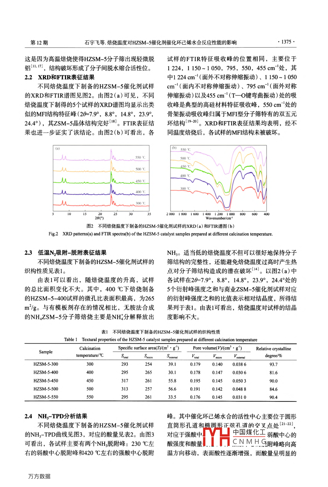 焙燒溫度對HZSM-5催化劑催化環(huán)己烯水合反應(yīng)性能的影響