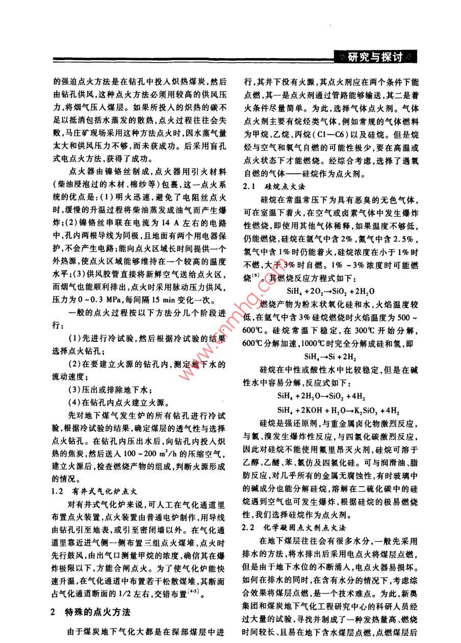 研究與探討的強(qiáng)迫點(diǎn)火方法是在鉆孔中投入熾熱煤炭,然后行,其井下沒有火源,其點(diǎn)火劑應(yīng)在兩個(gè)條件下能由鉆孔供風(fēng),這種點(diǎn)火方法必須用較高的供風(fēng)壓點(diǎn)燃,其一是點(diǎn)火劑通過管路能夠輸送,其二是著力,將煙氣壓人煤層。如果所投入的熾熱的碳不火條件盡量簡單。為此,選擇氣體點(diǎn)火劑。氣體足以抵消包括水蒸發(fā)的散熱,點(diǎn)火過程往往會失點(diǎn)火劑主要有烷烴類氣體,例如常規(guī)的氣體燃料敗,馬莊礦現(xiàn)場采用這種方法點(diǎn)火時(shí),因水蒸氣量為甲烷、乙烷、丙烷(C1-C6)以及硅烷。但是烷太大和供風(fēng)壓力不夠,而未獲成功。后采用盲孔烴與空氣和氧氣自燃的可能性極少,要在高溫或式電點(diǎn)火方法,獲得了成功。點(diǎn)火狀態(tài)下才能燃燒。經(jīng)綜合考慮,選擇了遇氧點(diǎn)火器由鎳鉻絲制成,點(diǎn)火器用引火材料自燃的氣體一硅 烷作為點(diǎn)火劑。(柴油浸泡過的木材、棉紗等)包裹,這一點(diǎn)火系2.1 硅烷點(diǎn)火法統(tǒng)的優(yōu)點(diǎn)是:(1)明火迅速,避免了電阻絲點(diǎn)火硅烷在常溫常壓下為具有惡臭的無色氣體,時(shí),緩慢的升溫過程將柴油蒸發(fā)成油氣而產(chǎn)生爆可在室溫下著火,在空氣或鹵素氣體中發(fā)生爆炸炸;(2)鎳鉻絲串聯(lián)在電流為14 A左右的電路性燃燒,即使用其他氣體稀釋,如果溫度不夠低,中,孔內(nèi)兩根導(dǎo)線為同極,且地面有兩個(gè)用電器保仍能燃燒,硅烷在氬氣中含2% ,氮?dú)庵泻?. 5%,護(hù),不會產(chǎn)生電路;能向點(diǎn)火區(qū)域長時(shí)間提供-個(gè)氫氣中含1%時(shí)仍能著火,硅烷濃度在小于1%時(shí)外熱源,使點(diǎn)火區(qū)域能夠維持在一個(gè)較高的溫度不燃,大于3%時(shí)自燃。1% ~3%濃度時(shí)可能燃水平;(3)供風(fēng)膠管直接將新鮮空氣送給點(diǎn)火區(qū),燒°。其燃燒反應(yīng)方程式如下:而煙氣也能順利排出,點(diǎn)火時(shí)采用脈動壓力供風(fēng),SiH, +202-→Si02 + 2H20壓力為0~0.3 MPa,每間隔15 min變化一次。燃燒產(chǎn)物為粉末狀氧化硅和水,火焰溫度較一般的點(diǎn)火過程按以下方法分幾個(gè)階段進(jìn)低,在氬氣中含3%硅烷燃燒時(shí)火焰溫度為500~行:(1)先進(jìn)行冷試驗(yàn),然后根據(jù)冷試驗(yàn)的結(jié)果600C。硅烷常溫下穩(wěn)定,在300C開始分解,600C分解加速,1000C時(shí)完全分解成硅和氫,即選擇點(diǎn)火鉆孔;SiH,- +Si +2H,(2)在要建立火源的鉆孔內(nèi),測定地下水的硅烷在中性或酸性水中比較穩(wěn)定,但是在堿流動速度;性水中容易分解,反應(yīng)式如下:(3)壓出或排除地下水;SiH, +2H20-→SiO2 +4H2(4)在鉆孔內(nèi)點(diǎn)火建立火源。SiH, +2KOH +H2O- +K,SiO, +4H,先對地下煤氣發(fā)生爐的所有鉆孔進(jìn)行冷試驗(yàn),根據(jù)冷試驗(yàn)的結(jié)果,確定煤層的透氣性與選擇硅烷是強(qiáng)還原劑,與重金屬鹵化物激烈反應(yīng),點(diǎn)火鉆孔。在鉆孔內(nèi)壓出水后,向鉆孔內(nèi)投入熾與氯、溴發(fā)生爆炸性反應(yīng),與四氯化碳激烈反應(yīng),熱的焦炭,然后送入100 ~200 m'/h的壓縮空氣,因此對硅烷不能使用氟里昂滅火劑,硅烷可溶于建立火源后,檢查燃燒產(chǎn)物的組成,判斷火源形成乙醇、乙醚苯、氯仿及四氯化硅??膳c潤滑油、脂的情況。肪反應(yīng),對幾乎所有的金屬無腐蝕性,有時(shí)玻璃中1.2 有井式氣化爐點(diǎn)火的堿成分也能分解硅烷,溶解在二碗化碳中的硅對有井式氣化爐來說,可人工在氣化通道里烷遇到空氣也可發(fā)生爆炸,根據(jù)硅烷的極易燃燒布置點(diǎn)火裝置,點(diǎn)火裝置由普通電爐制作,用導(dǎo)線性,我們選擇硅烷作為點(diǎn)火劑。由鉆孔引至地表,或引至密閉墻以外。在氣化通2.2化學(xué)凝固點(diǎn)火劑點(diǎn)火法道里靠近進(jìn)氣側(cè)一側(cè)布置三組點(diǎn)火煤堆,點(diǎn)火時(shí)在地下煤層往往會有很多水分,一般先采用先行鼓風(fēng),由出氣口測量甲烷的濃度,確信其在爆排水的方法,將水排出后采用電點(diǎn)火將煤層點(diǎn)燃,炸極限以下,方能合閘點(diǎn)火。為了使氣化爐能快但是由于地下水位的不斷涌入,電點(diǎn)火器易損壞。速升溫,在氣化通道中布置若干松散煤堆,其斷面如何在排水的同時(shí),在含有水分的情況下,考慮綜占?xì)饣ǖ罃嗝娴?/2左右,交錯(cuò)布置43)。合效果將煤層點(diǎn)燃,是-一個(gè)技術(shù)難點(diǎn)。為此,新奧集團(tuán)和煤炭地下氣化工程研究中心的科研人員經(jīng)2特殊的點(diǎn)火方法過大量的試驗(yàn),尋找并制成了一種發(fā)熱量高、燃燒由于煤炭地下氣化大都是在深部煤層中進(jìn).時(shí)間較長、且易在地下含水煤層點(diǎn)燃,點(diǎn)燃煤層后