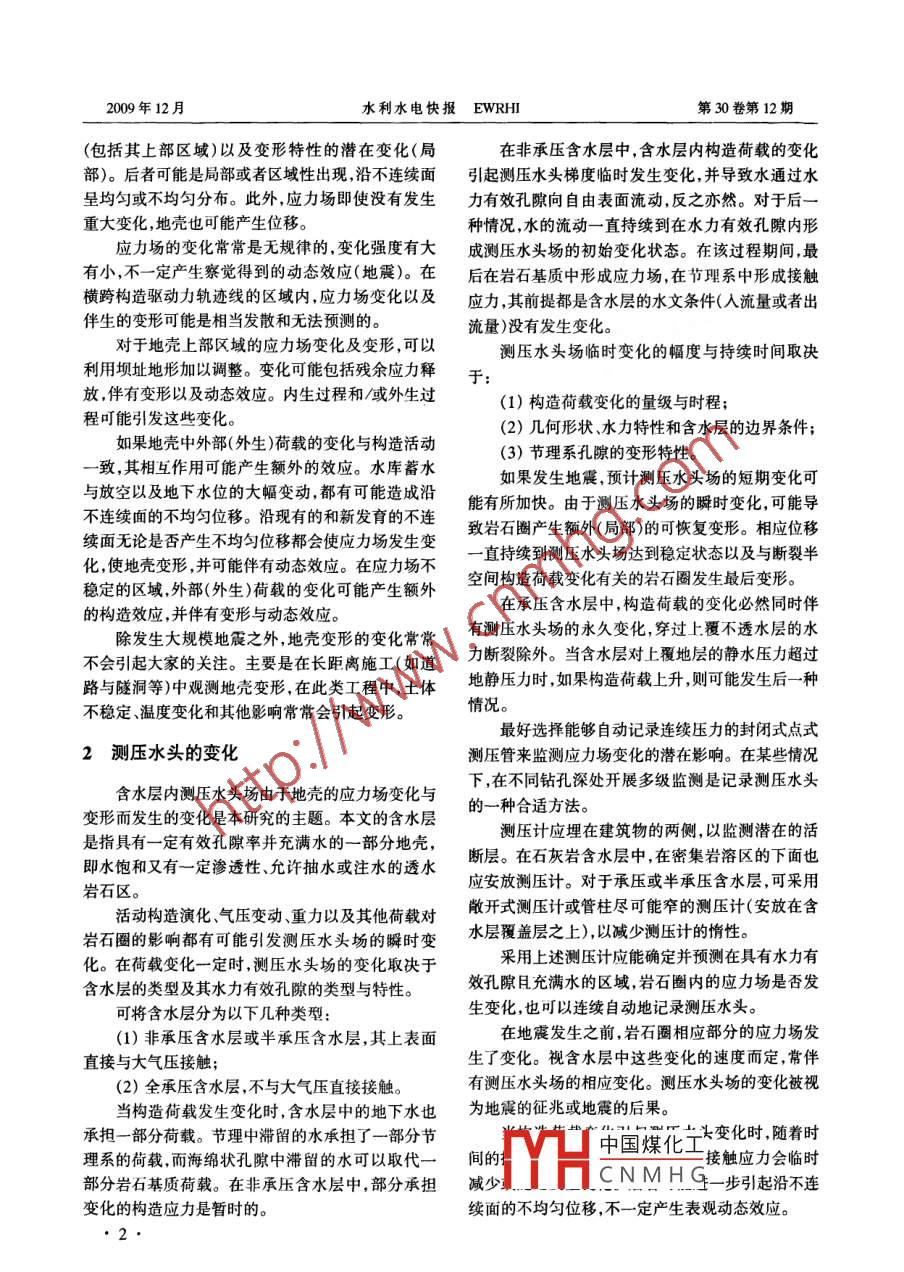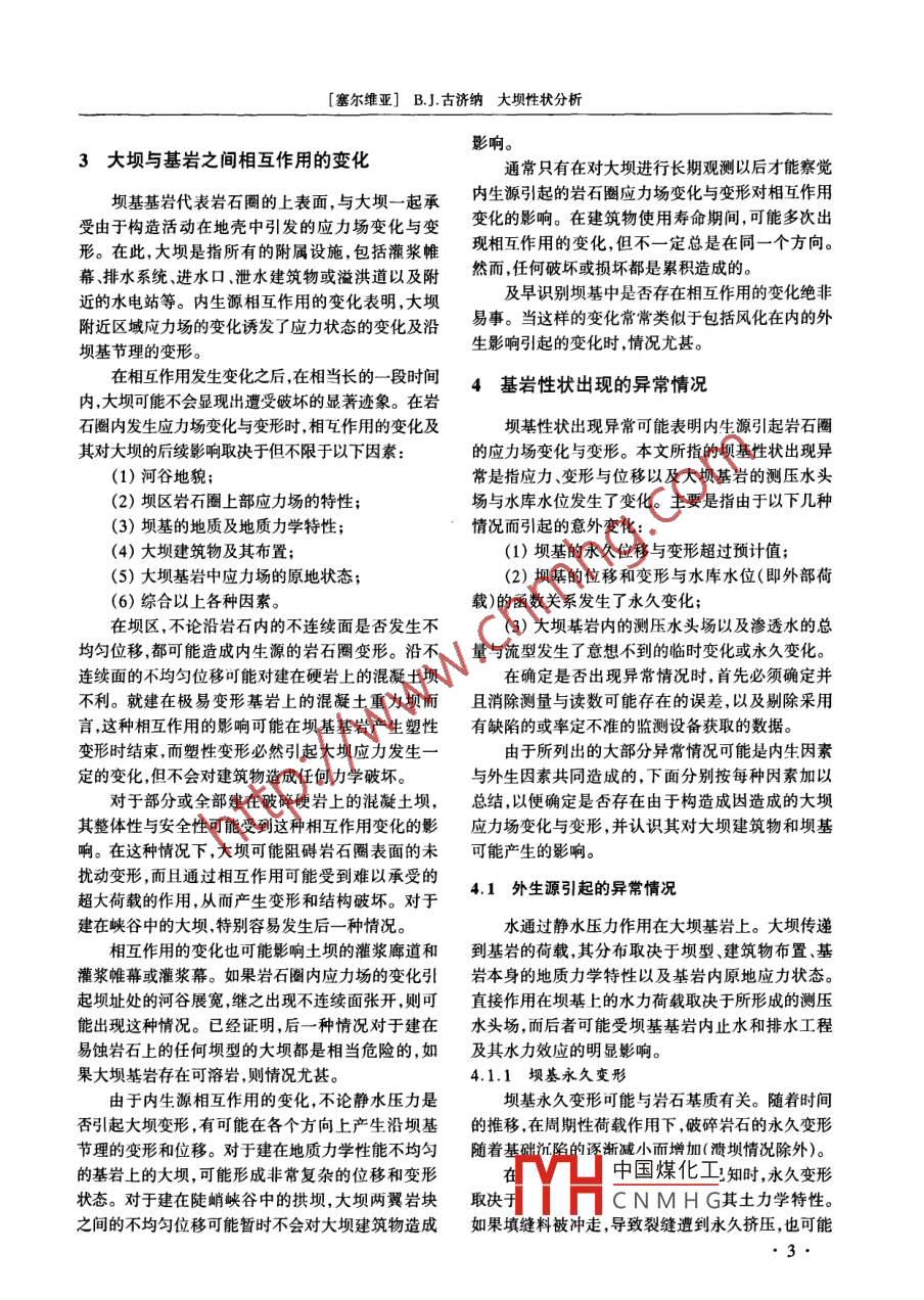 2009年12月.水利水電快報EWRHI .第30卷第12期試驗與研究文章編號: 100102009020000大壩性狀分析[塞爾維亞] B.J. 古濟納摘要:地殼的應力場變化與變形大多是由構(gòu)造活動引起的,不一定伴有表觀動態(tài)效應(即地震),并通過相互作用可能經(jīng)過壩基影響大壩。隨著大壩使用壽命的臨近,這種現(xiàn)象的發(fā)生及其對大壩性狀的累積影響變得更加可能。為了監(jiān)測大壩性狀并檢測可能存在的偏差,從設計階段開始直至整個運行期,都需要對其進行觀測。尤其是要盡早報告各種變化、確定其起源、預測其進一步的發(fā)展趨勢及其對大壩安全的影響。關鍵詞:大壩;壩變形;性能分析;應力分析中團分類號:TV698. 11文獻標識碼:A確定引起大壩性狀變化的實際原因,特別是在塊與不連續(xù)面)的特點是:具有影響地殼變形和應力早期觀測其變化,是一項極為復雜、涉及多個學科的場(即其對外生與內(nèi)生活動的響應)的地質(zhì)力學特工作。性。大壩性狀發(fā)生變化可能與以下情況有關:可以證明,地殼中表面應力場極不均勻,而且受(1)大壩和(或其基巖的物理力學性能發(fā)生了地形 溫度變化等的制約。地殼或巖石變形因荷載變化;變化產(chǎn)生的變化與基質(zhì)巖塊和一系列不連續(xù)面的變(2)巖石圈發(fā)生內(nèi)生演變過程(構(gòu)造活動),然形有關。不連續(xù)面的變形可能在兩個方向發(fā)生,或后經(jīng)過基巖傳遞到大壩。者垂直于不連續(xù)面(包括張開),或者沿不連續(xù)面可在上述兩種情況下,大壩性狀的變化或異??赡墚a(chǎn)生滑移,甚至可能兼而有之。第1種變形是垂能相似,本文對這兩個問題進行了研究。直于平面節(jié)理的應力變化的非線性函數(shù)。如果裂縫由于內(nèi)生活動引起的壩基性狀異常一般是間斷張開,巖石圈半空間就會發(fā)生局部斷裂。由于應力性發(fā)展和出現(xiàn)的,只有在大壩運行一段時期后 ,大壩變化,垂直于不連續(xù)面的應力趨于拉伸時,就會產(chǎn)生或其附屬建筑物已經(jīng)發(fā)生破壞時才能被發(fā)現(xiàn)。不連續(xù)面張開。本文旨在幫助及早發(fā)現(xiàn)和識別上述第2種現(xiàn)象地殼上部的應力場是由于重力、構(gòu)造活動以及及其對壩基性狀的影響,以及促進對監(jiān)測系統(tǒng)數(shù)據(jù)溫度變化形成的。應力場由主應力及最大主應力軌跡線表示。巖石圈內(nèi)的主應力通常隨深度的增加而解讀手段的升級和現(xiàn)代化。增大。觀測到地殼構(gòu)造活動區(qū)的應力場容易隨時間1地殼的應 力場變化與變形的變化而變化,即應力場是變化的,不受控制。某- -給定巖石圈區(qū)域發(fā)生變化的位置、范圍與速度及其本文將地殼視為- -個非均勻的半空間(或準空地質(zhì)力學特性取決于構(gòu)造活動以及外部因素的變間),將其分成若千個基質(zhì)巖塊和網(wǎng)格不連續(xù)面來進化,如土壤沖刷、石冰川巖層融化靜水壓力變化、滑行分析。不連續(xù)面主要是構(gòu)造活動和其他荷載及其坡活動、水庫蓄水等。變化產(chǎn)生的斷裂。半空間的兩個組成部分(基質(zhì)巖中國煤化工應的變形與位移收稿日期:2009-08-20FYHCNMHG2009年12月水利水電快報EWRHI .第30卷第12期(包括其上部區(qū)域)以及變形特性的潛在變化(局在非承壓含水層中,含水層內(nèi)構(gòu)造荷載的變化部)。后者可能是局部或者區(qū)域性出現(xiàn),沿不連續(xù)面引起測壓水頭梯度臨時發(fā)生變化,并導致水通過水呈均勻或不均勻分布。此外,應力場即使沒有發(fā)生力有效孔隙向自由表面流動,反之亦然。對于后一重大變化,地殼也可能產(chǎn)生位移。種情況,水的流動一直持續(xù)到在水力有效孔隙內(nèi)形應力場的變化常常是無規(guī)律的,變化強度有大成測壓水頭場的初始變化狀態(tài)。在該過程期間,最有小,不- -定產(chǎn)生察覺得到的動態(tài)效應(地震)。在后在巖石基質(zhì)中形成應力場,在節(jié)理系中形成接觸橫跨構(gòu)造驅(qū)動力軌跡線的區(qū)域內(nèi),應力場變化以及應力,其前提都是含水層的水文條件(人流量或者出伴生的變形可能是相當發(fā)散和無法預測的。流量)沒有發(fā)生變化。對于地殼上部區(qū)域的應力場變化及變形,可以測壓水頭場臨時變化的幅度與持續(xù)時間取決利用壩址地形加以調(diào)整。變化可能包括殘余應力釋于:放,伴有變形以及動態(tài)效應。內(nèi)生過程和/或外生過(1)構(gòu)造荷載變化的量級與時程;程叮能引發(fā)這些變化。(2)幾何形狀、水力特性和含水層的邊界條件;如果地殼中外部(外生)荷載的變化與構(gòu)造活動(3)節(jié)理系孔隙的變形特性。-致,其相互作用可能產(chǎn)生額外的效應。水庫蓄水如果發(fā)生地震,預計測壓水頭場的短期變化可與放空以及地下水位的大幅變動,都有可能造成沿能有所加快。由于測壓水頭場的瞬時變化,可能導不連續(xù)面的不均勻位移。沿現(xiàn)有的和新發(fā)育的不連致巖石圈產(chǎn)生額外(局部)的可恢復變形。相應位移續(xù)面無論是否產(chǎn)生不均勻位移都會使應力場發(fā)生變一直持續(xù)到測壓水頭場達到穩(wěn)定狀態(tài)以及與斷裂半化,使地殼變形,并可能伴有動態(tài)效應。在應力場不空間構(gòu)造荷載變化有關的巖石圈發(fā)生最后變形。穩(wěn)定的區(qū)域,外部(外生)荷載的變化可能產(chǎn)生