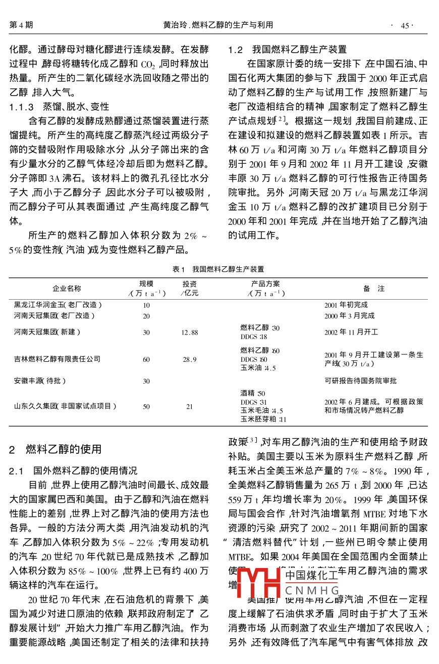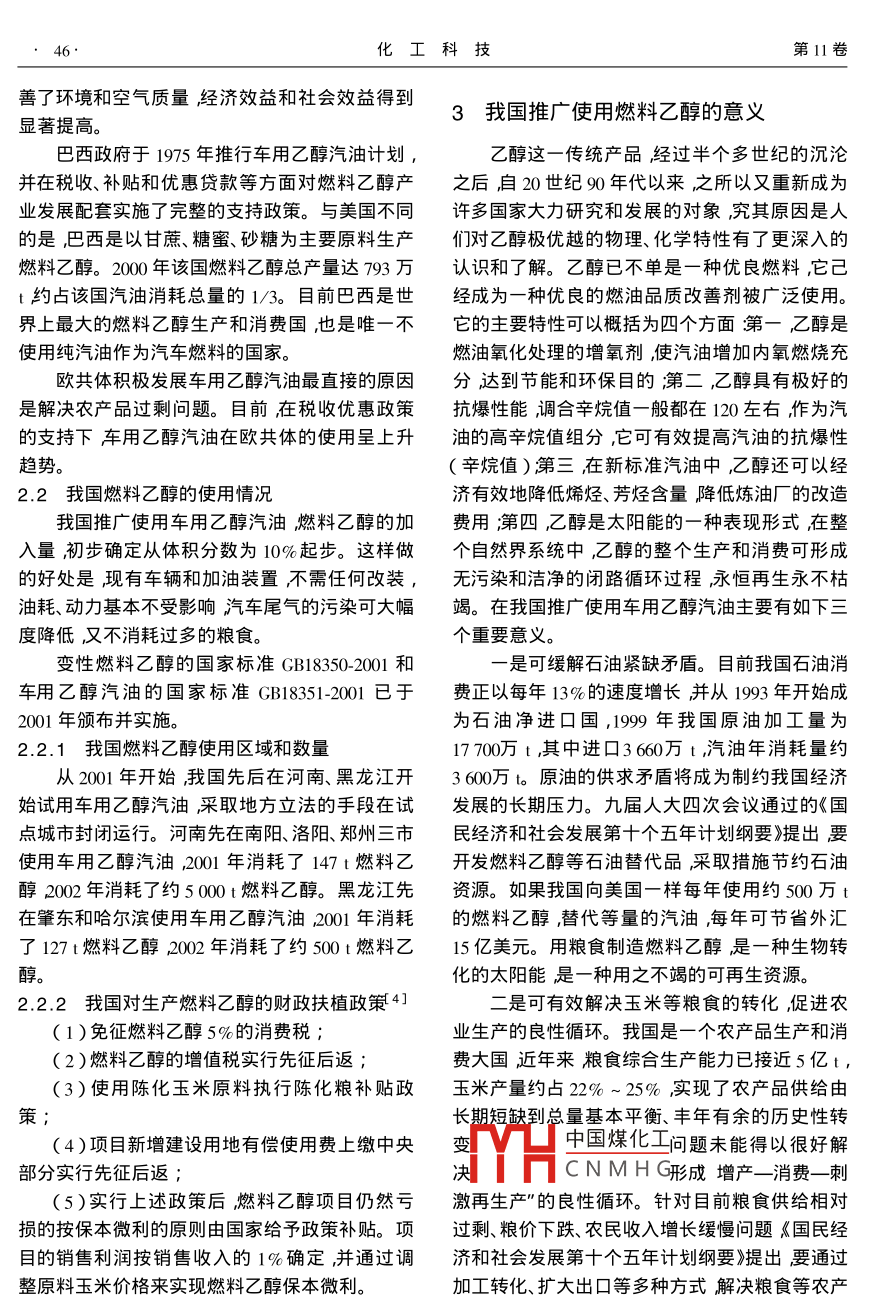 綜述專論化工科技2003,1K4)海~4ScIeNCE technology chemical industry燃料乙醇的生產(chǎn)與利用*黃治玲吉林燃料乙醇有限責(zé)任公司吉林吉林132101)摘要燃料乙醇作為一種新興能源已經(jīng)列入我國十五"發(fā)展規(guī)劃項(xiàng)目。筆者介紹了我國燃料乙醇的發(fā)展規(guī)劃、項(xiàng)目建設(shè)及相關(guān)政策介紹了美國、巴西等國及我國燃料乙醇的生產(chǎn)和使用情況介紹了我國生產(chǎn)燃料乙醇和使用乙醇汽油對于節(jié)省石油資源、改善環(huán)境和增加農(nóng)民收入的意乂。關(guān)鍵詞燃料乙醇乙醇汽油壓玉米酒精中圖分類號:TQ23.12+2文獻(xiàn)標(biāo)識碼:A文章編號:10080511200304-004404乙醇俗稱酒精它以玉米、小麥、薯類、糖蜜白飼料DDGS)玉米粕、玉米油、CO2、沼氣等。吉等為原料經(jīng)發(fā)酵、蒸餾而制成將乙醇進(jìn)一步脫林60萬υa燃料乙醇項(xiàng)目引進(jìn)國外先進(jìn)技術(shù)和水得燃料乙醇。為了避免燃料乙醇流入食用酒精關(guān)鍵設(shè)備以玉米為原料采用改良濕法生產(chǎn)燃料市場而被飲用要將燃料乙醇變性即在燃料乙醇乙醇。如圖1所示生產(chǎn)過程包括玉米預(yù)處理(粉中加入變性攽適量汽油垢形成變性燃料乙醇。碎)脫胚制漿、液化、糖化、發(fā)酵、蒸餾、脫水和變車用乙醇汽油是在汽油中加入一定比例的變性。性燃料乙醇形成的一種新型混合燃料固際上稱料(料理伸手國制干國然回汽油醇商品名 GASOHOI)這項(xiàng)技術(shù)在國外已粉漿十分成熟。目前國外使用車用乙醇汽油的國家主要是美國和巴西歐共體自20世紀(jì)90年代初也化確每開始生產(chǎn)使用車用乙醇汽油。在這種燃料中乙[放或加工為三氧化發(fā)酵子發(fā)酵成熟醪醇既是一種能源又是一種良好的汽油增氧劑和高辛烷值調(diào)和組分用以代替四乙基鉛和甲基叔圖1燃料乙醇生產(chǎn)流程簡圖丁基醚MIBE減乙基叔丁基醚(ETBE)用乙醇1.1.1玉米脫胚制漿作增氧劑可顯著降低汽車尾氣中的有害物質(zhì)起玉米經(jīng)水或酒糟離心清液在一定溫度下進(jìn)行到凈化空氣的功效。同時用糧食制造的乙醇是浸泡浸泡后的玉米經(jīng)破碎磨破碎分離出胚芽并種生物轉(zhuǎn)化的太陽能是一種用之不竭的可再將纖維及淀粉顆粒破碎到一定的粒度。脫胚后的生資源。這樣在汽油中加入一定比例的乙醇作燃料就能收到節(jié)約石油、凈化空氣和轉(zhuǎn)化過剩的玉米淀粉漿(含有淀粉、蛋白質(zhì)和纖維等物質(zhì)送糧食等一舉多得之效。為人類社會的可持續(xù)發(fā)展入液化工段。提供了一條簡單有效的途徑。1.1.2液化、糖化和發(fā)酵淀粉在高溫下糊化同時在α-淀粉酶的作用1燃料乙醇的生產(chǎn)下降解物料的粘度降低這一過程稱為液化。液1.1生產(chǎn)過程化后的醪液稱為液化醪、液化前需加入氫氧化鈉發(fā)酵法酒精的生產(chǎn)工藝有干法和濕法1不中國煤化工直和補(bǔ)充部分氮源同同的工藝會產(chǎn)生不同的副產(chǎn)品其中包括酒糟蛋時CNMH粉酶的穩(wěn)定性。液化醪經(jīng)稀硫酸調(diào)節(jié)pH值后加入糖化酶進(jìn)行糖化。收稿日期2003-0402醇有限責(zé)任公司工程師主要從柳州人毒燃料乙糖化的目的是將液化醪中的淀粉及糊精水解成酵母能發(fā)酵的糖類(主要是單糖及部分二糖及三糖重點(diǎn)項(xiàng)目吉林60萬ta燃料乙醇項(xiàng)目是國家十五期間重點(diǎn)建設(shè)項(xiàng)目及國家新興能源試點(diǎn)、示范工程。如葡萄糖、麥芽糖、蔗糖等)糖化后的醪液稱為糖第4期黃治玲.燃料乙醇的生產(chǎn)與利用化醪。通過酵母對糖化醪進(jìn)行連續(xù)發(fā)酵。在發(fā)酵1.2我國燃料乙醇生產(chǎn)裝置過程中酵母將糖轉(zhuǎn)化成乙醇和CO2同時釋放出在國家原計委的統(tǒng)一安排下在中國石油、中熱量。所產(chǎn)生的二氧化碳經(jīng)水洗回收隨之帶出的國石化兩大集團(tuán)的參與下我國于2000年正式啟乙醇排入大氣。動了燃料乙醇的生產(chǎn)與試用工作按照新建廠與1.1.3蒸餾、脫水、變性老廠改造相結(jié)合的精神國家制定了燃料乙醇生含有乙醇的發(fā)酵成熟醪通過蒸餾裝置進(jìn)行蒸產(chǎn)試點(diǎn)規(guī)劃2。根據(jù)這一規(guī)劃我國目前建成、正餾提純。所產(chǎn)生的高純度乙醇蒸汽經(jīng)過兩級分子在建設(shè)和擬建設(shè)的燃料乙醇裝置如表1所示。吉篩的交替吸附作用吸除水分從分子篩岀來的含林6萬υa和河南30萬υa年燃料乙醇項(xiàng)目分有少量水分的乙醇?xì)怏w經(jīng)冷卻后即為燃料乙醇。別于2001年9月和2002年11月開工建設(shè)安徽分子篩即3A沸石。該材料上的微孔孔徑比水分豐原30萬υa燃料乙醇的可行性報告正待國務(wù)子大而小于乙醇分子因此水分子可以被吸附,院審批。另外河南天冠20萬ta與黑龍江華潤而乙醇分子可從其表面通過產(chǎn)生高純度乙醇?xì)饨鹩?0萬ta燃料乙醇的改擴(kuò)建項(xiàng)目已分別于體。2000年和2001年完成并在當(dāng)?shù)亻_始了乙醇汽油所生產(chǎn)的燃料乙醇加入體積分?jǐn)?shù)為2%的試用工作。5%的變性汽油減為變性燃料乙醇產(chǎn)品。表1我國燃料乙醇生產(chǎn)裝置企業(yè)名稱規(guī)模資產(chǎn)品方案萬/億元X萬ta1)龍江華潤金玉(老廠改造)2001年初完成河南天冠集團(tuán)老廠改造)2000年3月完成河南天冠集團(tuán)新建)燃料乙醇302002年11月開