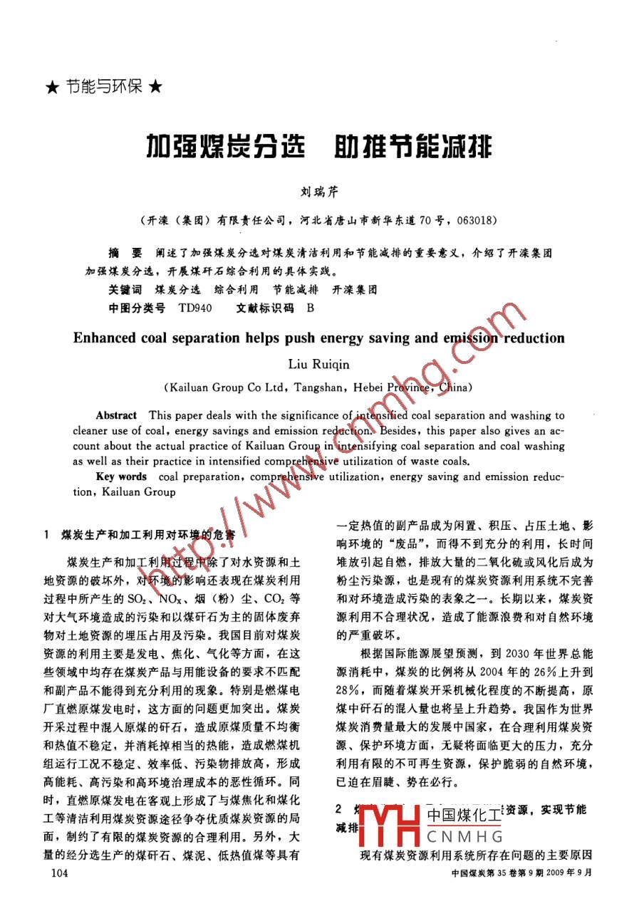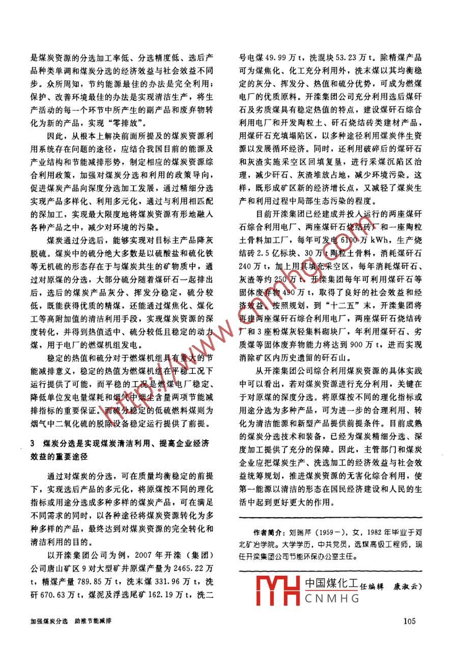 ★節(jié)能與環(huán)?!锛訌?qiáng)煤炭分選助推節(jié)能減排劉瑞芹(開灤(集團(tuán))有限責(zé)任公司,河北省唐山市新華東道70號(hào),063018)摘要闡述了加強(qiáng)煤炭分選對(duì)煤炭清潔利用和節(jié)能減排的重要意義,介紹了開灤集團(tuán)加強(qiáng)煤炭分選,開展煤矸石綜合利用的具體實(shí)踐。關(guān)鍵詞煤炭分選 綜合利用 .節(jié)能減排開灤集團(tuán)中圖分類號(hào)TD940文獻(xiàn)標(biāo)識(shí)碼BEnhanced coal separation helps push energy saving and emission reductionLiu Ruiqin(Kailuan Group Co Ltd, Tangshan, Hebei Province, China)Abstract This paper deals with the significance of intensified coal separation and washing tocleaner use of coal, energy savings and emission reduction. Besides, this paper also gives an ac-count about the actual practice of Kailuan Group in intensifying coal separation and coal washingas well as their practice in intensified comprehensive utilization of waste coals.Key words coal preparation, comprehensive utilization, energy saving and emission reduc-tion, Kailuan Group一定熱值的副產(chǎn)品成為閑置、積壓、占?jí)和恋?、?煤炭生產(chǎn)和加工利用對(duì)環(huán)境的危害響環(huán)境的“廢品”, 而得不到充分的利用,長時(shí)間煤炭生產(chǎn)和加工利用過程中除了對(duì)水資源和土堆放引起自燃,排放大量的二氧化硫或風(fēng)化后成為地資源的破壞外,對(duì)環(huán)境的影響還表現(xiàn)在煤炭利用粉塵污染源,也是現(xiàn)有的煤炭資源利用系統(tǒng)不完善過程中所產(chǎn)生的SO2、NOx.煙(粉)塵、CO2等和對(duì)環(huán)境造成污染的表象之一。長期以來,煤炭資對(duì)大氣環(huán)境造成的污染和以煤矸石為主的固體廢棄源利用不合理狀況,造成了能源浪費(fèi)和對(duì)自然環(huán)境物對(duì)土地資源的埋壓占用及污染。我國目前對(duì)煤炭的嚴(yán)重破壞。資源的利用主要是發(fā)電、焦化、氣化等方面,在這根據(jù)國際能源展望預(yù)測,到2030年世界總能些領(lǐng)域中均存在煤炭產(chǎn)品與用能設(shè)備的要求不匹配源消耗中,煤炭的比例將從2004年的26%上升到和副產(chǎn)品不能得到充分利用的現(xiàn)象。特別是燃煤電28%,而隨著煤炭開采機(jī)械化程度的不斷提高,原廠直燃原煤發(fā)電時(shí),這方面的問題更加突出。煤炭煤中矸石的混入量也將呈上升趨勢(shì)。我國作為世界開采過程中混入原煤的矸石,造成原煤質(zhì)量不均衡煤炭消費(fèi)量最大的發(fā)展中國家,在合理利用煤炭資和熱值不穩(wěn)定,并消耗掉相當(dāng)?shù)臒崮?,造成燃煤機(jī)源、保護(hù)環(huán)境方面,無疑將面臨更大的壓力,充分組運(yùn)行工況不穩(wěn)定、效率低、污染物排放高,形成利用有限的不可再生資源,保護(hù)脆弱的自然環(huán)境,高能耗、高污染和高環(huán)境治理成本的惡性循環(huán)。同已迫在眉睫、勢(shì)在必行。時(shí),直燃原煤發(fā)電在客觀上形成了與煤焦化和煤化工等清潔利用煤炭資源途徑爭奪優(yōu)質(zhì)煤炭資源的局減排中國煤化工資源,實(shí)現(xiàn)節(jié)能面,制約了有限的煤炭資源的合理利用。另外,大TYHCNMHG量的經(jīng)分選生產(chǎn)的煤矸石、煤泥、低熱值煤等具有現(xiàn)有煤炭資源利用系統(tǒng)所存在問題的主要原因104中國煤炭第35卷第9期2009年9月是煤炭資源的分選加工率低、分選精度低、選后產(chǎn)號(hào)電煤49.99萬t,洗混塊53. 23萬t。除精煤產(chǎn)品品種類單調(diào)和煤炭分選的經(jīng)濟(jì)效益與社會(huì)效益不同可為煤焦化、化工充分利用外,洗末煤以其均衡穩(wěn)步。眾所周知,節(jié)約能源最佳的辦法是完全利用;定的灰分、揮發(fā)分、熱值和硫分優(yōu)勢(shì),可成為燃煤保護(hù)、改善環(huán)境最佳的辦法是實(shí)現(xiàn)清潔生產(chǎn),將生電廠的優(yōu)質(zhì)原料。開灤集團(tuán)公司充分利用選后煤矸產(chǎn)活動(dòng)的每一個(gè)環(huán)節(jié)中所產(chǎn)生的副產(chǎn)品和廢棄物轉(zhuǎn)石及劣質(zhì)煤具有穩(wěn)定熱值的特點(diǎn),建設(shè)煤矸石綜合.化為新的產(chǎn)品,實(shí)現(xiàn)“零排放”。利用電廠和開發(fā)陶粒土、矸石燒結(jié)磚類建材產(chǎn)品,因此,從根本.上解決前面所提及的煤炭資源利用煤矸石充填塌陷區(qū),以多種途徑利用煤炭伴生資用系統(tǒng)存在問題的途徑,應(yīng)結(jié)合我國目前的能源及源以發(fā)展循環(huán)經(jīng)濟(jì)。同時(shí),還利用破碎后的煤矸石產(chǎn)業(yè)結(jié)構(gòu)和節(jié)能減排形勢(shì),制定相應(yīng)的煤炭資源綜和灰渣實(shí)施采空區(qū)回填復(fù)墾,進(jìn)行采煤沉陷區(qū)治合利用政策,加強(qiáng)對(duì)煤炭分選和利用的政策導(dǎo)向,理,減少研石、灰渣堆放占地,減少環(huán)境污染。這促進(jìn)煤炭產(chǎn)品向深度分選加工發(fā)展,通過精細(xì)分選樣,既形成礦區(qū)新的經(jīng)濟(jì)增長點(diǎn),又減輕了煤炭生實(shí)現(xiàn)產(chǎn)品多樣化、利用多元化,通過與利用相匹配產(chǎn)和利用過程中局部生態(tài)污染的程度。的深加工,實(shí)現(xiàn)最大限度地將煤炭資源有形地融人目前開灤集團(tuán)已經(jīng)建成并投入運(yùn)行的兩座煤矸各種產(chǎn)品之中,減少對(duì)環(huán)境的污染。石綜合利用電廠、兩座煤矸石燒結(jié)磚廠和一座陶粒煤炭通過分選后,能夠?qū)崿F(xiàn)對(duì)目標(