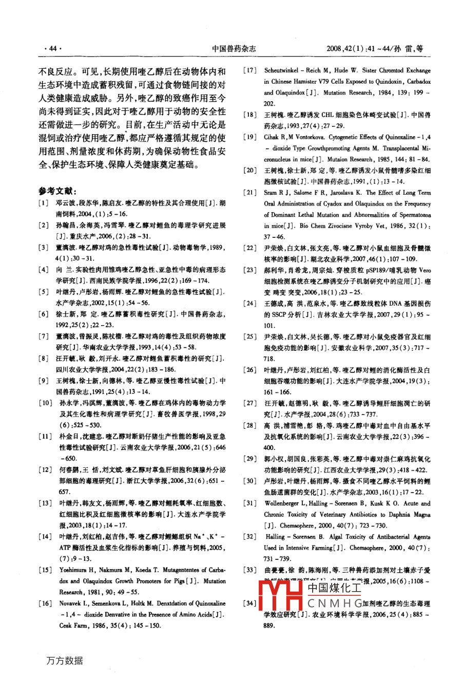 2008,42(1):41-44/孫雷,等中國獸藥雜志喹乙醇的毒理學(xué)研究概況孫雷,韓嘉媛2,汪霞',王樹槐(1中國善醫(yī)藥品監(jiān)察所北京100081;2.核工業(yè)北京化工冶金研究院北京101149)收稿日期]2007-12-04[文獻(xiàn)標(biāo)識碼]A[文章編號]1002-1280(2008)01-0041-04[中圖分類號]9859.83[摘要]就目前喹乙醇的毒理學(xué)以及對畜禽、魚類和生態(tài)環(huán)境等的毒性研究情況進(jìn)行了回顧和綜述。[關(guān)鍵詞]喹乙醇;毒理;生態(tài)毒性喹乙醇( Olaquindox)是1965年由德國拜耳公司以鄰硝基苯胺為原料合成的一種抗菌促生長劑,20世紀(jì)70年代起,歐共體、澳大利亞、日本、中國等CONHCH2 CH2OH陸續(xù)批準(zhǔn)該藥作為飼料添加劑使用。美國食品藥品監(jiān)管局(FDA)因與喹乙醇結(jié)構(gòu)相似的同類藥物卡巴氧被證實具有致癌作用,一直未批準(zhǔn)該藥的使CH用,歐盟從199年起也禁止其使用。我國2000年版獸藥典中規(guī)定喹乙醇只能用于幼豬禁用于禽和圖1喹乙醇的化學(xué)結(jié)構(gòu)式體重超過35kg的豬,休藥期35d;2005年版獸藥典中又規(guī)定喹乙醇禁用于魚類。在早期,喹乙醇被2喹乙醇的毒理學(xué)研究認(rèn)為是一種高效、低毒、低殘留的優(yōu)良抗菌促生長2.1急性毒性急性毒性是研究外來化合物對機(jī)劑,但近些年來,很多學(xué)者對喹乙醇的毒性重新做體毒性效應(yīng)的第一步,是指機(jī)體一次性接觸外來化了深入系列的研究與評價認(rèn)為它是一種基因毒劑合物之后引起的中毒效應(yīng)(甚至死亡),一般通過測和生殖誘變劑,有致突變、致畸作用,畜禽產(chǎn)品中殘定化合物對實驗動物的半數(shù)致死量(LDo)來初步留的喹乙醇可致染色體斷裂能誘發(fā)機(jī)體出現(xiàn)細(xì)胞估計其毒害的危險性。已報道的LD計算方法有突變等。本文就目前喹乙醇的毒理學(xué)研究情況平均致死量法(改良寇氏法)和劑量遞增法(霍恩進(jìn)行綜述,為綜合評價其毒理學(xué)安全性提供參考,氏法),LD值越小表明化合物的毒性越大。喹乙為促進(jìn)我國畜牧業(yè)的健康發(fā)展提供保障醇對不同動物的急性毒性試驗結(jié)果總結(jié)見表1,可1喹乙醇的理化性質(zhì)以看出其毒性敏感程度存在較為明顯的動物種屬喹乙醇化學(xué)名稱為2-[N-(2-羥基-乙基)差異,其中禽類敏感性最高,魚類敏感性相對較低。氨基甲酰]-3-甲基-喹嗯啉-1,4-二氧化2.2蓄積毒性當(dāng)動物機(jī)體與外來化合物發(fā)生長物結(jié)構(gòu)式見圖1,分子式C12H3N3O4;為淺黃色結(jié)期多次接觸時,化合物反復(fù)進(jìn)入動物機(jī)體,當(dāng)進(jìn)入晶粉末,無臭、味苦;溶于熱水,微溶于冷水,難溶于的速度或總量超過代謝的速度或總量時,就會在動甲醇、乙醇和氯仿,熔點(diǎn)為207~213℃;空氣中穩(wěn)物體內(nèi)逐漸增加產(chǎn)生蓄積作用。研究蓄積作用常定;對光敏感光照易分解為棕色,人接觸后易引起用固定劑量法或定期遞增劑量法結(jié)果都以蓄積系皮膚光敏反應(yīng)。數(shù)中國煤化工物的蓄積作用越CNMHG作者簡介:孫雷(1978年-),男,碩士,助理研究員,主要從事獸藥安全性評價工作。E-mail:sunlit@ivdc.gov.cn42中國獸藥雜志008,42(1):41~44/孫雷,等弱。喹乙醇對不同動物的蓄積毒性試驗結(jié)果總結(jié)復(fù)突變率高。Nak等在枯草桿菌DNA修復(fù)見表2,不難發(fā)現(xiàn)喹乙醇有中度至明顯的蓄積毒性。試驗中發(fā)現(xiàn)喹乙醇對枯草桿菌(re+和ree-)修表1喹乙醇對不同動物的急性毒性/LD復(fù)試驗為陽性,提示其DNA完整性受損。另外,喹乙醇對哺乳動物細(xì)胞也有致突變作用, Scheutwinkel給藥途徑等1用喹乙醇處理v9細(xì)胞,發(fā)現(xiàn)姐妹染色單體小白鼠內(nèi)服交換頻率增加,且存在劑量反應(yīng)關(guān)系。王樹槐{1內(nèi)服報道喹乙醇在大于6.6g/mL劑量時不論加或不1000-2000加S9代謝活化系統(tǒng)都對CHL細(xì)胞染色體產(chǎn)生畸變作用,也存在劑量反應(yīng)關(guān)系艾維因肉雞內(nèi)服2.4.2體內(nèi)誘變試驗在骨髓細(xì)胞染色體畸變試腹腔注射1022.6驗、微核試驗、精子畸形試驗以及小鼠顯性致死突表2喹乙醇對不同動物的蓄積毒性6變試驗等哺乳動物體內(nèi)誘變試驗中,喹乙醇除在顯性致死突變試驗中表現(xiàn)陰性外,其余均表現(xiàn)陽性動物蓄積系數(shù)K蓄積作用分級Cihak等在ICR小鼠處死前24h灌胃給予800小白鼠中度至明顯蓄積mg/kg的喹乙醇可引起小鼠骨髓細(xì)胞染色體斷裂。石岐雜雞中度蓄積王樹槐等20發(fā)現(xiàn)給予750mg/kg的喹乙醇即可誘鯉魚1.45-1,9明顯蓄積發(fā)小鼠骨髓嗜多染紅細(xì)胞(PCE)微核率達(dá)到23亞慢性毒性亞慢性毒性是指動物連續(xù)多日36.5%。Sram等(口服給予ICR雄性小鼠不同劑接觸較大劑量外來化合物所出現(xiàn)的中毒效應(yīng)常引量喹乙醇然后與未處理的雌性小鼠交配發(fā)現(xiàn)喹起動物表觀、臟器發(fā)生改變,并引起血液和肝、腎等乙醇顯性致死突變試驗陰性,精子畸形試驗陽性,組織出現(xiàn)病變。喹乙醇作用于動物后會嚴(yán)重?fù)p害與陰性對照組精子畸形率1.86%比較喹乙醇500動物肝腎組織,引起機(jī)體生理生化指標(biāo)的變化。王mg/kg劑量時精子畸形率達(dá)到6.94%。在另一項樹槐等發(fā)現(xiàn)在亞慢性毒性試驗中喹乙醇能引起研究中口服給予ICR-SPF雌性小鼠喹乙醇4周后Wistar大鼠肝腎組織出現(xiàn)實質(zhì)性病變,嚴(yán)重時