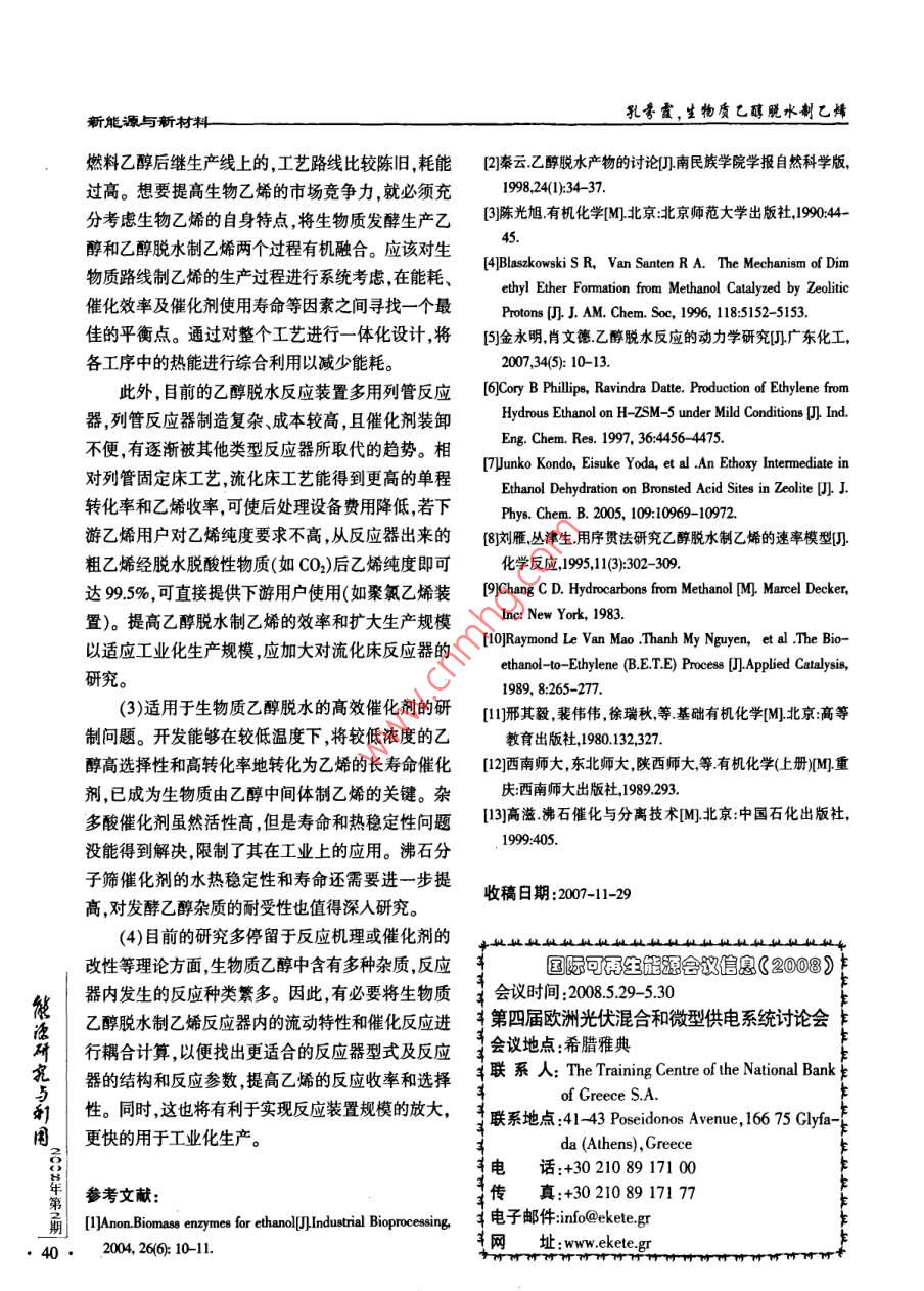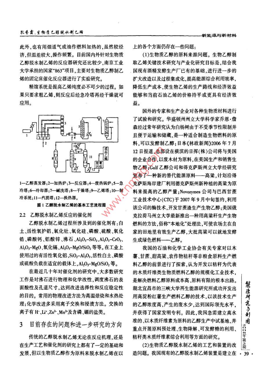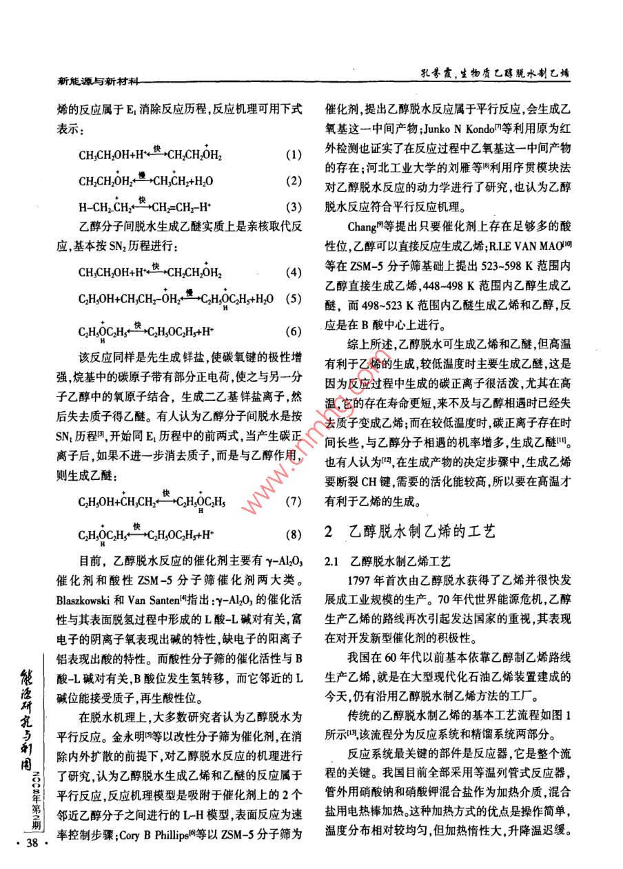 新能源與新材料生物質(zhì)乙醇脫水制乙烯孔芬霞肖睿(東南大學(xué)能源與環(huán)境學(xué)院江蘇南京210096)摘要:介紹了生物質(zhì)乙醇脫水制乙烯的發(fā)展現(xiàn)狀,并與石油裂解制乙烯進(jìn)行了比較,闡述了其突出的優(yōu)點(diǎn)。同時(shí)對(duì)生物質(zhì)乙醇脫水制乙烯的反應(yīng)動(dòng)力學(xué)機(jī)理、國(guó)內(nèi)外常用的反應(yīng)器和主要工藝進(jìn)行了闡述。最后指出了目前存在的問(wèn)題,如原料來(lái)源、工藝和設(shè)備的改進(jìn)、新型催化劑的研制等。關(guān)鍵詞:生物質(zhì)乙醇;催化劑;反應(yīng)機(jī)理;反應(yīng)器工藝Abstract: The development condition of biomass ethanol dehydrating to produce ethylene isintroduced, giving a comparison with petroleum cracking to ethylene; its outstanding advantage isalso discussed. At the same time the reaction kinetic mechanism, the commonly used reactor andprocess at home and abroad are in discussion. At last, this paper points out the problems at presentsuch as raw material source, the improvement of process and equipment, the problem of research onnew catalysts, et al.Key words: biomass ethanol; catalysts; reaction mechanism; reactor and process中圖分類(lèi)號(hào):TK019文獻(xiàn)標(biāo)志碼:A文章編號(hào):1001-55232008)02-0037-04目前有75%的石油化工產(chǎn)品由乙烯生產(chǎn),乙烯可避免對(duì)石油資源的依賴。對(duì)貧油或無(wú)油國(guó)家及地產(chǎn)量已成為衡量一個(gè)國(guó)家石油化工工業(yè)發(fā)展水平區(qū),尤其對(duì)以農(nóng)業(yè)為主的國(guó)家十分重要。的標(biāo)志。目前國(guó)家已明確將生物乙醇脫水制乙烯列(2)石油貯量隨著開(kāi)采量的增加和開(kāi)采時(shí)間的入“863計(jì)劃”生物和現(xiàn)代農(nóng)業(yè)領(lǐng)域的“生物能源技延長(zhǎng)逐漸減少,要考慮將來(lái)生產(chǎn)乙烯原料的長(zhǎng)久來(lái)術(shù)開(kāi)發(fā)與產(chǎn)業(yè)化"項(xiàng)目指南中。生物質(zhì)乙醇指以生源問(wèn)題。物質(zhì)為原料通過(guò)發(fā)酵制得的乙醇叫,生物質(zhì)原料包(3)用生物質(zhì)乙醇作原料脫水制乙烯投資少,建括玉米、高粱、小麥、大麥、甘蔗、甜菜和土豆等含糖設(shè)周期短,收效快,工藝簡(jiǎn)單技術(shù)要求不高。類(lèi)和淀粉的農(nóng)作物,此外城市垃圾、甘蔗渣、小樹(shù)(4)生物質(zhì)乙醇催化脫水制乙烯純度高,產(chǎn)品單干、木片等纖維質(zhì)原料也可用來(lái)生產(chǎn)生物燃料乙純。如果不要求聚合乙烯則可不必分離,直接使用醇。生物乙醇濃度較低,通常僅為10%(質(zhì)量分?jǐn)?shù))(乙烯純度一般可達(dá)98%)。左右。發(fā)酵液中還含有許多其他雜質(zhì),如甲醇、乙(5)利用生物質(zhì)乙醇作為替代原料對(duì)改善環(huán)境便酸、甘油等,通過(guò)蒸餾將乙醇產(chǎn)物分離純化需要消有極大的好處。耗很大的能量。乙烯可以由乙醇脫水得到,因此將低濃度的生物乙醇不經(jīng)過(guò)嚴(yán)格的分離純化,而是1乙醇脫水的動(dòng)力學(xué)研究次研究與用步催化脫水制乙烯可以作為生物質(zhì)產(chǎn)業(yè)的一個(gè)重乙醇的脫水反應(yīng)可以分為分子間脫水和分子內(nèi)要發(fā)展方向。脫水兩種,即分子內(nèi)脫水—E1歷程和分子間脫生物質(zhì)乙醇脫水制乙烯有其突出的優(yōu)點(diǎn)水—SN2或SN1歷程(1)原料乙醇主要來(lái)源于農(nóng)副產(chǎn)品的發(fā)酵這樣乙醇在酸催化作用下,發(fā)生分子內(nèi)脫水生成乙,37孔謄霞,生物質(zhì)乙醇水制乙烯新能源與新村料烯的反應(yīng)屬于E1消除反應(yīng)歷程,反應(yīng)機(jī)理可用下式催化劑提出乙醇脫水反應(yīng)屬于平行反應(yīng),會(huì)生成乙示氧基這一中間產(chǎn)物; Junko n Kondo等利用原為紅CH, CH2 0H+H*++CHCH OH,(1)外檢測(cè)也證實(shí)了在反應(yīng)過(guò)程中乙氧基這一中間產(chǎn)物的存在;河北工業(yè)大學(xué)的劉雁等利用序貫?zāi)K法CH, CH,OH2*-+CH3CHr+H,0(2)對(duì)乙醇脫水反應(yīng)的動(dòng)力學(xué)進(jìn)行了研究,也認(rèn)為乙醇H-CH,-CH2++CH=CHr-H*(3)脫水反應(yīng)符合平行反應(yīng)機(jī)理。乙醇分子間脫水生成乙醚實(shí)質(zhì)上是親核取代反Changh等提出只要催化劑上存在足夠多的酸應(yīng),基本按SN2歷程進(jìn)行:性位,乙醇可以直接反應(yīng)生成乙烯 RLE VAN MACH CHOH+H快 CHCH,OH2(4)等在2SM5分子師基礎(chǔ)上提出523598K范圍內(nèi)乙醇直接生成乙烯,448-498K范圍內(nèi)乙醇生成乙C2 HSOH+CH,CH-OH+→CH√O(píng)C2H+H1O(5)醚,而498-523K范圍內(nèi)乙醚生成乙烯和乙醇反CHSOCHSCHSOC Hs+H+應(yīng)是在B酸中心上進(jìn)行綜上所述乙醇脫水可生成乙烯和乙醚但高溫該反應(yīng)同樣是先生成鐸鹽,使碳氧鍵的極性增有利于乙烯的生成,較低溫度時(shí)主要生成乙醚這是強(qiáng)烷基中的碳原子帶有部分正電荷使之與另一分因?yàn)榉磻?yīng)過(guò)程中生成的碳正離子很活潑,尤其在高子乙醇中的氧原子結(jié)合,生成二乙基鹽離子,然溫,它的存在壽命更短來(lái)不及與乙醇相遇時(shí)已經(jīng)失后失去質(zhì)子得乙醚。有人認(rèn)為乙醇分子間脫水是按去質(zhì)子變成乙烯;而在較低溫度時(shí)碳正離子存在時(shí)sN1歷程啊,開(kāi)始同E1歷程中的前兩式當(dāng)產(chǎn)生碳正間長(zhǎng)些,與乙醇分子相遇的機(jī)率增多生成乙醚。離子后如果不進(jìn)一步消去質(zhì)子,而是與