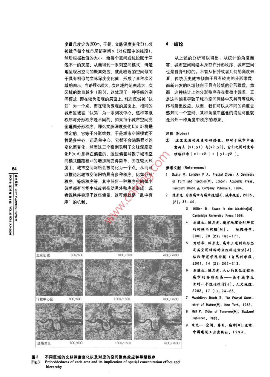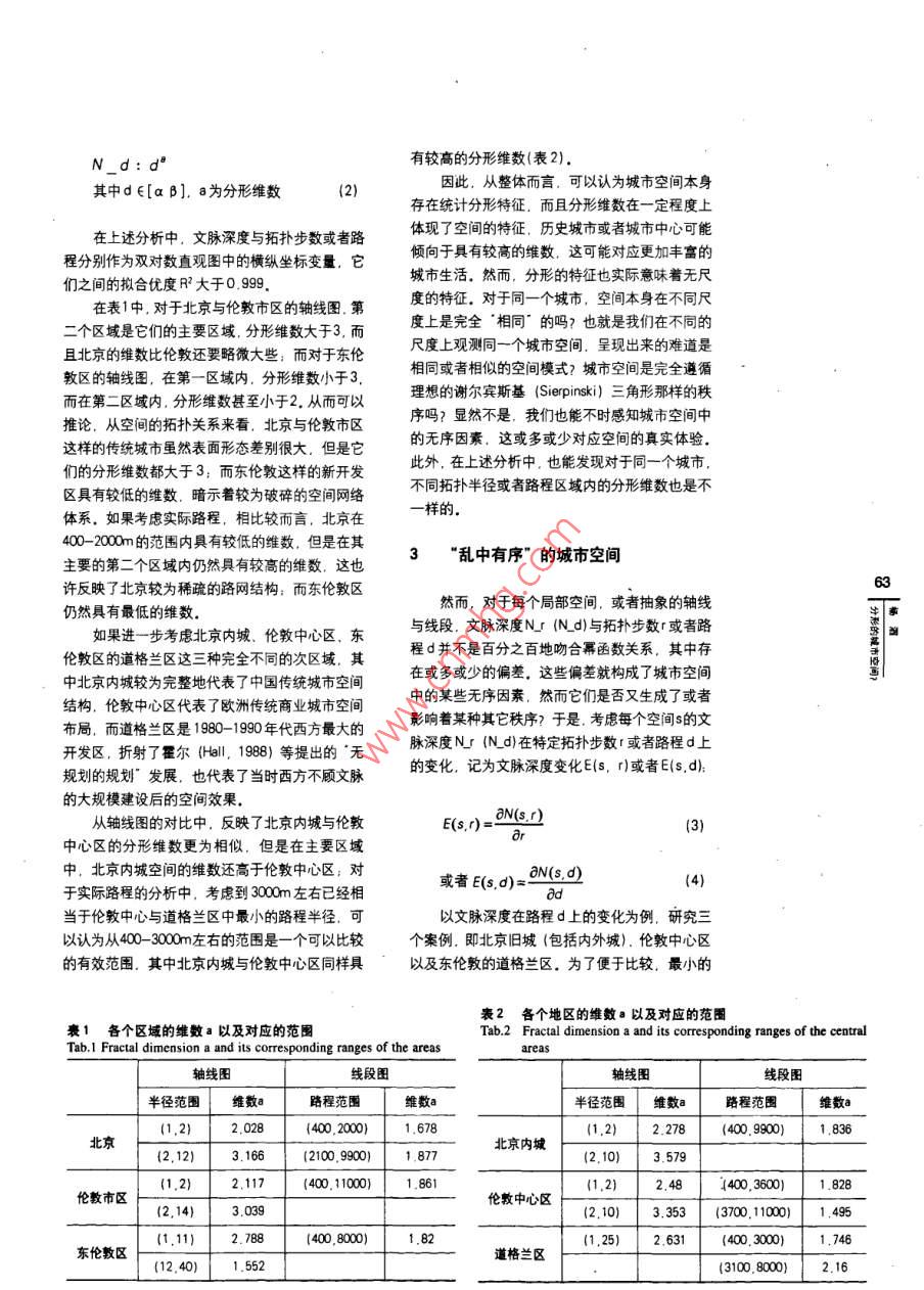 分形的城市空間?楊滔【摘要】采用“空間句法”的研究方法,分析了北市空間形態(tài)是否有序?是否存在混亂?它們的關(guān)京、倫敦市區(qū)以及東倫敦區(qū)中形態(tài)各異的城市空系又是如何?不管是國內(nèi),還是國外,很多學(xué)者間構(gòu)成,發(fā)現(xiàn)城市空間網(wǎng)絡(luò)在統(tǒng)計上具有分形特已經(jīng)發(fā)現(xiàn)了城市形態(tài)具有自身相似性,即城市形征,而其中的偏差又形成空間網(wǎng)絡(luò)中的等級秩序態(tài)在不同尺度之中是相似的,也可稱為分形與聚集效應(yīng)。根據(jù)人們感知城市空間的不同角度,( Batty and Longley.1994:劉繼生,陳彥光2000某種秩序從另一種秩序中的混亂中突現(xiàn)出來2002:劉明華.陳彥光,2001:陳彥光,2005)【關(guān)鍵詞】城市空間;分形;等級;空間句瀆然而,這些詳盡的研究主要關(guān)注城市用地.密度口等在空間中的分布特征,而缺少對城市空間URBAN SPACE: A FRACTAL OBJECT?本體的詳細(xì)解析。此外,大部分研究是從地理學(xué)YANG Tao的角度出發(fā)的,而很少從空間建構(gòu)(即建筑)的ABSTRACT: This paper studies the urban spatial角度來研究,城市空間巨大而復(fù)雜.這樣的空間configuration of Beijing, Central London and east網(wǎng)絡(luò)具有“分形”的秩序嗎?城市空間本身是自London that are varied in urban morphology and身相似的嗎?雖然有些學(xué)者前瞻性地提出了城市evolvement through the methodology of space syntax.空間本身具有分形特征,比如朱文一教授(1993It could be suggested that urban spatial network as an對北京院套院”的空間形態(tài)研究等.然而這些object has fractal structure in statistics and its ran-研究需要進(jìn)一步的定量論證。本文試圖定量地證dom error could account for its hierarchy and patch-實城市空間本身的分形屬性,以及秩序與混亂之work pattems. Based on which, this paper argued間的轉(zhuǎn)換關(guān)系that an order of urban space could emerge from the筆者采用空間句法的研究方法,即定量chaos within another kind of order of urban space in地分析局部空間之間的復(fù)雜關(guān)系.以此來解讀城terms of our views on these spaces市空間本身的屬性,以及它在不同尺度之下的變KEYWOIurban space; fractal dimension化過程。這種方法首先把城市空間分解為一系列syntax凸空間,在這些空間中任意兩點之間的連線不會被邊界打斷,也就是在凸空間中,任何一個人1引言不用走動就能“看遍或者“感知到其中的各【文章編號】1002-1329個角落:然后用最長而且最少的直線把這些凸(20006-0061-04城市作為無比巨大的人類藝術(shù)品,體現(xiàn)了人空間串起來它們抽象地表達(dá)視線或者人們的【中圖分類號】TU984類對秩序的追求:城市作為人類日常生活的一種行走趨勢,稱為軸線圖:最后分析這些直線之間【文獻(xiàn)標(biāo)識碼】A場所,是有組織的人類社會運作的一部分,有些的拓?fù)渑c幾何關(guān)系,這種關(guān)系抽象地表達(dá)了每個城市是自上而下規(guī)劃形成的,比如理想的星形城局部空間之間的復(fù)雜聯(lián)系(Hi.198).此外,【作者簡介】市,方格網(wǎng)城市等:有些域市是自下而上自然生這些直線彼此相交,構(gòu)成了很多線段,而通過研楊酒(1976-).男,倫敦長的,比如眾多不規(guī)則的‘有機城鎮(zhèn)與歷史城究這些線段之間的關(guān)系,可以更詳細(xì)地剖析空間學(xué)院大學(xué)巴特雷特建筑規(guī)市中心區(qū);有些城市是由各種局部規(guī)劃拼貼而形態(tài).采用的三個案例,分別是北京倫敦市區(qū),劃學(xué)院,博土生,成.比如當(dāng)代新興的大城市,那么這些多樣的城東倫敦區(qū),這是由于它們的表象形態(tài)差別較大.【收稿日期】2007-02-27北京是典型的中國方格網(wǎng)城市,倫教是典型的歐示,它分別表示從某條軸線出發(fā).在拓?fù)浒霃?洲不規(guī)則城市,而東倫敦區(qū)是工業(yè)化之后西方內(nèi)與之相通的其它軸線.更加仔細(xì)地考慮一下拼貼式開發(fā)區(qū),很多地區(qū)是在二戰(zhàn)的廢墟上重這些軸線彼此相交.交點之間形成了更短的線建的;而且它們都是巨大的復(fù)雜系統(tǒng),北京的軸段,可以大約地表示城市中兩兩路口之間的空線圖共有20.511條線,即20.511個抽象空間,倫間.同理,對于任意一根線段.在特定的米制路敦市區(qū)的軸線圖共有17.320個抽象空間.而東倫程d內(nèi).它所能到達(dá)與之相通的其它線段的數(shù)目教區(qū)的軸線圖共有28225個抽象空間(圖1).這可以大致表示在路程d內(nèi).任意兩兩路口之間的些局部抽象空間之間的關(guān)系數(shù)量將是非常巨大段空間與其它空間相連通的程度,記為Nd對的,如對于北京,這些關(guān)系數(shù)量大約是10的88.于城市中的每個局部空間.它們都可能具有不同443次方,借助計算機,這些案例研究可能會暗的N或者Nd,表示它們與其周邊空間的連通程示某些普遍性的規(guī)律度,稱為文脈深度:此外,隨著或者d的增加對于每個局部空間,文脈深度變化的速率是不同2統(tǒng)計中的空間分形的.這將反映城市空間網(wǎng)絡(luò)建構(gòu)屬性的一個方面。那么文脈深度Nr或者Nd是否與拓?fù)洳綌?shù)r1970年代,曼德勃羅提出分形的概念之后或者路程d之間存在冪函數(shù)關(guān)系Mandelbrot,1982).對于事物分形特征的判斷就在案例分析中,我們首先需要確定軸線圖邊有了較為嚴(yán)謹(jǐn)?shù)臄?shù)學(xué)定義:n(ε):E,其中n是界對分