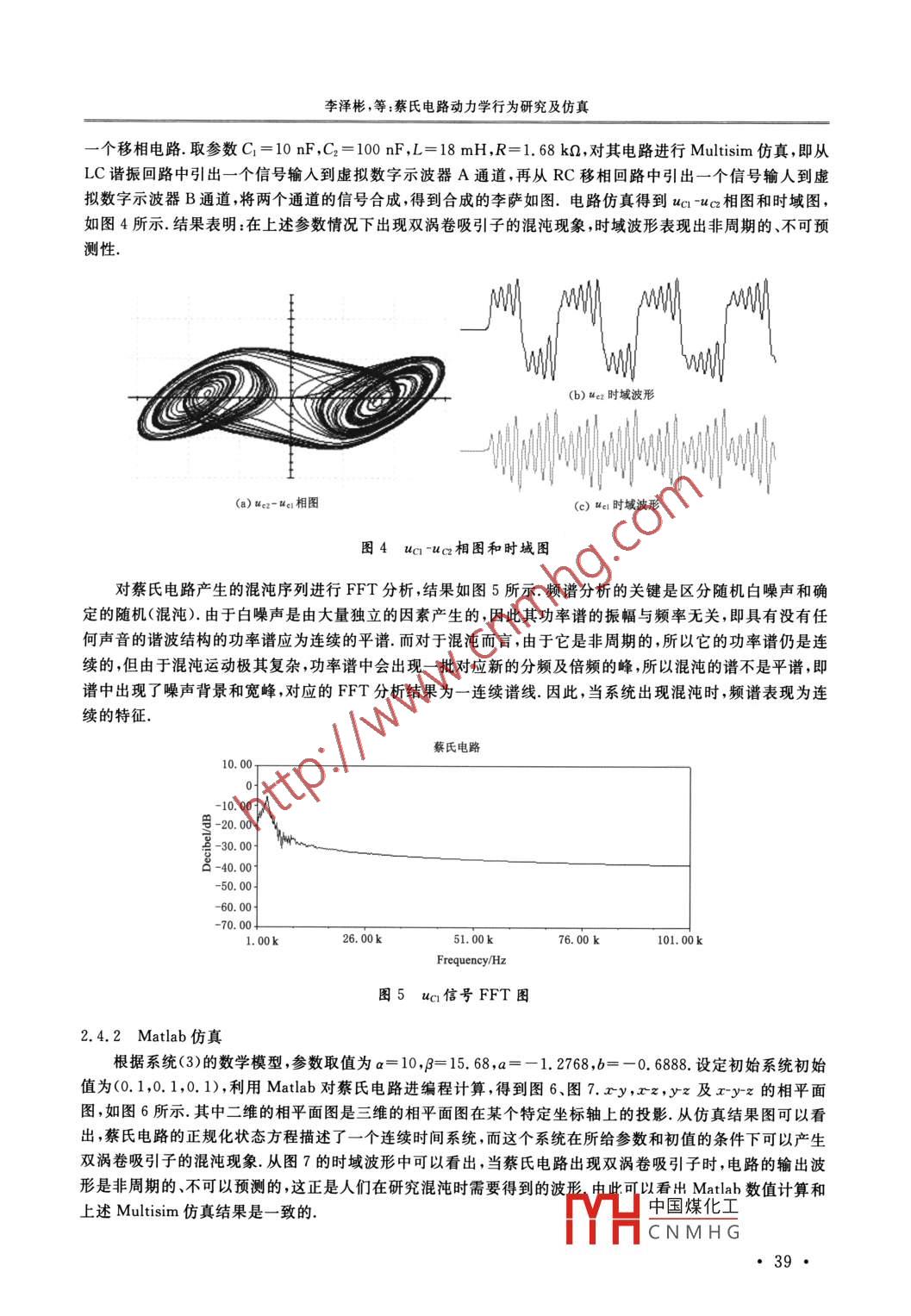 第29卷第1期徐州工程學(xué)院學(xué)報(bào)(自然科學(xué)版2014年3月VoL 29 No. 1Journal of Xuzhou Institute of Technology ( Natural Sciences Edition)Mar.2014蔡氏電路動(dòng)力學(xué)行為研究及仿真李澤彬,黃濟(jì),黃雷,汪明珠,姚有峰(皖西學(xué)院傳感網(wǎng)與信息處理綜合應(yīng)用實(shí)驗(yàn)室,安徽六安237012)摘要:基于蔡氏電路和蔡氏二極管電路,構(gòu)建蔡氏電路數(shù)學(xué)模型,利用仿真和數(shù)值計(jì)算給出雙渦卷吸引子的相圖、時(shí)域圖和頻譜圖,并分析在平衡點(diǎn)處的動(dòng)力學(xué)特性.研究結(jié)果表明:在一定參數(shù)和初值的條件下,可以產(chǎn)生雙渦卷吸引子,且蔡氏電路輸出波形是非周期的、不可以預(yù)測的,對(duì)初值具有敏感性,其頻譜是連續(xù)的關(guān)鍵詞:混沌;蔡氏電路;動(dòng)力學(xué)中圖分類號(hào):TP391.9文獻(xiàn)標(biāo)志碼:A文章編號(hào):1674-358X(2014)01-0036-06混沌是自然界客觀存在的一種運(yùn)動(dòng)形式,其系統(tǒng)具有對(duì)初值特別敏感性,即初始值的微小差別經(jīng)過一段時(shí)間后可以導(dǎo)致系統(tǒng)運(yùn)動(dòng)過程的顯著差別.1983年,美國加州大學(xué)的蔡少棠教授與日本棗島田大學(xué)進(jìn)行學(xué)術(shù)交流時(shí)發(fā)明了蔡氏電路.蔡氏電路是非線性電路中能產(chǎn)生豐富復(fù)雜動(dòng)力學(xué)行為的最簡單、最有效的電路口.目前,蔡氏混沌電路廣泛地應(yīng)用在混沌控制、傳感器應(yīng)用、混沌同步及保密通信等諸多領(lǐng)域2,因此很多學(xué)者對(duì)蔡氏混沌電路進(jìn)行了有意義的討論和研究60,但多數(shù)在研究系統(tǒng)的動(dòng)力學(xué)行為時(shí)不夠深入基于此,從電路構(gòu)成人手,建立數(shù)學(xué)模型,并利用 Multisim軟件仿真和 Matlab軟件數(shù)值計(jì)算對(duì)特定參數(shù)下的蔡氏混沌電路做了進(jìn)一步研究和探討這一工作對(duì)開展蔡氏混沌電路在各領(lǐng)域中應(yīng)用起到了基礎(chǔ)性理論指導(dǎo),具有較高的實(shí)踐意義,蔡氏電路模型蔡氏電路是一種物理結(jié)構(gòu)和數(shù)學(xué)模型簡單的混沌系統(tǒng),如圖1所示.該電路使用3個(gè)儲(chǔ)能元件(電感L、兩個(gè)電容C1和C2)、一個(gè)線性電阻R和一個(gè)非線性電阻Nk(蔡氏二極管).其中非線性電阻NB是核心元件,其實(shí)現(xiàn)方式很多這里采用 Kennedy于1993年提出的方法由2個(gè)運(yùn)算放大器和6個(gè)電阻組成1,如圖2所示對(duì)圖2蔡氏二極管電路模型進(jìn)行 Multisim仿真.其中,6個(gè)電路取值為R1=3.3kg,R2=22k0,R322k,R4=2.2kΩ,R=2209,R5=2200;運(yùn)算放大器采用TL082.對(duì)蔡氏二極管電路模型進(jìn)行伏安特性分析,并將所得數(shù)據(jù)經(jīng)數(shù)值擬合得到伏安特性曲線,如圖3所示L C2TCi圖1蔡氏電路模型圖2非線性電阻NR電路模型收稿日期:2013-09-12基金項(xiàng)目:安徼省高等學(xué)校省級(jí)自然科學(xué)重點(diǎn)研究項(xiàng)目(KJ2010A323);安徽省高等學(xué)校省級(jí)自然科學(xué)研究項(xiàng)目(K2013A262)六安市定向委托皖西學(xué)院市級(jí)研究項(xiàng)目(2012LW006,2012LW007,2013LWoo9)中國煤化工作者簡介:李澤彬(1979—),男,安徽六安人,講師,碩士,主要從事非線性電路與微弱信號(hào)檢CNMHG李澤彬,等:蔡氏電路動(dòng)力學(xué)行為研究及仿真由伏安特性曲線可以看出數(shù)據(jù)分布存在負(fù)電阻區(qū)域和正電阻區(qū)域,由于運(yùn)算放大器TL082采用士9V電源供電,使得負(fù)阻的輸出電壓有一個(gè)限值,當(dāng)超過此限值之后,整個(gè)負(fù)阻就表現(xiàn)出正電阻的性質(zhì)了0.001由于正阻區(qū)基本處于電路產(chǎn)生混沌現(xiàn)象時(shí)001的工作區(qū)段之外所以可以認(rèn)為其影響極小,理論分析和模擬都可以忽略正阻部分.01從圖3中可以看出蔡氏二極管的伏安特性4.001曲線具有分段線性特點(diǎn),其函數(shù)形式可寫為f(ua)= GUci (G- Gb)0.003(uc +Eal-uci-eal)(1)MyR/V由 Kirchhoff電流定律(KCL)和Kirchhoff電壓定律(KVL)得到蔡氏電路圖3蔡氏二極管的伏安特性曲線的動(dòng)力學(xué)狀態(tài)方程為Ci x duc/dt= G(ua -ua)-f(uc)C2×dvc/dt=G(u-a+i),(2)L×diL/dt其中函數(shù)f(uc)是由蔡氏二極管的伏安特性曲線來決定的為了研究方便,取x=va,y=uea,z=Ra/C2,r=t/RC2,a=GR,b=GR,a=C2C,B=R2C2/L,將式(1)、(2)變換為標(biāo)準(zhǔn)形式:dy/drzdz/dr==-Bybr ta-b x>1,f(r)x|≤1bx<-1,在式(3)、(4)中,a與B、a與b的變化,反映了電路中元件參數(shù)的變化情況2蔡氏電路動(dòng)力學(xué)分析與仿真2.I平衡點(diǎn)的穩(wěn)定性分析將式(3)寫成線性方程:0110(5)B 0令X=(x,y,z)T,平衡態(tài)時(shí)有X=0,即+f(r)0(6)x+z=0根據(jù)式(4)、(6)R3的3個(gè)子空間中國煤化工CNMHG徐州工程學(xué)院學(xué)報(bào)(自然科學(xué)版)014年第1期D1={(x,y,z)|x>1D={(x,y,z)||x|≤1中都有唯一的平衡點(diǎn),分別是P+=(k,0,-k)∈DO=(0,0,0)∈D,k,0,k)∈D其中k=(b-a)/b+1式(3)在每個(gè)子空間中,都為線性方程,把系統(tǒng)(3)在平衡點(diǎn)處線性化得到 Jacobi矩陣,即a(1+c)其中c=b(x>1,x<-1)這里電路參數(shù)取a=10,B=15.68,a=-1.2768,b=-0.6888令det(J-AE)=0,則平衡點(diǎn)P+和P處對(duì)應(yīng)的狀態(tài)方程為3.11210可求得其特征值為λp=-4.5418,σ,土ja,=0.2149士3.2707.方程的3個(gè)根中,有1個(gè)負(fù)實(shí)根和2個(gè)實(shí)部為負(fù)的共軛復(fù)根,所以平衡點(diǎn)P+和P是不穩(wěn)定的鞍點(diǎn)平衡點(diǎn)O