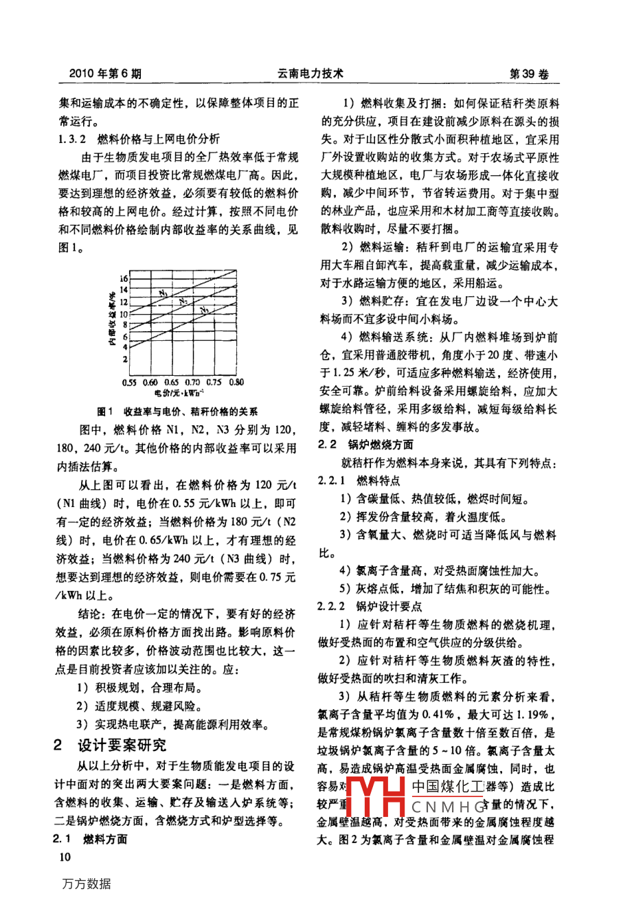 第39卷云南電力技術(shù)Vol 39 No 62010年12月YUNNAN ELECTRIC POWERDec.2010生物質(zhì)能發(fā)電及設(shè)計要案研究何永學(xué)(云南省電力設(shè)計院,云南昆明650011摘要:分析生物質(zhì)能發(fā)電發(fā)展現(xiàn)狀、技術(shù)的特點及難點、經(jīng)濟分析等,研究此類項目設(shè)計過程中需面對的要案問題。關(guān)鍵詞:生物質(zhì)能發(fā)電技術(shù)分析經(jīng)濟分析設(shè)計要案燃料鍋爐中圖分類號:TM62文獻標(biāo)識碼:B文章編號:1006-7345(2010)06-0009-03生物質(zhì)能發(fā)電技術(shù)的特點發(fā)電電價,二是燃料價格。1.1生物質(zhì)能發(fā)電技術(shù)生物質(zhì)發(fā)電電價的敏感因素分析我國于二十世紀(jì)八十年代末開始關(guān)注生物質(zhì)1)固定資產(chǎn)投資:包括主要設(shè)備和基礎(chǔ)建發(fā)電技術(shù)的研究工作,一開始主要應(yīng)用在一些糖設(shè)方面的項目投資。固定資產(chǎn)投資的上升和下降廠廢渣、生活垃圾、木材加工廠的廢料處理上。對生物質(zhì)能發(fā)電電價的影響效果相同。其電價敏主要技術(shù)有:感度的平均值為0.692,即固定資產(chǎn)投資平均下1)流化床燃燒技術(shù)。降一個百分點時,電價將降低0.69%。2)流化床氣化技術(shù)2)年發(fā)電量:是影響發(fā)電技術(shù)收益的主要3)沼氣發(fā)電技術(shù)。因素。由于各生物質(zhì)能發(fā)電技術(shù)規(guī)模已確定,因4)水冷爐排鍋爐燃燒發(fā)電技術(shù)。此,年發(fā)電量的數(shù)值主要決定于發(fā)電機組的運轉(zhuǎn)1.2生物質(zhì)發(fā)電項目的問題時間,即年發(fā)電時間。此敏感因素的變化受生物利用秸稈原料發(fā)電是我國生物質(zhì)能發(fā)電最多質(zhì)能資源的供應(yīng)、生物質(zhì)能發(fā)電機組性能和運行的形式,其存在以下技術(shù)難點:管理水平的影響。發(fā)電時間對電價的敏感度平均一是秸桿的收集和運輸,二是秸桿本身的化值達到0.762,高于固定資產(chǎn)投資的電價敏感度。學(xué)、物理特性對鍋爐設(shè)計和運行的影響。且發(fā)電時間增加對電價的影響要小于發(fā)電時間減1)從設(shè)計、設(shè)備系統(tǒng)到燃料收集體系均處少的影響。這說明,系統(tǒng)生產(chǎn)負荷降低會給電價于不成熟階段。目前一般都采用農(nóng)戶一經(jīng)紀(jì)人一帶來更大影響。發(fā)電時間每增加100h,電價將收購站一電廠這樣的收集路徑。減少0.1元/kWh,說明發(fā)電時間的增加將有效減2)單位投資較大,發(fā)電成本較高。按目前少生物質(zhì)能發(fā)電電價。的價格水平,正常情況下單位投資約90003)原料成本:對于各類生物質(zhì)能發(fā)電技術(shù)11000元/kW,遠高于煤電項目。來說,原料成本受原料及來源的影響較大。較前3)燃料品種多樣,質(zhì)量不穩(wěn)定。兩個因素來說,原料成本對電價影響得較小,其4)爐前處理較為復(fù)雜。由于國內(nèi)秸稈發(fā)電敏感度均值在0.5以下。但應(yīng)注意的是,在原料往往不是采用單一的燃料品種,對燃料人爐的處收集成本和運輸費用方面換存在很大的不確定因理方式各不相同,因此導(dǎo)致爐前處理系統(tǒng)較為復(fù)素。且隨著生物質(zhì)能發(fā)電技術(shù)的發(fā)展,必將帶來雜,破碎、上料等環(huán)節(jié)容易出現(xiàn)問題。對原料的大量需求:這也右可能使價格進一步上1.3生物質(zhì)發(fā)電項目的經(jīng)濟分析漲中國煤化工主要還會集中在發(fā)電項目的經(jīng)濟性主要在于兩個方面:一是其HCNMHG分考慮原料的收收稿日期:2010-06-20010年第6期南電力技術(shù)第39卷集和運輸成本的不確定性,以保障整體項目的正1)燃料收集及打捆:如何保證秸稈類原料常運行。的充分供應(yīng),項目在建設(shè)前減少原料在源頭的損1.3.2燃料價格與上網(wǎng)電價分析失。對于山區(qū)性分散式小面積種植地區(qū),宜采用由于生物質(zhì)發(fā)電項目的全廠熱效率低于常規(guī)廠外設(shè)置收購站的收集方式。對于農(nóng)場式平原性燃煤電廠,而項目投資比常規(guī)燃煤電廠高。因此,大規(guī)模種植地區(qū),電廠與農(nóng)場形成一體化直接收要達到理想的經(jīng)濟效益,必須要有較低的燃料價購,減少中間環(huán)節(jié),節(jié)省轉(zhuǎn)運費用。對于集中型格和較高的上網(wǎng)電價。經(jīng)過計算,按照不同電價的林業(yè)產(chǎn)品,也應(yīng)采用和木材加工商等直接收購。和不同燃料價格繪制內(nèi)部收益率的關(guān)系曲線,見散料收購時,盡量不要打捆。圖1。2)燃料運輸:秸稈到電廠的運輸宜采用專用大車廂自卸汽車,提高載重量,減少運輸成本對于水路運輸方便的地區(qū),采用船運。3)燃料貯存:宜在發(fā)電廠邊設(shè)一個中心大料場而不宜多設(shè)中間小料場。4)燃料輸送系統(tǒng):從廠內(nèi)燃料堆場到爐前倉,宜釆用普通膠帶機,角度小于20度、帶速小于1.25米/秒,可適應(yīng)多種燃料輸送,經(jīng)濟使用,05506006507075050安全可靠。爐前給料設(shè)備采用螺旋給料,應(yīng)加大圖1收益率與電價、秸稈價格的關(guān)系螺旋給料管徑,采用多級給料,減短每級給料長圖中,燃料價格N1,N2,N3分別為120,度,減輕堵料、纏料的多發(fā)事故。180,240元/。其他價格的內(nèi)部收益率可以采用2.2鍋爐燃燒方面內(nèi)插法估算。就秸桿作為燃料本身來說,其具有下列特點從上圖可以看出,在燃料價格為120元/t2