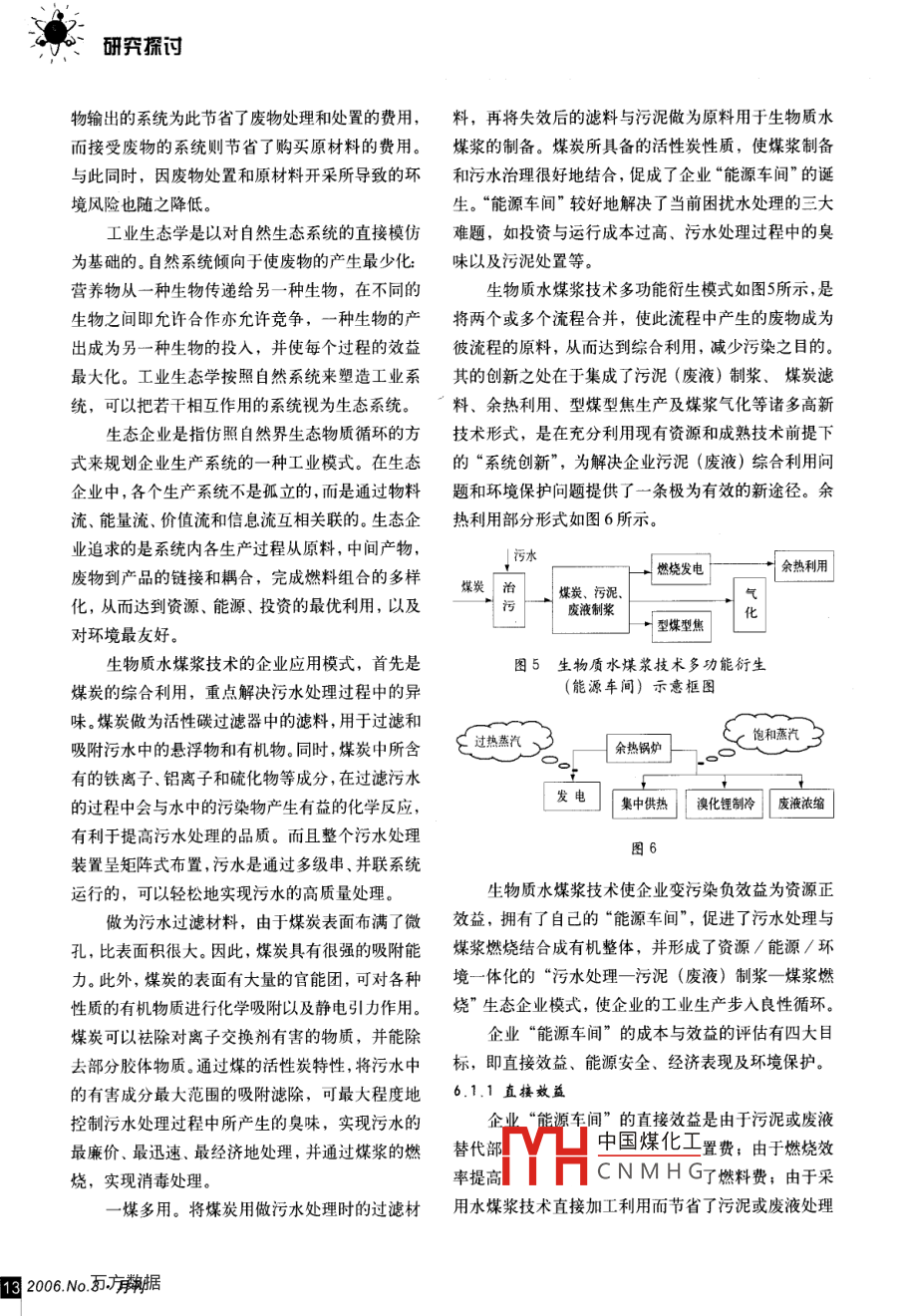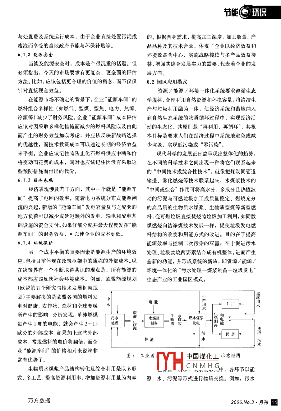 節(jié)能環(huán)保(續(xù)上期)劉世義(2)將分布式能源與交通系統(tǒng)整合優(yōu)化摘要:水煤漿技術(shù)不僅能很好地解決污泥(廢液)一利用低谷電力為電動汽車蓄電或燃料電池汽車資源化難題,又能簡化污泥(廢液)處理與處置流儲氫等,將燃料電池和混合動力汽車做為電源形程。生物質(zhì)水煤漿作為分布式能源的“一次能源成隨著人流移動的電源和供水系統(tǒng)。實現(xiàn)節(jié)約投多樣性的重要內(nèi)容,使企業(yè)、工業(yè)園區(qū)或城鎮(zhèn)社區(qū)資經(jīng)費,降低高技術(shù)產(chǎn)品使用成本等目的變污染負(fù)效益為資源正效益,擁有了自己的“能源(3)分布式能源系統(tǒng)電網(wǎng)接入研究—解工廠”。充分體現(xiàn)出制漿技術(shù)在能源結(jié)構(gòu)調(diào)整、資決分布式能源與現(xiàn)有電網(wǎng)設(shè)施的兼容、整合和安源合理利用以及清潔生產(chǎn)等方面的綜合作用,從而全運(yùn)行等問題奠定水煤漿技術(shù)在循環(huán)經(jīng)濟(jì)中的應(yīng)有地位。關(guān)鍵詞:生物質(zhì);水煤漿;資源生物質(zhì)水漿返式涯天水4)蓄能技術(shù)——通過蓄能技術(shù)的開發(fā)應(yīng)用,解決能源的延時性調(diào)節(jié)問題,提高能源系統(tǒng)的容鋯能力,其中包括蓄電、蓄熱、蓄冷和蓄能四個技術(shù)方向。蓄電包括化學(xué)蓄電:電池;物理蓄電:飛輪和水能、氣能。蓄熱包括相變蓄熱、熱水、熱油和蒸汽等多種形式。蓄冷:冰和水。蓋能包括物理蓄能:機(jī)械蓄能、水蓄能、以及記憶金屬蓄能等多種方式。將分布式能源系統(tǒng)發(fā)電設(shè)備排除的余熱、二氧化碳和(5)地源蓄能技術(shù)——利用地下水和土壤水蒸汽注入暖棚,做為氣體肥料和熱源,解決綠化和將冬季的冷和夏季的熱蓄能儲存,進(jìn)行季節(jié)性果蔬供應(yīng),同時減少溫室氣體和其它污染物排放問題。調(diào)節(jié)使用,結(jié)合熱泵技術(shù)進(jìn)行直接利用,減少城(3)利用發(fā)電制冷的冷卻水生產(chǎn)生活熱水的技術(shù)市熱島效應(yīng)利用熱泵的技術(shù),將低品位熱源轉(zhuǎn)換為較高品位(6)網(wǎng)絡(luò)式能源系統(tǒng)——互聯(lián)網(wǎng)式的分布的生活熱水,減少能源消耗式能源梯級利用系統(tǒng)是未來能源工業(yè)的重要形(4)空調(diào)系統(tǒng)廢熱回收技術(shù)——發(fā)展全新風(fēng)空調(diào)態(tài),它是由燃?xì)夤芫W(wǎng)、低壓電網(wǎng)、冷熱水網(wǎng)絡(luò)和系統(tǒng)中有效利用回風(fēng)中的余熱和余冷,減少能耗。信息共同組成的用戶就近互聯(lián)系統(tǒng),復(fù)合網(wǎng)絡(luò)的(5)污水水源熱泵系統(tǒng)—利用污水中的熱量。智能化運(yùn)行、結(jié)算、冗余調(diào)整和系統(tǒng)容錯優(yōu)化。(6)小型生物質(zhì)沼氣生產(chǎn)技術(shù)。5.5資源深度利用技術(shù)(1)天然氣凝結(jié)水技術(shù)—利用天然氣燃6生物燒后的化學(xué)反應(yīng)結(jié)果回收水,解決部分自用水6.1中國煤化工CNMHG資源緊缺問題。1王成忉能直接作為另一系統(tǒng)(2)將分布式能源與暖棚結(jié)合的技術(shù)的原料,那么就可以形成持續(xù)的環(huán)境和經(jīng)濟(jì)效益。廢2006N.3月刊2研我抓討物輸出的系統(tǒng)為此節(jié)省了廢物處理和處置的費用,料,再將失效后的濾料與污泥做為原料用于生物質(zhì)水而接受廢物的系統(tǒng)則節(jié)省了購買原材料的費用。煤漿的制備。煤炭所具備的活性炭性質(zhì),使煤漿制備與此同時,因廢物處置和原材料開采所導(dǎo)致的環(huán)和污水治理很好地結(jié)合,促成了企業(yè)“能源車間”的誕境風(fēng)險也隨之降低。生?!澳茉窜囬g”較好地解決了當(dāng)前困擾水處理的三大工業(yè)生態(tài)學(xué)是以對自然生態(tài)系統(tǒng)的直接模仿難題,如投資與運(yùn)行成本過高、污水處理過程中的臭為基礎(chǔ)的。自然系統(tǒng)傾向于使廢物的產(chǎn)生最少化:味以及污泥處置等。營養(yǎng)物從一種生物傳遞給另一種生物,在不同的生物質(zhì)水煤漿技術(shù)多功能衍生模式如圖5所示,是生物之間即允許合作亦允許競爭,一種生物的產(chǎn)將兩個或多個流程合并,使此流程中產(chǎn)生的廢物成為出成為另一種生物的投入,并使每個過程的效益彼流程的原料,從而達(dá)到綜合利用,減少污染之目的最大化。工業(yè)生態(tài)學(xué)按照自然系統(tǒng)來塑造工業(yè)系其的創(chuàng)新之處在于集成了污泥(廢液)制漿、煤炭濾統(tǒng),可以把若干相互作用的系統(tǒng)視為生態(tài)系統(tǒng)。料、余熱利用、型煤型焦生產(chǎn)及煤漿氣化等諸多高新生態(tài)企業(yè)是指仿照自然界生態(tài)物質(zhì)循環(huán)的方技術(shù)形式,是在充分利用現(xiàn)有資源和成熟技術(shù)前提下式來規(guī)劃企業(yè)生產(chǎn)系統(tǒng)的一種工業(yè)模式。在生態(tài)的“系統(tǒng)創(chuàng)新”,為解決企業(yè)污泥(廢液)綜合利用問企業(yè)中,各個生產(chǎn)系統(tǒng)不是孤立的,而是通過物料題和環(huán)境保護(hù)問題提供了一條極為有效的新途徑。余流、能量流、價值流和信息流互相關(guān)聯(lián)的。生態(tài)企熱利用部分形式如圖6所示。業(yè)追求的是系統(tǒng)內(nèi)各生產(chǎn)過程從原料,中間產(chǎn)物水燃燒發(fā)電余熱利用廢物到產(chǎn)品的鏈接和耦合,完成