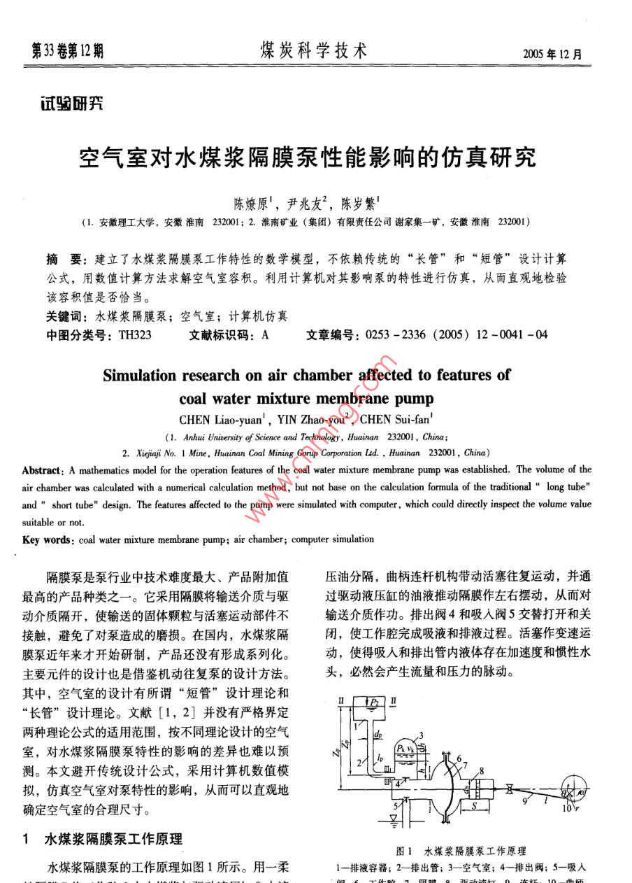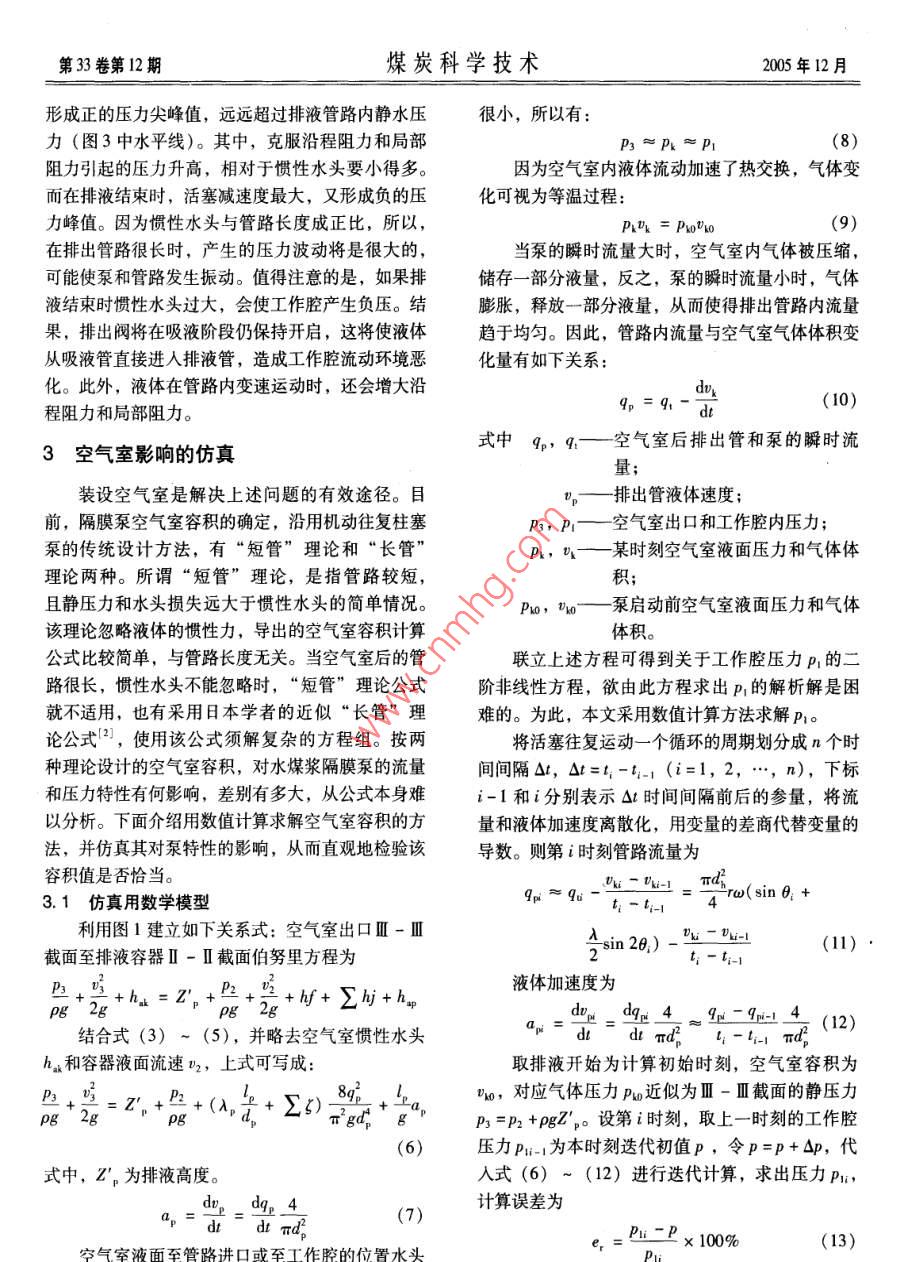 第30卷第12期煤炭科學技術2005年12月試驗研我空氣室對水煤漿隔膜泵性能影響的仿真研究陳燎原’,尹兆友2,陳歲繁(1.安徽理工大學,安徽淮南232001;2.淮南礦業(yè)(集團)有限責任公司謝家集一礦,安徽淮南232001)摘要:建立了水煤漿隅膜泵工作特性的數(shù)學模型,不依賴傳統(tǒng)的“長管”和“短管”設計計算公式,用數(shù)值計算方法求解空氣室容積。利用計算機對其影響泵的特性進行仿真,從而直觀地檢驗該容積值是否恰當。關鍵詞:水煤漿隔膜泵;空氣室;計算機仿真中圖分類號:TH323文獻標識碼:A文章編號:0253-2336(2005)12-0041-04Simulation research on air chamber affected to features ofcoal water mixture membrane pumpCHEN Liao-yuan, YIN Zhao-you, CHEN Sui-fan(l. Anhui Uniersity of Science and Technology, Huainan 232001, China;2. Xiejiaji No. I Mine, Huainan Coal Mining Gorup Corporation Ld., Huainan 232001, ChinaAbstract: A mathematics model for the operation features of the coal water mixture membrs established. The volume of theair chamber was calculated with a numerical calculation methodbase on the calculation formula of the traditional "long tubeand"short tube"design. The features affected to the pump were simulated with computer, which could directly inspect the volume valuesuitable or notKey words: coal water mixture membrane pump; air chamber; computer simulation隔膜泵是泵行業(yè)中技術難度最大、產(chǎn)品附加值壓油分隔,曲柄連桿機構(gòu)帶動活塞往復運動,并通最高的產(chǎn)品種類之一。它采用隔膜將輸送介質(zhì)與驅(qū)驅(qū)動液壓缸的油液推動隔膜作左右擺動,從而對動介質(zhì)隔開,使輸送的固體顆粒與活塞運動部件不輸送介質(zhì)作功。排出閥4和吸入閥5交替打開和關接觸,避免了對泵造成的磨損。在國內(nèi),水煤漿隔閉,使工作腔完成吸液和排液過程?;钊髯兯龠\膜泵近年來才開始研制,產(chǎn)品還沒有形成系列化動,使得吸人和排出管內(nèi)液體存在加速度和慣性水主要元件的設計也是借鑒機動往復泵的設計方法。頭,必然會產(chǎn)生流量和壓力的脈動其中,空氣室的設計有所謂“短管”設計理論和n「Pn“長管”設計理論。文獻[1,2]并沒有嚴格界定兩種理論公式的適用范圍,按不同理論設計的空氣室,對水煤漿隔膜泵特性的影響的差異也難以預測。本文避開傳統(tǒng)設計公式,采用計算機數(shù)值模擬,仿真空氣室對泵特性的影響,從而可以直觀地斗。7少確定空氣室的合理尺寸。1水煤漿隔膜泵工作原理圖1水煤漿隔膜泵工作原理水煤漿隔膜泵的工作原理如圖1所示。用一柔排液容器;2一排出管;3一空氣室;4排出閥;5-吸人第33卷第12期煤炭科學技術2005年12月圖1中畫出排出管路的空氣室(吸入管路空Ⅱ-Ⅱ截面的非定常流伯努里方程:氣室略),其作用是利用室內(nèi)氣體可壓縮和膨脹的Pg2g+hu =z,+P2.U2PI特性,來儲存和釋放一部分煤漿,以減小管路內(nèi)流+礦f+∑勾+h量和壓力脈動的程度,改善泵的工作條件。本文僅討論單缸泵的排液過程特性,吸液過程f+∑礦=(λ+∑(3)及多聯(lián)泵的分析與此相似,不作贅述。2泵的理論流量和壓力特性h(4)2.1排液過程理論流量特性2a,=(e)ira( cos 8+ Acos 20泵的流量特性和壓力特性是針對輸送介質(zhì)而言的。在正常工作情況下,隔膜僅起著分隔輸送介質(zhì)(5)和驅(qū)動液壓油的作用,其兩側(cè)液體壓力相同。根據(jù)式中p1、n—排出閥前液體壓力、流速;流體力學連續(xù)性原理可知,輸送介質(zhì)的流量特性和hn—排出閥前液體因加速度產(chǎn)生的慣驅(qū)動液壓油的流量特性相同。由于活塞為變速運性水頭,工作腔體積較小此項可動,吸入和排出過程是交替進行的。所以,泵的瞬忽略不計時理論流量也是變化的。瞬時流量q為Z,工作腔軸線至容器液面高度P2、v2容器液面壓力、流速,t2很小可9. =Un ="ro( sin 8+sin 20)(1)忽略不計;式中d—活塞直徑;f+∑——排液管路沿程水頭損失與局部水活塞瞬時運動速度頭損失之和;曲柄長;hn排液管路液體慣性水頭;—曲柄角速度;λ,、∑—管路沿程阻力系數(shù)、局部阻力系A—曲柄連桿比,A=r/,l為連桿長;數(shù)之和—曲柄轉(zhuǎn)角式(1)表示的流量特性如圖2所示,圖中給l、d排液管長度、管徑管路液體加速度、活塞加速度出兩個工作循環(huán)的特性曲線,轉(zhuǎn)角6坐標起點為排液過程開始點。在活塞往復運動一次中,只有半個p液體密度;周期排液,流量按正弦規(guī)律變化。這種間斷并且脈g——重力加速度。對于確定的泵裝置,式(2)~(5)中,只有工動的流量特性,導致在一個工作循環(huán)中排液壓力發(fā)作腔壓力p1和曲柄轉(zhuǎn)角8是變量,這些計算式給出生很大變化。了無空氣室情況下p1與θ的關系,依此得到如圖3所示的壓力變化曲線。轉(zhuǎn)角8/rad轉(zhuǎn)角rad圖2排液過程理論流量特性圖3排液過程工作腔壓力特性22排液過程壓力特性對于圖1所示裝置,先分析未裝空氣室的情由于活塞變速運動產(chǎn)生慣性水頭的影響,在排況。流體參數(shù)隨時間變化,為非定常流動。以工作液過程中工作腔內(nèi)壓力是非定常的。轉(zhuǎn)角θ坐標起腔中心線為基準,建立閥前I-I截面至排液容器點對應排液過程開始點,在排液開始時活塞加速,第33卷第12期煤炭科學技術005年12月形成正的壓力尖峰值,遠遠超過排液管路內(nèi)靜水壓很小,所以有:力(圖3中水平線)。其中,克服沿程阻力和局部P3Pk≈P阻力引起的壓力升高,相對于慣性水頭要小得多。因為空氣室內