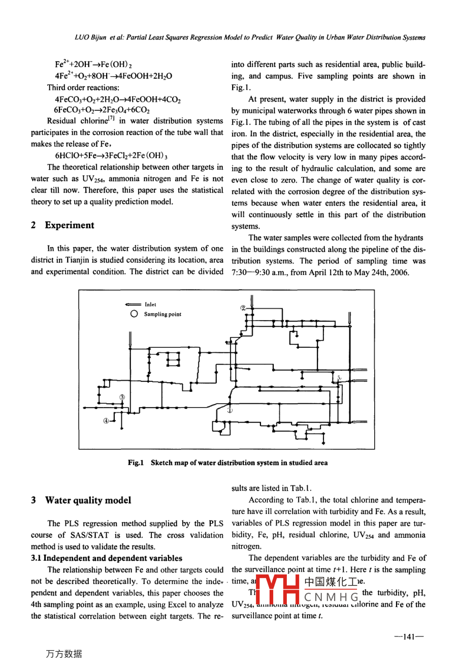 Trans. Tianin Univ. 2009, 15: 140-144DOI 10. 1007/s12209-009-0025-2。Tianin University and Springer-Verag 2009Partial Least Squares Regression Model to PredictWater Quality in Urban Water Distribution Systems*LUO Bijun (駱碧君) , ZHAO Yuan(趙元)1.2, CHEN Kai(陳凱), ZHAO Xinhua (趙新華) 1(1. School of Environmental Science and Engincering, Tianjin University, Tianjin 300072, China;2. Architectural Design and Rcscarch Institute, Southeast University, Nanjing 210096, China;3. Tianjin Huashui Water Supply Construction Co., Ltd, Tianjin 300122, China)Abstract: The water distribution system of one residential district in Tianjin is taken as an example to analyze thechanges of water quality. Partial least squares (PLS) regression model, in which the turbidity and Fe are regarded as con-trol objcctives, is used to establish the statistical model. The experimental results indicate that the PLS regression modelhas good predicted results of water quality compared with the monitored data. The percentages of absolute relative error(bclow 15%, 20%, 30%) are 44.4%, 66.7%, 100% (turbidity) and 33.3%, 44.4%, 77.8% (Fe) on the 4th sampling point;77.8%, 8.9%, 8.9% (urbidity) and 44.4%, 55.6%, 66.7% (Fe) on the 5th sampling point.Keywords: water distribution systems: water quality; turbidity; Fe; partial least squares regressionMany factors in space and period can change the ur- value of toxicology and bacteriology target.ban water quality, such as water age, physical, chemical 1.2 Fand biological reactions occuring in the distribution sys-The ferrous tubing is used extensively in the watertems 0. It is impossible to detect water quality of everydistribution systems in China. According to the statisticalsegment and node on the spot because of the complexity result in 1996,the proportion of cast iron pipe is 51.67%of urban water distribution systems. To this end, com- and the steel pipe is 23.85% (41. Serious corrosion and theputer technology can be used in simulating the law of release of Fe exist in ferrous tubing water distributionwater quality in the distribution systemsl-l.systems, which is harmful to human health since the FeAt present, the analysis of water quality in the waterconcentration exceeds the normal standard seriously.distribution systems is to simulate the law of some qual-Studies show that Fe is positively related to turbid-ity parameters on the basis of data collection and assis- ity. The release of Fe is the major factor that influencestance of computer technology. In this paper, turbidity and the turbidity in the distribution systems. Fe gets into wa-Fe (total iron) are regarded as dependent variables in the ter in the form of compounds of Fe*+ and Fe't, by whichmulti-variable water quality model with partial least the sensitive targets of the water body will be influencedsquares (PLS) regression method.greatlys. As a result, Fe in the water can be measured byturbidity.1 Turbidity and Fe in water distributionChemical equilibrium of Fe is occuring all the timesystemsin the microenvironment of the tube wall which consistsof ferrous tubing (metallic iron), furring (iron com-1.1 Turbiditypound) and the water environment of the distributionStudies show that if the turbidity in water is reduced systerms. The chemical reactions involve corrosion, re-to 0.1 nephelometric turbidity units (NTU) or even lease and sediment of Fe. The main reactionsol are aslower, most of the organic pollutants will be removed!3!. follows.Lower turbidity in the water can not only fulfill the re-Second order reactions:quest of sensitive characters, but also help to reduce the中國煤化工Accepted date: 2008-09-10.YHCNMHG*Supported by National Natural Science Foundation of China (No. 50478086) and Tianjin Special Scienific Innovation Foundation(No. 06/2Z5H0900)0LUO Bijun, born in 1983, female, doctorate student.Correspondence to ZHAO Xinhua, E-mail: zxh@tju.edu.cn.LUO Bijun et al: Partial Least Squares Regression Model to Predict Water Quality in Urban Water Distribution SystemsFe2*+20H- >Fe(OH)zinto different parts such as residential area, public build-4Fe2* +O2+8OH*- >4FeOOH+2H2Oing, and campus. Five sampling points are shown inThird order reactions:Fig.1. .4FeCO3+O2+2H2O- +4Fe0OH+4CO2At present, water supply in the district is provided6FeCO3+O2-→2Fe;O4+6CO2by municipal waterworks through 6 water pipes shown inResidual chorine' ”in water distribution systems Fig.1. The tubing of all the pipes in the systemis of castparticipates in the corrosion reaction of the tube wall that iron. In the district, especially in the residential area, themakes the release of Fe,pipes of the distribution systems are collocated so tightly6HCIO+5Fe-→>3FeCl2+2Fe (OH)3that the flow velocity is very low in many pipes accord-The theoretical relationship between other targets in ing to the result of hydraulic calculation, and some arewater such as UV2s4, ammonia nitrogen and Fe is not even close to zero. The change of water quality is cor-clear till now. Therefre, this paper uses the statistical related with the corrosion degree of the distribution sys-theory to set up a quality prediction model.tems because when water enters the residential area, itwill continuously settle in this part of the distribution2 Experimentsystems.The water samples were collected from the hydrantsIn this paper, the water distribution system of one in the buildings constructed along the pipeline of the dis-district in Tianjin is studied considering its location, area tribution systems. The period of sampling time wasand experimental condition. The district can be divided 7:30- 9:30 a.m., from April 12th to May 24th, 2006.= Inlet2-0 Sampling pointFig,1 Sketch map of water distribution system in studied areasults are listed in Tab.l.3 Water quality modelAccording to Tab.1, the total chlorine and tempera-ture have ill correlation with turbidity and Fe. As a result,The PLS regression method supplied by the PLS variables of PLS regression model in thi