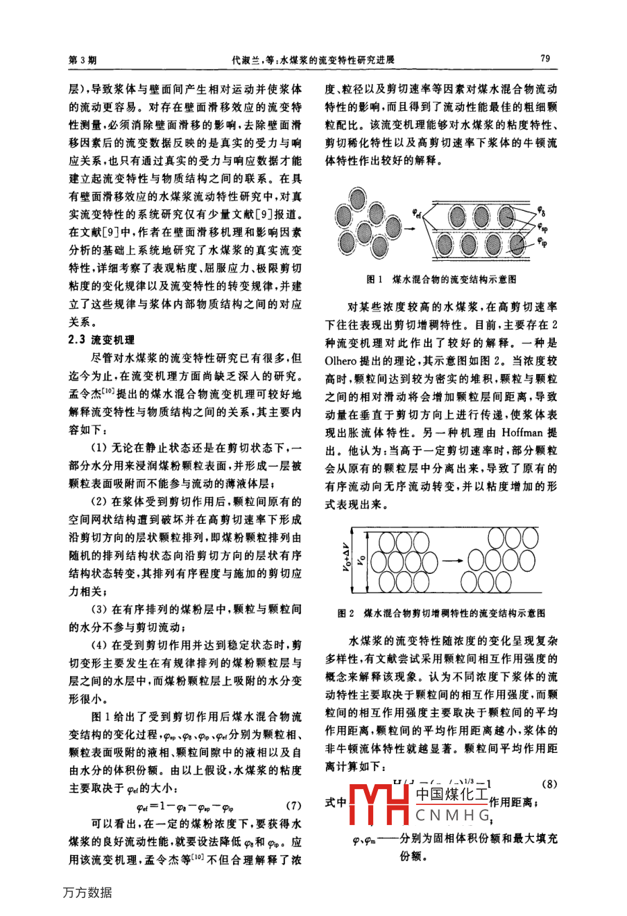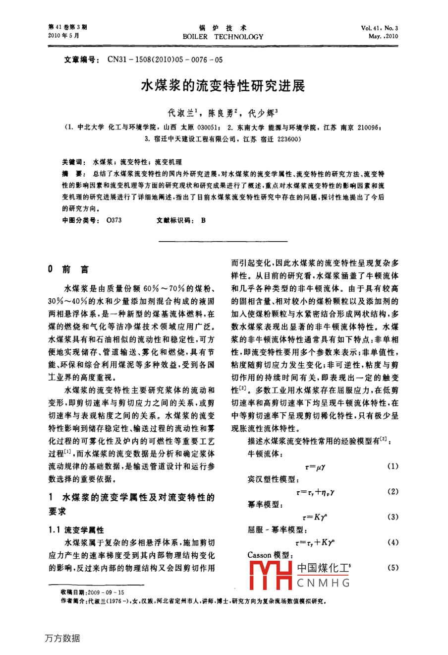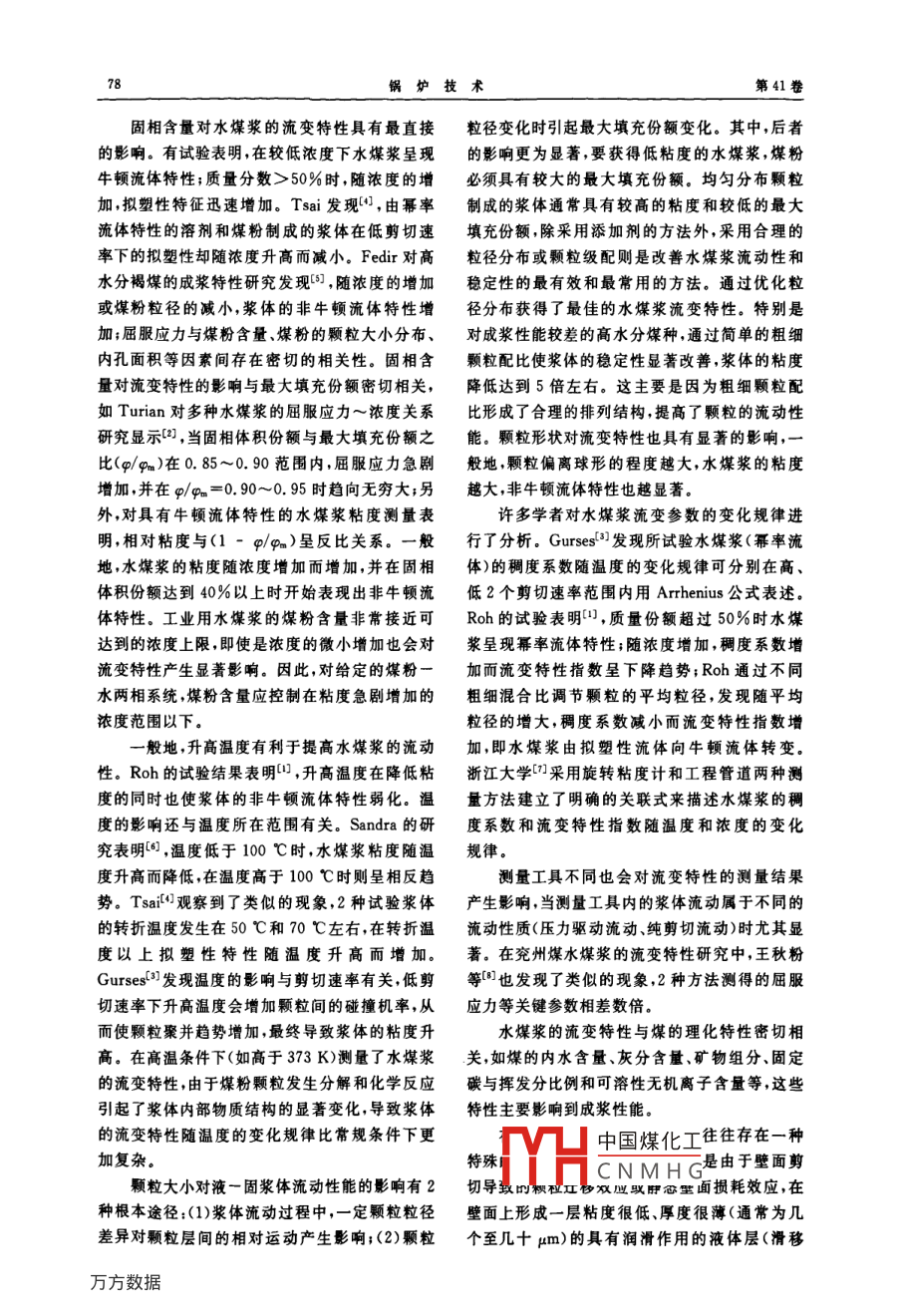第41卷第3期鍋爐技術(shù)VoL 41. No. 32010年5月BOILER TECHNOLOGYMay.,2010文章編號;CN31-1508(2010)05-0076-05水煤漿的流變特性研究進展代淑蘭1,陳良勇2,代少輝3(1.中北大學化工與環(huán)境學院,山西太原030051;2.東南大學能源與環(huán)境學院,江蘇南京210096;3.宿遷中天建設(shè)工程有限公司,江蘇宿遷223600關(guān)鍵詞:水煤漿;流變特性;流變機理擴要:總結(jié)了水煤漿流變特性的國內(nèi)外研究進展,對水煤漿的流變學屬性、流變特性的研究方法、流變特性的影響因素和流變機理等方面的研究現(xiàn)狀和研究成果進行了概述,重點對水煤漿流變特性的影響因素和流變機理的研究進展進行了詳細地闡述,指出了目前水煤漿流變特性研究中存在的問題探討性地提出了今后的研究方向。中圖分類號:0373文獻標識碼:B0前言而引起變化,因此水煤漿的流變特性呈現(xiàn)復雜多樣性。從目前的研究看,水煤漿涵蓋了牛頓流體水煤漿是由質(zhì)量份額60%~70%的煤粉、和幾乎各種類型的非牛頓流體。由于具有較高30%~40%的水和少量添加劑混合構(gòu)成的液固的固相含量、相對較小的煤粉顆粒以及添加劑的兩相懸浮體系,是一種新型的煤基流體燃料,在加入使煤粉顆粒與水緊密結(jié)合形成網(wǎng)狀結(jié)構(gòu),多煤的燃燒和氣化等潔凈煤技術(shù)領(lǐng)域應用廣泛。數(shù)水煤漿表現(xiàn)出顯著的非牛頓流體特性。水煤水煤漿具有和石油相似的流動性和穩(wěn)定性,可方漿的非牛頓流體特性通常具有如下特點:非單相便地實現(xiàn)儲存、管道輸送、霧化和燃燒,具有節(jié)性,即流變特性要用多個參數(shù)來表示;非單值性,能、環(huán)保和綜合利用煤泥等多種效益,受到各國粘度隨剪切應力發(fā)生變化;非可逆性,粘度與剪士業(yè)界的高度重視切作用的持續(xù)時間有關(guān),即表現(xiàn)出一定的觸變水煤漿的流變特性主要研究漿體的流動和性(2)。多數(shù)工業(yè)用水煤漿存在屈服應力,在低剪變形,即剪切速率與剪切應力之間的關(guān)系,或剪切速率和高剪切速率下均呈現(xiàn)牛頓流體特性,在切速率與表觀粘度之間的關(guān)系。水煤漿的流變中等剪切速率下呈現(xiàn)剪切稀化特性,只有極少呈特性影響到儲存穩(wěn)定性、輸送過程的流動性和霧現(xiàn)脹流性流體特性。化過程的可霧化性及爐內(nèi)的可燃性等重要工藝描述水煤漿流變特性常用的經(jīng)驗模型有2過程,而水煤漿的流變數(shù)據(jù)是分析和確定漿體牛頓流體:流動規(guī)律的基礎(chǔ)數(shù)據(jù),是輸送管道設(shè)計和運行參(1)數(shù)選擇的重要依據(jù)。賓漢塑性模型:水煤漿的流變學屬性及對流變特性的they(2)冪率模型:要求Kr(3)1.1流變學屬性屈服-冪率模型:水煤漿屬于復雜的多相懸浮體系,施加剪切r=t,+kr(4)應力產(chǎn)生的速率梯度受到其內(nèi)部物理結(jié)構(gòu)變化Casson模型:的影響,反過來內(nèi)部的物理結(jié)構(gòu)又會因剪切作用中國煤化工5(5)CNMHG收稿日期:2009-09-15作者簡介:代淑蘭(1976-),女,漢族河北省定州市人,講師博士研究方向為復雜流場數(shù)值模擬研究第3期代淑蘭,等:水煤漿的流變特性研究進展Sisko模型水煤漿流變特性的研究方法可分為2類。r=n∞y+Ky類是從漿體組成成分的性質(zhì)和顆粒一顆粒以式中:、r,—分別為剪切應力和屈服應力Pa;及顆粒一流體的相互作用出發(fā),通過理論分析與粘度,Pa試驗相結(jié)合的方法建立表征流動特性的數(shù)學模7p—剛度系數(shù),Pa·s型。這類模型包含了反映漿體流動機理的多種n高剪切速率對應的極限剪切粘度,因素,多表達為相對粘度(漿體粘度與液相粘度之比)與各類影響因素的關(guān)聯(lián)式。這類典型關(guān)聯(lián)K—稠度系數(shù);式,大都以 Einstein方程式為基礎(chǔ),擴展到高濃流變特性指數(shù)。度、非球形顆粒和特定粒徑分布的高濃度液固兩以上流變模型也稱作本構(gòu)方程,模型中的各相非牛頓流體。由于漿體的復雜性,至今尚無法參數(shù)是需要通過試驗確定的流變參數(shù),是水煤漿獲得廣泛適用的關(guān)聯(lián)式,這種方法主要用于漿體固有的物性參數(shù)。在流變特性研究中,可根據(jù)研的設(shè)計和調(diào)制。另一種方法則完全基于試驗觀究目的、對象和剪切速率范圍等選擇不同的模測數(shù)據(jù),采用包含多個參數(shù)的數(shù)學模型描述水煤型。由于水煤漿流變特性復雜,以上經(jīng)驗模型很漿的宏觀流動行為。這類流變模型包含了式(1)難全面反映速率與響應之間特性,應用這類本構(gòu)~(6),這些數(shù)學模型中只包含了流動特性的描方程描述水煤漿的流動特性時都會出現(xiàn)一定述,因此無法解釋產(chǎn)生這種特性的原因和各種因偏差。素的作用機理。但這類數(shù)學模型直觀簡單,直接在流變特性研究中,往往借用牛頓流體粘度反映受力與響應的關(guān)系,而且在多數(shù)流動問題研的概念,即表觀粘度或剪切粘度來表征水煤漿的究中并不關(guān)心漿體的具體內(nèi)部物質(zhì)特性,這種描流動性。對非牛頓流體,表觀粘度是剪切速率的述方法在水煤漿流動問題的研究中得到了廣泛函數(shù),它能夠清晰地表明受到剪切作用時漿體抵應用,本文正是對這種方法所涉及的研究進展和抗變形的能力。因此,考察剪切粘度的影響因素和變化規(guī)律對水煤漿流動特征的認識和工程應成果進行討