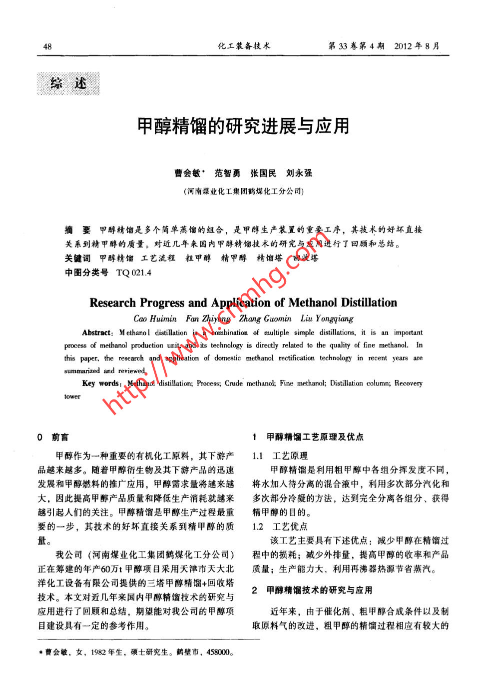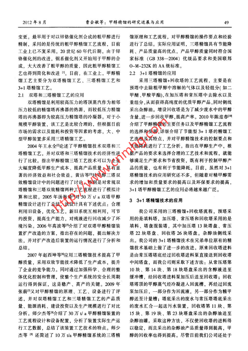 48化工裝備技術(shù)第33卷第4期2012年8月綜述甲醇精餾的研究進(jìn)展與應(yīng)用曹會(huì)敏*范智勇張國(guó)民劉永強(qiáng)(河南煤業(yè)化工集團(tuán)鶴煤化工分公司)摘要甲醇精餾是多個(gè)簡(jiǎn)單蒸餾的組合,是甲醇生產(chǎn)裝置的重要工序,其技術(shù)的好壞直接關(guān)系到精甲醇的質(zhì)量。對(duì)近幾年來(lái)國(guó)內(nèi)甲醇精餾技術(shù)的研究與應(yīng)用進(jìn)行了回顧和總結(jié)。關(guān)鍵詞甲醇精餾工藝流程粗甲醇精甲醇精餾塔回收塔中圖分類號(hào)TQ 021.4Research Progress and Application of Methanol DistillationCao Huimin Fan Zhiyong Zhang Guomin Liu Y ongqiangAbstract: M ethanol distilation is a combination of multiple simple ditillations, it is an importantprocess of metbanol production unit, and is technology is directly related to the quality of fine methanol. Inthis paper, the research and application of domestic methanol rectification technology in recent years aresummarized and reviewed.Key words: Methanol disillation; Process; Crude methanol; Fine methanol; Disillation column; Recoverytower0前言1甲醇精餾工藝原理及優(yōu)點(diǎn)甲醇作為一種重要的有機(jī)化工原料,其下游產(chǎn).1 工藝原理品越來(lái)越多。隨著甲醇衍生物及其下游產(chǎn)品的迅速甲醇精餾是利用粗甲醇中各組分揮發(fā)度不同,發(fā)展和甲醇燃料的推廣應(yīng)用,甲醇需求量將越來(lái)越將水加人待分離的混合液中,利用多次部分汽化和大,因此提高甲醇產(chǎn)品質(zhì)量和降低生產(chǎn)消耗就越來(lái)多次部分冷凝的方法,達(dá)到完全分離各組分、獲得越引起人們的關(guān)注。甲醇精餾是甲醇生產(chǎn)過(guò)程最重精甲醇的目的。要的一步,其技術(shù)的好壞直接關(guān)系到精甲醇的質(zhì)1.2 工藝優(yōu)點(diǎn)量。該工藝主要具有下述優(yōu)點(diǎn):減少甲醇在精餾過(guò)我公司(河南煤業(yè)化工集團(tuán)鶴煤化工分公司)程中的損耗; 臧少外排量,提高甲醇的收率和產(chǎn)品正在籌建的年產(chǎn)60萬(wàn)t甲醇項(xiàng)目采用天津市天大北質(zhì)量;生產(chǎn)能力大,利用再沸器熱源節(jié)省蒸汽。洋化工設(shè)備有限公司提供的三塔甲醇精餾+回收塔2甲醇精餾技術(shù)的研究與應(yīng)用技術(shù)。本文對(duì)近幾年來(lái)國(guó)內(nèi)甲醇精餾技術(shù)的研究與應(yīng)用進(jìn)行了回顧和總結(jié),期望能對(duì)我公司的甲醇項(xiàng)近年來(lái),由于催化劑、粗甲醇合成條件以及制目建設(shè)具有一定的參考作用。取原料氣的改進(jìn),粗甲醇的精餾過(guò)程相應(yīng)有較大的*曹會(huì)敏,女, 1982年生,碩士研究生。鶴壁市, 458000。2012年8月曹會(huì)敏等:甲醇精餾的研究進(jìn)展與應(yīng)用l9變更。最早用于對(duì)以鋅鉻催化劑合成的粗甲醇進(jìn)行餾原理和工藝流程,對(duì)甲醇精餾的操作要點(diǎn)和經(jīng)驗(yàn)精制,采用的是傳統(tǒng)的粗甲醇精餾工藝流程,目前進(jìn)行了總結(jié)。實(shí)際應(yīng)用證明,三塔精餾具有節(jié)能降工業(yè)上已不復(fù)采用。20世紀(jì)60年代后期,由于鋅耗、產(chǎn)品質(zhì)量高的優(yōu)點(diǎn),產(chǎn)品甲醇質(zhì)量同時(shí)符合國(guó)鉻催化劑的改進(jìn),銅系催化劑又開始用于甲醇的合家標(biāo)準(zhǔn)(GB 338~ 2004) 優(yōu)級(jí)品要求和美國(guó)聯(lián)邦成,大大改善了粗甲醇的質(zhì)量,因此粗甲醇精餾工0-M-232K的AA級(jí)標(biāo)準(zhǔn)。藝也得到簡(jiǎn)化和改進(jìn)"。目前,在工業(yè)上,甲醇精2.2 3+1 塔精餾的應(yīng)用餾工藝主要分為雙塔精餾工藝、三塔精餾工藝和采用三塔精餾+回收塔的工藝流程,主要是在3+1塔精餾工藝。預(yù)塔中去除粗甲醇中溶解的氣體以及輕組分(如二2.1雙塔 和三塔精餾工藝的應(yīng)用甲醚、甲酸甲酯),在加壓塔和常壓塔中去除水以及雙塔精餾是利用較高壓力的塔頂蒸汽作為相鄰重組分,從而獲得高純度的優(yōu)質(zhì)甲醇產(chǎn)品,同時(shí)側(cè)線壓力較低的精餾塔再沸器的熱源,而較低壓力精餾采出雜醇油。增設(shè)回收塔是為了減少?gòu)U水中的甲醇塔的再沸器即為較高壓力精餾塔的冷凝器。對(duì)于小含量,進(jìn)-步回收甲醇,提高產(chǎn)率。2010年陳迎春規(guī)模甲醇裝置,該工藝是比較合理的,但根據(jù)目前介紹了甲醇精餾的主要任務(wù)以及甲醇精餾工藝流程市場(chǎng)的需求以及能耗和投資等因素的考慮,大、中的選擇和發(fā)展,詳細(xì)介紹了節(jié)能型3+1塔的精餾工型甲醇裝置多采用三塔精餾工藝。藝流程及其特點(diǎn),并對(duì)甲醇精餾技術(shù)的控制要點(diǎn)和2004年王永全論述了甲醇精餾技術(shù)雙塔和三節(jié)能降耗進(jìn)行了工藝分析。指出在甲醇生產(chǎn)中,根塔精餾工藝,并對(duì)雙塔和三塔精餾技術(shù)的經(jīng)濟(jì)性進(jìn)據(jù)產(chǎn)品的要求來(lái)選擇合理的工藝技術(shù)和流程,就能行了比較。指出甲醇精餾三塔工藝技術(shù)可以為企業(yè)夠滿足生產(chǎn)要求和節(jié)省投資,既有利于控制甲醇產(chǎn)大幅度降低甲醇生產(chǎn)成本、提高產(chǎn)品質(zhì)量,具有顯品的質(zhì)量,也有利于節(jié)能降耗。目前,雖然對(duì)3+1著的經(jīng)濟(jì)效益和社會(huì)效益。黃潔等叫對(duì)甲醇三塔雙塔精餾技術(shù)的應(yīng)用研究還不多,但隨著對(duì)精甲醇需效精餾設(shè)計(jì)中的問(wèn)題