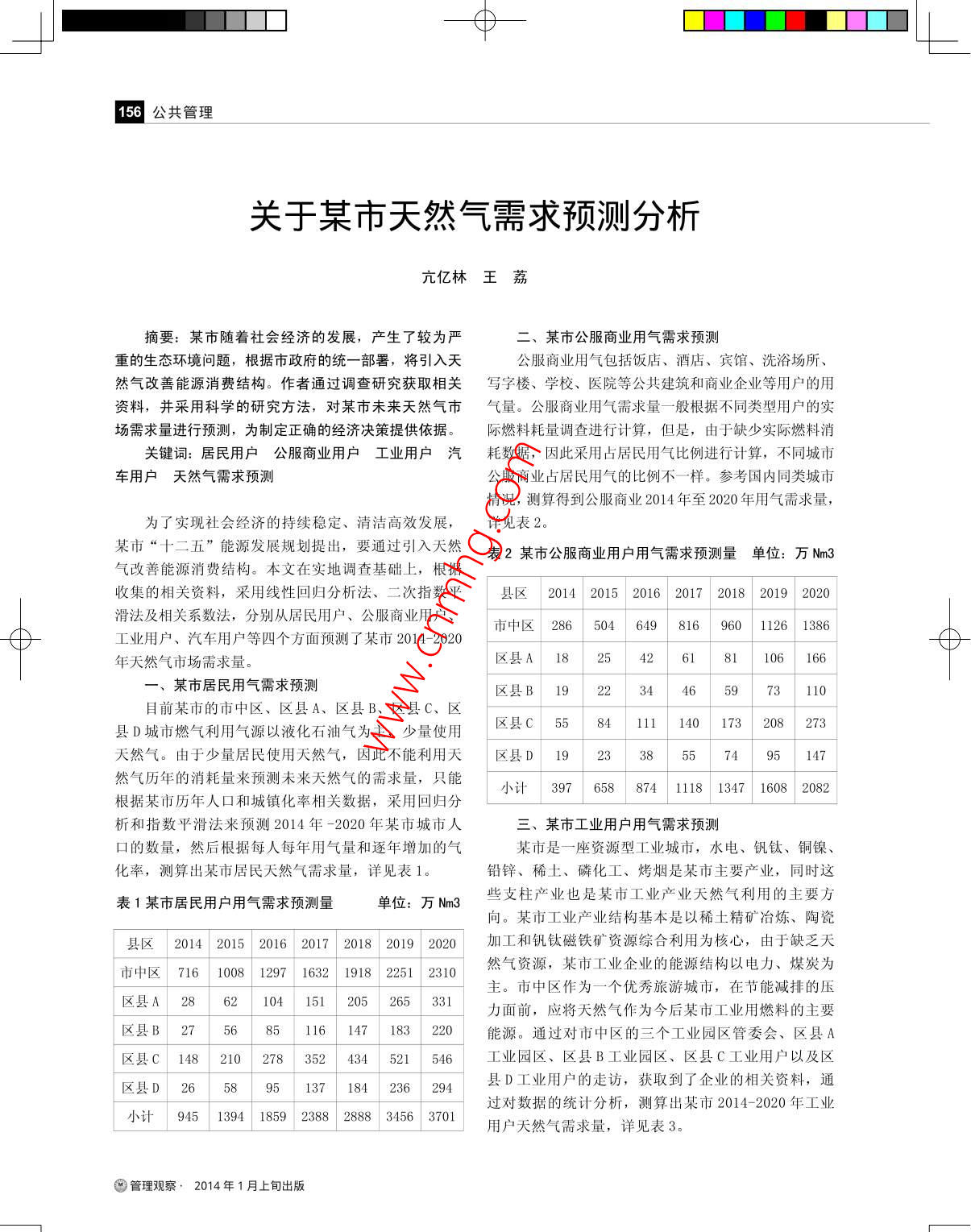 一φ-156公共管理關(guān)于某市天然氣需求預(yù)測分析亢億林王荔摘要:某市隨著社會(huì)經(jīng)濟(jì)的發(fā)展,產(chǎn)生了較為嚴(yán)二、某市公服商業(yè)用氣需求預(yù)測重的生態(tài)環(huán)境問題,根據(jù)市政府的統(tǒng)-部署,將引入天公服商業(yè)用氣包括飯店、酒店、賓館、洗浴場所、然氣改善能源消費(fèi)結(jié)構(gòu)。作者通過調(diào)查研究獲取相關(guān)寫字樓、 學(xué)校、醫(yī)院等公共建筑和商業(yè)企業(yè)等用戶的用資料,并采用科學(xué)的研究方法,對某市未來天然氣市氣量。 公服商業(yè)用氣需求量一般根據(jù)不同類型用戶的實(shí)場需求量進(jìn)行預(yù)測,為制定正確的經(jīng)濟(jì)決策提供依據(jù)。際燃料耗量調(diào) 查進(jìn)行計(jì)算,但是,由于缺少實(shí)際燃料消關(guān)鍵詞:居民用戶公服商業(yè)用戶 工業(yè)用戶耗數(shù)據(jù),因此采用占居民用氣比例進(jìn)行計(jì)算,不同城市車用戶天然氣需求預(yù)測公服商業(yè)占居民用氣的比例不一一樣。 參考國內(nèi)同類城市情況,測算得到公服商業(yè)2014年至2020年用氣需求量,為了實(shí)現(xiàn)社會(huì)經(jīng)濟(jì)的持續(xù)穩(wěn)定、清潔高效發(fā)展,詳見表2。某市“十二五”能源發(fā)展規(guī)劃提出,要通過引入天然表2某市公服商業(yè)用戶用氣需求預(yù)測量單位: 萬Nm3氣改善能源消費(fèi)結(jié)構(gòu)。本文在實(shí)地調(diào)查基礎(chǔ)上,根據(jù)收集的相關(guān)資料,采用線性回歸分析法、二次指數(shù)平縣區(qū)| 2014| 2015| 2016| 2017| 2018| 2019| 2020滑法及相關(guān)系數(shù)法,分別從居民用戶、公服商業(yè)用戶、市中區(qū)286| 504| 649| 816 960| 1126| 1386工業(yè)用戶、汽車用戶等四個(gè)方面預(yù)測了某市2014 -2020年天然氣市場需求量。區(qū)縣A | 1825| 426131| 106| 166一、 某市居民用氣需求預(yù)測區(qū)縣B| 19| 22| 341659| 73| 110目前某市的市中區(qū)、區(qū)縣A、區(qū)縣B、區(qū)縣C、區(qū)區(qū)縣C| 5584| 111| 14073| 208| 273縣D城市燃?xì)饫脷庠匆砸夯蜌鉃橹?,少量使用天然氣。由于少量居民使用天然氣,因此不能利用天區(qū)縣D| 1923| 35574| 914然氣歷年的消耗量來預(yù)測未來天然氣的需求量,只能小計(jì)39758 874| 1118| 1347 1608| 2082根據(jù)某市歷年人口和城鎮(zhèn)化率相關(guān)數(shù)據(jù),采用回歸分析和指數(shù)平滑法來預(yù)測2014年-2020年某市城市人三、某市工業(yè)用戶用氣需求預(yù)測口的數(shù)量,然后根據(jù)每人每年用氣量和逐年增加的氣某市是一座資源型工業(yè)城市,水電、釩鈦、銅鎳、化率,測算出某市居民天然氣需求量,詳見表1。沿鋅、稀土、磷化工、烤煙是某市主要產(chǎn)業(yè),同時(shí)這些支柱產(chǎn)業(yè)也是某市工業(yè)產(chǎn)業(yè)天然氣利用的主要方表1某市居民用戶用氣需求預(yù)測量單位:萬Nm3向。某市工業(yè)產(chǎn)業(yè)結(jié)構(gòu)基本是以稀土精礦冶煉、陶瓷縣區(qū)2014| 2015| 2016| 2017| 2018| 2019 2020加工和釩鈦磁鐵礦資源綜合利用為核心,由于缺乏天市中區(qū)716| 1008| 1297 1632| 1918| 2251| 2310然氣資源,某市工業(yè)企業(yè)的能源結(jié)構(gòu)以電力、煤炭為主。市中區(qū)作為- - 個(gè)優(yōu)秀旅游城市,在節(jié)能減排的壓區(qū)縣A | 2852| 104 151| 205| 265| 33力面前,應(yīng)將天然氣作為今后某市工業(yè)用燃料的主要區(qū)縣B| 2756| 85| 116 | 147| 183 220能源。通過對市中區(qū)的三個(gè)工業(yè)園區(qū)管委會(huì)、區(qū)縣A區(qū)縣C| 148| 210| 278| 352434 521| 546工業(yè)園區(qū)、區(qū)縣B工業(yè)園區(qū)、區(qū)縣C工業(yè)用戶以及區(qū)縣D工業(yè)用戶的走訪,獲取到了企業(yè)的相關(guān)資料,通區(qū)縣D| 2658| 91384 236| 294945| 1394| 1859| 2388| 2888 3456| 3701過對數(shù)據(jù)的統(tǒng)計(jì)分析,測算出某市2014- -2020年工業(yè)用戶天然氣需求量,詳見表3。?管理觀察,2014年 1月上旬出版一φ-公共管理157表3某市工業(yè)用氣需求統(tǒng)計(jì)表單位:萬Nm3五、某市天然氣需求總量預(yù)測本文從居民用戶、公服商業(yè)用戶、工業(yè)用戶、汽車用縣區(qū)2014| 2015 | 2016| 2017| 2018| 2019| 2020戶等四個(gè)方面對某市市中區(qū)、區(qū)縣A、區(qū)縣B、區(qū)縣C和工業(yè)區(qū)11040 1098| 2721| 3006 3291| 3576| 8960區(qū)縣D天然氣市場需求進(jìn)行了預(yù)測,對四類用戶求總即可得到某市2014- 2020年天然氣需求預(yù)測總量,詳見表4。區(qū)21710| 5415 5415| 5415 5415| 5415| 5415表5某市天然氣需求預(yù)測量公服商工業(yè)用|0| 2138 | 12798 | 12798 | 12798 | 12798居民用汽車用|天然氣區(qū)3年份|氣需求業(yè)用氣|戶用氣氣需求總需求需求預(yù)|需求預(yù)區(qū)縣A預(yù)測量測量預(yù)測量|預(yù)測量工業(yè)| 304 | 684 | 9004| 9004 | 9004| 9004 11360| 201494539739101230 .482區(qū)縣B2015139465811852| 144015345工業(yè)| 0 | 2375| 2375| 2375 2375 2375| 32022016185987425642 163830012園區(qū)2017 2388 111836589 187541970區(qū)縣C2018| 2888 134736871| 206743173工業(yè)| 428| 1852 | 3278| 3278| 3278| 3278| 3278用戶2019| 3456| 160837159| 23044452區(qū)縣D| 20203701208245726255354062工業(yè)| 428| 428713| 713| 713| 713 713從表5中可知,2020年某市天然氣需求預(yù)測量為小計(jì)3910 11852 | 25642 36589 36871 37159 4572654062 萬Nm3,其中:居民用戶天然氣需求預(yù)測量為3701萬Nm3;公服商業(yè)用戶天然氣需求預(y