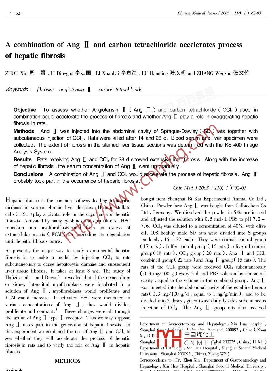 62.Chinese Medical Journal 2003 ; 116( 1 ):62-65A combination of Ang ]I and carbon tetrachloride accelerates processof hepatic fibrosisZHOU Xin周馨 , LI Dingguo李定國(guó), LI Xuanhai李宣海, LU Hanming陸漢明and ZHANG Wenzhu張文竹Keywords : fibrosis . angiotensin I . carbon tetrachlorideObjective To assess whether Angiotensin I ( Ang I ) and carbon tetrachloride ( CCI4 ) used incombination could accelerate the process of fibrosis and whether Ang I play a role in exaggerating hepaticfibrosis in rats.MethodsAng I was injected into the abdominal cavity of Sprague-Dawley( SD ) rats together withsubcutaneous injection of CC4. Rats were klld after 14 and 28 d. Blood serum and liver specimen werecollected. The extent of fibrosis in the stained liver tissue sections was determined with the KS 400 ImageAnalysis System.Results Rats receiving Ang I and CCl4 for 28 d showed extensive liver fibrosis . Along with the increaseof hepatic fibrosis , the serum concentration of Ang I went up gradually.Conclusions A combination of Ang I and CCl4 would accelerate the process of hepatic fibrosis. Ang Iprobably took part in the ccurrence of heparic fibrosis.Chin Med J 2003 ; 116( l ):62-65Hepatic fibrosis is the common pathway leading to hepaticbought from Shanghai Bi Kai Experimental Animal Co Ltd ,cirrhosis in various chronic liver diseases. Hepatic stellateChina. Powder form Ang II was bought from Callbiochem (cells( HSC ) play a pivotal role in the occurrence of hepaticLtd , Germany. We dissolved the powder in 5% acetic acidfibrosis. Activated by many cytokines and chemokines , HSCand adjusted the solution with 0.5 mol/L PBS to pH 7.2-transform into myofibroblasts and form an excess of7.6. CCl4 was diluted to a concentration of 40% with oliveextracellular matrix ( ECM ) far exceeding its degradationoil. 108 healthy male SD rats were divided into 6 groupsuntil hepatic fibrosis forms .randonly , 15 - 22 each. They were normal control group( 17 rats ), buffer control group( 16 rats ) , olive oil controlAt present,the major way to study experimental hepaticgroup( 18 rats ), CCl4 group( 20 rats), Ang II and CClfibrosis is to make a model by injecting CCl4 to ratscombined group( 22 rats )and Ang II group( 15 rats ). Thesubcutaneously to cause hepatocytic damage and subsequentrats of the CCl4 group were received CCl4 subcutaneouslyliver tissue fibrosis. It takes at least 8 wk. The study of(0.3 mg/100 g) every 3 d and PBS solution by abnominalHafizi et al' and Brown2 revealed that if the myocardiumcavity , equal to the volume in the combined group. Ang Ior kidney interstitial myofibroblasts were incubated in awas injected into the abdominal cavity of the combined groupsolution of Ang II , myofibroblasts would proliferate andrats(0.3 mg/100 g/d , equal to 1 ng/g/min), and to beECM would increase. If activated HSC were incubated irvarious concentrations of Ang I ,they would divide ,divided into 2 doses , given twice daily besides subcutaneousinjection of CCl4. The Ang II group rats also receivedproliferate and contract .These changes were all throughthe action of Ang I typeI receptor. Thus we may supposeAng Il takes part in the generation of hepatic fibrosis. InDepartment of Gastroenterology and Hepatology ,Xin Hua Hospital ,this experiment we combined the use of Ang II and CCI4 toShanghai Sgrnd Mwtign! Ininnit Slonghai 200092 , China ( Zhousee whether they will accelerate the process of hepaticX,Li DC中國(guó)煤化工ShanghaiC N M H Gehai 20025 ,China( Li XH)fibrosis in rats and to verify the role of Ang II in hepaticDepartment ol Tatthology ,Ain Hua Hosptal , Shanghai Second Medicalfibrosis.University , Shanghai 200092 , China ( Zhang WZ )METHODSCorrespondence to :Dr. Zhou Xin , Department of Gastroenterology andHepatology , Xin Hua Hospital , Shanghai Second Medical University ,AnimalsShanghai 200092 , China( Tel : 86-21-65790000 ext 5319. Fax :86-21-Male Spragu萬(wàn)振y( SD )rats , weighing 250土10 g ,vere55571294. E-mail : xzhouch@ hotmail . com )Chinese Medical Journal 2003 ; 116( 1 ):62-65injections of olive oil subcutaneously every 3 d( equal to the .level of ALT and AST of the combined group at the end ofvolume in the CCI4 group ) and Ang II ( equal to the volumethe second and the fourth week were significantly higher,in the combined group ). The normal control rats were givenwhile ALB lowered( P <0.01 ). As time went on , liverno treatment and the buffer control group animals werefunctions of these rats deteriorated( Table 1 ).injected equal volume of PBS solution as in the combinedTable 1. 'The infuence of combining CC4 and Ang IIgroup. Rats of the olive oil group were injected olive oil in ato ALT ,AST ,ALB(xts)volume equal to that in the CCL4 group. Animals were killedGroupALT(μ/1)AST(p/1l)ALB( g/)at the end of the second and the fourth week. LiverNormal control 9132.75+11.66 217.00+22.37 19.38土 1.69specimen were preserved at - 20C.Buffer control130.00+ 15.03232.00+27.9618.50+1.51Olive oil control 10 126.50+14.78 212.63+19.11 19.13+1.25Serum concentration of Ang I[CCL48 715.75+97.38* 997 8士104.79* 15.88士1.25*Radioimmunity Test Kit of Ang II was bought from BeijingCombined13 1132.63+113.29↑ 1038.69土126.04* 14.46土0.88*Northerm Biotech Institute , China. 25 μl enzyme inhibitorAng II72.00+32.24*__ 869.00+64.97*_ 16.86 +0.69”was put into 1 ml of rat blood , fllowed by centrifuging in a¥P<0.01 vs control goup,+ P<0.01 vs CCL4 group,O P<0.05 vs CC4groupBeckman GS-6 centrifuge , 4000 r/min ,4C. 200 pl blood .serum was aspirated and then 125I labeled antigen andMarkers of hepatic fibrosis after Ang II and CCl4antibody were added into the serum. 7 standard tubes of Angcombined treatmentII at concentrations of 0 , 25 , 50,100, 200 , 400 , 800Collagen IV ,laminin , hyaluronic acid and PIl P are usuallypg/ml and another T tube were set up. The blood serumused as serum markers of hepatic fibrosis. When Ang I andconcentration of Ang II was determined by Radio immuno-CCl4 were us