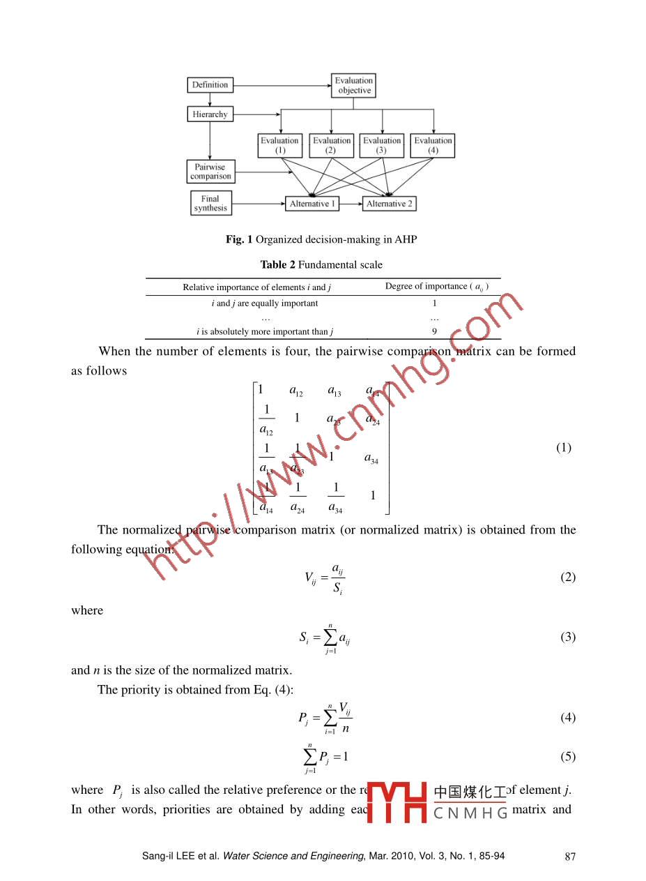 SEWater Science and Engineering, 2010, 3(1): 85-94doi:10.382/.issn.1674-2370.2010.01.009htp://ww.waterjournal.cne-mail: wse2008@vip.1 63.comDevelopment of site suitability analysis system forriverbank filtrationSang-il LEE, Sang-sin LEE*Department of Civil and Environmental Engineering, Dongguk University, Seoul100-715, KoreaAbstract: Site selection plays a crucial role in riverbank filtration for sustainable wateravailability and quality. Choosing the most appropriate from among multiple candidate sitesrequires a complex procedure, involving many tangibles and intangibles. In this study, the AnalyticHierarchy Process (AHP), which selects the optimal alternative by hierarchically classifyingvarious attributes and then quantifying the importance of each atribute, was used to prioritizecandidate locations for riverbank filtration. A GIS-based computer program was developed toautomate the assessment process. The developed software was applied to the Han River in Korea.Analysis of four candidate sites reveals that a site that has better water quality and conectivity tothe neighboring purification facility is more suitable than other locations.Key words: riverbank filtration; AHP; site suitabilir; Han River1 IntroductionIn European countries such as Germany and the Netherlands, riverbank filtration (RBF)has been successfully practiced as a way of enhancing the quality of the water supply for over150 years (Grischek et al. 2002; Tufenkji et al. 2002; Eckert and Irmscher 2006). In Germany,RBF is used for 15%-16% of the total drinking water. RBF has also been used for drinkingwater in many cities in the United States. RBF relies on the streambed and aquifer matrixes toimprove source water quality and to reduce pathogens through induced infiltration. Theremoval or degradation of contaminants is achieved through a combination of physicochemicaland biological processes.Tap water in Korea mainly comes from surface water. A more advanced water treatmentprocess is needed due to the risk of accidental spills and the deterioration of surface waterquality. Because of the high cost of water treatment and public concerns, decision makers areturning to RBF as an alternative to the conventional abstraction of surface water. ChangwonCity started supplying domestic water treated through RBF in 2001, the first time in Korea(Office of Waterworks Changwon City 2009). The city continues to expand the facility, and the中國(guó)煤化工This work was supported by a grant (3-4-3) from the SustainableMYHCNMHGnterofthe21stCentury Frontier Research Program.*Corresponding author (e-mail: sinslee @ nate.com)Received Sep.28, 2009; accepted Nov. 25, 2009water supply is now 70000 mi /d. A neighboring city, Chil-seo Myeon in Ham-an Gun, has alsobeen supplying riverbank- filtered water (20000 m'/d) since 2003. Seoul, the capital of Korea,is pursuing the introduction of RBF to enhance public trust in tap water. Table 1 shows someexamples of riverbank filtration throughout the world.Table 1 Major examples of riverbank filtrationRiverWell fieldNumber of wellWater production (m/d)Rhine River in GermanyDisseldorf70 vertical wells, 18 clltor wells357 600Llobregat River in SpainCorella26 extraction wells, 7 recharge wells62000Limmat River in SwitzerlandHardhof9 vertical wells, 4 cllctor wells15 000Donau River in AustriaLobau8 clletor wells136000Donau River in HungaryCsepel256 vertical wells, 30 clletor wells150000Missouri River in USAJefferson County5 lateral wells18 900Nearman1 collector well120000Kansas River in USAKansas City1 cllctor well151 200 .Ohio River in USALouisville, Kentucky2 cllector wells75 600Nakdong River in KoreaChangwon50 vertial wells, 1 collector well80000The Analytic Hierarchy Process (AHP), which allows for the selection of the optimalaltermnative by hierarchically classifying the various attributes and then measuring theimportance of each attribute, was developed by Saaty (1980). The novelty of AHP lies in thestratification of a decision- making problem with many objectives, evaluation criteria, anddecision-making variables. Due to its simplicity and versatility, AHP has been used in varioussettings to make decisions (Saaty 2008). AHP involves dividing a sophisticated problem intosub-elements, organizing them, forming an orderly hierarchical structure, determining threlative importance of the elements through pairwise comparison, and finally synthesizinghuman judgments to provide a total order (Zhang 2009). There have been some studies relatedto site suitability analysis using AHP. Wu (1998) developed a prototype of a simulation modelbased on cellular automata (CA) and multi- criteria evaluation (MCE) and integrated withgeographic information system (GIS) using the AHP method. Reza (2005) studied the ways inwhich AHP frames the site evaluation problem and can aid in making decisions involvingmultiple criteria, factor diversity, and conditions of uncertainty.2 Suitability analysis using AHPApplying the AHP procedure involves four basic steps (Fig. 1): (1) definition of theproblem; (2) construction of the decision hierarchy; (3) comparative judgment, or datacollection and execution of pairwise comparison for elements in the hierarchical structure; and(4) synthesis of priorities, or evaluation of the overall priority rating.The decision hierarchy is structured from the top, with the goal of the decision, throughthe intermediate levels to the lowest level. Once a hierarchy is established, pairwisecomparison is made. The pairwise comparison makes. the complicated comparison of entireelements easy. The degree of relative importance of ele中國(guó)煤化工ccording toa1-9 scale, as shown in Table 2.fYHCNMHG.86Sang-il LEE et al. Water Science and Engineering, Mar. 2010, Vol. 3, No. 1, 85-94J EvaluationDefinitionobjective↓l Hierarchy| Evaluation Evaluation | | Evaluation || Evaluation(1I)2)(3)(4)PairwisecomparisonFinal+[ Ateative1]- -[ Altemative2]synthesisFig. 1 Organized decision-making in AHPTable 2 Fundamen