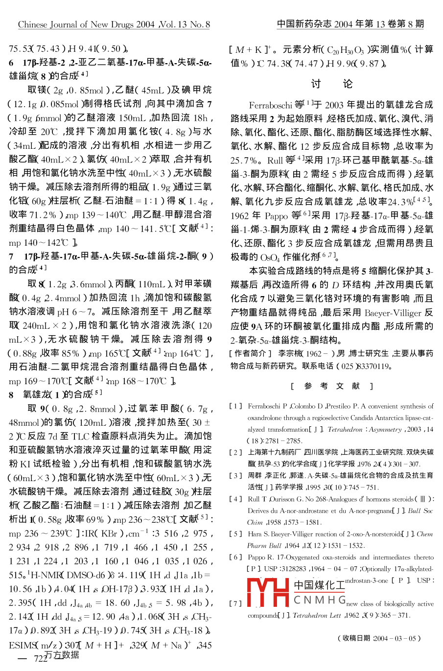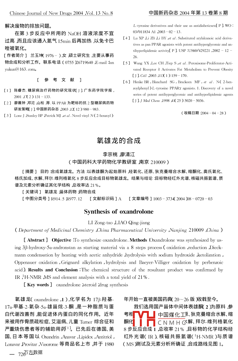 Chinese Journal of New Drugs 2004 ,Vol.13 No.8中國新藥雜志2004年第13卷第8期解決廢物的排放問題。L- tyrosine derivatives and their use as antidiabeticsetd[P] wO:在第3步反應(yīng)中所用的NaOH溶液濃度不宜03/011834 A1 2003 -02 - 13.過高而且應(yīng)該通入氮氣15min后再加熱,以免卡巴[4] LuXP ,Li ZB Li BY .et al . Substituted arylalcanoic acid deriva-tives as pan PPAR agonists with potent antihyperglycemic and an-唑被氧化。tihyeripidenie activity[ P ] USP :US60/429221,2002 - 12-. [作者簡介]蘭玉坤( 1976- )女碩士研究生主要從事藥26物合成和分析工作。聯(lián)系電話( 0755 )26719640 ,E-mail :lan :[5] Wang YX ,Lee CH ,Tiep s ,et al. Peroxisome Proliferator-Acti-yukun@ 163. com。vated Receptor δ Activates Fat Metabolism to Prevent Obesity[J]Cell 2003 ,113( 1):159- 170.[參考文獻(xiàn)][6] Henke BR , Blanchard SG , Brackeen MF ,et al. N( 2-ben-zoylphenyl )L-tyrosine PPARY agonists. 1. Discovery of a novel[1]陳睿杰.糖尿病治療藥物的研究現(xiàn)狀[J ]廣東藥學(xué)院學(xué)報,series of potent antihyperglycemic and antihyperlipidemic agents2001 ,172):131- 133.[J]J Med Chem ,1998 A41( 25 ): 5020 - 5036.[2]廖晨鐘鄧沱山松等.以PPAR為靶標(biāo)的抗2型糖尿病藥物研發(fā)策略J]中國新藥雜志2003 ,12 12 ):980- 983.(收稿日期2004-04 -28 )[3] Lone J Stanley BP Patrick MJ et al . Novel vinyl N( 2-benxoyl)-氧雄龍的合成李宗桃廖清江(中國藥科大學(xué)藥物化學(xué)教研室南京210009 )[摘要]目的合成氧雄龍。方法:以表雄酮為起始原料經(jīng)氧化、還原、狄克曼縮合水解、縮酮化、奧氏氧化、格氏加成、水解、拜爾_維列格氧化8步反應(yīng)合成目標(biāo)物氧雄龍。結(jié)果與結(jié)論:目標(biāo)物經(jīng)紅外光譜、核磁共振氫譜、質(zhì)譜及元素分析確證其化學(xué)結(jié)構(gòu)總收率達(dá)21%。[關(guān)鍵詞]氧雄龍;甾體藥物藥物合成[中圖分類號] R914.5 ;R977.12 [ 文獻(xiàn)標(biāo)識碼]A [ 文章編號] 1003 - 3734( 2004 )8 - 0720-03Synthesis of oxandroloneLI Zong- tao LIAO Qing jiang( Department of Medicinal Chemistry ,China Pharmaceutical University ,Nanjing 210009 ,China )[ Abstract ] Objective :To synthesize oxandrolone. Methods Oxandrolone was synthesized by us-ing 3β- hydroxy-5a- andronstan as starting material via a 8 steps process ( oxidation ,reduction ,Dieck-mann condensation by heating with acetic anhydride ,hydrolysis with sodium hydroxide ,ketolization ,Oppenauer oxidation ,Grignard alkylation , hydrolysis and Baeyer-Villiger oxidation by perbenzoicacid). Results and Conclusion :The chemical structure of the resultant product was confirmed byIR ,HNMR MS and element analysis with a total yield of 21%.[ Key words ] oxandrolone steroid idrug synthesis氧雄龍( oxandrolone ,1 ),化學(xué)名為17β_羥 基_年開始一直被美國藥典< 20~26版收載至今。17a-甲基-2-氧雜_ 5a-雄甾烷~3_酮,是一種脂質(zhì)與蛋我們選用國產(chǎn)甾體中間體表雄酮2)為原料參白代謝改善劑,能促進體內(nèi)蛋白的同化作用。近年考相中國煤化工原狄克曼縮合水解、縮來被用作骨質(zhì)疏松癥、艾滋病、兒童Tumer綜合征和酮化CN MH G解、拜爾_維列格氧化嚴(yán)重?zé)齻颊叩鹊妮o助用藥1。已先后在德國、美8步反應(yīng)合成1總收率21% ,目標(biāo)物的化學(xué)結(jié)構(gòu)經(jīng)國、日本等國以O(shè)xandrn ,Anavar ,Lipidex ,Antitrol ,紅外光譜(IR)核磁共振氫譜(IH-NMR)與質(zhì)譜Lonavar ,Provitar ,Vasorome等商品名上市并于1980 ( MS )測試及元素分析所確證合成路線見圖1。-728萬左數(shù)據(jù)Chinese Journal of New Drugs 2004 ,Vol.13 No. 8中國新藥雜志2004年第13卷第8期" . HoOC-HOOC.A4uCHlton,↓9”9rx合1M8e:環(huán)已電/異內(nèi)醇f:CHMgI:TOHeetoneib:CH.000OH圖1氧雄龍合成 路線Fig 1 The synthesis route of oxandrolone餾至近干,減壓蒸除余下的醋酸酐并降溫至80C實驗部分所得固狀物溶于乙醇(50mL)中,加熱至80C加液熔點測定用XRC-1型顯微熔點測定儀,溫度堿調(diào)pH9~ 10 ,減壓蒸出1/3的乙醇冷卻結(jié)晶過計未校正。IR 測定采用NICOLET Impact410型紅濾溶于氯仿(60mL)后,用5%碳酸氫鈉溶液洗滌外儀;HNMR測定用AV- 300型核磁共振儀;MS( 15mLX2) ,用蒸餾水洗至中性減壓除去氯仿得5測定用LC-MS-Trap-SL-01100型質(zhì)譜儀;元素分(6.53g ,收率89% ),mp 194~ 196C ,石油醚-乙酸析用Elementa Vario EL II型元素分析儀。乙酯重結(jié)晶得白色晶體mp 195 ~ 196C[文獻(xiàn)4 lmp .12 3-斷5a-雄甾烷-17-酮~2 3.雙羧酸3的合成2]195~ 197C ]取x( 20g ,68. 8mmol )加熱溶于100mL冰醋酸4 17β-羥基-2 2-亞乙二氧基_A_失碳.5a-雄甾烷( 6 )中濾去不溶物攪拌下滴加由三氧化鉻( 23g 0.318的合成mol )水( 160mL )及濃硫酸34mL )混合而成的氧化取5(5. 5g 0. 019 9mol )甲苯( 300mL)乙二醇劑控溫(62+3)C。滴完升溫至65 ~ 70C反應(yīng)2h(27.5mL0.75mol)及對甲苯磺酸0.5g)攪拌加熱后再升溫至90C反應(yīng)0. 5h。減壓濃縮至原體積的至110C回流6h以上并分出生成的水,至TLC檢1/2加水至原體積再減壓濃縮至原體積的1/2趁查原料點消失后冷卻至100C,加入吡啶(0.8mL)熱( 50~ 60C )過濾,水洗至pH4.5~5.5。所得粗?jǐn)嚢?min分出甲苯,用 5%碳酸氫鈉溶液洗滌( 10品在水( 160mL )中加熱( 70~ 80C ) ,加液堿調(diào)pHmLX2)再用蒸餾水洗至中性,減壓除去甲苯得固7~8濾去不溶物用3motL1鹽酸中和至pH2~體6(6.2g ,收率98% ),mp 138~ 139. 5C[文獻(xiàn)4]:3靜置,冷卻結(jié)晶,過濾,干燥得3( 19.6g ,收率mp 140~ 141C ]丙酮重結(jié)晶得分析樣品,mp85% ) mp 214~ 216C[文獻(xiàn)2] mp 213~216C ]140~ 141C。ESIMS( m/z):321[ M + H]。元素217β-羥基-2 ,3-_斷_5oa-雄甾烷-2 ,3-雙羧酸( 4 )的合分析( 