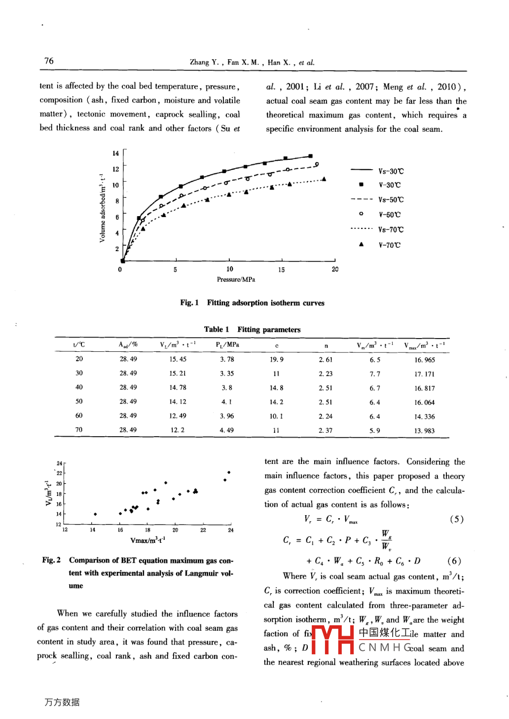 Global Geology, 15(1): 74-77(2012doi:10.3969/jisn.1673-9736.2012.01.11Article ID:16739736(2012)01-0074-04Evaluation of coal bed methane content using BETadsorption isotherm equationZHANG Yi, FAN Xiaomin, HAN Xue, NAN Zeyu and XU JunCollege of Geo-Exploration Science and Technology, Jilin University, Changchun 130026, ChinaAbstract Coal bed methane is unconventional raw natural gas stored in coal seam with considerable reserves inChina. In recent years, as the coal bed methane production, the safety and the use of resources have been paidmore attentions. Evaluating coal bed methane content is an urgent problem. A BET adsorption isotherm equan is used to process the experimental data. The various parameters of Bet equation under different tempera-tures are obtained; a theoretical gas content correction factor is proposed, and an evaluation method of actualcoal bed methane is establishedKey words: BET adsorption isotherm; coal bed methane; geophysical well logging; gas content; evaluationmethodIntroduction1938, Brunauer, Emmett and Teller extended Langmuir monolayer adsorption theory to multi-molecularSince 1970s, as the development of coal bedlyer adsorption isotherm type I( brunauer et almethane industry, people have a profound under-1938). In 1977, Kim proposed an adsorption iso-standing of the advantage of coal bed methane explora-herm based on approximate analysis result ( Kimtion on solving the coal mining disasters in gas explo-1977). In 1992, Hawkins derived a Langmuir adsion and providing clean energy for human beingssorption isotherm equation of coal rank, using thethe same time, improving energy structure and redsame data as deriving Kim equation( Hawkins et aling gas emissions on the human environment pollu1992). In 1999, Gao et aL.(1999 )used Langmuirtion. Therefore, exploration and development of coalquation to evaluate coal bed methane content withbed methane resources has attracted wide attention atwell logging datahome and abroad, and the research work on exploraThe adaptation of BET equation to the laboratorytion has been carried outanalytical adsorption isotherm data and the calculationIn 1918, Langmuir derived monolayer adsorptioof the max gas content are discussed, and a correctionisotherm from the kinetic theory, and considered thatfactor is established to correct theory gas content toadsorption sites which can adsorb molecules or atomsactual gas content.exist on solid surface Langmuir et al., 1918). In1930, Freundlich extended Henry adsorption equationI BET equationand found that many kinds of solution adsorption alsoBET theory is suitable for uniform chemical prop-consistent with the equation( Freundlich, 1930). Inerties surface中國煤化工ns are asfoiCNMHGReceived 21 November 2011, accepted 15 December 2011Evaluation of coal bed methane content using BET adsorption isotherm equationisothermal adsorption equation, BET adsorption iso-Two-parameter BET equationtherm equation can fit I and II type adsorption iso-V cptherm curves, and due to the large amount of parame-(o-p)[1+(c-1)(P/b))(1)ters, the results of BET equation are highly consistentThree-parameter BET equationwith the experimental adsorption dataThe three-parameter BET adsorption isothermV(n+1)"+nx"equation is applied in this study, when looking for the(1-x)best accordant adsorption gas content V, to the labora-P(3)urement of adsorption gas content V (leanin Heilongjiang province of China is pro-Where V is adsorbed gas volume(m/t): V is the cessed), the least square method is used, and thusvolume of gas adsorbed when the entire adsorbent sur-the parameters of n, c, Vm and the best fitting adsorp-face is covered with a complete unimolecular layertion isotherm are obtained. The fitting result is shown(m/t); P is pressure(MPa) Po is liquid adsorbed in Fig. 1, three V, curves under different temperaturessaturated vapor pressure of same temperature( MPa);are described as solid. dashes and short dashes linesc is constant related with the heat of adsoron anand the square, circle and triangle points are laborato-condensation. n is the number of absorption layersry measurement data, as it is shown in the figuremited by the adsorption diameter.three-parameter BET isothermal adsorption equationsTwo parameters BEt equation describes the typeare highly consistent with experimental data.II adsorption isotherm of the reverse"S"shape whenThe optimal fitting parameters n, c and Vm at dif-n is infinite. When pressure is very small(P