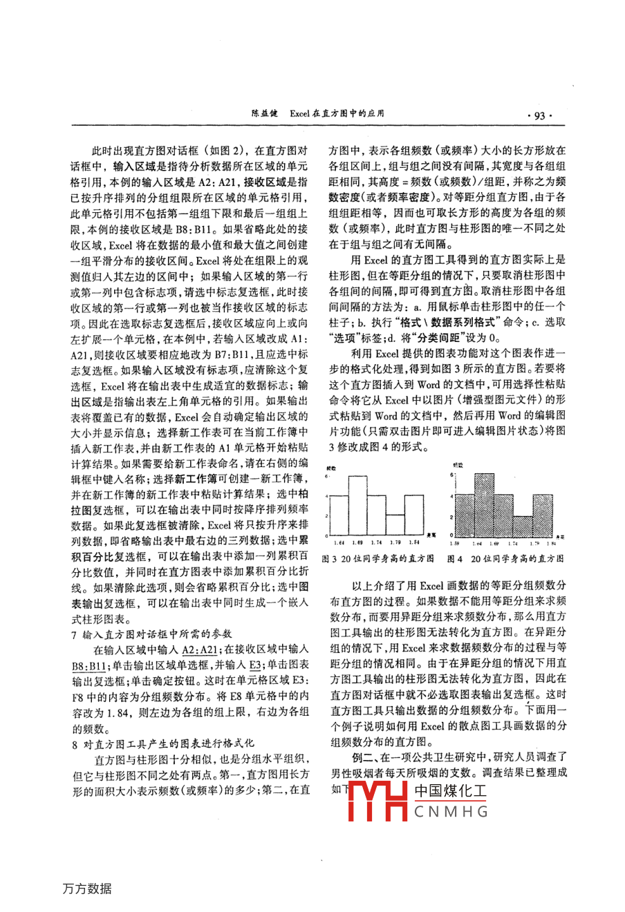 第1期閩西職業(yè)大學(xué)學(xué)報2002年3月Journal of MinXi Vocational CollegeMarch 2002Excel在直方圖中的應(yīng)用陳益健(龍巖電視大學(xué)福建龍巖364000摘要:直方圖是統(tǒng)計學(xué)中常用的一種較直觀、先選取單元格區(qū)域A2:A21,再單擊常用工具欄形象的圖示法。計算機在統(tǒng)計學(xué)中已被廣泛應(yīng)用,本上的圖表指南按鈕,然后按圖表指南來完成柱形圖文介紹了一種較簡單的用計算機畫直方困的方法(如圖1)。從圖1中可看出,這組數(shù)據(jù)在其變動范圍即Exel軟件在直方圖中的應(yīng)用。內(nèi)沒有明顯的起伏,且在實際中也沒有什么有意義關(guān)鍵詞: Excel軟件;直方圖;統(tǒng)計應(yīng)用的數(shù)量界限,因此可使用等距分組。中圖分類號:C81文獻標(biāo)識碼:A文章編號:1008-4797(2002)01-0092-03直方圖是對統(tǒng)計調(diào)查所得到的原始數(shù)據(jù)的直觀概括,它表明了調(diào)查數(shù)據(jù)的頻數(shù)分布(或頻率分布),從直方圖中我們能夠直觀地看出數(shù)據(jù)中所隱含的總體信息。同時直方圖對我們理解統(tǒng)計模型有著重要意義。在直方圖的教學(xué)過程中,遇到的最大問題是將圖120位同學(xué)身高的圖表示組數(shù)據(jù)轉(zhuǎn)化為直方圖需要花費較多的時間,這就3確定分組的組數(shù)使學(xué)生無法多做練習(xí)。應(yīng)用 Excel就可順利地解決這般來說,可先多分組,再少分組,具體組數(shù)多個問題,因為 Excel只需幾分鐘時間就能將一組數(shù)據(jù)少取決于數(shù)據(jù)的個數(shù),通常在5到15組之間。在實轉(zhuǎn)化為一個合適的直方圖由于 Excel不是專業(yè)統(tǒng)計際中可參考如下經(jīng)驗公式:K=1+3.22xlg(n)。在軟件,因此,在用 Excel畫直方圖時,不如專業(yè)統(tǒng)計軟本例中可取組數(shù)為5。件方便。但用Exel畫直方圖,可充分利用 Excel所4確定分組的組距提供的強大的圖表功能,將圖表十分方便地插入到在B3中輸入組數(shù)(K),C3中輸入組數(shù)的值5;Word的文檔中。下面通過兩個簡單的例子說明如何在B4中輸入極差(R),C4中輸入=MAX(A2:A21)用Exce來畫直方圖。MIN(A2:A21);在B5中輸入組距(C),C5中輸入例一、試將下面一組某班20位同學(xué)身高的數(shù)據(jù)公式C4/C3,這個公式的計算結(jié)果為0.046,因組距(單位:米)用直方圖表示應(yīng)略大于這個值,所以取組距為0.05。1.761.601.651.801.651.805將組限按從小到大的順序放在式表中1.651.651.731.801.661.70在B6中輸入組限;B7中輸入第一組的組下限1.601.831.701.681.701.751.59,B8中輸入=B7+0.05,并將B8中的公式填充假定這組數(shù)據(jù)已放在一張工作表的單元格區(qū)到B9:B12中。域:A1:A21中(A1為數(shù)據(jù)標(biāo)記身高)。下面介紹用6執(zhí)行“工具/數(shù)據(jù)分析/直方圖”Excel將這組數(shù)據(jù)轉(zhuǎn)化為直方圖的過程。1將數(shù)據(jù)從小到大按順序排列先選取單元格區(qū)域A2:A21,然后單擊常用工具編出選欄上的升序按鈕就可將這20位同學(xué)身高的數(shù)據(jù)從小到大按排序排列2用柱形圖查數(shù)據(jù)的變動情況,以決定是否用等距中國煤化工分組CNMHG陳益健 Excel在直方圖中的應(yīng)用93此時出現(xiàn)直方圖對話框(如圖2),在直方圖對方圖中,表示各組頻數(shù)(或頻率)大小的長方形放在話框中,輸入?yún)^(qū)域是指待分析數(shù)據(jù)所在區(qū)域的單元各組區(qū)間上,組與組之間沒有間隔,其寬度與各組組格引用,本例的輸入?yún)^(qū)域是A2:A21,接收區(qū)域是指距相同,其高度=頻數(shù)(或頻數(shù))/組距,并稱之為頻已按升序排列的分組組限所在區(qū)域的單元格引用,數(shù)密度(或者頻率密度)。對等距分組直方圖,由于各此單元格引用不包括第一組組下限和最后一組組上組組距相等,因而也可取長方形的高度為各組的頻限,本例的接收區(qū)域是B8:B1。如果省略此處的接數(shù)(或頻率),此時直方圖與柱形圖的唯一不同之處收區(qū)域,Ece將在數(shù)據(jù)的最小值和最大值之間創(chuàng)建在于組與組之間有無間隔。組平滑分布的接收區(qū)間。 Excel將處在組限上的觀用 Excel的直方圖工具得到的直方圖實際上是測值歸入其左邊的區(qū)間中;如果輸入?yún)^(qū)域的第一行柱形圖,但在等距分組的情況下,只要取消柱形圖中或第一列中包含標(biāo)志項,請選中標(biāo)志復(fù)選框,此時接各組間的間隔即可得到直方圖。取消柱形圖中各組收區(qū)域的第一行或第一列也被當(dāng)作接收區(qū)域的標(biāo)志間間隔的方法為:a.用鼠標(biāo)單擊柱形圖中的任一個項。因此在選取標(biāo)志復(fù)選框后,接收區(qū)域應(yīng)向上或向柱子;b.執(zhí)行“格式\數(shù)據(jù)系列格式”命令;c.選取左擴展一個單元格,在本例中,若輸入?yún)^(qū)域改成A1:“選項”標(biāo)簽;d.將“分類間距設(shè)為0。A21,則接收區(qū)域要相應(yīng)地改為B7:Bl,且應(yīng)選中標(biāo)利用Ecel提供的圖表功能對這個圖表作進志復(fù)選框。如果輸入?yún)^(qū)域沒有標(biāo)志項,應(yīng)清除這個復(fù)步的格式化處理,得到如圖3所示的直方圖。若要將選框, Excel將在輸出表中生成適宜的數(shù)據(jù)標(biāo)志;輸這個直方圖插入到Word的文檔中,可用選擇性粘貼出區(qū)域是指輸出表左上角單元格的引用。如果輸出命令將它從 Excel中以圖片(增強型圖元文件)的形表將覆蓋已有的數(shù)據(jù),Exe會自動確定輸出區(q