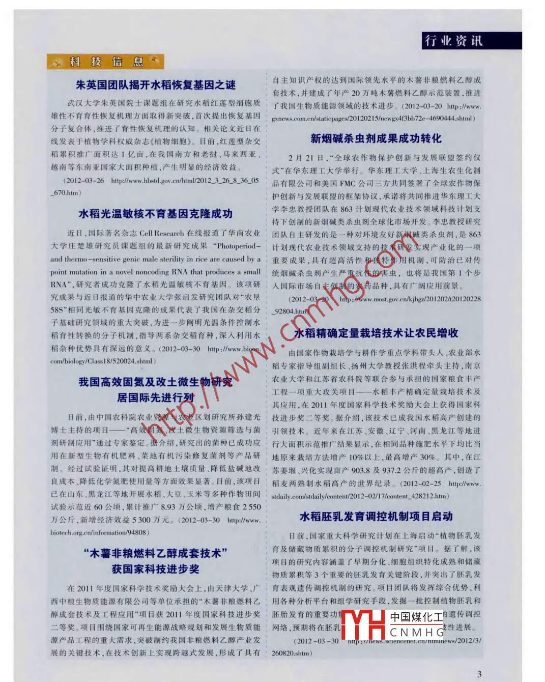 業(yè)資訊圉技信息朱英國團(tuán)隊揭開水稻恢復(fù)基因之謎自主知識產(chǎn)權(quán)的達(dá)到國際領(lǐng)先水平的木薯非糧燃料乙醇成套技術(shù),并建成了年產(chǎn)20萬噸木薯燃料乙醇示范裝置,推進(jìn)武漢大學(xué)朱英國院土課題組在研究水稻紅蓮型細(xì)胞質(zhì)了我國生物質(zhì)能源領(lǐng)域的技術(shù)進(jìn)步。(2012-03-20hp:/w維性不育育性恢復(fù)機理方面取得新突破,首次提出恢復(fù)基因: xnews. com.en/staticpages0120215/mewg43b72-46904shm)分子復(fù)合體,推進(jìn)了育性恢復(fù)機理的認(rèn)知。相關(guān)論文近日在線發(fā)表于植物學(xué)科權(quán)威雜志《植物細(xì)胞》。日前,紅蓮型雜交新煙堿殺蟲劑成果成功轉(zhuǎn)化稻累積推廣面積達(dá)1億畝,在我國南方和老撾、馬來西亞2月21日,“全球農(nóng)作物保護(hù)創(chuàng)新與發(fā)展聯(lián)盟簽約儀越南等東南亞國家大面積種植,產(chǎn)生明顯的經(jīng)濟(jì)效益。式”在華東理工大學(xué)舉行。華東理工大學(xué)、上海生農(nóng)生化制(2012-03-26htp/www.hbstd.gov.cn/htm201232683605品有限公司和美國FMC公司三方共同簽署了全球農(nóng)作物保_670hm)護(hù)創(chuàng)新與發(fā)展聯(lián)盟的框架協(xié)議,承諾將共同推進(jìn)華東理工大水稻光溫敏核不育基因克隆成功學(xué)李忠教授團(tuán)隊在863計劃現(xiàn)代農(nóng)業(yè)技術(shù)領(lǐng)域科技計劃支持下創(chuàng)制的新煙堿類殺蟲劑全球化市場開發(fā)。李忠教授研究近日,國際著名雜志 Cell Research在線報道了華南農(nóng)業(yè)團(tuán)隊自主研發(fā)的是一種對環(huán)境友好新煙堿類殺蟲劑,是863大學(xué)莊楚雄研究員課題組的最新研究成果“ Photoperiod-計劃現(xiàn)代農(nóng)業(yè)技術(shù)領(lǐng)域支持的技術(shù)研發(fā)實現(xiàn)產(chǎn)業(yè)化的一項and thermo- sensitive genie male sterility in rice are caused by a重要成果,具有超高活性和獨特作用機制,可防治已對傳point mutation in a novel noncoding RNA that produces a small統(tǒng)煙堿殺蟲劑產(chǎn)生嚴(yán)重抗性的害蟲,也將是我國第1個步RNA”,研究者成功克隆了水稻光溫敏核不育基因。該項研入國際市場自主創(chuàng)制的農(nóng)藥品種,具有廣闊應(yīng)用前景究成果與近日報道的華中農(nóng)業(yè)大學(xué)張啟發(fā)研究團(tuán)隊對“農(nóng)墾(2012-03-20htp:/ww.mes. gov. cn/ kiba20120212012022858”相同光敏不育基因克隆的成果代表了我國在雜交稻分:92804htm)子基礎(chǔ)研究領(lǐng)域的重大突破,為進(jìn)一步闡明光溫條件控制水稻育性轉(zhuǎn)換的分子機制,指導(dǎo)兩系雜交稻育種,深入利用水水稻精確定量栽培技術(shù)讓農(nóng)民增收稻雜種優(yōu)勢具有深遠(yuǎn)的意義。(2012-03-30hp:/w. bioon.由國家作物栽培學(xué)與耕作學(xué)重點學(xué)科帶頭人、農(nóng)業(yè)部水com/biology/Class 18/520024 shtml)稻專家指導(dǎo)組副組長、揚州大學(xué)教授張洪程牽頭主持,南京我國高效固氮及改土微生物研究農(nóng)業(yè)大學(xué)和江蘇省農(nóng)科院等聯(lián)合參與承擔(dān)的國家糧食豐產(chǎn)居國際先進(jìn)行列工程一項重大攻關(guān)項目——水稻豐產(chǎn)精確定量栽培技術(shù)及其應(yīng)用,在2011年度國家科學(xué)技術(shù)獎勵大會上獲得國家科日前,由中國農(nóng)科院農(nóng)業(yè)資源與農(nóng)業(yè)區(qū)劃研究所孫建光技進(jìn)步獎二等獎。據(jù)介紹,該技術(shù)已成我國水稻高產(chǎn)創(chuàng)建的博士主持的項目—“高效固氮、改土微生物資源篩選與菌引領(lǐng)技術(shù)。近年來在江蘇、安徽、遼寧、河南、黑龍江等地進(jìn)劑研制應(yīng)用”通過專家鑒定。據(jù)介紹,研究出的菌種已成功應(yīng)行大面積示范推廣結(jié)果顯示,在相同品種施肥水平下均比當(dāng)用在新型生物有機肥料、菜地有機污染修復(fù)菌劑等產(chǎn)品研地原來栽培方法增產(chǎn)10%以上,最高增產(chǎn)30%。其中,在江制。經(jīng)過試驗證明,其對提高耕地土壤質(zhì)量、降低鹽堿地改蘇姜堰、興化實現(xiàn)畝產(chǎn)903.8及937.2公斤的超高產(chǎn),創(chuàng)造了良成本、降低化學(xué)氮肥使用量等方面效果顯著。目前,該項目稻麥兩熟制水稻高產(chǎn)的世界紀(jì)錄。(2012-02-25hmp/w已在山東、黑龍江等地開展水稻、大豆、玉米等多種作物田間 stdaily com/stdaily/content201202/17/ content428212hm)試驗示范近60公頃,累計推廣8.93萬公頃,增產(chǎn)糧食2550萬公斤,新增經(jīng)濟(jì)效益5300萬元。(2012-03-30htp/ww水稻胚乳發(fā)育調(diào)控機制項目啟動biotech. org.en/information/94808)日前,國家重大科學(xué)研究計劃在上海啟動“植物胚乳發(fā)木薯非糧燃料乙醇成套技術(shù)”育及儲藏物質(zhì)累積的分子調(diào)控機制研究”項目。據(jù)了解,該獲國家科技進(jìn)步獎項目的研究內(nèi)容涵蓋了早期分化、細(xì)胞組織特化成熟和儲藏物質(zhì)累積等3個重要的胚乳發(fā)育關(guān)鍵階段,并突出了胚乳發(fā)在2011年度國家科學(xué)技術(shù)獎勵大會上,由天津大學(xué)、廣·育表觀遺傳調(diào)控機制的研究。項目團(tuán)隊將發(fā)揮綜合優(yōu)勢,利西中糧生物質(zhì)能源有限公司等單位承擔(dān)的“木薯非糧燃料乙用各種分析平臺和組學(xué)研究手段,發(fā)掘一批控制植物胚乳和醇成套技術(shù)及工程應(yī