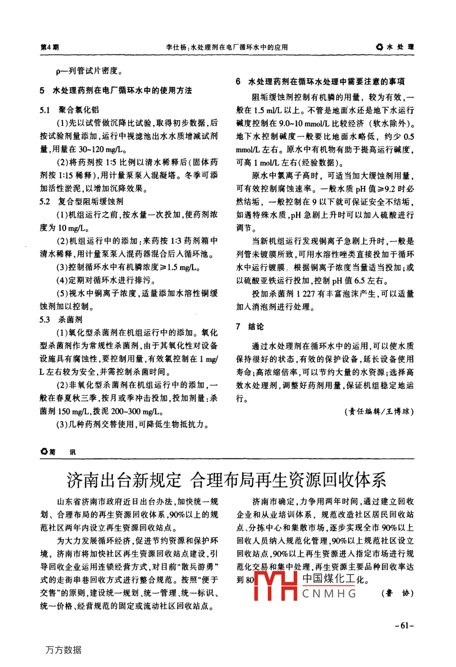 Vol 28. No, 4中國(guó)資源綜合利用2010年4月China Resources Comprehensive Utilization水處理水處理劑在電廠循環(huán)水中的應(yīng)用李仕楊(江蘇中能硅業(yè)科技發(fā)展有限,江蘇徐州221004)擴(kuò)要:當(dāng)今世界節(jié)水已成為最為緊迫的事情之一,選用經(jīng)濟(jì)遁宜的水處理劑,用于水循環(huán)系統(tǒng)是非常重要的。水處理劑的正確選用不僅可以提高水的濃編倍率,達(dá)到節(jié)水的目的,還可以延長(zhǎng)水循環(huán)系統(tǒng)設(shè)備的使用壽命關(guān)鍵詞:水處理劑;應(yīng)用;電廠循環(huán)水中圖分類號(hào):X7035文獻(xiàn)標(biāo)識(shí)碼:A文章編號(hào):1008-9500(2010)04005903The Application of The Water Treatment Agents for TheCirculating Water System in Power PlantLi shiyaJiangsu Zhongneng Polysilicon Tecnnology Development Co, Ltd, Xuzhou 221004, ChinaAbstract: Watet-saving is one of the hot things in today's world. Selecting the economical water treatmentagents for water circulating system is very important. Accurately select the water treatment agents, not onlyincerease the water concentratrated multiple rate, save water, but also prolong the water circulating systemequipments use.Keywords: water treament agents; application; power plant circulating water隨著工業(yè)技術(shù)的迅猛發(fā)展,工業(yè)用水量不斷增氨基三甲叉膦酸、乙二胺四甲叉膦酸、五甲叉膦加,使得水資源越來(lái)越緊缺。我國(guó)是一個(gè)用水大國(guó),HEDP、 PBTCA。聚合物類有:水解聚馬來(lái)酸酐聚丙也是一個(gè)水資源短缺的國(guó)家,合理利用、節(jié)約利用水烯酸、聚磺酸鹽、聚天門冬氨酸等。資源已經(jīng)成為我們不可推卸的責(zé)任。提高水資源的13銅緩蝕劑循環(huán)利用率,是節(jié)水的一個(gè)重要環(huán)節(jié)。對(duì)于一些用水主要有巰基苯三唑,苯并三氮唑,甲基苯并三大戶,尤其像火力發(fā)電廠這樣的用水大戶,選用經(jīng)氮唑等。濟(jì)、適宜的水處理藥劑,用于水循環(huán)系統(tǒng)是非常重要14殺菌劑的。水處理劑的正確選用不僅可以提高水的濃縮倍氧化型的有:氯氣、漂白粉、漂白精、二氯異氰率還可以延長(zhǎng)水循環(huán)系統(tǒng)設(shè)備的使用壽命。脲酸、三氯異氰脲酸、二氧化氯;非氧化型的有:十水處理劑的分類二什十四烷基二甲基芐基氯化銨(1227/427)、異噻唑啉酮等水處理劑主要有以下幾種。1.5預(yù)膜劑11凈水劑主要有:硫酸亞鐵唑類等。無(wú)機(jī)物,如聚合氯化鋁、聚合硫酸鐵、硫酸鋁、硫酸亞鐵聚合氯化鐵;有機(jī)物,聚丙烯酰胺類、甲2循環(huán)水處理藥劑的選擇殼素類。21循環(huán)水的預(yù)處理藥劑12阻垢劑以江、河湖泊水為例,這類水中一般含有較多無(wú)機(jī)物,如三聚磷酸鈉、六偏磷酸鈉、氨基磺的泥沙有機(jī)物舉暴浮物等講入工業(yè)循環(huán)水系統(tǒng)酸;有機(jī)物,如有機(jī)膦類及聚合物類。有機(jī)膦類有:之前中國(guó)煤化工分地區(qū)都采用聚CNMHG收稿日期:201002-14者簡(jiǎn)介:李仕楊(196),男,四川資陽(yáng)人,工程師從事化工生產(chǎn)和技術(shù)管理工作水處中國(guó)資源綜合利用第4期合氯化鋁作為混凝劑,通過(guò)混合沉降,過(guò)濾后達(dá)到將同種單劑,按0.1mgmL劑量配制藥液,用使用水質(zhì)要求出水濁度為3mg/L以下。采用聚合數(shù)只燒杯分別取100mL原水,加入3mL藥液使氯化鋁的優(yōu)點(diǎn)是混凝速度快,沉降效果好,易于制溶液中藥劑濃度近似3mg/mL在水浴鍋上以恒溫取,不腐蝕設(shè)備。60℃進(jìn)行濃縮試驗(yàn)。當(dāng)燒杯中出現(xiàn)垢類時(shí),測(cè)定水22阻垢劑的選擇溶液中鈣離子濃度,水中鈣離子濃度越高藥劑性性阻垢劑的品種很多,如何選擇與組合,是一個(gè)能越好。關(guān)鍵性的問(wèn)題。由于節(jié)水和環(huán)保的需要高效低磷3.32單體的復(fù)配(相容性)成為復(fù)合藥劑選擇的原則。取以上試驗(yàn)中性能最好的單劑,進(jìn)行相互溶根據(jù)單體藥劑的阻垢性能、分散性能易得性、解,要求復(fù)配后的藥劑清澈透明,長(zhǎng)置后無(wú)分層和地區(qū)性使用人員的習(xí)慣性進(jìn)行選擇。常用單體有:沉淀。(1)有機(jī)膦類鹽:氨基三亞甲基膦酸、羥基亞乙根據(jù)單劑的高效性、兼容性、考慮藥劑的經(jīng)濟(jì)基二膦酸、亞乙基二胺四亞甲基膦酸、2-膦酰基丁性、地區(qū)的易得性選擇與優(yōu)化配方。選擇的方法同烷、1,2,4三羧酸、二亞乙基三胺五亞甲基膦酸、六單體的選擇。亞甲基二胺四亞甲基膦酸、2-羥基膦?;宜岬茹~緩蝕劑在復(fù)合型阻垢緩蝕劑中的比例一般有機(jī)膦類不但有很強(qiáng)的阻垢性能,同時(shí)具有一定的為1%-3%,量少起不到緩蝕作用,量多則容易析出。緩蝕性能。(2)聚合物(分散劑):水解聚馬來(lái)酸酐、聚丙烯4復(fù)合型阻垢緩蝕劑在循環(huán)水中的試驗(yàn)酸、聚天門冬氨酸、聚環(huán)氧琥珀酸、丙烯酸-丙烯酸針對(duì)電廠來(lái)水水質(zhì),選用上述最優(yōu)藥劑作為阻甲酯共聚物、丙烯酸-馬來(lái)酸酐共聚物、丙烯酸-依垢緩蝕劑,進(jìn)行模擬循環(huán)試驗(yàn),實(shí)時(shí)采集試驗(yàn)數(shù)據(jù),稀磺酸共聚物等兼具阻垢與分散性能。指導(dǎo)化學(xué)循環(huán)冷卻水經(jīng)濟(jì)穩(wěn)定的運(yùn)行。23緩蝕劑的選擇4.1根據(jù)廠家的要求確定實(shí)驗(yàn)內(nèi)容。目前循環(huán)水中用于銅及其合金換熱器的緩