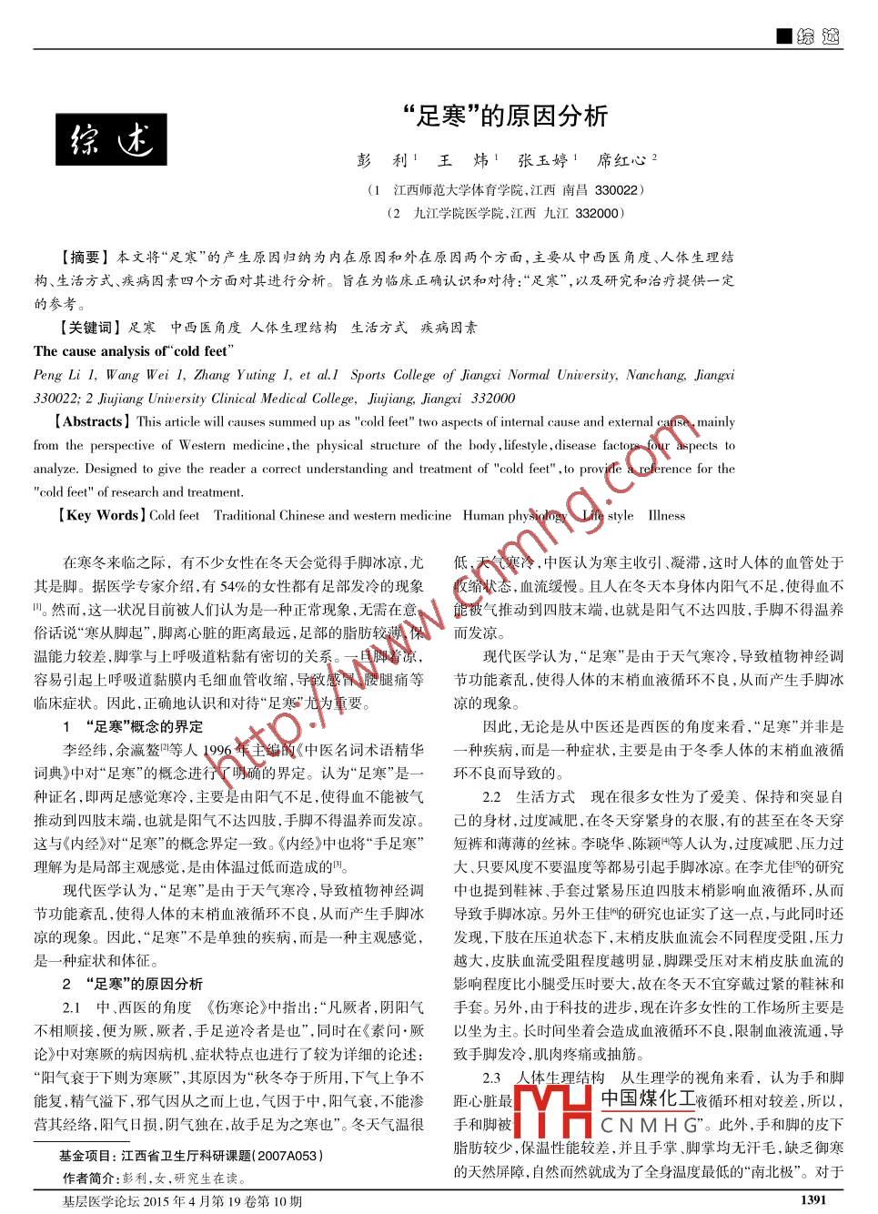 綜述“足寒”的原因分析彭利1王煒1張玉婷1席紅心2(1 江西師范大學體育學院,江西南昌330022 )(2 九江學院醫(yī)學院.江西九江332000)[摘要]本文將“足寒”的產(chǎn)生原因歸納為內(nèi)在原因和外在原因兩個方面,主要從中西醫(yī)角度、人體生理結構、生活方式、疾病因素四個方面對其進行分析。旨在為臨床正確認識和對待:‘‘足寒”,以及研究和治療提供一定的參考。[關鍵詞]足寒中西醫(yī)角度人體生理結構生活方式 疾病因素The cause analysis of"cold feet"Peng Li I, Wang Wei 1, Zhang Yuting I, et al.I Sports College of Jiangxi Normal Uniwerity, Nanchang, Jiangxi330022; 2 Jiujiang Uniwversity Clinical Medical College, Jujiang, Jiangxi 332000[Abstracts ] This article will causes summed up as "cold feet" two aspects of intemal cause and extermal cause , mainlyrom the perspective of W estern medicine , the physical structure of the body , lifestyle , disease factors four aspects toanalyze. Designed to give the reader a correct understanding and treatment of "cold feet" , to provide a reference for the"cold feet" of research and treatment.[Key Words ] Cold feet Traditional Chinese and westerm medicine Human physiology Life style lIness在寒冬來臨之際,有不少女性在冬天會覺得手腳冰涼,尤低,天氣寒冷,中醫(yī)認為寒主收引、凝滯,這時人體的血管處于其是腳。據(jù)醫(yī)學專家介紹,有54%的女性都有足部發(fā)冷的現(xiàn)象收縮狀態(tài),血流緩慢。且人在冬天本身體內(nèi)陽氣不足,使得血不"。然而,這一狀況目前被人們認為是一-種正?,F(xiàn)象,無需在意。能被氣推動到四肢末端,也就是陽氣不達四肢,手腳不得溫養(yǎng)俗話說“寒從腳起”,腳離心臟的距離最遠,足部的脂肪較薄,保而發(fā)涼。溫能力較差,腳掌與上呼吸道粘黏有密切的關系。一旦腳著涼,現(xiàn)代醫(yī)學認為,“足寒”是由于天氣寒冷,導致植物神經(jīng)調(diào)容易引起上呼吸道黏膜內(nèi)毛細血管收縮,導致感冒、腰腿痛等節(jié)功能素亂,使得人體的末梢血液循環(huán)不良,從而產(chǎn)生手腳冰臨床癥狀。因此,正確地認識和對待“足寒"尤為重要。涼的現(xiàn)象。1“足寒” 概念的界定因此,無論是從中醫(yī)還是西醫(yī)的角度來看,“足寒”并非是李經(jīng)緯,余瀛鰲4等人1996年主編的《中醫(yī)名詞術語精華一種疾病,而是一種癥狀,主要是由于冬季人體的末梢血液循詞典》中對“足寒”的概念進行了明確的界定。認為“足寒”是一環(huán)不良而導致的。種證名,即兩足感覺寒冷,主要是由陽氣不足,使得血不能被氣2.2 生活方式現(xiàn)在很多女性為了愛美、保持和突顯自推動到四肢末端,也就是陽氣不達四肢,手腳不得溫養(yǎng)而發(fā)涼。己的身材,過度減肥,在冬天穿緊身的衣服,有的甚至在冬天穿這與《內(nèi)經(jīng)》對“足寒"的概念界定一致。 《內(nèi)經(jīng)》中也將“手足寒”短褲和薄薄的絲襪。李曉華陳穎+等人認為,過度減肥、壓力過理解為是局部主觀感覺,是由體溫過低而造成的明。大、只要風度不要溫度等都易引起手腳冰涼。在李尤佳的研究現(xiàn)代醫(yī)學認為,“足寒”是由于天氣寒冷,導致植物神經(jīng)調(diào)中也提到鞋襪、手套過緊易壓迫四肢末梢影響血液循環(huán),從而節(jié)功能紊亂,使得人體的末梢血液循環(huán)不良,從而產(chǎn)生手腳冰導致手腳冰涼。另外王佳的研究也證實了這- - 點,與此同時還涼的現(xiàn)象。因此,“足寒”不是單獨的疾病,而是--種主觀感覺,發(fā)現(xiàn),下肢在壓迫狀態(tài)下,末梢皮膚血流會不同程度受阻,壓力是一種癥狀和體征。越大,皮膚血流受阻程度越明顯,腳踝受壓對末梢皮膚血流的2“足寒”的原因分析影響程度比小腿受壓時要大,故在冬天不宜穿戴過緊的鞋襪和2.1中 、西醫(yī)的角度《傷寒論》中指出:‘ ‘凡厥者,陰陽氣手套。另外,由于科技的進步,現(xiàn)在許多女性的工作場所主要是不相順接,便為厥,厥者,手足逆冷者是也”,同時在《素問.厥以坐為主。長時間坐著會造成血液循環(huán)不良,限制血液流通,導論》中對寒厥的病因病機癥狀特點也進行了較為詳細的論述:致手腳發(fā)冷,肌肉疼痛或抽筋?!瓣枤馑ビ谙聞t為寒厥”,其原因為“秋冬奪于所用,下氣上爭不2.3人體生理結構 從生 理學的視角來看,認為手和腳能復,精氣溢下,邪氣因從之而上也,氣因于中,陽氣衰,不能滲距心臟最中國煤化工夜循環(huán)相對較差,所以,營其經(jīng)絡,陽氣日損,陰氣獨在,故手足為之寒也”。冬天氣溫很手和腳被YHCNMHG”。此外,手和腳的皮下脂肪較少,保溫性能較差,并且手掌腳掌均無汗毛,缺乏御寒基金項目:江西省衛(wèi)生廳科研課題( 2007A053 )的天然屏障,自然而然就成為了全身溫度最低的“南北極”。對于作者簡介:彭利,女,研究生在讀?;鶎俞t(yī)學論壇2015年4月第19卷第10期1391■綜逝-些血壓偏低的人來說,末梢血液循環(huán)不良的狀況更容易引起參考文獻.手腳部位的血液供應不足,組織不能夠得到足夠的能量,故而川 陳品源手腳發(fā)冷 ,穴位療法很有效[.健康生活2010.181):222產(chǎn)生手腳冰冷的感覺。[2]李經(jīng)緯 ,余瀛鏊,蔡景峰.中醫(yī)名詞術語精華詞典[M].天津:天津科2.4疾病因素程樂品P等 人認為一些其他疾病也會導學技術出版社, 1996:213.致手腳冰涼,如周圍血管疾病(閉塞性動脈硬化.多發(fā)性大動脈3]周國琪, 陳曉.李海峰《內(nèi)經(jīng)》厥證名