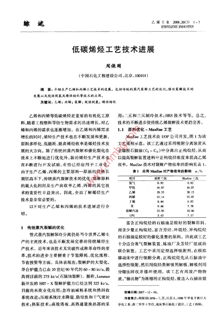 綜述乙烯τ業(yè)2008.20(3) 1~7ETYLENE INDUSTRY低碳烯烴工藝技術(shù)進(jìn)展周保國(中國石化工程建設(shè)公司,北京, 100101)摘要:介紹生產(chǎn)己烯和丙烯工藝技術(shù)的進(jìn)展。包括傳統(tǒng)的蒸汽裂解工藝的優(yōu)化,催化裂解技術(shù)的發(fā)展以及烷烴脫氫及烯烴轉(zhuǎn)化等技術(shù)的應(yīng)用。關(guān)鍵詞:乙烯;丙烯;裂解;烷烴脫氫;烯烴轉(zhuǎn)化乙烯和丙烯等低碳烯烴是重要的有機(jī)化工原用;二元和三元制冷技術(shù);HRS技術(shù)等等??傊?隨著工程塑料等衍生物需求的迅速增長,對乙技 術(shù)的不斷進(jìn)步使傳統(tǒng)乙烯裂解技術(shù)更趨完善。烯和丙烯的需求也逐漸增加。在乙烯和丙烯需求1.1原料優(yōu)化 - MaxEne工藝增長的同時(shí),烯烴生產(chǎn)技術(shù)也在不斷發(fā)展和更新,MaxEne工藝技術(shù)由UOP公司開發(fā),圖1為該原料多樣化、低能耗、提高烯烴收率是烯烴技術(shù)發(fā)工藝流程示意。該工藝通過采用吸附分離裝置從展的大方向。除了傳統(tǒng)的蒸汽裂解和催化裂化在全餾程石腦油(Cs ~ Cn )中分離出正構(gòu)烷烴,從而技術(shù)上不斷地進(jìn)行優(yōu)化外,新的烯烴生產(chǎn)技術(shù)也以提高裂解裝置進(jìn)料中正構(gòu)烷烴濃度來提高乙烯在不斷進(jìn)行開發(fā)試驗(yàn),有些已經(jīng)應(yīng)用于工業(yè)化。收率。 MaxEne 技術(shù)對裂解產(chǎn)物收率的影響見表1。由于生產(chǎn)乙烯、丙烯的主要原料-原油的價(jià)格長表1應(yīng)用MaxEne對產(chǎn)物收率的影響1o,%期居高不下,傳統(tǒng)蒸汽裂解技術(shù)的優(yōu)化、裂解原料項(xiàng)H基難工況MaxEine. .配氫氣0.92的最大化利用及生產(chǎn)高收率乙烯、丙烯的其它技甲大16.07術(shù)的重要性日益突出。因此,全面了解烯烴生產(chǎn)乙烯28.5538.15丙烯15.1415.03技術(shù)是非常必要的。丁烯8.446.82以下對生產(chǎn)乙烯和丙烯的技術(shù)進(jìn)展進(jìn)行介苯9.485.78裂解汽油15.9110.06紹。LPG5.437.17富含正構(gòu)烷烴的石腦油是較好的裂解原料,1傳統(tǒng)蒸汽裂解的優(yōu)化而含少量正構(gòu)烷烴,富含芳烴、環(huán)烷烴、異構(gòu)烷烴管式蒸汽裂解深冷分離仍是當(dāng)今世界乙烯生的石腦油是較好的催化重整的原料。因此該工藝產(chǎn)的主流技術(shù),也是不斷發(fā)展完善的傳統(tǒng)烯烴生十分適合燕氣裂解裝置、煉油廠及芳烴廠組成的產(chǎn)技術(shù)。近年來該技術(shù)無突破性或稱革命性的變聯(lián)合裝置。工藝中采用定型選擇吸附劑,在模擬革,技術(shù)的進(jìn)步主要側(cè)重于節(jié)能降耗、優(yōu)化流程、移動床中,進(jìn)行吸附分離,正構(gòu)烷烴先從石腦油中節(jié)省投資等方面。具體表現(xiàn)在:裂解爐的大型化,選擇性吸附,然后用烷烴類解吸劑解吸,解吸劑用單臺爐能力已由20世紀(jì)90年代的60- 80k/a,提分餾法回收并 循環(huán)使用。該工藝有兩股產(chǎn)物物高到目前的275 kU/a(石腦油裂解)。據(jù)稱, Lummus流,“抽出物”為濃縮的正構(gòu)烷烴,被送人石腦油裂新開發(fā)的SRT- X裂解爐能力已經(jīng)達(dá)到325 kV/a,目前尚未商業(yè)化應(yīng)用;急冷油臧粘系統(tǒng)和熱回收收稿日期:2007-12- 10。系統(tǒng)改進(jìn);壓縮系統(tǒng)注水降溫、防結(jié)焦和干氣密封作者簡介:周保國(1976- ),男,江蘇人, 1998爾畢業(yè)于浙江大技術(shù);熱泵技術(shù);高效塔板、高熱通量換熱器的采學(xué)化工系,獲「.學(xué)學(xué)1:學(xué)位.現(xiàn)從中石油化工設(shè)計(jì), C藝I程師。乙烯工業(yè)第20卷解裝置中:“抽余物”為芳烴.環(huán)烷烴、異構(gòu)烷烴組許可,可處理C4~ Ce的輕烴原料。當(dāng)該工藝與乙.分,被送入重整裝置。烯裝置聯(lián)合時(shí),所用原料即為乙烯裝置中經(jīng)過選擇加氫將炔烴和二烯烴轉(zhuǎn)化為烯烴的裂解C4和上乙烯裝置Cs。其他可能的原料是甲基叔丁基醚( MTBE)抽余抽出液塔油芳烴裝置抽余油、來自煉油廠FCC裝置、焦化、| 吸附室旋轉(zhuǎn)閥抽出液延遲焦化裝置的物料。該項(xiàng)技術(shù)主要特點(diǎn)是用低解吸劑價(jià)值的輕烴類原料,生產(chǎn)價(jià)值高的輕質(zhì)烯烴,產(chǎn)品抽余液去重幣裝霞收率高,產(chǎn)品以丙烯、乙烯為主,集中度高。表2為采用SuperFlex技術(shù)后4種原料的裂解收率[1]。表2 4 種原料經(jīng)SuperPex的產(chǎn)品收率w,%抽余循環(huán)泵.液塔| 解吸劑項(xiàng)目熱裂解G熱裂解Cs FOC輕石腦油焦化輕石腦油|提純塔進(jìn)料o燃料氣7.212.013.611.6了乙烯22.52.120.019.8丙烯48.243.840.138.7丙烷5.36.56.67.0圖1 MaxEme 流程示意商產(chǎn)烷值汽油16.815.619.722.91.2丙烯/乙烯比 的調(diào)整雙烯收率70.765.958.50.1在蒸汽裂解制乙烯過程中,不同原料和操作該技術(shù)采用與傳統(tǒng)催化裂化類似的生產(chǎn)工藝條件下的丙烯收率不盡相同。通常原料的丙烯產(chǎn)流程 和設(shè)備生產(chǎn).包括提升管式反應(yīng)器再生器、空率隨原料相對分子質(zhì)量的增大而增大。以石腦氣壓縮機(jī) 和催化劑處理、燃料氣系統(tǒng)和進(jìn)料/產(chǎn)品油、粗柴油和丙烷為原料生產(chǎn)乙烯,每產(chǎn)1 t乙烯,熱交換系統(tǒng)。催化劑可連續(xù)再生,對原料中的雜副產(chǎn)0.4~0.6 t丙烯;以乙烷為原料,生產(chǎn)1 t乙質(zhì)(如硫、水、氧化物和氮)不敏感,原料毋須預(yù)處烯,僅副產(chǎn)0.04 ~ 0.06 t丙