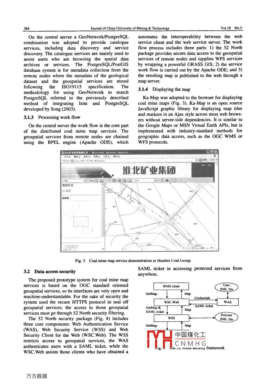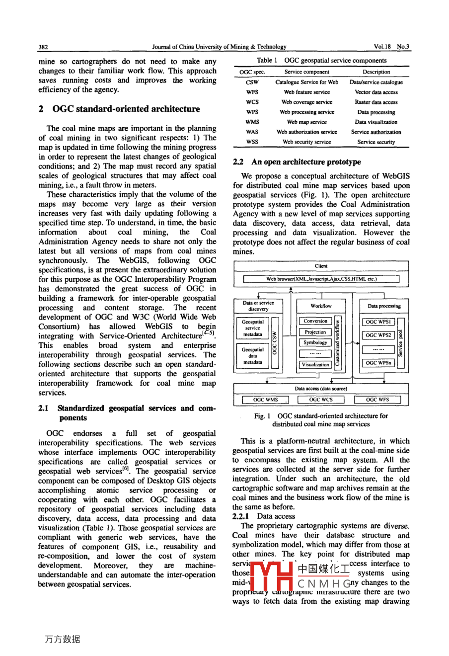 Availableonlineatwww.sciencedirect.comOURNAL OF CHINA UNIVERSTY OF氵. ScienceDirectMININGTECHNOLOGYEVERJ China Univ Mining Technol 18(2008)0381-038ww.elsevier. com/locate/jcumtAn oGC standard-oriented architecture fordistributed coal mine map servicesSONG Xian-feng, RUI Xiao-ping, HOU Wei, TAN Hai-qiaoGraduate University of Chinese Academy of Sciences, Beijing 100The Academy of Opto-electronics, Chinese Academy of Sciences, Beijing 100086, China3school of Resources and Geoscience, China University of Mining& Technology, Xuzhou, Jiangsu 221008, ChinaAbstract: GIS or CAD-based technology has been widely used for cartographic maps in coal mines, but structural gaps betweensuch maps make it difficult to provide an integrated map service, for any specific purpose, at higher levels. There is no uniformplatform that can be used to manage all involved maps. The main reason for this is that datasets are submitted by individual coalnes using their individual, diverse software. No consistent model is used within the software for data abstraction andsymbolization. This paper first reviews all the essential specifications concerning OGC(Open Geospatial Consortiumteroperability. Then an OGC standard-oriented architecture is proposed to provide distributed coal mine map services. within thisnew architecture the management of spatial data archives, and the integration of coal mine maps, are achieved through theinterfaces of geospatial services. Finally an open source geospatial approach is suggested to implement the proposed scheme. Acase study of the Huaibei Coal Group is used to demonstrate the proposalKey words: coal mine map services; service oriented architecture: OGC interoperability specifications; open source geospatialsolution1 Introductionniently managed and it is difficult to integrate themfor any specific purpose by using traditionalThe coal mine map provides basic information methods". The data abstraction model and dataabout coal mines and represents the comprehensive storage format used for the various digital coal minecompilation of a geospatial dataset. It shows not only map products are quite different. One relies on athe nature of physical surfaces, but also the CAD system while the other on a Gis system. It ischaracteristics of underlying rocks, faults, human- unfeasible to merge the spatial data from one systemmade subsurface constructions and coal mining into the other system through the traditionalprogress. To some extent, coal mine maps are the import/export methodology. There aremost complex and vital map productsstudies where web services are employed to extendThere are several kinds of proprietary cartographic proprietary systems over the web; Subsequently thesoftware that presently dominate the coal mine work flow engine chains those services for a specificmarket in China. It is common for coal mines to use applicationeven when the mines are under the same Coal architecture to poses a geospatial service orienteddifferent softwares for the same cartographic purposeAdministration Agency. Consequently, the digital heterogeneous data structures. The architecture wasmap products among coal mines are incompatible designed following interoperability specifications ofwith each other. The coal mine maps are normally the Open Geospatial Consortium (OGC) and wassubmitted periodically via FTP, or some other method, implemented using an open source geospatialand the agency must have licenses for all the different solution in which the software adopted was mainlycartographic software to view those heterogeneous incubated by the Open Source Geospatial Foundation(OSGeo). The prototype system reuses the existingMoreover those map archives are not conve-中國煤化工 hives at each coalReceived 12 December 2007: accepted 20 March 2008CNMHGProject 40771167 supported by the National Natural Science Foundation of ChinaCorrespondingauthorTel+86-516-83883893;E-mailaddresstan3893@163.comJournal of China University of Mining TechnologyVol 18 No.3mine so cartographers do not need to make anyTable I OGC geospatial service componentschanges to their familiar work flow. This approachaves running costs and improves the workingatalogue Service for Webata/service catalogueefficiency of the agencyWeb feature serviceWeb coverage serviceRaster data access2 OGC standard-oriented architectureWeb map serviceThe coal mine maps are important in the planningWeb authorization serviceof coal mining in two significant respects: 1)TheWeb security serviceService securitymap is updated in time following the mining progressin order to represent the latest changes of geologica 2.2 An open architecture prototypeconditions; and 2)The map must record any spatialscales of geological structures that may affect coalWe propose a conceptual architecture of WebGISmining, i.e., a fault throw in metersfor distributed coal mine map services based uponThese characteristics imply that the volume of the geospatial services(Fig. 1). The open architectureaps may become very large as their version prototype system provides the Coal Administrationncreases very fast with daily updating following a Agency with a new level of map services supportingspecified time step. To understand, in time, the basic data discovery, data access, data retrieval, datainformation about coal mining, the Coal processing and data visualization. However theAdministration Agency needs to share not only the prototype does not affect the regular business of coallatest but all versions of maps from coal mines minessynchronously. The WebGIS, following OGCspecifications, is at present the extraordinary solutionfor this purpose as the oGC Interoperability ProgramWeb browser(XML,JavascripT.Ajax.CSS.HTML ete.)has demonstrated the great success of OGC inbuilding a framework for inter-operable geospatialprocessing and content storage. The recentWorkflowdevelopment of OGC and w3C (World wide WebConversionConsortium) has allowed WebGis to beginintegrating with Service-Oriented 