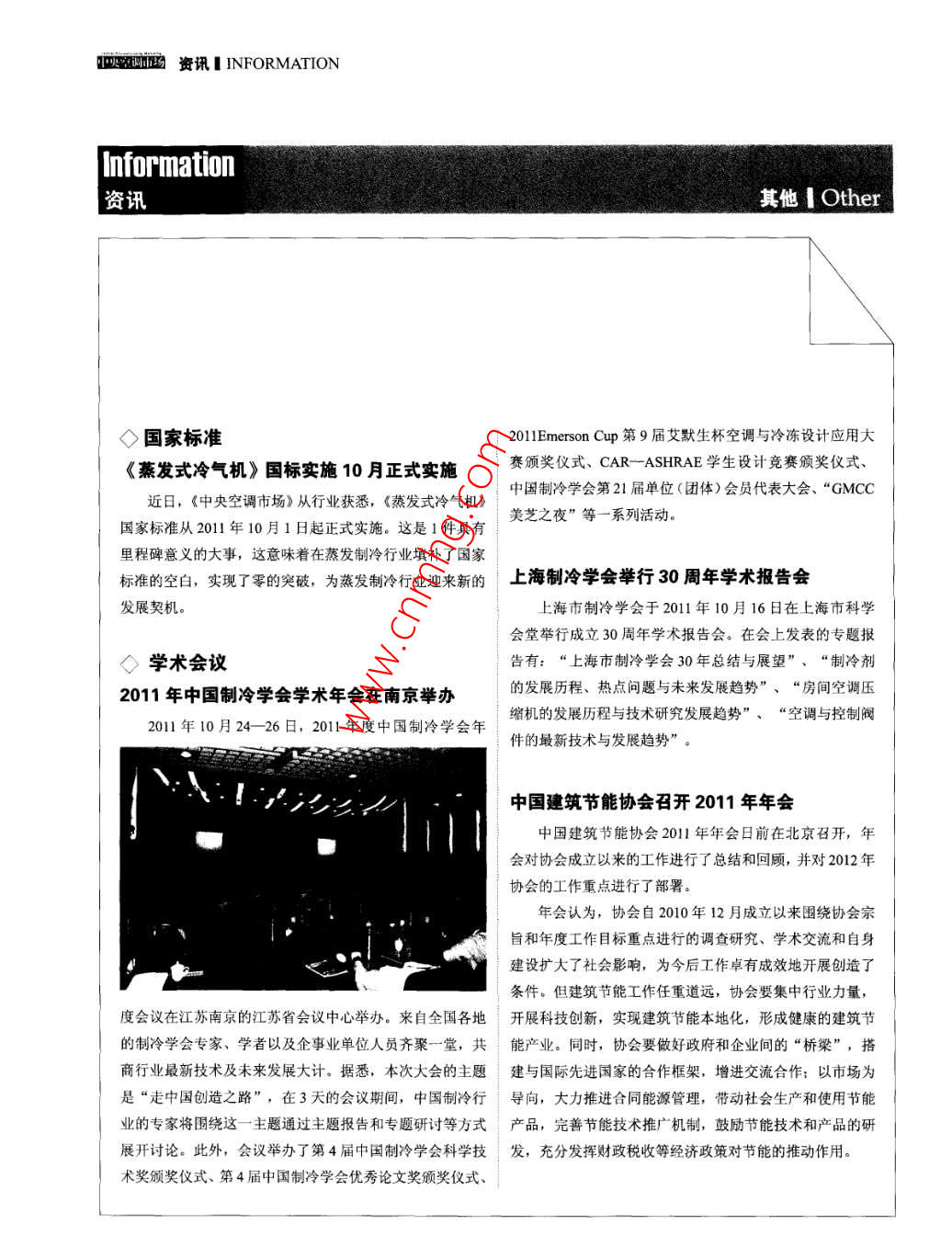 可唄資訊 INFORMATIONInformation資訊其他 I Other◇國(guó)家標(biāo)準(zhǔn)20l! Emerson cψp第9屆艾默生杯空調(diào)與冷凍設(shè)計(jì)應(yīng)用大《蒸發(fā)式冷氣機(jī)》國(guó)標(biāo)實(shí)施10月正式實(shí)施賽頒獎(jiǎng)儀式、CAR一 ASHRAE學(xué)生設(shè)計(jì)競(jìng)賽頒獎(jiǎng)儀式、近日,《中央空調(diào)市場(chǎng)》從行業(yè)獲悉,《蒸發(fā)式冷氣機(jī)》中國(guó)制冷學(xué)會(huì)第21屆單位(團(tuán)體)會(huì)員代表大會(huì)、“GMCC美芝之夜”等一系列活動(dòng)國(guó)家標(biāo)準(zhǔn)從2011年10月1日起正式實(shí)施。這是1件具有里程碑意義的大事,這意味著在蒸發(fā)制冷行業(yè)填補(bǔ)了國(guó)家標(biāo)準(zhǔn)的空白,實(shí)現(xiàn)了零的突破,為蒸發(fā)制冷行業(yè)迎來(lái)新的上海制冷學(xué)會(huì)舉行30周年學(xué)術(shù)報(bào)告會(huì)發(fā)展契機(jī)。上海市制冷學(xué)會(huì)于2011年10月16日在上海市科學(xué)會(huì)堂舉行成立30周年學(xué)術(shù)報(bào)告會(huì)。在會(huì)上發(fā)表的專(zhuān)題報(bào)學(xué)術(shù)會(huì)議告有:“上海市制冷學(xué)會(huì)30年總結(jié)與展望”、“制冷劑2011年中國(guó)制冷學(xué)會(huì)學(xué)術(shù)年會(huì)在南京舉辦的發(fā)展歷程、熱點(diǎn)問(wèn)題與未來(lái)發(fā)展趨勢(shì)”、“房間空調(diào)壓縮機(jī)的發(fā)展歷程與技術(shù)研究發(fā)展趨勢(shì)”、“空調(diào)與控制閥2011年10月2426日,2011年度中國(guó)制冷學(xué)會(huì)年件的最新技術(shù)與發(fā)展趨勢(shì)”。中國(guó)建筑節(jié)能協(xié)會(huì)召開(kāi)2011年年會(huì)中國(guó)建筑節(jié)能協(xié)會(huì)201年年會(huì)日前在北京召開(kāi),年會(huì)對(duì)協(xié)會(huì)成立以來(lái)的工作進(jìn)行了總結(jié)和回顧,并對(duì)2012年會(huì)的工作重點(diǎn)進(jìn)行了部署年會(huì)認(rèn)為,協(xié)會(huì)自2010年12月成立以來(lái)圍繞協(xié)會(huì)宗旨和年度工作目標(biāo)重點(diǎn)進(jìn)行的調(diào)查研究、學(xué)術(shù)交流和自身建設(shè)擴(kuò)大了社會(huì)影響,為今后工作卓有成效地開(kāi)展創(chuàng)造了條件。但建筑節(jié)能工作任重道遠(yuǎn),協(xié)會(huì)要集中行業(yè)力量,度會(huì)議在江蘇南京的江蘇省會(huì)議中心舉辦。來(lái)自全國(guó)各地開(kāi)展科技創(chuàng)新,實(shí)現(xiàn)建筑節(jié)能本地化,形成健康的建筑節(jié)的制冷學(xué)會(huì)專(zhuān)家、學(xué)者以及企事業(yè)單位人員齊聚一堂,共能產(chǎn)業(yè)。同時(shí),協(xié)會(huì)要做好政府和企業(yè)間的“橋梁”,搭商行業(yè)最新技術(shù)及未來(lái)發(fā)展大計(jì)。據(jù)悉,本次大會(huì)的主題建與國(guó)際先進(jìn)國(guó)家的合作框架,增進(jìn)交流合作;以市場(chǎng)為是“走中國(guó)創(chuàng)造之路”,在3天的會(huì)議期間,中國(guó)制冷行導(dǎo)向,大力推進(jìn)合同能源管理,帶動(dòng)社會(huì)生產(chǎn)和使用節(jié)能業(yè)的專(zhuān)家將圍繞這一主題通過(guò)主題報(bào)告和專(zhuān)題研討等方式產(chǎn)品,完善節(jié)能技術(shù)推廣機(jī)制,鼓勵(lì)節(jié)能技術(shù)和產(chǎn)品的研展開(kāi)討論。此外,會(huì)議舉辦了第4屆中國(guó)制冷學(xué)會(huì)科學(xué)技發(fā),充分發(fā)揮財(cái)政稅收等經(jīng)濟(jì)政策對(duì)節(jié)能的推動(dòng)作用術(shù)獎(jiǎng)?lì)C獎(jiǎng)儀式、第4屆中國(guó)制冷學(xué)會(huì)優(yōu)秀論文獎(jiǎng)?lì)C獎(jiǎng)儀式、