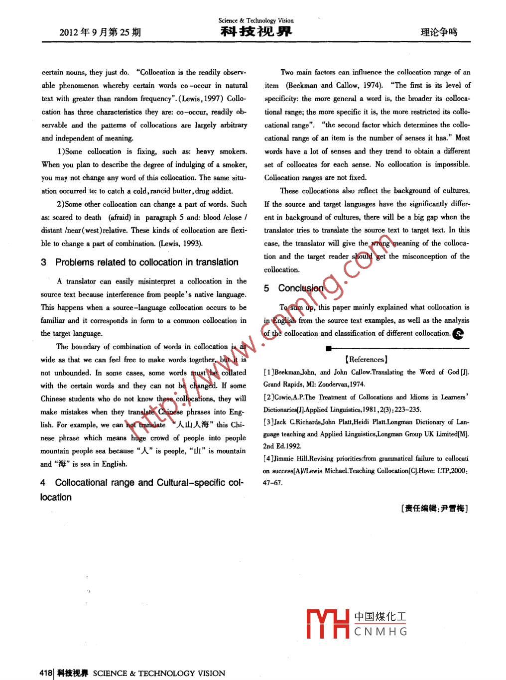 Science & Technology Vision理論爭鳴科技視界2012年9月第25期The Analysis of Collocation袁向?qū)?山東建筑大學(xué)山東濟(jì)南250101)[AbstractlCollocation, as an important category of lexical patteming in language learning, can objectively ellet people' s com-petence of writin, organizing and expressing in English. This paper will mainly focus on what is cllocaion in English, as well as theanalysis of the collocation from the source text. Then the paper will classify the different kinds of collocation according to the differentlimits or characteristic of these collocation occurred in the source text.[Key wordslCollocation;Grammatical combinaions ;ollocational range;Culural- speeific cllocations.1 What is collocation?A heavy rainfall (this“heavy" means Large in yield or out-put).Many years ago, J.R Fith defines cllocation as the com-Secondly, the reason why we use "heavy smoker" whereaspany words keep’-their relationships with other words. Another“big”or“massive” collocates with“smoker" that is becausedefinition might be the way words combine in predictable ways.meaning cannot always account for collocational pattemning.When we think of the number of words in English, the number(Baker, 2000)collocation in terms of the tendency of certainof potential combinations runs into many millions.Each word has its own meaning which is not only definedwords to co-oceur regularly in a given language.From the above example, we may notice that the colloca-in dictionary but also the meaning in a phrase. We need knowtion is a group of words combined for the common usage. Theboth meanings of a word.meaning of the individual word may usually be understood byWe know many expressions of the words which are heardpeople. There is a boundary of the change which we can make afrequently in our daily life. So we just keep them in mind ascombination of words. Sometimes the boundary may be very“one word". For example,“Crystal clear',and also some“com-strict such as“heavy smokers", but in some cases the words arepound noun", like“riding boots" or“motor cyclist". These ex-more freedom to be chosen which we can make them together.pressions that are one kind of collocated pairs of words are usedeveryday by us which have already been fixed like“one word".2 Collocation classificationIn language teaching, collocation is a very interesting area,2.1 Less fixed combinationsbecause they can be found in many parts of the language study-These are very common in English. In such cases, we haveing, such as in a syntactic relation, lexical relation, or they canmore freedom to make combinations, but there are certain re-be in no linguistically defined relation. Knowing collocationsstrictions on what is possible or probable. We use differentwell is a key point to use well of a language. Sometimes, we canmeaning of“make" to describe the condition. We make morenot just judge a sentence only though whether its grammar ismoney paragraph 5 (To gain or eam, as by working)/ make vers-right or not.es (To compose)/ make a telephone call (To carry out; Perform):“Heary smokers": it is definitely a standard collocation.make laws (To institute or establish; Enact)/ made a field goal.We may analyze it from two aspects. Firstly, the word“heavy"(To score or achieve, as in a spor)/ make believe (to pretend),.has a diferent meaning in each of the fllwing situations. SuchSo we can see that there are many approaches of combin-asing make with nouns. There are some limits to a series of collo-A heavy drinker (this “heavy" means indulging to a greatcations they have and thev mav not often use the same collo-degree in drink).cates.中國煤化工Heavy bread (this “heavy" means insuficiently leavened).2.2 Other cHCNMHGnsA heavy going or a heavy reading (this“"heary" means HardThere are no clear rules for why certain adjective go withto do or accomplish; Arduous).SCIENCE & TECHNOLOGY VISION科技視界|417Science & Technology Vision2012年9月第25期科技視界理論爭鳴certain nouns, they just do.“Collocation is the readily observ-Two main factors can influence the collocation range of anable phenomenon whereby certain words co -occur in natural.item (Beekman and Callow, 1974). “The first is its level oftext with greater than random frequency". (Lewis , 1997) Collo-specificit: the more general a word is, the broader its colloca-cation has three characteristics they are: co-occuI, readily ob-tional range; the more specific it is, the more restricted its collo-servable and the pattems of collocations are largely arbitrarycational range".“the second factor which determines the collo-and independent of meaning.cational range of an item is the number of senses it has." Most1)Some collocation is fixing, such as: heavy smokers.words have a lot of senses and they trend to obtain a differentWhen you plan to describe the degree of indulging of a smoker,set of collocates for each sense. No collocation is impossible.you may not change any word of this collocation. The same situ-Collocation ranges are not fixed.ation occurred to: to catch a cold ,rancid butter , dnug addict.These collocations also rellect the background of cultures.2)Some other collocation can change a part of words. SuchIf the source and target languages have the significantly differ-as: scared to death (afraid) in paragraph 5 and: blood /close 1ent in background of cultures, there will be a big gap when thedistant /near( west)relative. These kinds of collocation are flexi-translator tries to translate the source text to target text. In thisble to change a part of combination. (Lewis, 1993).case, the translator will give the wrong meaning of the colloca-tion and the target reader should get the misconception of the3 Problems related to collocation in translationcollocation.A translator can easily misinterpret a collocation in the5 Conclusionsource text because interference from people' s native language.This happens when a source -