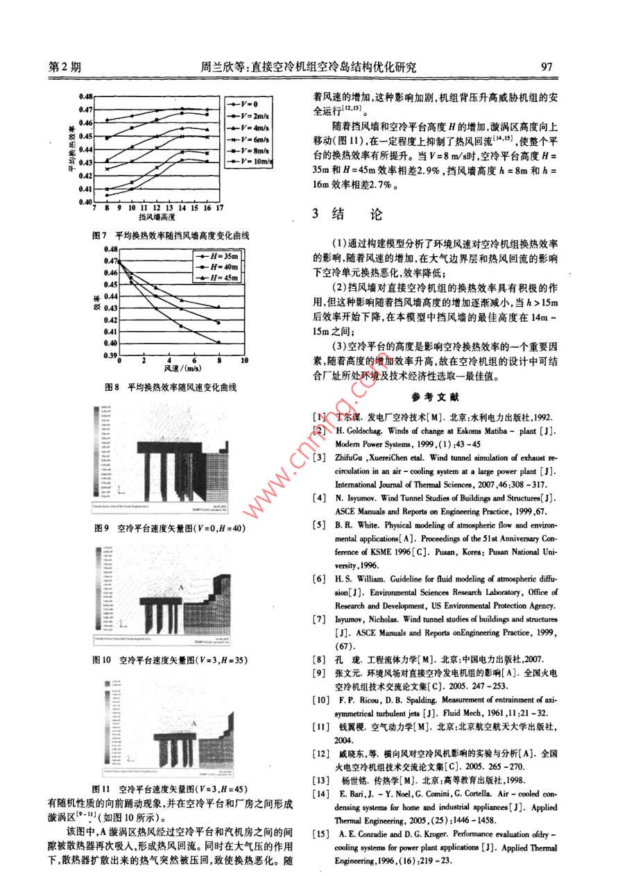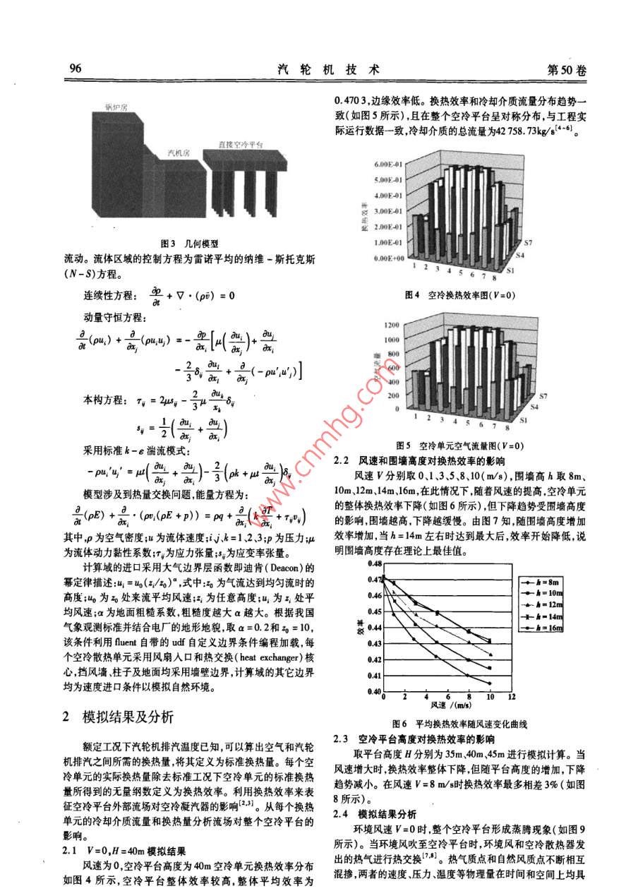 第50卷第2期汽輪機技術(shù)2008年4月TURBINE TECHNOLOGYApr.2008直接空冷機組空冷島結(jié)構(gòu)優(yōu)化研究周蘭欣,白中華,李衛(wèi)華華北電力大學(xué)電站設(shè)備狀態(tài)檢測與控制教育部重點實驗宣,保定071003摘要:采用 SIMPLE算法和k-e模型,以我國某600MW直接空冷電廠為例對其空冷平臺外部流場進(jìn)行數(shù)值模擬分析不同風(fēng)速時擋風(fēng)圍墻高度和空冷平臺高度對空冷凝汽器換熱效率的影響得出最佳圍墻高度范圍對直接空冷電廠的設(shè)計和穩(wěn)定經(jīng)濟(jì)運行具有一定的參考價值關(guān)鍵詞:直接空冷;數(shù)值模擬;擋風(fēng)墻;空冷平臺;換熱效率分類號:TK2641文獻(xiàn)標(biāo)識碼:A文章編號:10015884(2008)02009503Optimization Study on Structure of Air Cooling Platform of Direct Air Cooling UnitsZHOU Lan-xin, BAI Zhong-hua, LI Wei-huaKey Lof Ministry of Education of Condition Monitoring and Control for Power PlantEquipment, North China Electric Power University, Baoding 071003, China)Abstract: With SIMPLE algorithm and k-e model, take one 600Mw direct air-cooled unit in our country as an example,proceeding numerical simulation of exterior flow field of its'air cooling platform. Analysing the effect of different wind velocity, height of windbreak and aircooling platform on heat exchange efficiency of direct air cooled condenser, obtaining optimizate height of wind break. The essay has direct significance for designing and the steady and economic running of direct airKey words: direct air cooling; numerical simulation; windbreak; aircooling platform; efficiency of heat exchange0前言1模型的建立直接空冷是指汽輪機排汽經(jīng)管道送到空冷凝汽器的翅1.1幾何模型及網(wǎng)格劃分片管束中凝結(jié)其冷卻介質(zhì)是在翅片管外流動的空氣排汽空冷散熱單元物理模型如圖2所示,模型的計算域為的凝結(jié)水由凝結(jié)水泵送至回?zé)嵯到y(tǒng),并經(jīng)汽輪機抽汽加熱后600×800x600(m)的長方體。其中,空冷平臺為70×80作為鍋爐給水循環(huán)使用如圖1所示??绽淠鞯膿Q熱效(m),空冷平臺高度H取35m,40m,45m,擋風(fēng)墻高h(yuǎn)分別取率是影響空冷機組效率的主要因素,該設(shè)備布置于自然風(fēng)場8m、10m、12m、14m、16m,鍋爐房高為90m,汽機房高為40m中因此直接受環(huán)境參數(shù)的影響。自然風(fēng)的風(fēng)速風(fēng)向以及網(wǎng)格采用 cooper結(jié)構(gòu)化網(wǎng)格進(jìn)行劃分,由于計算域很大,采冷平臺的結(jié)構(gòu)對于空冷機組的正常穩(wěn)定運行起著決定性用分塊劃分法在滿足網(wǎng)格質(zhì)量( Equisite Skew<0.4)的前作用①。提下減少了網(wǎng)格數(shù)量(259860),幾何模型如圖3所示。因為直接空冷機組空冷島所處的地理位置及自然環(huán)境是一定的所以對空冷島的擋風(fēng)墻和空冷島的高度進(jìn)行結(jié)構(gòu)優(yōu)化,提高空冷單元的換熱效率和凝汽器真空度,對機組的流出口設(shè)計制造和安裝具有重要意義。甸流動冷知管束圖2空冷散熱單元示意圖1.2數(shù)值模型及邊界設(shè)定圖1直接空冷機組原則性汽水系直接空冷平臺周圍的大氣運動被認(rèn)為是不可壓縮定常收稿日期:20070725作者簡介:周蘭欣(1956-),男教授,主要從事空冷機組節(jié)能研究。汽輪機技術(shù)第50卷0.4703,邊緣效率低。換熱效率和冷卻介質(zhì)流量分布趨勢一致(如圖5所示),且在整個空冷平臺呈對稱分布與工程實際運行數(shù)據(jù)一致冷卻介質(zhì)的總流量為4275873kg/s*-6。汽機房5,0F41400E-12/E-01圖3幾何模型OE-01流動。流體區(qū)域的控制方程為雷諾平均的納維-斯托克斯0.00E+00(N-S)方程。連續(xù)性方程:中+V·(p)=0圖4空冷換熱效率圖(V=0)動量守恒方程(pu)+(p,)=e[幽)800本構(gòu)方程:,=2m,-3xm采用標(biāo)準(zhǔn)k-e湍流模式:圖5空冷單元空氣流量圖(V=0)2.2風(fēng)速和圍墻高度對換熱效率的影響y叫+幽)3(噸+u月風(fēng)速V分別取0、13、5、8、10(m/8),圍墻高h(yuǎn)取8m、模型涉及到熱量交換問題能量方程為:10m、12m、14m、16m,在此情況下,隨著風(fēng)速的提高空冷單元aB)+…、m(pE+p)=+面(x+;)的整體換熱效率下降(如圖6所示),但下降趨勢受圍墻高度的影響,圍墻越高,下降越緩慢。由圖7知,隨圍墻高度增加其中p為空氣密度;為流體速度;過、k=1、2、3;P為壓力效率增加,當(dāng)h=14m左右時達(dá)到最大后效率開始降低說為流體動力黏性系數(shù);r為應(yīng)力張量;為應(yīng)變率張量。明圍墻高度存在理論上最佳值。計算域的進(jìn)口采用大氣邊界層函數(shù)即迪肯( Deacon)的冪定律描述:=(x/)°式中:為氣流達(dá)到均勻流時的高廈;為動處來流平均風(fēng)速;為任意高度;為處平均風(fēng)速;aα為地面粗糙系數(shù),粗糙度越大a越大。根據(jù)我國氣象觀測標(biāo)準(zhǔn)并結(jié)合電廠的地形地貌取a=0.2和=10,該條件利用uen自帶的udf自定義邊界條件編程加載,每個空冷散熱單元采用風(fēng)扇入口和熱交換( heat exchanger)核心,擋風(fēng)墻、柱子及地面均采用墻壁邊界,計算域的其它邊界均為速度進(jìn)口條件以模擬自然環(huán)境2模擬結(jié)果及分析圖6平均換熱效率隨風(fēng)速變化曲線額定工況下汽輪機排汽溫度已知,可以算出空氣和汽輪2.3空冷平臺高度對換熱效率的影響機排汽之間所需的換熱量將其定義為標(biāo)準(zhǔn)換熱量。每個空取平臺高度H分別為35m、40m、45m進(jìn)行模擬計算。冷單元的實際換熱量除去標(biāo)準(zhǔn)工況下空冷單元的標(biāo)準(zh