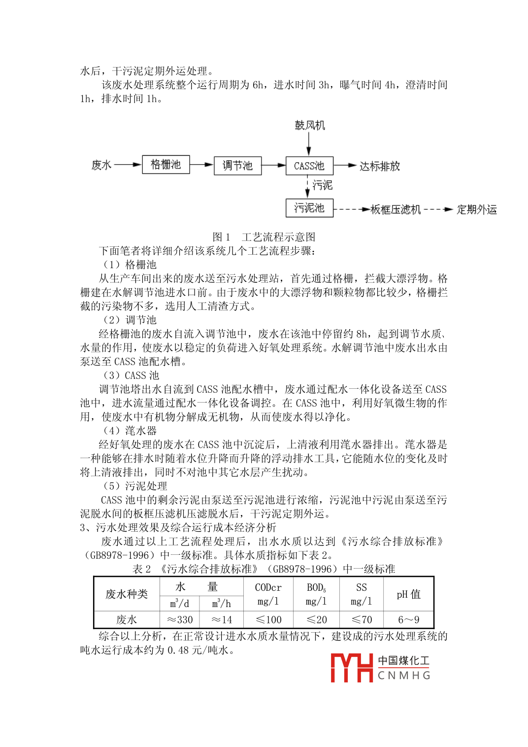 CASS工藝在污水處理中的應(yīng)用南寧六和環(huán)保有限責(zé)任公司廣西530000摘要: CASS 工藝最早是于1968年由澳大利亞開發(fā)的一種間歇運(yùn)行的循環(huán)式活性污泥法,是SBR工藝的一種變型,在上世紀(jì)八十年代計(jì)算機(jī)技術(shù)發(fā)展的支持下,使該工藝進(jìn)一步得到發(fā)展和推廣,成為現(xiàn)階段計(jì)算機(jī)控制系統(tǒng)非常先進(jìn)的生物脫氨氮除磷工藝。CASS 工藝以其獨(dú)特的優(yōu)勢(shì)在生產(chǎn)生活中得到了廣泛的應(yīng)用。本文中筆者結(jié)合某制糖廠污水處理廠中應(yīng)用CASS工藝的實(shí)例,深入探討了CASS工藝在污水處理中的應(yīng)用,以期為廣大同行提供-些借鑒和參考。關(guān)鍵詞: CASS 工藝、污水處理、應(yīng)用中圖分類號(hào): U664.9+2 文獻(xiàn)標(biāo)識(shí)碼: A文章編號(hào):一、前言當(dāng)前,我國(guó)正處于工業(yè)化快速發(fā)展階段,一些企業(yè)在發(fā)展過(guò)程中,不可避免的會(huì)排放污水,造成環(huán)境的污染。如何使得這類企業(yè)既能快速發(fā)展而又不破壞環(huán)境走可持續(xù)發(fā)展道路,高效節(jié)能的污水處理技術(shù)與工藝就顯得尤為重要了。二、CASS 工藝概述CASS工藝最早是于1968年由澳大利亞開發(fā)的一-種間歇運(yùn)行的循環(huán)式活性污泥法,是SBR工藝的一-種變型。1976年建成了世界上第一座CASS工藝的污水處理廠,隨后在日本、加拿大、美國(guó)和澳大利亞等得到了廣泛推廣應(yīng)用。目前,在全世界已建成投產(chǎn)了300座CASS工藝污水處理廠。1986 年,美國(guó)環(huán)保局正式將該工藝列為革新技術(shù)。1988 年,在計(jì)算機(jī)技術(shù)的支持下,使該工藝進(jìn)-一步得到發(fā)展和推廣,成為目前計(jì)算機(jī)控制系統(tǒng)非常先進(jìn)的生物脫氮除磷工藝。循環(huán)活性污泥法(CASS) 是SBR法的一種改進(jìn) 型。它的實(shí)質(zhì)是將可變?nèi)莘e的活性污泥工藝過(guò)程與生物選擇器原理有機(jī)結(jié)合的SBR工藝。每個(gè)CASS反應(yīng)器由三個(gè)區(qū)域組成,即生物選擇區(qū)、厭氧區(qū)和主反應(yīng)區(qū),受篇幅限制,不再一一贅述。CASS池是-一個(gè)間歇反應(yīng)器,在此反應(yīng)器內(nèi)不斷重復(fù)地進(jìn)行曝氣與非曝氣過(guò)程。污水按一定周期和階段得到處理,每- -循環(huán)有下列各個(gè)階段組成:進(jìn)水/曝氣階段一完成生物降解過(guò)程; 停止曝氣/沉淀階段一實(shí)現(xiàn)泥水分離; 潷水/排泥階段一排出 上清液;閑置階段一恢 復(fù)污泥活性。從進(jìn)水到出水結(jié)束作為一個(gè)周期,每一過(guò)程均按所需的設(shè)定時(shí)間進(jìn)行切換操作,其每一個(gè)周期的循環(huán)操作過(guò)程如下:第一步,進(jìn)水/曝氣:在曝氣時(shí)同時(shí)充水,進(jìn)水/曝氣時(shí)間一般占每一 循環(huán)周期的50%,如要用4小時(shí)循環(huán)周期,則進(jìn)水/曝氣為2小時(shí)。第二步,沉淀:停止進(jìn)水和曝氣,沉淀時(shí)間一般采用1小時(shí),形成凝絮層,上層為清液。高水位約為3. 0-4. 0g/l,沉淀后可達(dá)10g/1。第三步,潷水:繼續(xù)停止進(jìn)水和曝氣,用潷水器排出湍水哭為整個(gè)至統(tǒng)中的關(guān)鍵設(shè)備,潷水器根據(jù)事先設(shè)定的高低水位由限位于中國(guó)煤化工達(dá)驅(qū)MHCNMHG動(dòng),有防浮渣裝置,使出水通過(guò)無(wú)渣區(qū)經(jīng)堰板和管道排出。第四步,閑置:在實(shí)際運(yùn)行中,撇水所需時(shí)間小于理論時(shí)間,在撇水器返回初始位置三分鐘后即開始為閑置階段,此階段可充水。在CASS系統(tǒng)中,- -般至少設(shè)兩個(gè)池子,以使整個(gè)系統(tǒng)能接納連續(xù)的進(jìn)水,因此在第一- 個(gè)池子進(jìn)行沉淀和撇水時(shí),第二個(gè)池子中進(jìn)行進(jìn)水/曝氣過(guò)程,使兩個(gè)池子交替運(yùn)行。三、CASS工藝在污水處理中的優(yōu)勢(shì)相較于傳統(tǒng)污水處理技術(shù),CASS 工藝具有以下優(yōu)勢(shì): .1、簡(jiǎn)便易操作工藝流程簡(jiǎn)單,無(wú)需設(shè)置多級(jí)沉淀池,而且可靠,靈活,凈化過(guò)程能自動(dòng)控制,減少人工操作,無(wú)需設(shè)置污泥回流裝置或僅需少量污泥回流2、處理效果好因有生物選擇器,能控制絲狀菌的繁殖,故抑制了污泥膨脹,無(wú)污泥膨脹之憂。3、構(gòu)造簡(jiǎn)單成本低,建設(shè)難度小CASS工藝構(gòu)造簡(jiǎn)單,布置緊湊,集好氧、沉淀池于一體,相較于普通曝氣法,節(jié)省占地面積20%230%。, 易于分期分批建設(shè)。此外,運(yùn)行費(fèi)用省,自動(dòng)化程度高,管理方便,氧的吸收率高,脫氮、除磷不需另加藥劑,運(yùn)行 費(fèi)用省25%;4、對(duì)沖擊負(fù)荷的適應(yīng)性強(qiáng)CASS反應(yīng)池可以通過(guò)調(diào)節(jié)池周期來(lái)適應(yīng)進(jìn)水量和水質(zhì)的變化。已有的運(yùn)行資料表明,在流量沖擊和有機(jī)負(fù)荷沖擊超過(guò)設(shè)計(jì)值2- -3倍時(shí),處理效果仍然令人滿意。四、CASS工藝在某制糖廠污水處理站中的應(yīng)用1、工程概況某糖業(yè)有限公司生產(chǎn)廢水約330m/d,生產(chǎn)廢水經(jīng)生產(chǎn)廢水管道收集后排至廠內(nèi)污水處理站,經(jīng)污水處理站處理達(dá)到國(guó)家《污水綜合排放標(biāo)準(zhǔn)》(GB8978-. 1996)中- -級(jí)標(biāo)準(zhǔn)后排放。在該制