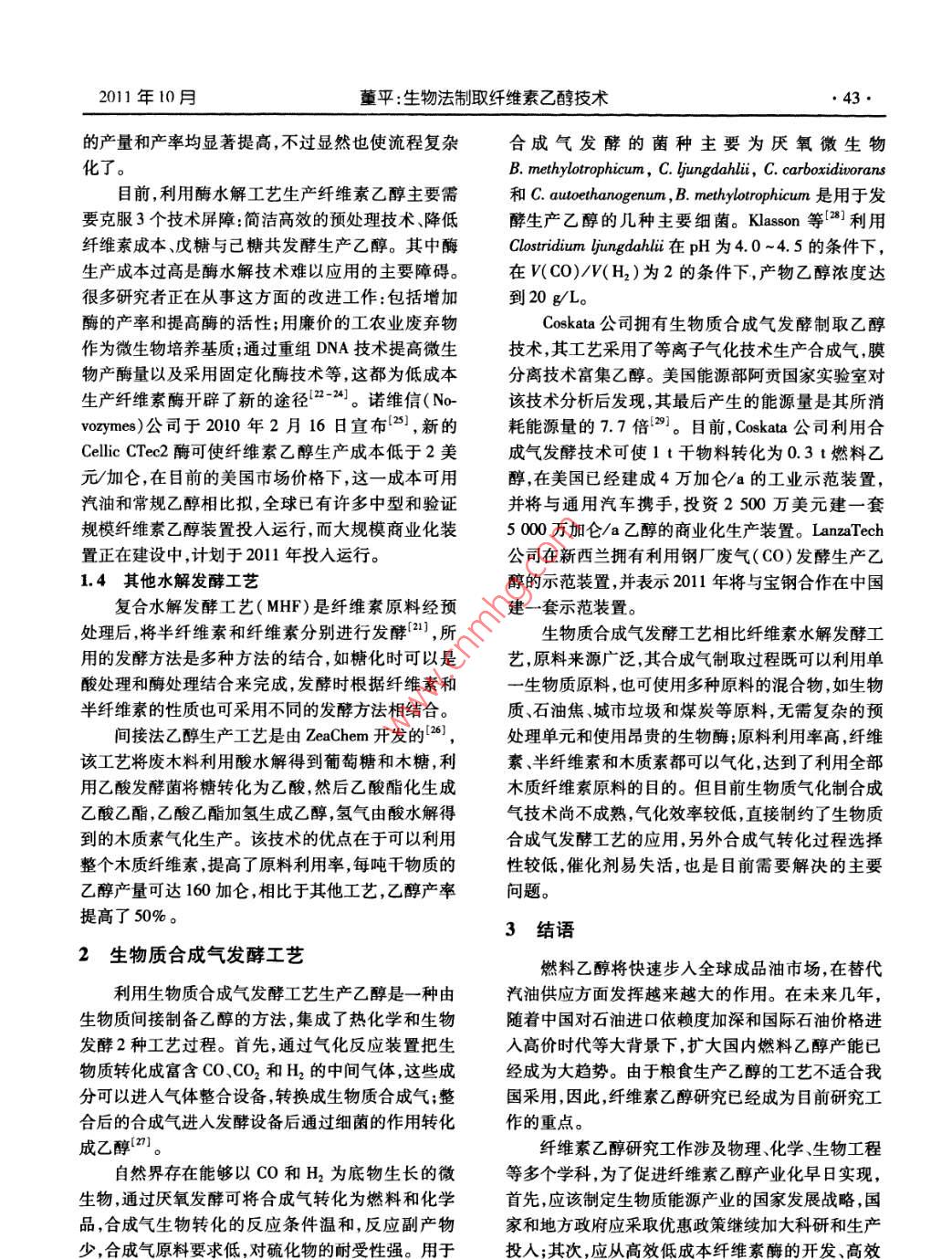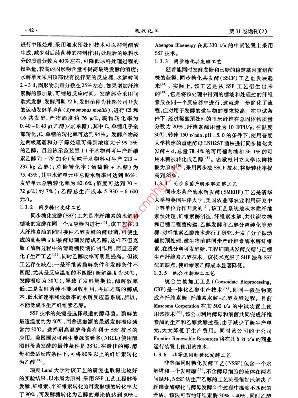Oct. 2011現(xiàn)代化工第31卷增刊(2)Modern Chemical Industry2011年10月生物法制取纖維素乙醇技術(shù)董平(中國石油石油化工研究院大慶化工研究中心,黑龍江大慶163714)摘買:以纖維素為原料生產(chǎn)燃料乙醇,由于其原料來源廣泛及環(huán)保效益良好而被認為是最有前景的生產(chǎn)燃料乙醇的方法之一。在闡述我國發(fā)展纖維素乙醇必要性的基礎(chǔ)上,綜述了纖維素乙醇的濃酸水解、稀酸水解、酶水解及生物質(zhì)合成氣等發(fā)酵工藝及研究進展。分析了各工藝優(yōu)缺點,并討論了各工藝過程需要解決的關(guān)鍵技術(shù)問題展望了纖維素乙醇的產(chǎn)業(yè)化前景關(guān)鍵詞:纖維素乙醇;生物質(zhì);燃料;發(fā)酵;水解中圖分類號:TQ223.122文獻標識碼:A文章編號:0253-4320(2011)s-0040-05Ethanol production from lignocellulosic biomassONG Ping(Petrochina Petrochemical Research Institute Daqing PetroChemical Research Center, Daqing 163714, China)Abstract: Cellulosic biomass is considered one of the most promising feedstock for producing fuel ethanol due to itsglobal availability and environmental benefits. In this paper, on the basis of reviewing the necessity of developing celluloseethanol in China, the fermentation processes for cellulosic ethanol, including concentrated acid hydrolysis, dilute-acidhydrolysis, cellulase hydrolysis, biomass synthesis gas, and so on, and their advances are introduced. Meanwhile, theanalysis of the advantages and disadvantages of each process is provided, and the key problems to be solved of differentprocesses are also discussed. The prospect of industrialization of fuel ethanol production from cellulosic biomass isKey words: cellulosic ethanol; biomass; fuel; fermentation; hydrolysis目前,能源短缺和能源消費所引起的環(huán)境問題已經(jīng)成為制約我國可持續(xù)發(fā)展的瓶頸之一??商娲?纖維素水解發(fā)酵工藝的、清潔的、可再生能源的研究已成為迫切需要。以1.1濃酸水解工藝纖維素類生物質(zhì)生產(chǎn)燃料乙醇,由于其原料來源廣濃酸水解工藝在19世紀即已提出2,它的原理泛、資源豐富及環(huán)保效益良好而被認為是最有前景是結(jié)晶纖維素在較低溫度下可完全溶解在硫酸中的生產(chǎn)燃料乙醇的方法之轉(zhuǎn)化成含幾個葡萄糖單元的低聚糖。把此溶液加水我國有發(fā)展纖維素燃料乙醇的有利條件,每年稀釋并加熱,經(jīng)一定時間后就可把低聚糖水解為葡的農(nóng)林廢棄物共約15億t,按4t纖維素產(chǎn)1t乙醇萄糖。濃酸水解的優(yōu)點是糖的回收率可達90%以計算,具有生產(chǎn)375億t乙醇的資源潛力口。而我上,可以處理不同的原料,相對迅速(總共10國糧食資源并不豐富,如果能將農(nóng)林廢棄物轉(zhuǎn)化12h),并極少降解。但對設(shè)備要求高酸必須回為燃料乙醇并形成產(chǎn)業(yè)化,那將非常適合我國的收,且污染比較嚴重。該項研究工作的代表是美國國情。Arkenol公司,它在這方面作了較大的投入。據(jù)纖維素乙醇的生產(chǎn)方法主要有2種,即生物法 Arkenol公司中試裝置的實驗結(jié)果顯示(,該水解工和熱化學法。生物法的本質(zhì)是將纖維素水解生成可藝可得質(zhì)量分數(shù)為12%~15%的糖液,纖維素的轉(zhuǎn)發(fā)酵單糖進而通過微生物發(fā)酵生成乙醇的技術(shù);熱化率穩(wěn)定在70%,最佳條件下可達到80%,酸回收化學法是將生物質(zhì)通過熱轉(zhuǎn)化過程生成合成氣,再率也可達到97%。通過化學合成乙醇的技術(shù)。而生物法制取纖維素12稀酸水解工藝乙醇的工藝又分為2種:一種是纖維素水解發(fā)酵稀酸水解的機理是溶液中的氫離子可和纖維素工藝;另一種是生物質(zhì)合成氣發(fā)酵工藝。筆者綜上的氧原子相結(jié)合,使其變得不穩(wěn)定,容易和水反述了近幾年來國內(nèi)外生物法制取纖維素乙醇的主應(yīng),纖維素長鏈即在該處斷裂同時又放出氫離子,要生產(chǎn)工藝及研究進展展望了纖維素乙醇的發(fā)而實現(xiàn)纖維素長鏈的連續(xù)解聚,直到分解成為最展前景。小的單元葡萄糖。稀酸水解原料處理時間短,且較收稿日期:2011-07-29者簡介:董平(1976-),男,課題組長/工程師,主要從事生物燃料的研究工作2011年10月董平:生物法制取纖維素乙醇技術(shù)4l·易實現(xiàn)工業(yè)化,但由于產(chǎn)生的糖會進一步發(fā)生分步研究。解5,因此影響了糖的收率。近年來的研究表明1.3.1分別水解發(fā)酵工藝在適當?shù)臈l件下,糖收率可能達到85%6,其中反分別水解發(fā)酵工藝(SHF)是最早出現(xiàn)的纖維素應(yīng)器的開發(fā)成為研究的熱點。乙醇的生產(chǎn)方式,即纖維質(zhì)原料首先利用纖維素酶為了減少單糖的分解,實際的稀酸水解常分兩水解后,再進行C5C6糖發(fā)酵,可分別發(fā)酵,也可利步進行:第一步用較低溫度分解半纖維素產(chǎn)物以木用C3、C6共發(fā)酵菌株生產(chǎn)乙醇。該工藝分別使水解糖為主;第二步用較高溫度分解纖維素,產(chǎn)物主要是和發(fā)酵在各自的最適條件下(分別為50℃和30℃)葡萄糖。美國的 Celunol公司(原 BC International進行,但是酶水解產(chǎn)生的產(chǎn)物(纖維二糖和葡萄糖)開發(fā)的纖維素二級酸水解工藝可以在較低的酸濃度會反饋抑制水解反應(yīng)。隨著水解過程中葡萄糖濃度下水解纖維素;美國還開發(fā)了伸縮床水解反應(yīng)器的不斷升高酶水解反應(yīng)很快就因為產(chǎn)物抑制作用技術(shù),當酸的質(zhì)量分數(shù)為08%時,可