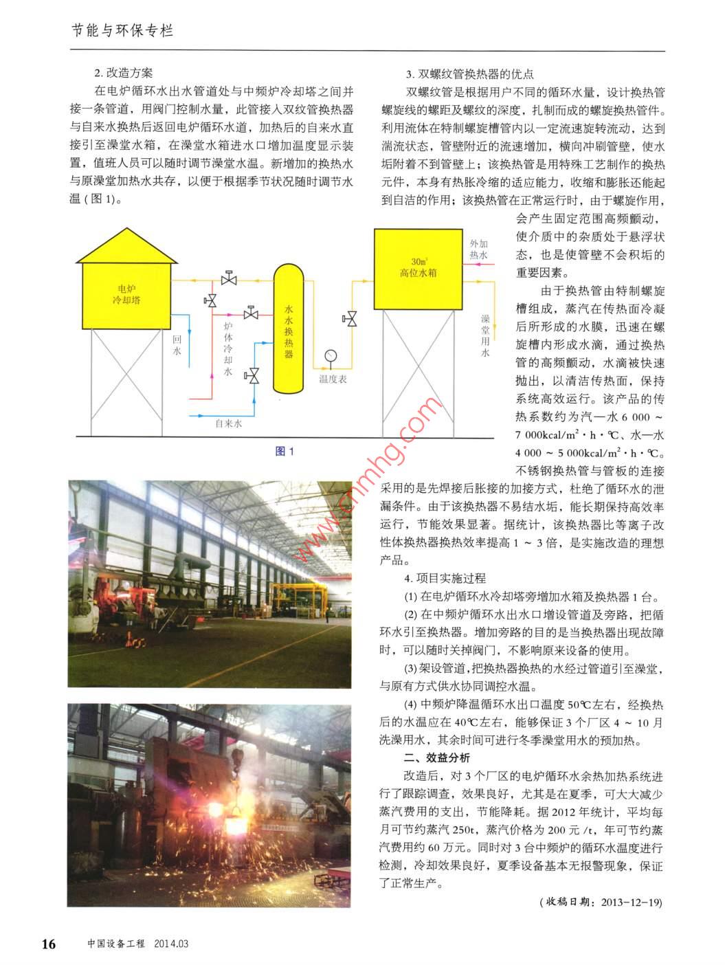 節(jié)能與環(huán)保專欄中頻爐循環(huán)水的余熱利用紀(jì)創(chuàng)新,張杰,王汝秀,賈秀臣(中國重汽集團(tuán)濟(jì)南動(dòng)力有限公司鑄鍛中心,山東濟(jì)南250200)摘要:利用中頻爐循環(huán)水余熱加熱澡堂用水,從能源的節(jié)約入手,最大限度減少蒸汽的使用,充分做到節(jié)能降耗關(guān)鍵詞:中頻爐循環(huán)水;余熱;蒸汽;節(jié)能中圖分類號:TK115文獻(xiàn)標(biāo)識碼:B文章編號:1671-0711(2014)03-0015-02鑄造工廠是能源消耗型行業(yè),能源的合理利用很重要。公司通過對3個(gè)廠區(qū)的中頻爐循環(huán)水管道進(jìn)行改造利用循環(huán)水余熱加熱澡堂用水,節(jié)約蒸汽使用量。有效節(jié)約了能源,創(chuàng)造了一定的經(jīng)濟(jì)效益中頻爐循環(huán)水余熱利用的原理及實(shí)施過程概況在生產(chǎn)過程中,鑄造3個(gè)廠區(qū)加工部中頻爐使用較多,因中頻爐循環(huán)水經(jīng)高溫爐體循環(huán)冷卻后水溫較高,在冷卻過程中,熱量損失嚴(yán)重,尤其是夏季,因冷卻不到位,常常引發(fā)循環(huán)水超溫報(bào)警,影響中頻爐正常生產(chǎn)。針對此現(xiàn)象,公司組織技術(shù)人員進(jìn)行考察論證,決定利用中頻爐循環(huán)水余熱加熱澡堂用水。中國設(shè)備工程2014.0315節(jié)能與環(huán)保專欄2改造方案3.雙螺紋管換熱器的優(yōu)點(diǎn)在電爐循環(huán)水出水管道處與中頻爐冷卻塔之間并雙螺紋管是根據(jù)用戶不同的循環(huán)水量,設(shè)計(jì)換熱管接一條管道,用閥門控制水量,此管接λ雙紋管換熱器螺旋線的螺距及螺紋的深度,扎制而成的螺旋換熱管件。與自來水換熱后返回電爐循環(huán)水道,加熱后的自來水直利用流體在特制螺旋槽管內(nèi)以一定流速旋轉(zhuǎn)流動(dòng),達(dá)到接引至澡堂水箱,在澡堂水箱進(jìn)水口增加溫度顯示裝湍流狀態(tài),管壁附近的流速增加,橫向沖刷管壁,使水置,值班人員可以隨時(shí)調(diào)節(jié)澡堂水溫。新增加的換熱水垢附著不到管壁上;該換熱管是用特殊工藝制作的換熱與原澡堂加熱水共存,以便于根據(jù)季節(jié)狀況隨時(shí)調(diào)節(jié)水元件,本身有熱脹冷縮的適應(yīng)能力,收縮和膨脹還能起溫(圖1)。到自潔的作用;該換熱管在正常運(yùn)行時(shí),由于螺旋作用,會(huì)產(chǎn)生固定范圍高頻顫動(dòng),外加使介質(zhì)中的雜質(zhì)處于懸浮狀熱水態(tài),也是使管壁不會(huì)積垢的高位水箱重要因素。電爐由于換熱管由特制螺旋冷卻塔槽組成,蒸汽在傳熱面冷凝體冷卻水水水換熱器堂!后所形成的水膜,迅速在螺用旋槽內(nèi)形成水滴,通過換熱管的高頻顫動(dòng),水滴被快速溫度表拋出,以清潔傳熱面,保持系統(tǒng)高效運(yùn)行。該產(chǎn)品的傳自來水熱系數(shù)約為汽一水6000~7000kcal/m2·h·℃、水一水4000~5000kcal/m2h·℃不銹鋼換熱管與管板的連接采用的是先焊接后脹接的加接方式,杜絕了循環(huán)水的泄漏條件。由于該換熱器不易結(jié)水垢,能長期保持高效率運(yùn)行,節(jié)能效果顯著。據(jù)統(tǒng)計(jì),該換熱器比等離子改性體換熱器換熱效率提高1~3倍,是實(shí)施改造的理想產(chǎn)品。4項(xiàng)目實(shí)施過程(1)在電爐循環(huán)水冷卻塔旁增加水箱及換熱器1臺。(2)在中頻爐循環(huán)水出水口增設(shè)管道及旁路,把循環(huán)水引至換熱器。增加旁路的目的是當(dāng)換熱器出現(xiàn)故障時(shí),可以隨時(shí)關(guān)掉閥門,不影響原來設(shè)備的使用。(3)架設(shè)管道,把換熱器換熱的水經(jīng)過管道引至澡堂,與原有方式供水協(xié)同調(diào)控水溫。(4)中頻爐降溫循環(huán)水出口溫度50℃左右,經(jīng)換熱后的水溫應(yīng)在40℃左右,能夠保證3個(gè)廠區(qū)4~10月洗澡用水,其余時(shí)間可進(jìn)行冬季澡堂用水的預(yù)加熱。、效益分析改造后,對3個(gè)廠區(qū)的電爐循環(huán)水余熱加熱系統(tǒng)進(jìn)行了跟蹤調(diào)查,效果良好,尤其是在夏季,可大大減少蒸汽費(fèi)用的支出,節(jié)能降耗。據(jù)2012年統(tǒng)計(jì),平均每月可節(jié)約蒸汽250t,蒸汽價(jià)格為200元/t,年可節(jié)約蒸汽費(fèi)用約60萬元。同時(shí)對3臺中頻爐的循環(huán)水溫度進(jìn)行檢測,冷卻效果良好,夏季設(shè)備基本無報(bào)警現(xiàn)象,保證了正常生產(chǎn)。(收稿日期:2013-12-19)6中國設(shè)備工程2014.03