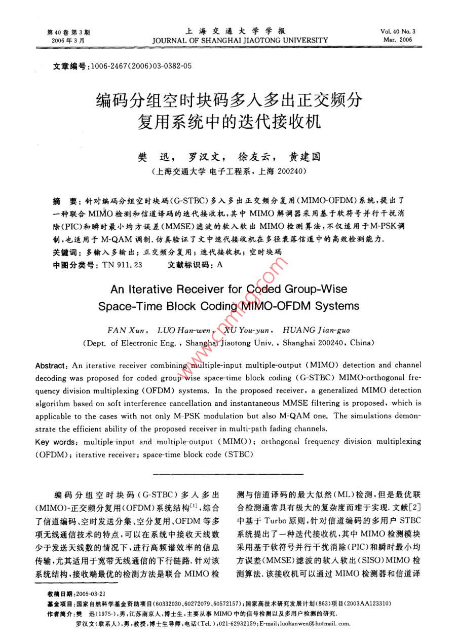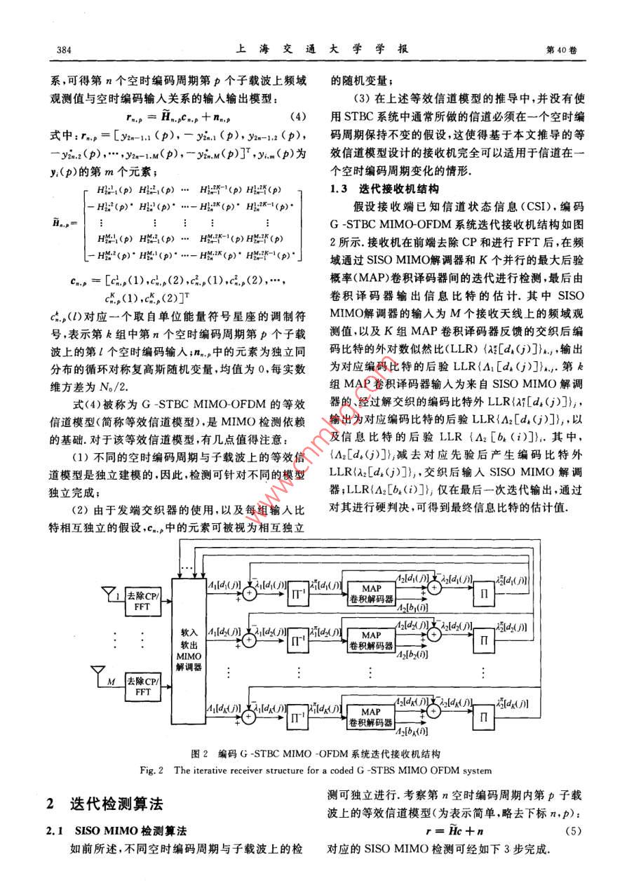 第40卷第3期上海交通大學學報VoL 40 No. 32006年3月JOURNAL OF SHANGHAI JIAOTONG UNIVERSITY文章編號:1006-2467(2006)03-0382-05編碼分組空時塊碼多人多出正交頻分復(fù)用系統(tǒng)中的迭代接收機樊迅,羅漢文,徐友云,黃建國(上海交通大學電子工程系,上海200240摘要:針對編碼分組空時塊碼( G-STBC)多入多出正交頻分復(fù)用( MIMO-OFDM)系統(tǒng),提出了種聯(lián)合MIMO檢測和信道譯碼的選代接收機,其中MIMO解調(diào)器采用基于軟符號并行干擾消除(PIC)和瞬時最小均方誤差(MMSE)濾波的軟入軟出MIMO檢測算法,不僅適用于MPSK調(diào)制,也適用于MQAM調(diào)制、仿真驗證了文中選代接收機在多徑衰落信道中的高效檢測能力.關(guān)鍵詞:多輸入多輸出;正交頻分復(fù)用;迭代接收機;空時塊碼中圖分類號:TN911.23文獻標識碼:AAn Iterative Receiver for Coded group-WiseSpace-Time Block Coding MIMO-OFDM SystemsFAN Xun, LUO Han-wen, XU You-yun, HUANG Jian-guo( Dept. of Electronic Eng, Shanghai Jiaotong Univ, Shanghai 200240, China)Abstract: An iterative receiver combining multiple-input multiple-output (MIMo)detection and channeldecoding was proposed for coded group-wise space-time block coding (G-STBC) MIMO-orthogonal fre-quency division multiplexing (OFDM) systems. In the proposed receiver, a generalized MIMO detectionalgorithm based on soft interference cancellation and instantaneous MMSE filtering is proposed, which isapplicable to the cases with not only M-PSK modulation but also M-QAM one. The simulations demon-strate the efficient ability of the proposed receiver in multi-path fading channelsKey words: multiple-input and multiple-output (MIMO); orthogonal frequency division multiplexing(OFDM); iterative receiver; space-time block code(STBC)編碼分組空時塊碼( G-STBC)多入多出測與信道譯碼的最大似然(ML)檢測,但是最優(yōu)聯(lián)(MIMO)-正交頻分復(fù)用(OFDM)系統(tǒng)結(jié)構(gòu),綜合合檢測通常具有極大的復(fù)雜度而難于實現(xiàn).文獻[2]了信道編碼、空時發(fā)送分集、空分復(fù)用、OFDM等多中基于 Turbo原則,針對信道編碼的多用戶STBC項無線通信技術(shù)的特點,可以在系統(tǒng)中接收天線數(shù)系統(tǒng)提出了一種迭代接收機,其中MIMO檢測模塊少于發(fā)送天線數(shù)的情況下,進行高頻譜效率的信息采用基于軟符號并行干擾消除(PC)和瞬時最小均傳輸,尤其適用于寬帶無線通信的下行鏈路針對該方誤差(MMSE)濾波的軟入軟出( SISO) MIMO檢系統(tǒng)結(jié)構(gòu),接收端最優(yōu)的檢測方法是聯(lián)合MMO檢測算法該接收機可以通過MIMO檢測器和信道譯收稿日期:20050321基金項目:國家自然科學基金資助項目(60332030、60272079、60572157)國家高技術(shù)研究發(fā)展計劃(863)項目(2003AA123310)作者簡介:樊迅(1975-),男,江蘇南京人,博士生,主要從事MIMO中的信號檢測以及多用戶檢測的研究羅漢文(聯(lián)系人)男,教授博士生導(dǎo)師,電話(Te.):021-62932159;E-mail:luohanwen@hotmail.com,3期樊迅,等:編碼分組空時塊碼多入多出正交頻分復(fù)用系統(tǒng)中的選代接收機383碼器間的多次迭代以較低的復(fù)雜度逼近最優(yōu)聯(lián)合檢出了一種通用的基于軟符號PIC和瞬時MMSE濾測的性能但它是針對平衰落信道設(shè)計的,而且其中波的 SISO MIMO檢測算法,該算法不僅適用于的 SISO MIMO檢測算法只適用于MPSK調(diào)制.文MPSK調(diào)制,也適用于MQAM調(diào)制獻[冂]中針對頻率選擇性信道環(huán)境,提出了一種編碼G-STBC MIMO-OFDM系統(tǒng)的選代接收機,通過對1系統(tǒng)模型文獻[2]中MIMO檢測器PIC的輸人進行改進獲得1.1發(fā)端結(jié)構(gòu)了更好的性能,但它也僅是針對BPSK和QPSK調(diào)如圖1所示,在編碼 G-STBC MIMO-OFDM制設(shè)計的系統(tǒng)發(fā)端,發(fā)送天線被分成K組,與之對應(yīng),系統(tǒng)本文提出一種針對編碼 G-STBC MIMO幀輸入的信息比特流也分為并行的K路.首先,對OFDM系統(tǒng)的迭代接收機,它通過MIMO檢測器每一路輸入信息比特流{b(i)};進行卷積編碼,編和信道譯碼器間外信息的交互和多次迭代,不斷地碼輸出的比特流{ad(j)}交織后輸入調(diào)制器進行調(diào)改進檢測的性能,最終由信道譯碼器輸出信息比特制.然后,調(diào)制輸出的符號流,以一個空時編碼周期的估計完成檢測.并且,在接收機關(guān)鍵模塊—MI內(nèi)的STBC編碼輸入符號數(shù)為單位進行分塊,每塊MO檢測器的設(shè)計中,本文對文獻[2]中適用于經(jīng)過獨立的STBC編碼后,被映射到對應(yīng)的空時編MPSK調(diào)制的 SISO MIMO檢測算法進行改進,提碼周期和子載波上(b(,(ce()交織器調(diào)制器b2(0交織器調(diào)制器/O)編碼器「“插入CP{b()卷積交織器調(diào)制器(CK(D3 STBCIFFT/編碼器編碼器i入圖1編碼 GSTBC MIMO-OFDM系統(tǒng)發(fā)端結(jié)構(gòu)Fig. 1 The transmitter structure for a coded G- STBS MIMO OFDM system為了表述方便,下面以 Alamouti STBC編碼情同分布,且在一個OFDM符號內(nèi)保持不變.另外,假形為例進行介紹.該編碼器可以通過如下的編碼矩設(shè)OFDM的循環(huán)前綴足夠長(大于多徑信道的最大陣表述3:延時擴展).由于在這樣的系統(tǒng)中不存在子載波干擾(ICI)和符號間干擾(ISI),故可以針對不同OFDM(1)時隙和子載波建立獨立的信道模型,以第n個式中,{x1,x2}對應(yīng)一個空時編碼周期內(nèi)的2個編碼OFDM時隙第p個子載波為例,對應(yīng)的MIMO輸入符號編碼后,在空時編碼周期的不同時隙,對OFDM頻域離散基帶模型為應(yīng)矩陣行中的符號被發(fā)送.這樣,若系統(tǒng)中第k