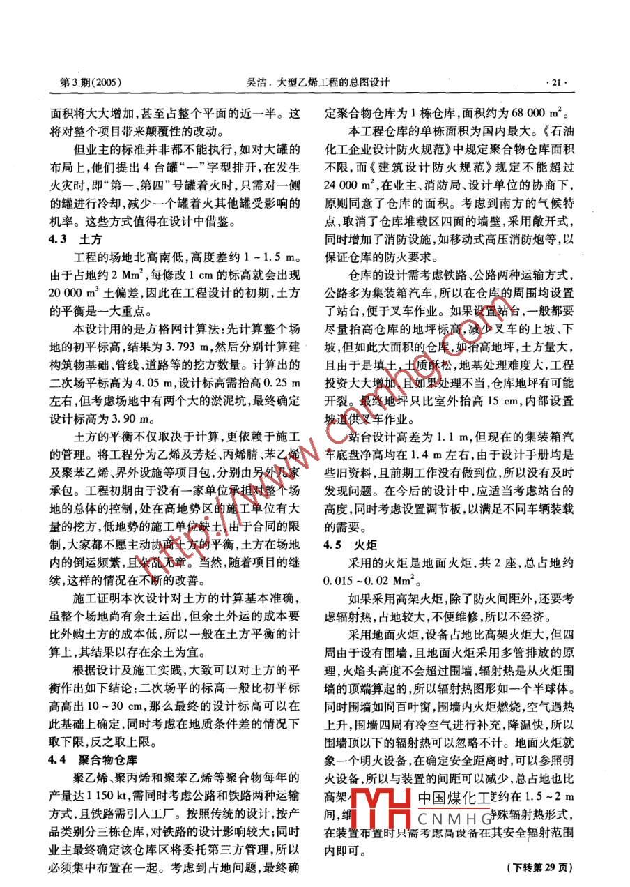 第3期(2005)金山油化纖●19.大型乙烯工程的總圖設計吳潔(中國石化集團上海工程有限公司,00000)真要: 文章介紹了大型乙烯工程總體項目的組成,總結(jié)了該項目總圖設計的經(jīng)驗。關(guān)鍵詞:乙烯總圖設計1概述3)“之最”多一工程中的諸多設施的規(guī)?;蛐问骄胺Q國內(nèi)乃至世界之最,這些設施的設中外合資900 kt/a乙烯工程項目坐落在上海計沒有相關(guān)的規(guī)范、標準可參照,給設計及審批帶市郊橫跨金山、奉賢兩區(qū)的上?;瘜W工業(yè)園區(qū)內(nèi)。來困難。整個園區(qū)占地約23Mm2,為沿海灘涂以圍海造地形式所得到的土地,落戶其中的有全球著名的德2主要設計內(nèi)容國巴斯夫公司和拜耳公司,以及中英合資的賽科公司。上海市區(qū)的天原化工廠等- - 些老牌化工廠總圖設計內(nèi)容包括:全廠總圖布置及界外設也搬遷至此,所以上?;瘜W工業(yè)園區(qū)與上海石油施各分區(qū)平面布置、全廠豎向設計、全廠地上及地化工股份有限公司-起成為國內(nèi)最大的石油化工下管線綜合設計、全廠道路、全廠圍墻、協(xié)調(diào)與其基地之一。他項目包界區(qū)的接口條件。900 kVa乙烯工程包括:乙烯裝置、丁二烯及由于項目具有上述特點,尤其是“L"型地形芳烴聯(lián)合裝置、苯乙烯裝置、聚苯乙烯裝置、丙烯特征,給總圖布置帶來了較大困難,所以總圖布置腈裝置、聚乙烯及聚丙烯聯(lián)合裝置、界外設施工程時,按各裝置的開、停車特點、公用工程的消耗量, .和總體工程。其中界外設施工程包括:生產(chǎn)管理將八套裝置分成若干區(qū),分別集中設置公用工程,區(qū)、循環(huán)水區(qū)、動力中心、污水處理空壓站罐區(qū)、同時考慮到與化學工業(yè)區(qū)提供設施的銜接,將罐區(qū)與倉庫等設施盡量布置在化工區(qū)碼頭、罐區(qū)等PHU倉庫、火炬等幾大部分??傮w工程包括:全廠各物料及公用工程平衡、設施附近,達到既方便自身又方便化工區(qū)的目的。全廠總圖運輸、全廠道路、全廠圍墻及全廠管線等。3設計方案中國石化集團上海工程有限公司主要承擔總體工程,界外設施,聚乙烯、苯乙烯、聚苯乙烯裝置3.1總平面布置該區(qū)域南、北、西三面是化學工業(yè)區(qū)的人工的設計。該項目的特點是:河,巴? 中國煤化工防浪堤就是大1)投資大一整個工程投資 200多億人民幣。海。TYHCNMHG3.52 ~4.20 m2)占地面積大一-工程占用化學工業(yè)區(qū) A1 ~收稿日期:2005 -06 -01。A3和B1四個地塊,總占地面積為2 Mm2 ,東西最長作者簡介:吳潔,男,1972年2月出生,畢業(yè)于同濟大學交通2 000 m,南北長1 500 m,四個地塊呈“L"型布置。工程系,工程師?,F(xiàn)從事化工廠總體規(guī)劃、設計工作。●20.金山油化纖第24卷.左右。-個大型石油化工企業(yè)。由于此類工業(yè)區(qū)均有自該工程主導風向為東南風及西北風,全年主己的控制性詳細規(guī)劃,同時又具備大型項目開工導風向為東南風。從布置的原則來看,生產(chǎn)管理的基本條件,周邊配套條件比較齊全,有利于項目區(qū)應布置在東南角,但由于化學工業(yè)區(qū)是向南圍的開展。堤的,所以其出入口均設置在北側(cè)。根據(jù)業(yè)主提但值得注意的是,由于控制性詳細規(guī)劃只相出的人員在I廠發(fā)生意外時候應該盡快撤離的要當于--般項目的基礎設計,所以要根據(jù)投資環(huán)境求,將生產(chǎn)管理區(qū)布置在西北角。的變化,不斷完善和修改設計,而細節(jié)上的變化,生產(chǎn)裝置區(qū):乙烯裝置布置在整個區(qū)域的正往往對區(qū)內(nèi)項目設計的進度與投資帶來影響。南方,其東側(cè)為循環(huán)水場、罐區(qū);西側(cè)為丙烯腈裝如:根據(jù)化學工業(yè)區(qū)提供的道路網(wǎng)施工圖,西河置、甲基丙烯酸甲酯及硫回收聯(lián)合裝置、火炬;北路、南河路均為城市型道路,雙面排水,路邊均設側(cè)依次為丁二烯及芳烴聯(lián)合裝置、動力中心、循環(huán)置排水管道與檢查井,加上,上述道路均布置在河水場、空壓站、污水處理苯乙烯及中間罐區(qū)、聚苯道一側(cè),為節(jié)省投資修改了設計方案,將南河、西.乙烯裝置、聚乙烯及聚丙烯聯(lián)合裝置、包裝運輸倉河兩條路均改成公路型道路,采用單面排水,以致庫及停車場。工廠的道路標高從原來的3.65m提高到3.70根據(jù)公用工程消耗量及各裝置開停車期間互m。由于參加設計的單位有好幾家,特別是--些相影響的情況,全廠分三處集中布置循環(huán)水場,1"國外工程公司由于合同的原因拒絕更改界面條循環(huán)水供乙烯、芳烴及丁二烯、罐區(qū);2*循環(huán)水供件,設計工作- -度陷入僵局,影響了總的完工進聚烯烴裝置、苯乙烯、聚苯乙烯及生產(chǎn)管理區(qū);3"循環(huán)水供丙烯腈、MMA、SAR 裝置。同時1*、2*循因此,在設計初期,設計單位應主動通過業(yè)主環(huán)水場內(nèi)布置消防水系統(tǒng),既節(jié)約用地,又方便消多與工業(yè)區(qū)溝通、協(xié)商,多了解變化的情況,同時防管線的敷設。提醒工業(yè)區(qū)在變更設計時應及時通知各業(yè)主,甚全廠只設置集中空壓站動力中心、廢水處理至可通過業(yè)主在區(qū)內(nèi)投資的優(yōu)勢,對工業(yè)區(qū)不合裝置。由于聚乙烯、聚丙烯及聚苯乙烯裝置的產(chǎn)理或損害業(yè)主利益的修改加以制止,臧少損失。品具有統(tǒng)-一火災危險級