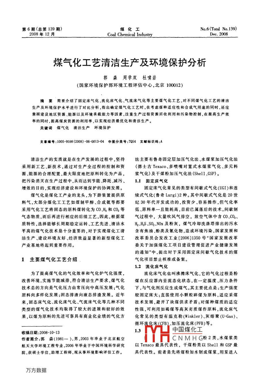 第6期(總第139期)煤化工No.6(Total No.139)2008年12月Coal Chemical IndustryDec. 2008煤氣化工藝清潔生產(chǎn)及環(huán)境保護(hù)分析郭森周學(xué)雙杜嘯巖(國家環(huán)境保護(hù)部環(huán)境工程評估中心,北京100012)摘要簡要介紹了固定床氣化流化床氣化、氣流床氣化等主要煤氣化工藝,對不同煤氣化工藝的清潔生產(chǎn)及環(huán)境保護(hù)水平進(jìn)行了對比分析,指出確定煤氣化工藝時(shí),在考慮煤種適應(yīng)性和合成氣用途的同時(shí),還應(yīng)兼顧建設(shè)地區(qū)資源、能源以及環(huán)境承載能力等因素,注重生產(chǎn)過程資源回收利用和污染物控制,在提高生產(chǎn)效率的同時(shí),提高媒炭資源的利用率,以實(shí)現(xiàn)經(jīng)濟(jì)最優(yōu)化和清潔生產(chǎn)。.關(guān)鍵詞煤氣化清潔生產(chǎn) 環(huán)境保護(hù)文章編號(hào):1005- 9598 (2008) -06-0013-04中圈分類 號(hào):TQ54文獻(xiàn)標(biāo)識(shí)碼:A清潔生產(chǎn)的實(shí)質(zhì)就是在生產(chǎn)發(fā)展的過程中,堅(jiān)持法主要有魯奇固定層加壓氣化法、水煤漿加壓氣化法采用新工藝、新技術(shù),通過對生產(chǎn)全過程的控制和資(德士古Texaco、多噴嘴對置式水煤漿氣化、多元料源、能源的合理配置,最大限度地把原料轉(zhuǎn)化為產(chǎn)品,漿氣化)及干煤粉加壓氣化法(Shell、CSP)。把污染消滅在生產(chǎn)過程中,從而達(dá)到節(jié)能、降耗、減污、1.1 固定床氣化增效的目的,實(shí)現(xiàn)經(jīng)濟(jì)建設(shè)和環(huán)境保護(hù)的協(xié)調(diào)發(fā)展。.固定床氣化常見的類型有間歇式氣化(UGI)和連煤氣化是煤化工產(chǎn)業(yè)的龍頭,為下游裝置提供原續(xù)式氣化(魯奇Lurgi)2種。其中間歇式氣化是20世.料氣,大部分煤化工工藝如煤制甲醇、合成氨等都要.紀(jì)30年代開發(fā)成功的,投資少、容易操作,但氣化率采用氣化工藝將固態(tài)的原料煤轉(zhuǎn)化為C0.H2和CO2等低、原料單一且能耗高,目前已屬落后的技術(shù)。間歇制.氣態(tài)物質(zhì),而后再進(jìn)行相應(yīng)的后續(xù)工藝,因此,根據(jù)煤.氣過程中,大量吹風(fēng)氣排空,放空氣體中含C0.CO2、.質(zhì)特性,選擇能夠長周期穩(wěn)定運(yùn)轉(zhuǎn)、工藝先進(jìn)、清潔水.H2.HS、SO2、NOx及粉灰,煤氣冷卻洗滌塔排出的污水平高的煤氣化技術(shù)是十分重要的,對于實(shí)現(xiàn)煤化工清含有焦油、酚類及氰化物,造成環(huán)境污染,國家發(fā)展和潔生產(chǎn)、建設(shè)環(huán)境友好、經(jīng)濟(jì)效益顯著的新型煤化工改革委員會(huì)發(fā)改工業(yè)[2006]1350號(hào)“國家發(fā)展改革.產(chǎn)業(yè)基地將起到重要作用。委關(guān)于加強(qiáng)煤化工項(xiàng)目建設(shè)管理促進(jìn)產(chǎn)業(yè)健康發(fā)展的通知"中,提出對于采用固定床間歇?dú)饣夹g(shù)的煤1主要煤氣化工藝介紹氣化項(xiàng)目禁止核準(zhǔn)或備案。1.2 流化床氣化為了提高煤氣化的氣化效率和氣化爐氣化強(qiáng)度,流化床氣化也叫沸騰床氣化,它的氣化過程是粉改善環(huán)境,實(shí)施節(jié)能減排,符合清潔生產(chǎn)要求,煤氣化煤在反應(yīng)器內(nèi)呈流態(tài)化狀態(tài),在- -定溫度、壓力條件技術(shù)總的方向是氣化壓力由常壓向中高壓發(fā)展;氣化下,與氣化劑反應(yīng)生成煤氣。其主要優(yōu)點(diǎn)是:生產(chǎn)強(qiáng)度原料向多樣化發(fā)展;固態(tài)排渣向液態(tài)排渣發(fā)展。近年較固定床大;直接使用小顆粒碎煤為原料,適應(yīng)采煤來,固態(tài)床氣化、流化床氣化、氣流床氣化等幾種不同技術(shù)發(fā)展,避開了塊煤供求矛盾;對煤種煤質(zhì)的適應(yīng)類型的煤氣化技術(shù)均取得了較大的進(jìn)展和較好的效性強(qiáng),可利用如褐煤等高灰劣質(zhì)煤作原料,流化床氣果,以煤為原料的先進(jìn)可靠具有商業(yè)化業(yè)績的氣化方化常見的類型有溫克勒(Winkler)、灰熔聚(U-Gas)、循環(huán)流化床(CFB)、加壓流化床(PFB)等。1.3中國煤化工收稿日期:2008-10-13作者簡介:郭森(1981一 ),男,2003年畢業(yè)于北京航空iYHCNMH G粉2類,水煤漿類航天大學(xué)環(huán)境工程專業(yè),2006年畢業(yè)于中國環(huán)境科學(xué)研究.以Texaco最具代表性,干煤粉類以Shell和GSP最院,獲碩士學(xué)位,助理工程師,現(xiàn)從事環(huán)境影響評估工作。具代表性。前者是先將煤粉加水制成煤漿,用泵送入.一14煤化工2008年第6期氣化爐,氣化溫度1 350"C~1 450C;后者是氣化劑將有較大的兼容性,國際上已有多家單系列、大容量、加煤粉夾帶人氣化爐,在1 500C-1 700個(gè)高溫下氣化,壓裝置在運(yùn)行,其清潔、高效代表著當(dāng)今技術(shù)發(fā)展潮流。殘?jiān)匀墼问脚懦?。它的氣化過程是煤炭細(xì)粉粒在1.4 不同煤氣化工藝對比分析反應(yīng)器內(nèi)呈高速運(yùn)動(dòng)狀態(tài),相當(dāng)于流化技術(shù)領(lǐng)域里對主要針對目前國內(nèi)采用較多的魯奇(Lurgi)氣化固體顆粒的“氣流輸送" ,習(xí)慣上稱為氣流床氣化。爐、德士古(Texaco)氣化爐、殼牌(Shell)氣化爐、GSP氣流床對煤種(姻煤、褐煤)、粒度、硫分、灰分都具氣化爐進(jìn)行分析對比 ,其主要工藝參數(shù)列于表1。表14種氣化工藝主要參數(shù)比較工藝名稱LurgiTexacoShe1lGSP氣化工藝固定床.固態(tài)排渣氣流床、液態(tài)排渣褐煤、次煙煤、煙適用煤種弱黏結(jié)性