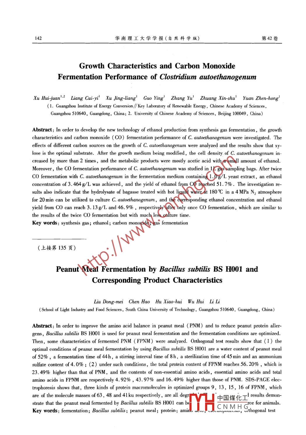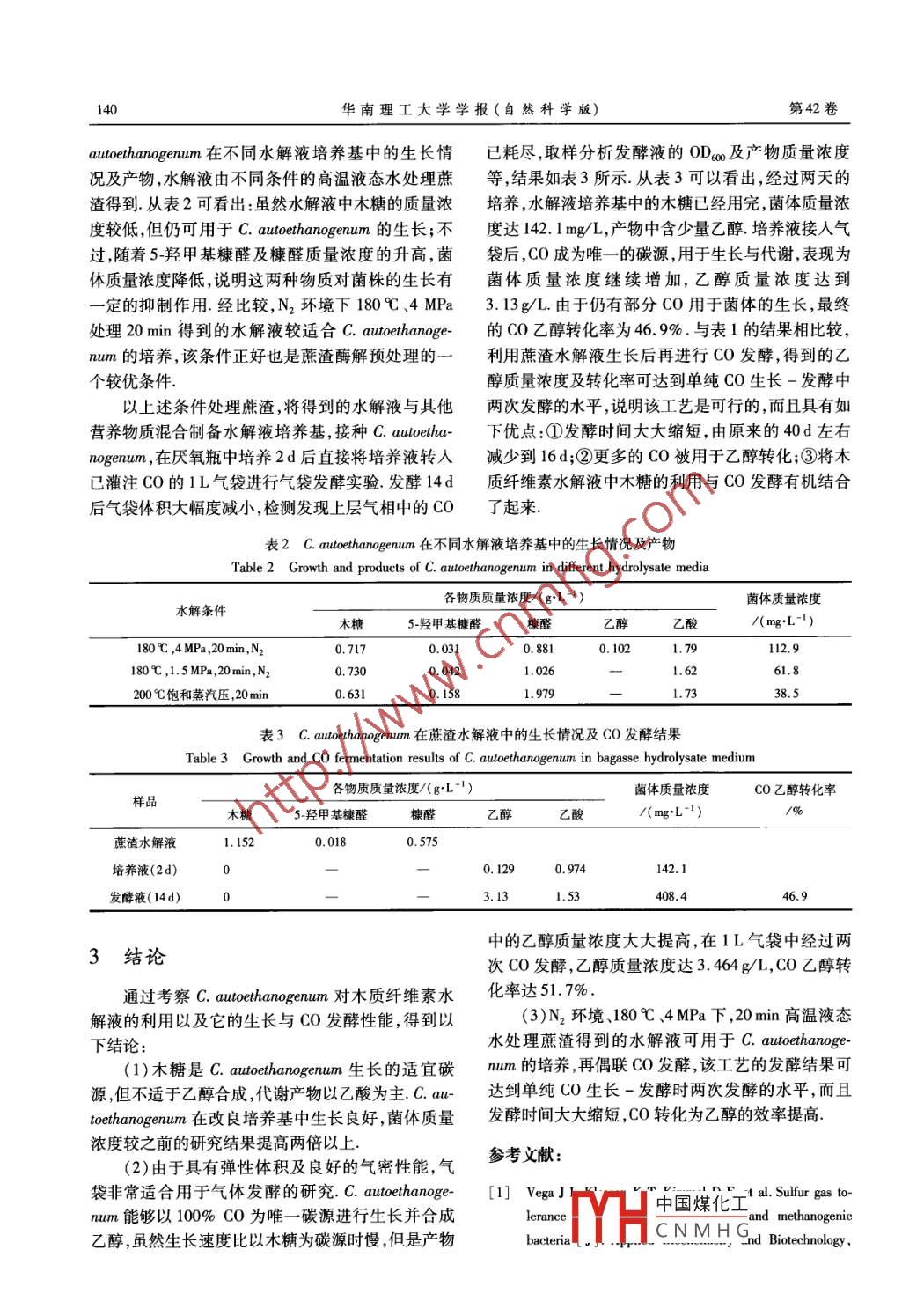 華南理工大學(xué)學(xué)報(bào)(自然科學(xué)版)第42卷第11期Journal of South China University of TechnologyVol 42 No 112014年11月Natural Science Edition)November 2014文章編號(hào):1000-565X(2014)11-0136-07合成氣發(fā)酵梭菌C. autoethanogenum的生長(zhǎng)特性與CO發(fā)酵性能徐惠娟梁翠誼!許敬亮!郭穎!張字!莊新姝袁振宏(1中國(guó)科學(xué)院廣州能源研究所∥可再生能源重點(diǎn)實(shí)驗(yàn)室,廣東廣州510640;2.中國(guó)科學(xué)院大學(xué),北京100049)摘要:為探討合成氣發(fā)酵乙醇的新工藝,對(duì)梭菌C. autoethanogenum的生長(zhǎng)特性及CO發(fā)酵性能進(jìn)行了研究.考察了不同碳源對(duì)C.α utoethanogenum生長(zhǎng)的影響,發(fā)現(xiàn)木糖是其生長(zhǎng)的最佳底物對(duì)生長(zhǎng)培養(yǎng)基進(jìn)行了改良,使C. autoethanogenu的菌體質(zhì)量濃度提高2倍以上,代謝產(chǎn)物以乙酸為主,只產(chǎn)生少量乙醇.利用1L氣體采樣袋研究了C. autoetha-nogent的CO發(fā)酵性能,在1.0g/L酵母膏的發(fā)酵培養(yǎng)基中經(jīng)過兩次CO發(fā)酵后,乙醇質(zhì)量濃度達(dá)3.464g/L,CO乙醇轉(zhuǎn)化率達(dá)51.7%.研究表明:N2環(huán)境、180℃4MPa下,20min高溫液態(tài)水處理蔗渣得到的水解液可用于C.α utoethanogenum的培養(yǎng),培養(yǎng)液再進(jìn)行CO發(fā)酵,經(jīng)過一次發(fā)酵后得到的乙醇質(zhì)量濃度為3.13g/L,CO乙醇轉(zhuǎn)化率為46.9%,與之前兩次發(fā)酵的結(jié)果接近,但是發(fā)酵時(shí)間大大縮短.關(guān)鍵詞:合成氣;乙醇;一氧化碳;氣體發(fā)酵中圖分類號(hào):Q815doi:10.3969/j.issn.1000-565X.2014.1.020自1987年發(fā)現(xiàn)第一株可以利用CO或CO2、H2合成氣乙醇發(fā)酵菌株37,此后,研究者們又陸續(xù)發(fā)進(jìn)行生長(zhǎng)并發(fā)酵產(chǎn)乙醇的微生物 Clostridiumψu(yù)ng-現(xiàn)了其他的一些合成氣發(fā)酵菌株,包括 Clostridiumdahlin(C. ljungdahlii)之后,一種新的乙醇生產(chǎn)技 carboxidivorans(C. carboxidivorans)89)、 Clostridium術(shù)—合成氣發(fā)酵應(yīng)運(yùn)而生該技術(shù)以煤、生物質(zhì) autoethanogenum(C. autoethanogenum)0、 Clostridia-或有機(jī)廢棄物的氣化合成氣(主要成分為CO0、CO2 um ragsdale(C. ragsdale)12及 Alkalibaculum bac和H2)為原料,利用特定的微生物將其發(fā)酵為乙醇.chi(A.bci)(等這些菌株產(chǎn)乙醇的能力各不相由于氣化過程可以將原料中的所有含碳有機(jī)物轉(zhuǎn)同.據(jù)報(bào)道,C. ngdahlii在具細(xì)胞循環(huán)的連續(xù)攪拌化為合成氣,因此包括木質(zhì)素在內(nèi)的一些難降解物罐式反應(yīng)器(CSTR)中發(fā)酵,乙醇的質(zhì)量濃度高達(dá)質(zhì)都可以被利用;而且合成氣生物轉(zhuǎn)化具有反應(yīng)條48g/L;C. carboxidivorans在鼓泡柱式反應(yīng)器件溫和、專一性強(qiáng)及對(duì)合成氣中的某些毒害氣體具(BCR)中發(fā)酵13d后,乙醇質(zhì)量濃度達(dá)275g/L耐受性等優(yōu)點(diǎn)12.除氣化合成氣外,一些富CO的同樣在具細(xì)胞循環(huán)的CSTR中,A.bch連續(xù)發(fā)酵工業(yè)廢氣(如轉(zhuǎn)爐氣、電石爐氣、黃磷爐氣等)也可30d后的乙醇質(zhì)量濃度達(dá)5g/L以上6.相較之下,以被合成氣發(fā)酵徵生物利用及轉(zhuǎn)化C. autoethanogenum的相關(guān)研究較少,而且在僅有的C. ljungdahli是最早被研究也是研究得最多的些報(bào)道中,其合成氣發(fā)酵的乙醇質(zhì)量濃度都在收稿日期:2014-04-3*基金項(xiàng)目:國(guó)家“863”高技術(shù)計(jì)劃項(xiàng)目(2013AA065803);廣州市科技計(jì)劃項(xiàng)目(2014100220);生物反應(yīng)器工程國(guó)家重點(diǎn)實(shí)驗(yàn)室開放課題(2014OPEN10);中國(guó)科學(xué)院廣州能源研究所所長(zhǎng)創(chuàng)新基金作者簡(jiǎn)介:徐惠娟(1971-),女,副研究員,主要從事燃料乙醇的生物合成研究H中國(guó)煤化工CNMHG通信作者:袁振宏(1953-),男,研究員,主要從事生物質(zhì)能源的生化轉(zhuǎn)化研究L-mau: yuanzhi( ms.ge.ac.cn第11期徐惠娟等:合成氣發(fā)酵梭菌C. autoethanogenum的生長(zhǎng)特性與CO發(fā)酵性能1370.5gL以下18.合成氣發(fā)酵菌株基本都是嚴(yán)格厭氧箱中進(jìn)行厭氧菌,因而通常采用厭氧瓶或血清瓶對(duì)它們進(jìn)行1.2分析方法批式發(fā)酵研究,下層液相為培養(yǎng)基和菌體,氣體底發(fā)酵液于4℃、12000r/min下離心10min,取上物充滿上層空間但是對(duì)于一個(gè)氣體底物發(fā)酵過程清.乙醇與乙酸含量采用 agilent7890A型氣相色譜而言,這兩種容器都存在一定缺陷:由于底物處于儀檢測(cè),載氣為Ar,采用DB-FFAP毛細(xì)柱(30mx固定體積的上層氣相中隨著底物的利用,上層氣0.25m×0.25μm)和FID檢測(cè)器,進(jìn)樣口溫度為相的壓力會(huì)逐漸降低,不利于底物的進(jìn)一步利用,250℃,檢測(cè)器溫度為300℃色譜柱先在40℃下保而且這種體積固定的玻璃瓶不便于監(jiān)測(cè)、計(jì)量氣體持5mn;然后以20℃/min的速度升溫至140℃,保的利用情況有鑒于此,文中擬采用一種新的反應(yīng)持3min;繼續(xù)以40℃/min的速度升溫至250℃,再容器來研究合成氣發(fā)酵過程克服厭氧瓶或血清瓶保持3mim.柱流量為1mL/min,載氣流率為的上述缺陷30mL/min,分流比為1:50C. autoethanogenum可以利用木糖,且木糖是其發(fā)酵液中殘?zhí)羌八庖旱某煞植捎?Waters2498生長(zhǎng)的優(yōu)良底物木質(zhì)纖維素原料水解液中的一個(gè)高效液相色譜儀(HPC)檢測(cè), Shodex Sugar SH1O11重要組分即是木糖