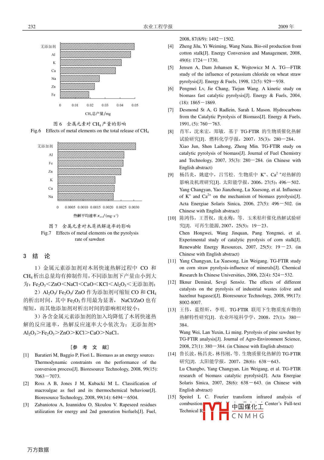第25卷第12期農(nóng)業(yè)工程學(xué)報(bào)VoL 25 No 1282009年12月Transactions of the csaeDec.2009金屬元素對(duì)木屑快速熱解的影響牛艷青,王學(xué)斌,譚厚章,徐通模,惠世恩,趙欽新,周屈蘭(西安交通大學(xué)動(dòng)力工程多相流國(guó)家重點(diǎn)實(shí)驗(yàn)室,西安710049)摘要:采用傅立葉紅外光譜(FIIR)分析,以木屑為研究對(duì)象,在管式爐中研究了AJCa/Fe/K/Na/Zn金屬元素對(duì)生物質(zhì)快速熱解過程中熱解速率以及CO和CH4析出規(guī)律的影響。FIR分析表明:加入含金屬元素添加劑抑制了CO和CH4的產(chǎn)量,添加劑對(duì)CO產(chǎn)量和CH4產(chǎn)量的抑制能力依次為Fe2O3>ZnO>NaCl>CaO>KC1>A2O3;Al2OyFe2O3ZnO作為添加劑可縮短CO和CH4的析出時(shí)間,其中Fe2O3作用最為顯著,其他添加劑對(duì)析出時(shí)間的影響相對(duì)較小。對(duì)熱解速率的統(tǒng)計(jì)分析表明:加入金屬元素降低了生物質(zhì)的快速熱解速率,熱解反應(yīng)速率大小依次為:不加添加劑>Al2O3>Fe O3>Zno>KcI> Cao> NaCl關(guān)鍵詞:生物質(zhì),熱解,一氧化碳,甲烷,木屑,金屬元素,傅立葉紅外光譜doi:10.3969/jiss.1002-6819.2009.12.040中圖分類號(hào):TK6文獻(xiàn)標(biāo)識(shí)碼:A文章編號(hào):1002-6819(2009)-12-022806牛艷青,王學(xué)斌,譚厚章,等.金屬元素對(duì)木屑快速熱解的影響[].農(nóng)業(yè)工程學(xué)報(bào),2009,25(12):228-233Niu Yanqing, Wang Xuebin, Tan Houzhang, et al. Effect of metal elements on sawdust fast-pyrolysis[J]. Transactions of theCSAE, 2009, 25(12): 228-233. (in Chinese with English abstract)言1試驗(yàn)原料與裝置生物質(zhì)燃料不僅氮硫含量低,而且可再生能實(shí)現(xiàn)1.1試驗(yàn)裝置氧化碳的零排放,因此對(duì)生物質(zhì)燃料的利用成為近年來試驗(yàn)系統(tǒng)如圖1所示:99,9%的高純氮?dú)?室溫)研究的熱點(diǎn)。目前世界各國(guó)對(duì)生物質(zhì)能的利用主要集中分為兩路進(jìn)入石英反應(yīng)器中,使反應(yīng)器內(nèi)保持還原氣氛在生物質(zhì)熱化學(xué)轉(zhuǎn)變的研究,而熱解則是生物質(zhì)在熱化木屑和添加物通過石英反應(yīng)器正上方的給料口由一路氮學(xué)轉(zhuǎn)變中最基本和重要的過程14由于生物質(zhì)中灰份高,氣送入,沉降在反應(yīng)器中部的孔板上進(jìn)行反應(yīng),物料混金屬元素含量豐富,其對(duì)生物質(zhì)大分子分解的影響很合均勻:熱解產(chǎn)物引岀后經(jīng)過二級(jí)過濾裝置以脫除煙氣大5,因此有必要對(duì)生物質(zhì)熱解過程中金屬元素的影響進(jìn)攜帶的固體和焦油等,進(jìn)入傅立葉紅外分析儀(FTIR行硏究。已有學(xué)者對(duì)生物質(zhì)熱解過程中金屬元素的影響進(jìn)行在線分析。通過溫控儀控制反應(yīng)器內(nèi)溫度,反應(yīng)結(jié)進(jìn)行了研究,但由于反應(yīng)條件差異很大,得出的結(jié)論未束通入氧氣使反應(yīng)器內(nèi)殘余固體物質(zhì)燃燒后再將反應(yīng)器盡一致: Pen gmei L和 Desmond研究表明白云石(主內(nèi)的固體清空;并對(duì)每種工況均進(jìn)行重復(fù)性驗(yàn)證試驗(yàn)兩要組分為碳酸鎂與碳酸鈣)可以明顯降低生物質(zhì)熱解過次,誤差不超過5%程中的CO和CH4產(chǎn)量;肖軍和楊昌炎等81的研究則分別指出NO和CaO可以促進(jìn)CO和CH4的生成,Ca和K1.管式爐對(duì)CO和CH4析出的影響不大,溫度對(duì)催化作用的影響2.孔板很大; Demirall2的研究則表明A和Na對(duì)生物質(zhì)熱解氣析出量的影響在不同升溫速率下差別也很大。木屑熱解4.氮?dú)馄?.溫控儀產(chǎn)物主要為CO、CH4、CO2、H,且CO和CH4占絕對(duì)6.給料口優(yōu)勢(shì)。文獻(xiàn)[8,13-14]均表明溫度673K時(shí),生物質(zhì)已開始7.石英反應(yīng)器劇烈熱解,因此本文在管式爐上研究了溫度為673K時(shí)8.過濾裝置1不同金屬元素AlCa/le/KNa/Zn對(duì)木屑快速熱解的影響,9.過濾裝置210用傅立葉紅外光譜(FTIR)分析熱解產(chǎn)物—CO和CH4,10.PC機(jī)并對(duì)添加劑對(duì)木屑熱解速率的影響進(jìn)行了統(tǒng)計(jì)分析。11.FTR分析儀圖1試驗(yàn)系統(tǒng)圖收稿日期:20090409修訂日期:200908-17leccrintion nf tect system基金項(xiàng)目:973國(guó)家基礎(chǔ)研究發(fā)展項(xiàng)目(No.2005CB221206);十一五科技中國(guó)煤化工支撐計(jì)劃(No.2006BAK02B03)石英反應(yīng)CNMH Gn,由于物料少作者簡(jiǎn)介:牛艷青(195-),男,山西長(zhǎng)治人,主要從事清潔燃燒技木研避免了物料在孔極上堆:試驗(yàn)前物料于105℃處于烘干究。西安西安交通大學(xué)熱能工程系,710049。 Email: yqniut00l@ yahoo.cl箱內(nèi),試驗(yàn)期間放于干燥器中。電爐由S讠C元件加熱,第12期牛艷青等:金屬元素對(duì)木屑快速熱解的影響石英管中部600mm處于恒溫區(qū)。鉑銠鉑熱電偶用于測(cè)量密度差,為盡量混合充分加入添加劑100mg反應(yīng)區(qū)溫度,該溫度由希曼頓FP93PID溫控儀控制,精表1木屑的工業(yè)分析和元素分析度為士2K,測(cè)點(diǎn)處石英管內(nèi)外溫度相差小于5K。試驗(yàn) Table 1 Industrial analysis and elementary analysis on sav用FTIR為芬蘭 Temet Instruments helsinki公司生產(chǎn)的工業(yè)分析(質(zhì)量分?jǐn)?shù))/%元素分析(質(zhì)量分?jǐn)?shù))/%DX-400系列煙氣分析儀,該儀器可以實(shí)現(xiàn)對(duì)CO和CH水分Ma灰分Aa揮發(fā)份V固定碳Ca氫Had氧Oa4氮Na硫Sad等氣體高精度的在線測(cè)量,測(cè)量精度為測(cè)量值的0.01%。本文選取673K作為研究金屬