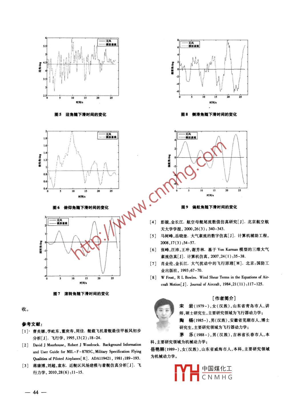 第31卷第7期計(jì)算機(jī)仿真2014年7月文章編號(hào):1006-9348(2014)07-0041-04飛機(jī)下滑對(duì)大氣紊流的動(dòng)力學(xué)響應(yīng)宋巖,陶楊2,茅樂1,岳艷麗(1.海軍航空工程學(xué)院基礎(chǔ)實(shí)驗(yàn)部,山東煙臺(tái)264001;2海軍航空工程學(xué)院研究生管理大隊(duì),山東煙臺(tái)264001)摘要:為了仿真大氣紊流下的飛機(jī)著艦下滑過(guò)程中的動(dòng)力學(xué)響應(yīng),引入了三維的大氣素流模型并將紊流速度以及紊流速度梯度的影響加入到飛機(jī)下滑過(guò)程的動(dòng)力學(xué)模型中,建立了過(guò)程中飛機(jī)的六自由度飛行動(dòng)力學(xué)模型。同時(shí)引入了 Von Karman大氣紊流模型并生成了工程化的紊流風(fēng)場(chǎng)。在建?;A(chǔ)上,分析了紊流速度和紊流速度梯度對(duì)飛機(jī)的影響并采用數(shù)值方法仿真了飛機(jī)下滑穿越紊流的全過(guò)程。結(jié)果表明,大氣紊流的存在會(huì)造成飛機(jī)的飛行姿態(tài)無(wú)法保持穩(wěn)定,并會(huì)最終導(dǎo)致實(shí)際著艦點(diǎn)偏離理想著艦點(diǎn),影響飛機(jī)的安全回收關(guān)鍵詞:大氣紊流;紊流速度;紊流速度梯度;動(dòng)力學(xué)模型中圖分類號(hào):V212.11文獻(xiàn)標(biāo)識(shí)碼:BThe Dynamic Responses of the Aircrafts Glidethrough the Atmospheric TurbulenceSONG Yan', TAO Yang, MAO Le, YUE Yan-Ii'(1. Basic Test Department, Naval Aeronautical and Astronautical University, Yantai Shandong 264001,China2. Postgraduate Training Brigade, Naval Aeronautical and Astronautical University, Yantai Shandong 264001, ChinaABSTRACT: In order to simulate the dynamic responses of the aircraft's approaching and landing on the carrierthrough the atmospheric turbulence, a flight dynamic model of six-degree-of-freedom aircraft is presented. The VonKarman atmospheric turbulence model is implemented, and the engineered turbulence flowthe influence of the velocity and its grads of turbulence is analyzed and the numerical methods are conducted to simu-late the process of the aircrafts flight through the turbulence. The result shows that the existing of the atmospheric tur-bulence will affect the stability of the aircrafts flight posture, and the real landing point will be apart from the idealone and the safety of the aircraft's recovering will be affectedKEYWORDS: Atmospheric turbulence; Velocity of turbulence; Velocity grads of turbulence; Dynamic model1引言過(guò)仿真分析了僅在單一存在大氣紊流條件下飛機(jī)下滑過(guò)程航空母艦是一個(gè)尺度有限的海上浮動(dòng)平臺(tái),飛機(jī)在航母的動(dòng)力學(xué)特性。上的進(jìn)場(chǎng)著艦是一種要求非常嚴(yán)格的飛行任務(wù)。一直以來(lái)飛機(jī)進(jìn)艦著艦安全性是相關(guān)研究者最為關(guān)心的問(wèn)題。而2大氣紊流模型在該階段,飛機(jī)會(huì)遇到大氣紊流的影響。開展大氣紊流對(duì)飛大氣紊流是指疊加在平均風(fēng)上的連續(xù)隨機(jī)脈動(dòng),它和風(fēng)機(jī)進(jìn)艦著艦安全性影響的研究,對(duì)于保證飛機(jī)的著艦安全、疊加而成的風(fēng)場(chǎng)是對(duì)飛機(jī)正常飛行作業(yè)有重要影響的一類提高著艦精度十分必要。國(guó)外在這一方面起步較早,尤其是大氣、空間環(huán)境2。目前有兩個(gè)較成熟的大氣紊流模型,美國(guó)針對(duì)飛機(jī)海上作業(yè)風(fēng)場(chǎng)對(duì)飛機(jī)著艦的影響進(jìn)行了大量 Dryden模型和 Von Karman模型。雖然按照NS方程連續(xù)的試驗(yàn),并且得出了一系列相應(yīng)的飛行品質(zhì)標(biāo)準(zhǔn)。而國(guó)內(nèi)方程及其它一些條件紊流是確定性的然而實(shí)際上不可能研究多以艦尾流14和側(cè)風(fēng)的影響為主對(duì)大氣素流產(chǎn)生則直接積分來(lái)計(jì)算紊流紊流現(xiàn)象必須用隨機(jī)過(guò)程理論和方法多為建模方面的工作(6,但對(duì)其造成的影響研究較少。來(lái)描述。比較兩種常用的紊流模型, Von Karman模型是基于本文引入了三維的大氣紊流模型并將紊流速度以及紊實(shí)測(cè)大氣紊流而得出的它的頻譜函數(shù)高頻段斜率是-5/3流速度梯度的影響加入到飛機(jī)下滑過(guò)程的動(dòng)力學(xué)模型中,通Drdm模型是中國(guó)煤化工-2,與 Von Kar-man模型相比CNMHG高頻響應(yīng)。因收稿日期:2013-06-24此,對(duì)于高逼真度的飛行仿真而言 Von Karman模型是首選。Von Karman模型的空間頻譜函數(shù)為21中-(-1)2+-(42-4)網(wǎng)++lN(a)1(14-12)p-ln(p2-2)+Meφ(m)=o[1+(2aL、m)2(1)d-[(4-1)l+lq+[-(,-1),門+L+NΦ(』)=σL1+(8/3)(2aLm)2[1+(2aL)2]另外,還需補(bǔ)充轉(zhuǎn)動(dòng)的運(yùn)動(dòng)學(xué)微分方程式(5)和角度關(guān)系式(6)來(lái)使模型封閉3飛機(jī)下滑動(dòng)力學(xué)模型dtP tane( gsind coso)考慮到紊流風(fēng)場(chǎng)對(duì)飛機(jī)下滑的影響,在模型建立中需考慮風(fēng)的附加項(xiàng)。為方便表述,定義突風(fēng)迎角a和突風(fēng)側(cè)滑dt- gcos- rsin(5)角Bsing+ rose=a-a4=-/V(2)B, =B-B =-v,/vsinak=I cosy[ cosopsinecos(y-x)+這樣,飛機(jī)質(zhì)心運(yùn)動(dòng)方程可用式(3)來(lái)表示sImpsOn(ψ-x)]-dvnycosccos]l/cosBm dt teos(o +a-a )cos(B-B ) Yeos(B-B )sina,sinB. =cosy[ sinapineQ[ sinBsin(B-B,)+cosBcos(B-B)cosa, ]'coSopsIn(ψ-x)]-(6)Z[sin(B-B )cosB-cos(B-B)sinBcosa]n(ψ-x)]mV cosy d=Tl-coyusin(B-B )eos(o+a-a)+cosysinocosel/cosBY[sinuosa. -cousin(B-B.)sina, ]模型求解Q[ sinucosBsina,-couusinBcos(B-B )為了計(jì)算飛機(jī)對(duì)大氣紊流的響應(yīng),需要以時(shí)間頻率a為cousin(