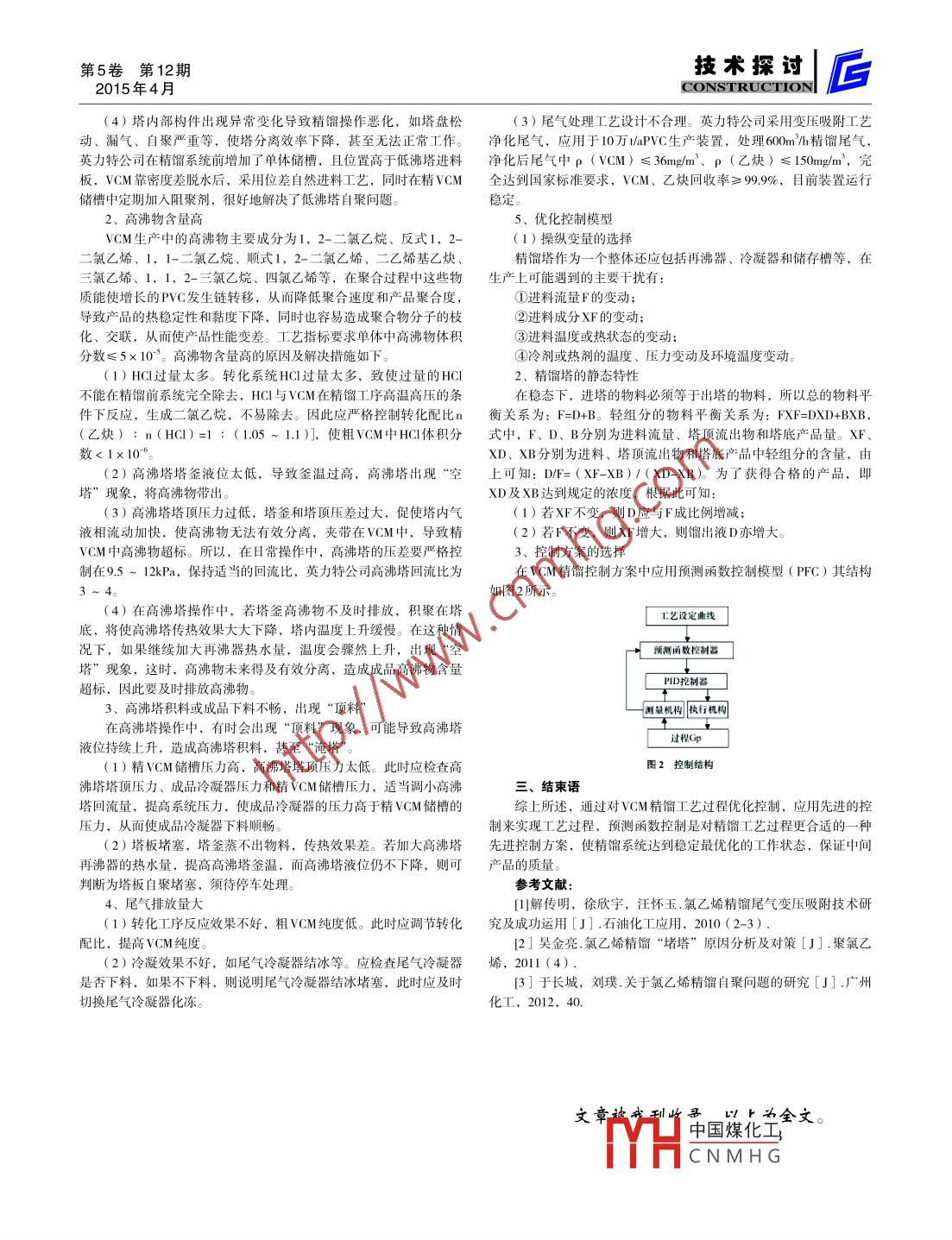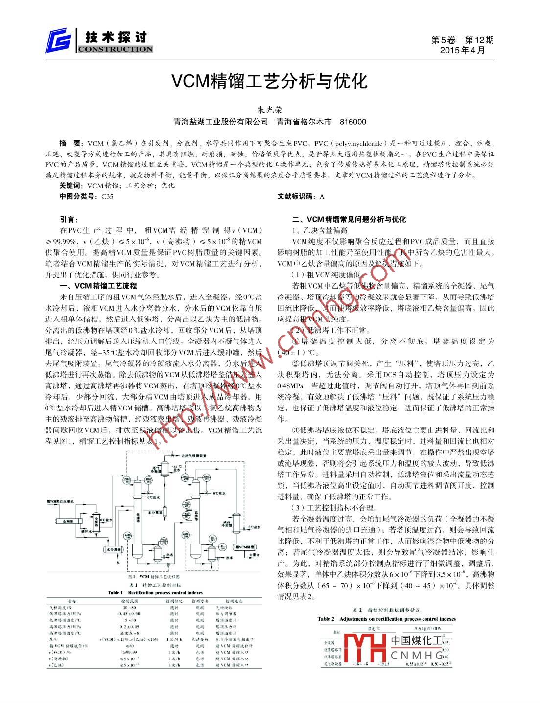 后L技術(shù)探過(guò)第5卷第12期CONSTRUCTION2015年4月VCM精餾工藝分析與優(yōu)化朱光榮青海鹽湖工業(yè)股份有限公司青海省格爾木市816000摘要:vCM(氯乙烯)在引發(fā)劑、分散劑、水等共同作用下可聚合生成 PVCa Pvc( polyvinychloride)是一種可邐過(guò)模壓、捏合、注塑壓延、吹塑等方式進(jìn)行加工的產(chǎn)品,其具有阻燃,耐磨損,耐蝕,價(jià)格低廉等優(yōu)點(diǎn),是世界五大通用熱塑性樹脂之一。在PVC生產(chǎn)過(guò)程中要保證PvC的產(chǎn)品質(zhì)量,VCM精餾的過(guò)程至關(guān)重要,VCM精餾是一個(gè)典型的化工操作單元,包含了傳質(zhì)傳熱等基本化工原理,精餾塔的控制系統(tǒng)必須滿足精餾過(guò)程本身的規(guī)律,就是物料平衡,能量平衡,以保證分離鮚果的濃度合乎質(zhì)量要求。文章對(duì)M精餾過(guò)程的工藝流程進(jìn)行了分析關(guān)鍵詞:VCM精餾;工藝分析;優(yōu)化中圖分類號(hào):C35文獻(xiàn)標(biāo)識(shí)碼引言vcM精餾常見(jiàn)問(wèn)題分析與優(yōu)化在PVC生產(chǎn)過(guò)程中,粗VCM需經(jīng)精餾制得v(ⅤCM)1、乙炔含量偏高≥99.9%,v(乙炔)≤5×10°,v(高沸物)≤5×10-3的精ⅤCMCM純度不僅影響聚合反應(yīng)過(guò)程和PVC成品質(zhì)量,而且直接供聚合使用。提高精ⅤCM質(zhì)量是保證PVC樹脂質(zhì)量的關(guān)鍵因素。影響樹脂的加工性能乃至使用性能。其中所含乙炔的危害性最大。筆者結(jié)合ⅤCM精餾生產(chǎn)的實(shí)際情況,對(duì)ⅤCM精餾工藝進(jìn)行分析,ⅤCM中乙炔含量偏高的原因及解決措施如下提出了優(yōu)化措施,供同行業(yè)參考。(1)粗VCM純度偏低。vcM精餾工藝流程若粗VCM中乙炔等低沸物含量偏高,精餾系統(tǒng)的全凝器、尾氣來(lái)自壓縮工序的粗VCM氣體經(jīng)脫水后,進(jìn)入全凝器,經(jīng)0℃鹽冷凝器、塔頂冷卻器等的冷凝效果就會(huì)顯著下降,從而導(dǎo)致低沸塔水冷卻后,液相vCM進(jìn)人水分離器分水,分水后的vcM依靠自壓回流比降低,進(jìn)而使塔板效率降低,塔底液相乙炔含量偏高。因此進(jìn)入粗單體儲(chǔ)槽,然后進(jìn)入低沸塔,分離出以乙炔為主的低沸物。應(yīng)提高粗ⅤCM的純度分離出的低沸物在塔頂經(jīng)0℃鹽水冷卻,回收部分ⅤCM后,從塔頂(2)低沸塔工作不正常排出,經(jīng)壓力調(diào)解后送入壓縮機(jī)人口管線。全凝器內(nèi)不凝氣體進(jìn)入①塔釜溫度控制太低,分離不徹底。塔釜溫度設(shè)定為尾氣冷凝器,經(jīng)-35℃鹽水冷卻回收部分ⅤCM后進(jìn)入緩沖罐,然后(40±1)℃。去尾氣吸附裝置。尾氣冷凝器的冷凝液流入水分離器,分水后進(jìn)入②低沸塔頂調(diào)節(jié)閥關(guān)死,產(chǎn)生“壓料”,使塔頂壓力過(guò)高,乙低沸塔進(jìn)行再次蒸餾。除去低沸物的VCM從低沸塔塔釜借壓差進(jìn)入炔積聚塔內(nèi),無(wú)法分離。采用DCS自動(dòng)控制,塔頂壓力設(shè)定為高沸塔,通過(guò)高沸塔再沸器將ⅤCM蒸岀,在塔頂冷凝器經(jīng)θ℃鹽水0.48Ma,當(dāng)超過(guò)此值時(shí),調(diào)節(jié)閥自動(dòng)打開(kāi),塔頂氣體再冋到前系冷卻后,少部分回流,大部分精ⅤCM由塔頂進(jìn)人成品冷卻器,用統(tǒng)冷凝,有效地解決了低沸塔“壓料”問(wèn)題,既保證了系統(tǒng)壓力穩(wěn)o℃鹽水冷卻后進(jìn)人精CM儲(chǔ)槽。高沸塔塔底以二氯乙烷高沸物為定,也保證了低沸塔溫度和液位穩(wěn)定,進(jìn)而保證了低沸塔的正常操主的殘液排至高沸物儲(chǔ)槽,經(jīng)殘液蒸岀塔、殘液再沸器、殘液冷凝作器間歇回收VCM后,排放至殘液儲(chǔ)槽以備出售。VCM精餾工藝流③低沸塔塔底液位不穩(wěn)定。塔底液位主要由進(jìn)料量、回流比和程見(jiàn)圖1,精餾工藝控制指標(biāo)見(jiàn)表1采出量決定,當(dāng)系統(tǒng)的壓力、溫度穩(wěn)定時(shí),進(jìn)料量和回流比也相對(duì)去尾氣附裝置穩(wěn)定,此時(shí)液位主要靠塔底采出量來(lái)調(diào)節(jié)。在操作中嚴(yán)禁岀現(xiàn)空塔或淹塔現(xiàn)象,否則將會(huì)引起系統(tǒng)壓力和溫度的較大波動(dòng),導(dǎo)致低沸塔工作異常。進(jìn)料量釆用自動(dòng)控制,低沸塔液位和采出流量動(dòng)態(tài)連鎖,當(dāng)?shù)头兴何桓叱鲈O(shè)定值時(shí),自動(dòng)調(diào)節(jié)進(jìn)料調(diào)節(jié)閥開(kāi)度,控制粗vC城來(lái)自壓吧機(jī)進(jìn)料量,確保了低沸塔的正常工作(3)工藝控制指標(biāo)不合理。全福器若全凝器溫度過(guò)高,會(huì)增加尾氣冷凝器的負(fù)荷(全凝器的不凝雌本氣相和尾氣冷凝器的進(jìn)口連通);若塔頂溫度過(guò)高,則會(huì)導(dǎo)致回流比降低,不利于低沸塔的正常工作,從而影響混合物中低沸物的分國(guó)離;若尾氣冷凝器溫度太低,則會(huì)導(dǎo)致尾氣冷凝器結(jié)冰,影響產(chǎn)。為此,對(duì)精餾系統(tǒng)部分控制點(diǎn)指標(biāo)進(jìn)行了細(xì)微調(diào)整,調(diào)整后圖1OM精餾工藝流圖效果顯著,單體中乙炔體積分?jǐn)?shù)從6×10°下降到3.5×10°,高沸物表1精餾工藝控制指標(biāo)體積分?jǐn)?shù)從(65~70)×10°下降到(40~45)×10-°。具體調(diào)整Table 1 Rectification process control indexes情況見(jiàn)表2??刂品秶鷼獬雀叨鹊脷夤褚罕?精餾控制指標(biāo)調(diào)整情況Table 2 Adjustments on rectification process control indexes度/℃沸頂度北點(diǎn)+8CN)<15%,乙炔)<151次h色語(yǔ)分析囈氣冷疑器氣相出