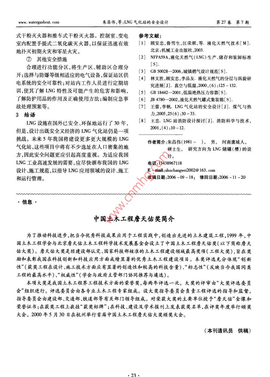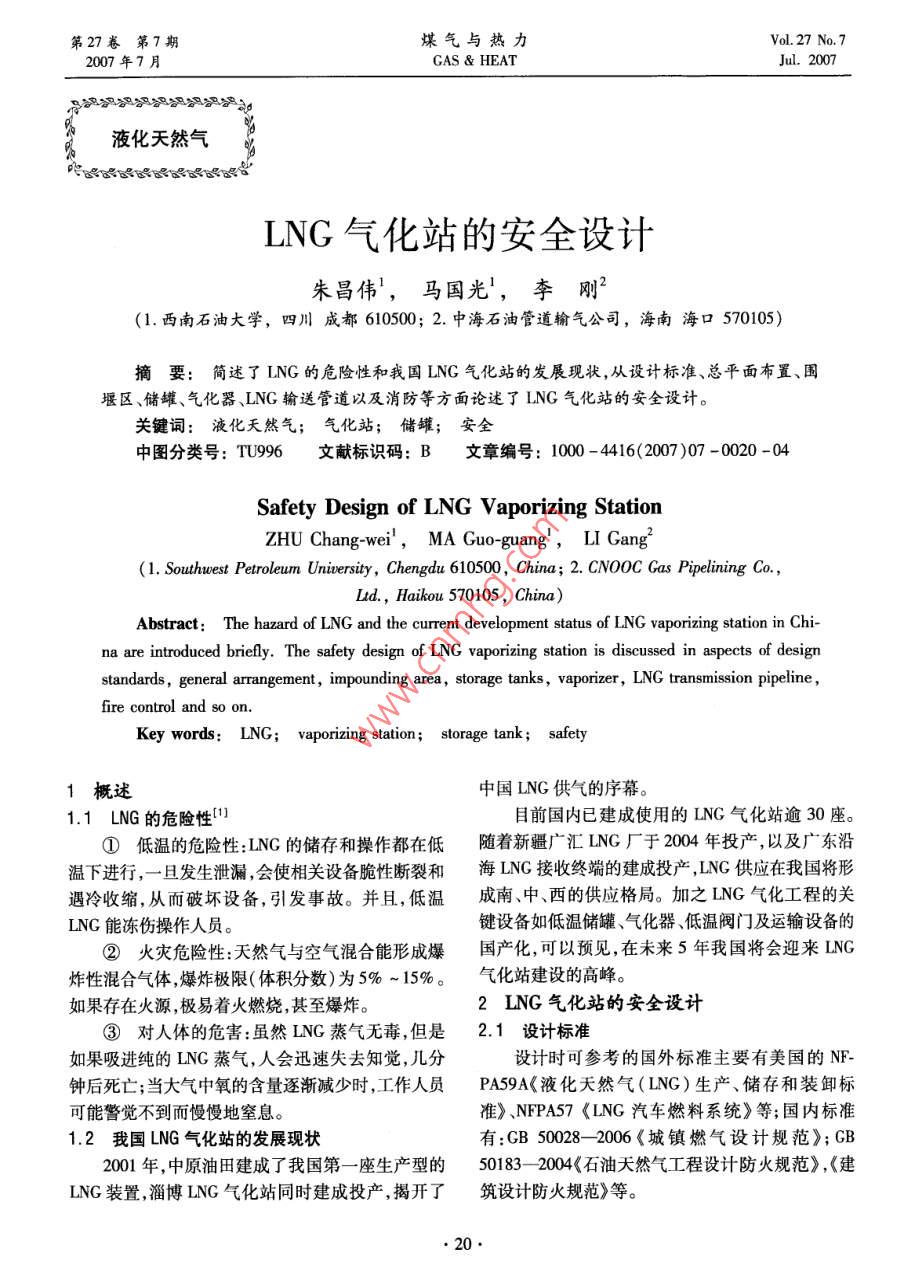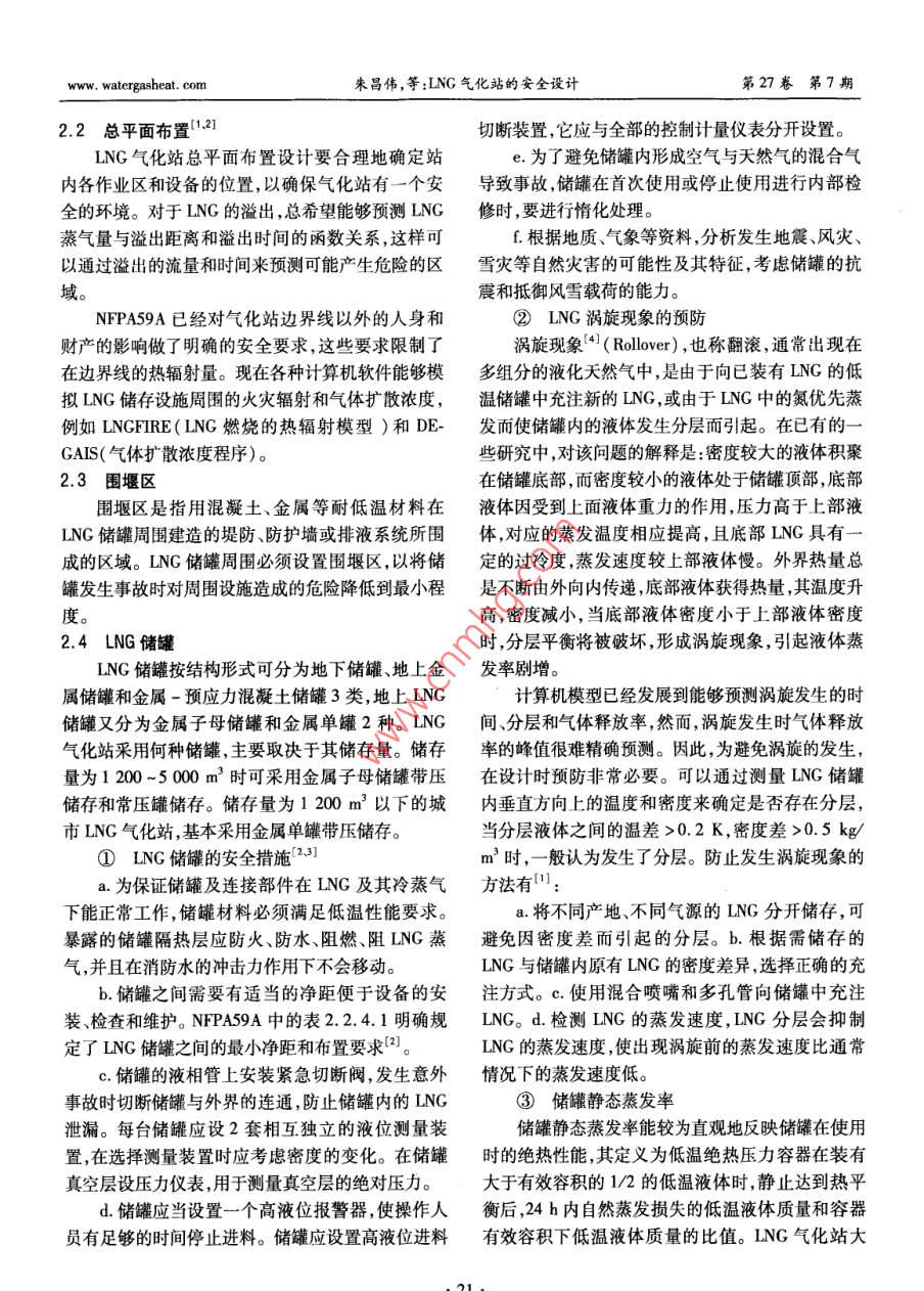 第27卷第7期煤氣與熱力Vol.27 No.72007年7月GAS & HEATJul. 2007液化天然氣LNG氣化站的安全設(shè)計(jì)朱昌偉',馬國光',李剛2(1.西南石油大學(xué),四川成都610500; 2.中海石油管道輸氣公司,海南???70105)摘要:簡述了LNG的危險(xiǎn)性和我國LNG氣化站的發(fā)展現(xiàn)狀,從設(shè)計(jì)標(biāo)準(zhǔn)、 總平面布置、圍堰區(qū)、儲罐、氣化器、LNG輸送管道以及消防等方面論述了LNG氣化站的安全設(shè)計(jì)。關(guān)鍵詞:液化天然氣; 氣化站; 儲罐;安全中圖分類號: TU996文獻(xiàn)標(biāo)識碼: B文章編號: 1000 -4416(2007 )07 -0020 -04Safety Design of LNG Vaporizing StationZHU Chang-wei',MA Guo-guang',LI Gang2(1. Southwvest Petroleum Uniersity, Chengdu 610500, China; 2. CNOOC Gas Pipelining Co,Lud, Haikou 570105,China)Abstract: The hazard of LNG and the current development status of LNG vaporizing station in Chi-na are introduced briefly. The safety design of LNG vaporizing station is discussed in aspects of designstandards,general arrangement, impounding area, storage tanks, vaporizer, LNG transmission pipeline,fire control and so on.Key words: LNG; vaporizing station; storage tank; safety1概述中國LNG供氣的序幕。1.1 LNG 的危險(xiǎn)性["]目前國內(nèi)已建成使用的LNG氣化站逾30座。①低溫的危險(xiǎn) 性:LNG的儲存和操作都在低隨著新疆廣匯LNG廠于2004年投產(chǎn),以及廣東沿溫下進(jìn)行,一-旦發(fā)生泄漏,會使相關(guān)設(shè)備脆性斷裂和海LNG接收終端的建成投產(chǎn),LNG供應(yīng)在我國將形遇冷收縮,從而破壞設(shè)備,引發(fā)事故。并且,低溫成南、中、西的供應(yīng)格局。加之LNG氣化工程的關(guān)LNG能凍傷操作人員。鍵設(shè)備如低溫儲罐、氣化器、低溫閥門及運(yùn)輸設(shè)備的②火災(zāi)危險(xiǎn)性:天然氣與空氣混合能形成爆國產(chǎn)化,可以預(yù)見,在未來5年我國將會迎來LNG炸性混合氣體,爆炸極限(體積分?jǐn)?shù))為5% ~ 15%。氣化站建設(shè)的高峰。如果存在火源,極易著火燃燒,甚至爆炸。2 LNG氣化站的安全設(shè)計(jì)③對人體的危害:雖然 LNG蒸氣無毒,但是2.1設(shè)計(jì)標(biāo)準(zhǔn)如果吸進(jìn)純的LNG蒸氣,人會迅速失去知覺,幾分設(shè)計(jì)時可參考的國外標(biāo)準(zhǔn)主要有美國的NF-鐘后死亡;當(dāng)大氣中氧的含量逐漸減少時,工作人員PA59A《液 化天然氣(LNG)生產(chǎn)、儲存和裝卸標(biāo)可能警覺不到而慢慢地窒息。準(zhǔn)》、NFPA57《LNG汽車燃料系統(tǒng)》等;國內(nèi)標(biāo)準(zhǔn)1.2我國LNG氣化站的發(fā)展現(xiàn)狀有:GB 50028- -2006《城 鎮(zhèn)燃?xì)庠O(shè)計(jì)規(guī)范》; GB2001年,中原油田建成了我國第一座生產(chǎn)型的50183- -2004《石油天然氣工程 設(shè)計(jì)防火規(guī)范》,《建LNG裝置,淄博LNG氣化站同時建成投產(chǎn),揭開了筑設(shè)計(jì)防火規(guī)范》等。20.www. watergasheat. com朱昌偉,等:LNG氣化站的安全設(shè)計(jì)第27卷第7期2.2總平面布置[1.21切斷裝置,它應(yīng)與全部的控制計(jì)量儀表分開設(shè)置。LNG氣化站總平面布置設(shè)計(jì)要合理地確定站e.為了避免儲罐內(nèi)形成空氣與天然氣的混合氣內(nèi)各作業(yè)區(qū)和設(shè)備的位置,以確保氣化站有一個安導(dǎo)致事故,儲罐在首次使用或停止使用進(jìn)行內(nèi)部檢全的環(huán)境。對于LNG的濫出,總希望能夠預(yù)測LNG修時,要進(jìn)行惰化處理。蒸氣量與溢出距離和溢出時間的函數(shù)關(guān)系,這樣可f.根據(jù)地質(zhì)氣象等資料,分析發(fā)生地震、風(fēng)災(zāi)、以通過溢出的流量和時間來預(yù)測可能產(chǎn)生危險(xiǎn)的區(qū)雪災(zāi)等自然災(zāi)害的可能性及其特征,考慮儲罐的抗域。震和抵御風(fēng)雪載荷的能力。NFPA59A已經(jīng)對氣化站邊界線以外的人身和②LNG渦旋現(xiàn)象的預(yù)防財(cái)產(chǎn)的影響做了明確的安全要求,這些要求限制了渦旋現(xiàn)象[4)( Rollover) ,也稱翻滾,通常出現(xiàn)在在邊界線的熱輻射量?,F(xiàn)在各種計(jì)算機(jī)軟件能夠模多組分的液化天然氣中,是由于向已裝有LNG的低擬LNG儲存設(shè)施周圍的火災(zāi)輻射和氣體擴(kuò)散濃度,溫儲罐中充注新的LNG ,或由于LNG中的氮優(yōu)先蒸例如LNGFTRE( LNG燃燒的熱輻射模型)和DE-發(fā)而使儲罐內(nèi)的液體發(fā)生分層而引起。在已有的一GAIS(氣體擴(kuò)散濃度程序)。些研究中,對該問題的解釋是:密度較大的液體積聚2.3圍堰區(qū)在儲罐底部,而密度較小的液體處于儲罐頂部,底部圍堰區(qū)是指用混凝土、金屬等耐低溫材料在液體因受到上面液體重力的作用,壓力高于上部液LNG儲罐周圍建造的堤防、防護(hù)墻或排液系統(tǒng)所圍體,對應(yīng)的蒸發(fā)溫度相應(yīng)提高,且底部LNG具有一成的區(qū)域。LNG儲罐周圍必須設(shè)置圍堰區(qū),以將儲定的過冷度,蒸發(fā)速度較上部液體慢。外界熱量總罐發(fā)生事故時對周圍設(shè)施造成的危險(xiǎn)降低到最小程是不斷由外向內(nèi)傳遞,底部液體獲得熱量,其溫度升度。高,密度減小,當(dāng)?shù)撞恳后w密度小于上部液體密度2.4 LNG儲罐時,分層平衡將被破壞,形成渦旋現(xiàn)象,引起液體蒸LNG儲罐按結(jié)構(gòu)形式可分為地下儲罐、地上金發(fā)率劇增。屬儲罐和金屬-預(yù)應(yīng)力混凝土儲罐3類,地上LNG計(jì)算機(jī)模型已經(jīng)發(fā)展到能夠預(yù)測渦旋發(fā)生的時儲罐又分為金屬子母儲罐和金屬