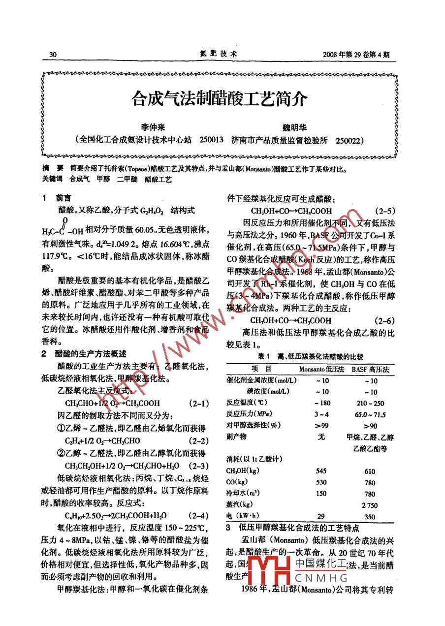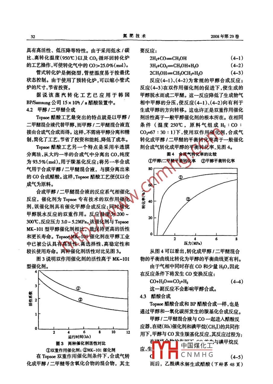 氮肥技術(shù)2008年第29卷第4期合成氣法制醋酸工藝簡介李仲來魏明華(全國化工合成氨設(shè)計技術(shù)中心站250013濟(jì)南市產(chǎn)品質(zhì)量監(jiān)督檢驗所25002)摘要簡要介紹了托普索( Topsoe)醋酸工藝及其特點并與孟山都( Monsanto0)醋酸工藝作了某些對比。關(guān)鍵詞合成氣甲醇二甲醚醋酸工藝1前言件下經(jīng)羰基化反應(yīng)可生成醋酸醋酸又稱乙酸,分子式C2HAO2結(jié)構(gòu)式CH,OH+CO-+CH, COOH(2-5)因反應(yīng)壓力和所用催化劑不同,又有低壓法HC-C-0H相對分子質(zhì)量6006,色透明液體,與高壓法之分。1900年,BASF公司開發(fā)了Q1系有刺激性氣味。d210492熔點1604℃,沸點催化劑在高壓(650~1.MPa)條件下,甲醇與119℃。<16℃時能結(jié)晶成冰狀固體稱冰醋Co羰基化合成醋酸(K反應(yīng))的工藝稱作高壓酸。甲醇羰基化合成法。1968年,孟山都( Monsanto)公醋酸是極重要的基本有機(jī)化學(xué)品,是醋酸乙司開發(fā)了Rh-系催化劑,使CHQH與CO在低烯醋酸纖維素、醋酸酯、對苯二甲酸等多種產(chǎn)品壓(3-4MPa)下羰基化合成醋酸稱作低壓甲醇的原料。廣泛地應(yīng)用于幾乎所有的工業(yè)領(lǐng)域在羰基化合成法。兩種工藝的主反應(yīng):未來較長時間內(nèi),也許還沒有一種有機(jī)酸可取代CHOH+CO→ CH,COOH(2-6)它的位置。冰醋酸還用作酸化劑、增香劑和食品高壓法和低壓法甲醇羰基化合成乙酸的比香料。較見表1。2醋酸的生產(chǎn)方法概述襄1高、低壓羰基化法醋酸的比較醋酸的工業(yè)生產(chǎn)方法主要有:乙醛氧化法,Monsanto低H法BASF高壓法低碳烷烴液相氧化法,甲醇羰基化法。催化劑金屬濃度(mo/L)乙醛氧化法主反應(yīng)式:碘濃度(moL)CH_CHO+1/ 02+CH3COOH(2-1)反應(yīng)溫度(℃)180因乙醛的制取方法不同而又分為:反應(yīng)壓力(MPa)①乙烯-乙醛法即乙醛由乙烯氧化而獲得對甲醇選擇性(%)>99C2H4+In 02+CH,CHO(2-2)副產(chǎn)物無甲烷、乙醛、乙醇②乙醇-乙醛法即乙醛由乙醇氧化而獲得乙酸乙酯等消耗(以1t乙酸計)CH,CH OH+1n 0+CH CHO+H,0(2-3)CHOH(kg低碳烷烴液相氧化法丙烷、丁烷、C烷烴co(kg)或輕油都可用作生產(chǎn)醋酸的原料。以丁烷作原料冷卻水(m)時醋酸的收率較高。反應(yīng)式:蒸汽(kg)2750C,Ho+2.50-2CH, COOH+H,0 (2-4) 4(kW.h)氧化在液相中進(jìn)行,反應(yīng)溫度150~225℃,3低壓甲醇羰基化合成法的工藝特點壓力4~8MPa,以鈷、錳、鎳、鉻等的醋酸鹽為催孟山都( Monsanto)低壓羰基化合成法的興化劑。低碳烷烴液相氧化法所用原料較為廣泛,起是醋酸生產(chǎn)的一次革命。從20世紀(jì)70年代價格相對便宜但選擇性低氧化產(chǎn)物品種多因起,國中國煤化工法,是當(dāng)前醋而必須考慮副產(chǎn)物的回收和利用酸生產(chǎn)CNMHG甲醇羰基化法:甲醇和一氧化碳在催化劑條1986年孟山都( Monsanto)公司將其專利轉(zhuǎn)第4期李仲來等:合成氣法制醋酸工藝簡介讓給英國石油(BP)公司,而使BP公司成為低壓1996年上海吳涇化工公司從英國BP公司引羰基化法生產(chǎn)醋酸技術(shù)的控制者BP公司又對某進(jìn)一套15×10%a醋酸裝置,投資6000萬美元些工序做了改進(jìn),獨具特色,被稱為 BP/Monsanto1998年四川維尼龍廠(揚子江乙酰化工公司)與醋酸工藝BP公司合資建設(shè)一套15×10ta低壓甲醇羰基(1)該工藝所需CO由天然氣蒸汽轉(zhuǎn)化獲得。化醋酸裝置??偼顿Y超過20億元人民幣,后又?jǐn)U先脫除轉(zhuǎn)化氣中的CO2,并將CO2送回轉(zhuǎn)化爐以能至20×10%a彌補碳的不足。再采用深度冷凍法將轉(zhuǎn)化氣中的4托普索( Topsoe)醋酸工藝CH4、CO和H2分離。甲烷送回轉(zhuǎn)化爐,氫氣作轉(zhuǎn)BP/Monsanto醋酸工藝是以甲醇為原料所需化用燃料。CO由天然氣轉(zhuǎn)化(或由水煤氣)而獲得。甲醇是(2)分離出來的CO和外購甲醇進(jìn)行甲醇羰重要的有機(jī)化工原料之一,貨源和價格常有波基化反應(yīng)。反應(yīng)選用銠(Rh)-碘(I)系催化劑。動,因而 BP/Monsanto法醋酸的成本和效益自然(3)由Rbh、CO、I共同構(gòu)成的催化活性中間要受到甲醇價格的制約。體——二碘二羰基銠[Rh(CO)2I2,是銠的羰基和托普索( Topsoe)醋酸工藝則以單一天然氣碘的絡(luò)合物,是低壓甲醇羰基化催化劑的活性組(或煤)為原料。制取甲醇所需的合成氣以及羰基分。其反應(yīng)過程為化反應(yīng)所需的CO,均來自天然氣轉(zhuǎn)化或煤氣化,①反應(yīng)初碘甲烷與絡(luò)合物二碘二羰基銠先由合成氣分兩步制取醋酸:第一步在有催化劑條發(fā)生氧化加成反應(yīng)件下,由合成氣制成甲醇和二甲醚;第二步在催cH+Rh(CO)2I2+CHRh(CO)2l3(3-1)化劑條件下由甲醇和二甲醚(不經(jīng)分離和提純)②繼而發(fā)生CO的配位絡(luò)合:和CO進(jìn)行羰基化反應(yīng),生成醋酸。因此 TopsoeCHRh(CO)I3→ CH,RhCO-(CO)I3(3-2)法也被稱為合成氣二步法醋酸工藝。③一氧化碳的順式插入形成?;j(luò)合物托普索( Topsoe)醋酸工藝裝置主要由蒸汽轉(zhuǎn)CH,_RhCO-(CO)I+CO→+ CH,RhCO-(CO)化、甲醇/二甲醚合成、醋酸合成催化劑回收、醋(3-3)酸提純、尾氣處理等工序組成。同時采用膜分離④酰基絡(luò)合物水解生成醋酸:法提取羰基化反應(yīng)所需的一氧化碳。CH RhCO-(CO2I3+H→工藝流程見圖CH,COOH+Rh(Co),I+HI(3-4)⑤甲醇與碘化氫反應(yīng)生成碘甲烷:CH,OH+HI-CH3I +H,0(3-5)⑥碘甲烷再與絡(luò)合物二碘二羰基銠反應(yīng),重H, CI復(fù)反應(yīng)(3-1),構(gòu)成循環(huán)。其總反應(yīng)式膜分離CH4OH+CO→ CH COOH(3-