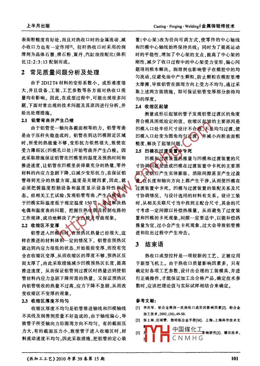 上半月出版Casting· Forging· Welding!金屬鑄鍛焊技術(shù)拉桿熱收口工藝研究鄭貴全(沈陽飛機(jī)工業(yè)(集團(tuán))有限公司,遼寧沈陽110034)摘要:在對鋁合金2D12T4拉桿管材毛料進(jìn)行熱收口時(shí),由于設(shè)備、工裝、工藝參數(shù)等對收口質(zhì)量影響很大并且材料的變形系數(shù)很小,成形難度很高,所以可能出現(xiàn)鋁管彎曲并產(chǎn)生凸棱收縮區(qū)厚度不均起皺等缺陷。針對常出現(xiàn)的缺陷,對該工藝過程作了研究,分析了缺陷產(chǎn)生的原因,并給出了解決措施。實(shí)踐證明,這些措施對保證和提高拉桿熱收口質(zhì)量是有效的。關(guān)鍵詞:拉桿;熱收口;鋁合金2D12T4中圖分類號(hào):TG3762文獻(xiàn)標(biāo)識(shí)碼:A文章編號(hào):1001-38142010)15009903Research on Hot Shell Nosing Process for StrutZHENG Guiquan(Shenyang Aircraft Corporation, Shenyang 110034, China)Abstract: The equipment, process tools and process parameters have great influence on the quality of hot shell nosingparts,and the material deformation coefficient is so small that forming is very hard, so the bend and edge of Al strut, theuneven thickness and wrinkle in closing area and so on may occur during hot closing the aluminum alloy 2D12 T4 strut.Aiming at the defects, the hot shell nosing process was researched, the causes were analyzed, and some measures wereguarantee the quality of hot shell nosing partsey words: strut; hot shell nosing; aluminum alloy 2D12 T4熱收口工藝方法屬于金屬熱成型范疇,它是將和剖切內(nèi)形分別見圖1、2。拉桿熱收口工藝流程主定壁厚尺寸的金屬管件端頭局部在專用設(shè)備上逐要工序有下料、毛坯加熱成型。步加熱到一定溫度逐漸鐓粗成形,使管子端頭直徑不變或變小而壁厚增大,滿足尺寸要求并在內(nèi)腔形成一定形狀的一種加工方法。采用熱收口工藝加工的飛機(jī)操縱系統(tǒng)拉桿,結(jié)構(gòu)簡單,安裝方便,加工工序少,成本低,是較理想的操縱系統(tǒng)拉桿結(jié)構(gòu)方式。使用熱收口工藝加工飛機(jī)操縱系統(tǒng)鋁合金拉圖熱收口后零件圖2熱收口后零件剖切內(nèi)形桿,由于設(shè)備、工裝、工藝參數(shù)等方面對收囗質(zhì)量影Fig 1 Part after hotFig 2 Partial section after ho響很大,并且材料的變形系數(shù)很小,成形難度很高shell nosing在成型過程中,經(jīng)常出現(xiàn)許多問題,報(bào)廢率高嗎。本1,1下料文對該拉桿的熱收口工藝過程進(jìn)行了研究,確定了擠壓和鐓粗時(shí),毛坯理論長度在體積為常數(shù)的常見問題的原因,并制定了有效的解決措施。條件下進(jìn)行計(jì)算,見圖3。1拉桿及其工藝流程介紹拉桿材料為鋁合金2D12T4,熱收口后的零件收稿日期:20100206中國煤化工圖作者簡介:鄭貴全(1976-),男,遼寧丹東人,工程師,主要研究方向:金屬成形工藝;電話:02486595202CNMHGhell nosingE-mail:zhengguiquan76@163.com毛坯理論長度L按下列公式計(jì)算:《熱加工工藝》2010年第39卷第15期金屬鑄鍛焊技術(shù) Casting· Forging· Welding2010年8月L=L2+20. 131d-D1(D+D, +dxd -(d+dY-DxD,0785(D-式中:L1為零件擠壓部分長度;D1為零件擠壓部分變形區(qū)毛坯過渡區(qū)外徑;d為零件擠壓部分內(nèi)徑;L2為零件未擠壓部分C變形區(qū)初始截面D.凹模起始區(qū)長度;D為毛坯外徑;d為毛坯內(nèi)徑;a為圓椎和圓柱同一母線形成的銳角。零件擠壓柱形部分內(nèi)徑d1按下列公式計(jì)算d=d3+28式中:d為拉桿螺紋底孔直徑;8為單側(cè)加工余量圖4區(qū)域定義圖單側(cè)加工余量δ一般按表1取值Fig 4 Defining map of zones衰1單側(cè)加工余量Tab 1 Tbe unilateral metal allowanceK=×100%拉桿加工后的內(nèi)徑/式中:S為毛坯壁厚;D為毛坯外徑。單側(cè)加工余量δ/mm擠壓和鐓粗的變形程度用系數(shù)m表示,擠壓和毛坯實(shí)際長度一般通過2~3個(gè)成型毛坯試樣鐓粗在m09~05和壁厚不小于1m時(shí)完成。來確定。把管材切成毛坯時(shí),應(yīng)留有端面加工余量m=D/D(4)2~5m。成型前,用車床加工端面去掉工藝余量,式中D1為零件擠壓部分外徑;D為毛坯外徑。外徑倒角05mmx45°,內(nèi)徑倒角02mmx45°,清除毛坯擠壓和鐓粗用一個(gè)工序來完成。工藝過程導(dǎo)管內(nèi)的金屬屑。用目視法檢驗(yàn)毛坯表面質(zhì)量不應(yīng)的基本工藝參數(shù)有:成型壓力凹模溫度、工序開始有各種缺陷。前毛坯在凹模內(nèi)的保持時(shí)間、變形速度、工作行程12毛坯加熱壓力P是管材成型所必需的,其計(jì)算公式為毛坯通過與加熱到必須溫度的凹模工作面接觸PFx的方式進(jìn)行加熱。只有變形區(qū)內(nèi)的毛坯溫差保持在式中:0為初始截面加熱溫度比凹模加熱溫度小100~120℃之間,才能順利成型。要使毛坯達(dá)到必100℃時(shí)材料的瞬時(shí)強(qiáng)度F為導(dǎo)管截面面積。要的溫差,在成型前應(yīng)調(diào)整好毛坯在凹模起始區(qū)的擠壓和鐓粗時(shí),凹模最佳溫度為(480±5)℃保持時(shí)間及成型機(jī)撞錘的運(yùn)動(dòng)速度。溫差隨撞錘的毛坯在凹模內(nèi)的保持時(shí)間取決于毛坯壁厚。對于運(yùn)動(dòng)速度增加而增加。毛坯最佳加熱溫度是使毛坯壁厚為1~1.mm的毛坯,保持時(shí)間為10~15s;對于成型后達(dá)到所要求的變形溫度,且不失穩(wěn),低倍及顯壁厚為2~25mm的毛坯保持時(shí)間為20~45s微組織符合要求。理論變形速度υ取決于毛坯壁厚、毛坯外徑和變形區(qū)指毛坯變形后形成產(chǎn)品的區(qū)域;毛坯過凹模起始區(qū)長度,計(jì)