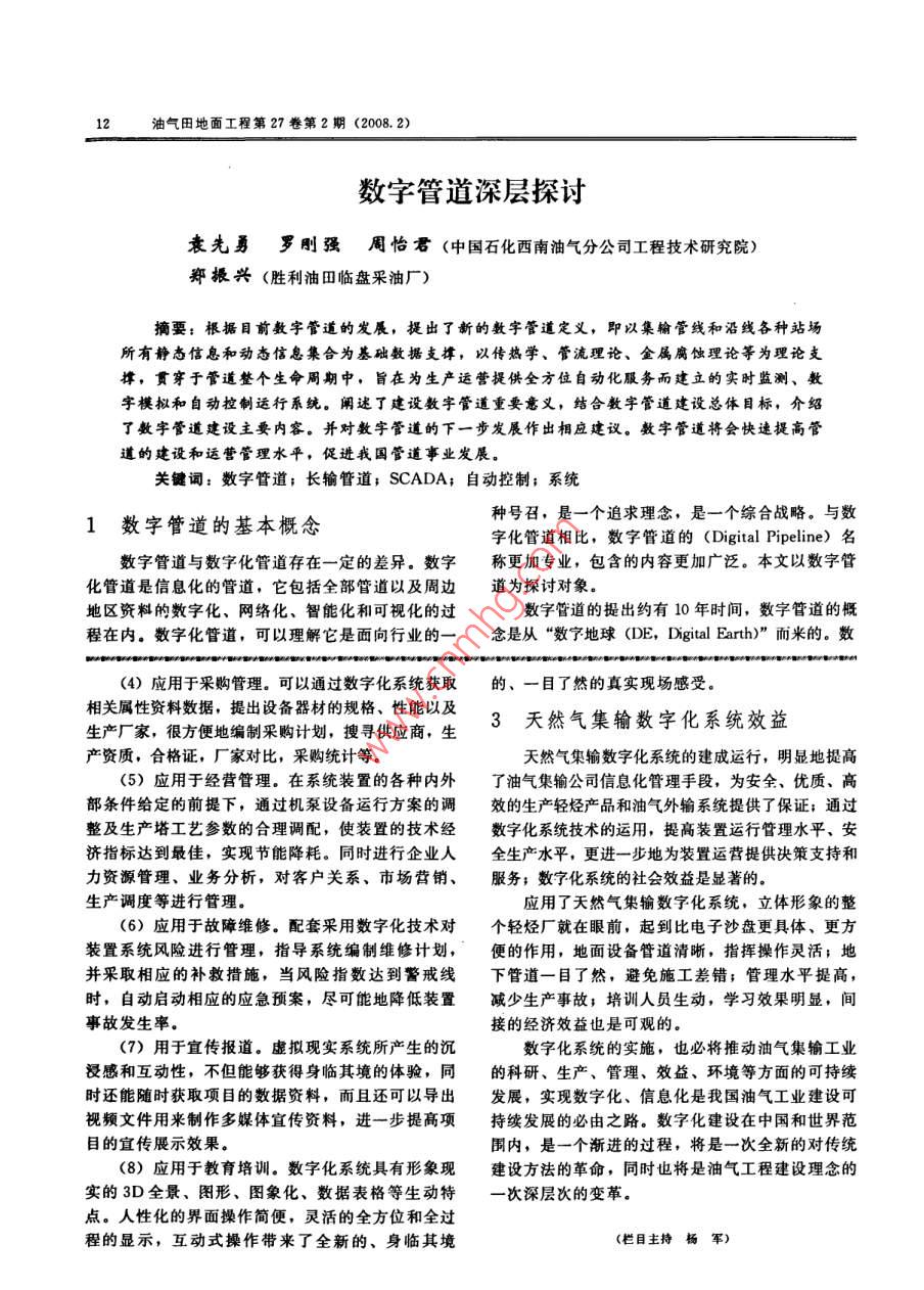 1油氣田地面工程第27卷第2期(2008. 2)天然氣集輸系統(tǒng)數(shù)字化張靜(遼河油田油氣集輸公司)摘要:天然氣集輸數(shù)字化就是將數(shù)字化的思路和方法應用于油氣集輸工程,它是以電子地圖技術為基礎的軟件平臺,是一個立體的“虛擬現(xiàn)實的數(shù)字化工程”。該工程包含了工程勘察設計系統(tǒng)、工程建設項目管理系統(tǒng)、工程運營管理系統(tǒng)三個組成部分。包括二維GIS系統(tǒng)、三維虛擬現(xiàn)實系統(tǒng)、生產(chǎn)實時顯示系統(tǒng)、動態(tài)流程系統(tǒng)等,其核心是電子信息數(shù)據(jù)庫。天然氣集輸數(shù)字化系統(tǒng)的建成運行,明顯地提高了油氣集輸公司信息化管理手段,為安全、優(yōu)質(zhì)、高效的生產(chǎn)輕烴產(chǎn)品和油氣外輸系統(tǒng)提供了保證;通過運用數(shù)字化系統(tǒng)技術,可提高裝置運行管理水平、安全生產(chǎn)水平,更進一步地為裝置運營提供決策支持和服務。關鍵詞:天然氣:集輸;數(shù)字化;系統(tǒng);效益試、量取等功能齊全,操作方便。1概述(4)完善數(shù)據(jù)庫選型方法。數(shù)據(jù)資源結(jié)構(gòu)繁簡自從“數(shù)字地球”的戰(zhàn)略思想提出后,我國已合理,資料完整配套,數(shù)據(jù)齊全準確,數(shù)據(jù)的范圍.將數(shù)字城市的核心技術研制列人國家計劃的重中之全面,類別層次分明清晰,格式統(tǒng)-。重項目,將“數(shù)字城市”項目列人國家重大科技攻2.1系統(tǒng)組成關項目。隨著我國科學技術的發(fā)展,為提高管理水中國石油遼河油田油氣集輸公司主要擔負油、平及工作效率,數(shù)字化油田、數(shù)字化工程等一系列氣外輸及輕烴生產(chǎn)任務。原油主要供給錦州、葫蘆新科技項目已經(jīng)列入中國石油天然氣集團公司“十島、遼陽、鞍山等四大煉油廠;天然氣及輕烴產(chǎn)品-五”科技發(fā)展規(guī)劃。主要供給遼河化肥廠、盤錦天然氣化工廠以及周圍天然氣集輸數(shù)字化就是將數(shù)字化的思路和方法應縣區(qū)。用于油氣集輸工程,它是以電子地圖技術為基礎的軟本數(shù)字化項目包括五部分:首先是技術專題件平臺,是一個立體的“虛擬現(xiàn)實的數(shù)字化工程"。片,概要介紹油氣集輸公司輕烴廠。第二部分是流將這個工程中的建筑、設備、儲罐、管道、儀表、管程系統(tǒng),展示油氣集輸公司的油氣管道系統(tǒng)和輕烴道、道路、花圃以及限定區(qū)域里的生產(chǎn)設施全部設置廠裝置的油、氣、水、電各個系統(tǒng)的流程。第三部到真實的“虛擬場景”中,是一個與現(xiàn)實建設工程完分是平面區(qū)域系統(tǒng),形象展示油氣集輸公司輕烴廠全-樣的“虛擬數(shù)字化工程”。的整體外貌。第四部分是3D虛擬現(xiàn)實演示系統(tǒng),把油氣集輸公司辦公區(qū)、輕烴產(chǎn)品生產(chǎn)區(qū)以及輔助2天然氣集輸數(shù)字化生產(chǎn)區(qū)立體形象地表現(xiàn)出來。第五部分是電子信息系統(tǒng)數(shù)字化工程包含了工程勘察設計系統(tǒng)、工數(shù)據(jù)庫系統(tǒng)。數(shù)字化的核心是完整的信息數(shù)據(jù)庫。程建設項目管理系統(tǒng)、工程運營管理系統(tǒng)三個組成信息數(shù)據(jù)包含著眾多子系統(tǒng),數(shù)字化項目的數(shù)據(jù)庫部分。包括二維GIS系統(tǒng)、三維虛擬現(xiàn)實系統(tǒng)、主要包括集配氣系統(tǒng)、輕烴回收系統(tǒng)、儲運系統(tǒng)、.生產(chǎn)實時顯示系統(tǒng)、動態(tài)流程系統(tǒng)等,其核心是電污水處理及配電等配套系統(tǒng)五部分。子信息數(shù)據(jù)庫.(1)技術專題片。以生產(chǎn)現(xiàn)場實況錄像和設計(1)天然氣集輸數(shù)字化系統(tǒng)框架平臺的構(gòu)建。使圖紙為主,配套以油氣集輸公司的相關技術文件,數(shù)字系統(tǒng)的制作深度能夠滿足管理、運行、維護等方以及技術管理會議等活動紀實鏡頭組成視頻畫面。面的要求,達到實用可靠、操作方便、結(jié)構(gòu)清晰。包括:①油氣集輸公司簡介;②輕烴回收裝置概(2)天然氣集輸數(shù)字化系統(tǒng)技術支撐體系的評述;③輕烴裝置技術特點;④油氣集輸系統(tǒng)發(fā)展概選。篩選合理、可行的應用軟件,采納適用、經(jīng)況;⑤油氣集輸公司輕烴裝置技術改造;⑥推進公濟、方便的軟件。司持續(xù)、有效、協(xié)調(diào)發(fā)展。(3)三維虛擬現(xiàn)實技術的運用。所建立的數(shù)字(2)流程系統(tǒng)。采用動畫形式將油氣集輸公司模型,達到漫游形象逼真;觸摸物體的查詢、測站內(nèi)天然氣集輸?shù)母鱾€流程系統(tǒng)分別描述,并顯示油氣田地面工程第27卷第2期(2008. 2)1主要技術參數(shù)。應用人員不需要專門的培訓就可以輕松掌握使用。(3) 平面區(qū)域系統(tǒng)。采用動畫形式,分別介紹(6)互動操作。天然氣集輸數(shù)字化系統(tǒng)實現(xiàn)了了油氣集輸公司所屬主要石油和天然氣長距離輸送整個工程的虛擬現(xiàn)實表達,使得數(shù)字化的工程能夠管線的概況,同時利用立體效果圖形式表現(xiàn)出油氣在真實、可視的三維環(huán)境下展示到用戶面前,用戶集輸公司廠區(qū)內(nèi)各個部分。通過交互方式對工程的公用信息進行查詢和操作,(4) 3D虛擬演示系統(tǒng)。發(fā)揮虛擬現(xiàn)實技術的對工程的三維虛擬漫游猶如在真實的三維世界中,實時三維